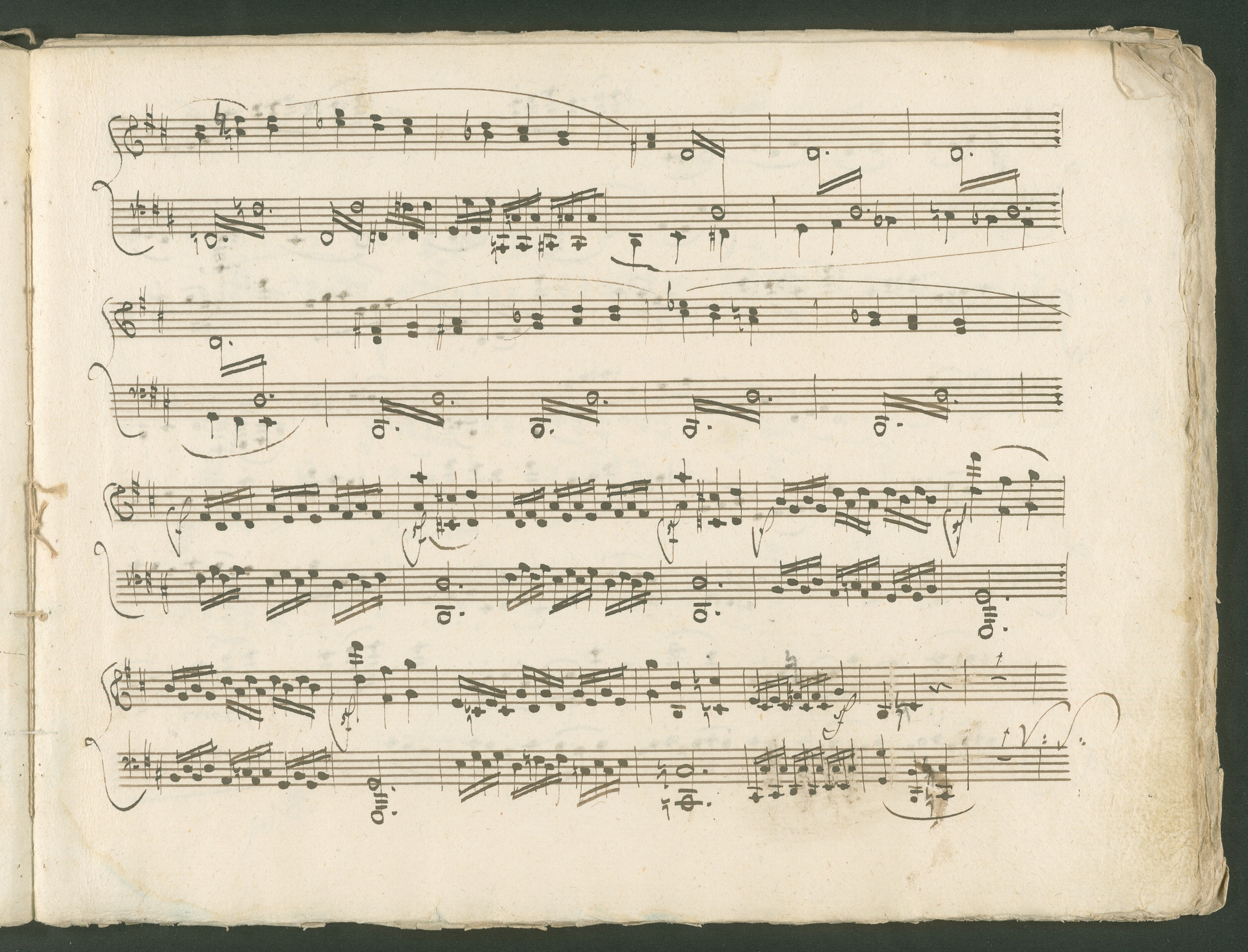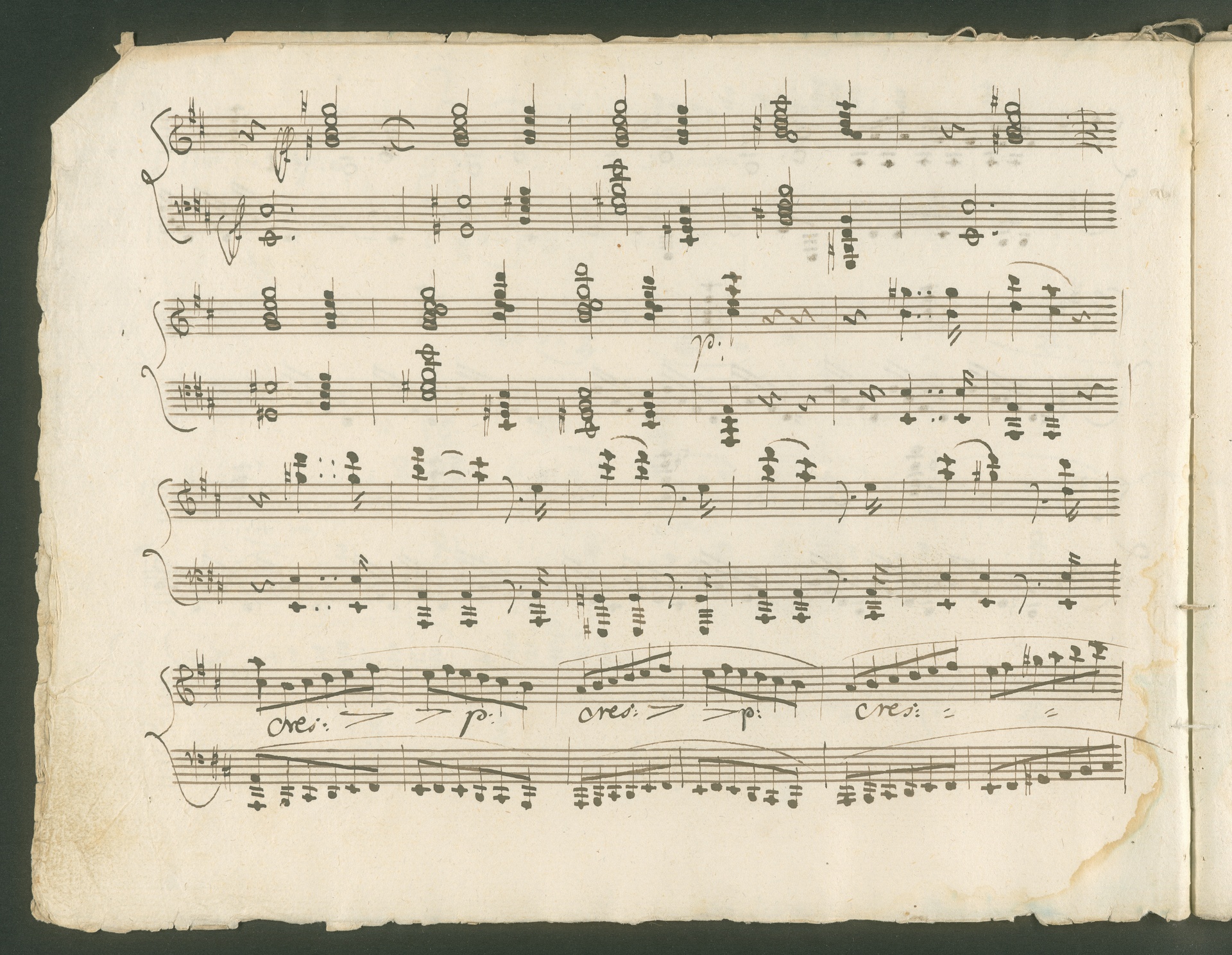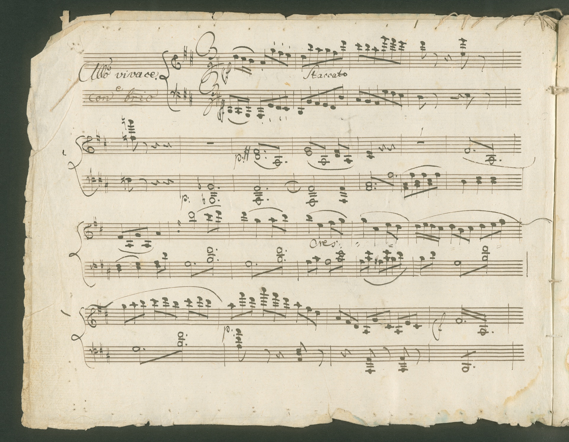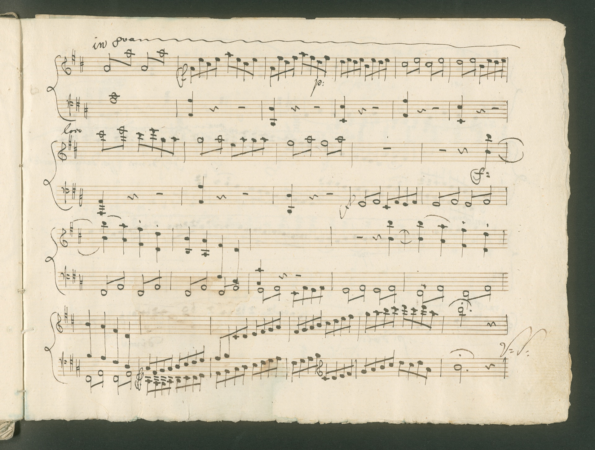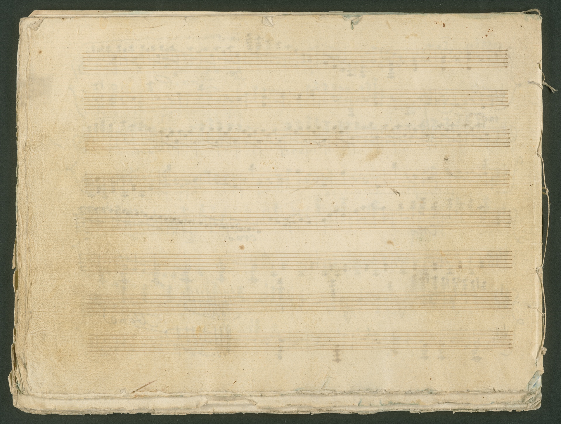 Die Abschrift hat zwei Titelblätter. Nachdem die erste Fassung (jetzt Bl. 2) mehrfach korrigiert und durch Rasuren nahezu unleserlich geworden ist, entschloss sich Beethoven offensichtlich zu einer "ordentlichen" Version, also zu einem zweiten Titelblatt (jetzt Bl. 1). Dieses zweite Blatt - aus einer anderen Papiersorte - wurde auf den ursprünglichen Titel aufgenäht (die Naht ist mittlerweile weitgehend geöffnet). Neben Titel, Widmung (an die Gräfin Erdödy) und Unterschrift ist darauf rechts quer und durchgestrichen eine weitere Bemerkung von Beethovens Hand verzeichnet: "Dieses wird die Baronin Ertmann den kommenden Dinstag spielen". Freifrau Dorothea von Ertmann war eine begabte und virtuose Pianistin, die Beethoven nicht nur als Interpretin sehr schätzte - er widmete ihr auch die Klaviersonate op. 101. Möglicherweise spricht Beethoven von der vorliegenden Abschrift, als er seinen Freund Nikolaus Zmeskall am 16. April 1809 brieflich bittet: "Wenn ich nicht komme lieber Z, welches leicht geschehen kann, bitten sie die Baronin Ertmann daß sie ihnen die Klawierstimme von dem Terzett da läßt, und haben sie hernach die Gefälligkeit mir solche mit den übrigen Stimmen noch heute zu schicken" (BGA 377, Beethoven an Nikolaus Zmeskall [Wien, 16. April 1809]). Die überprüfte Abschrift trägt zahlreiche dynamische Vorschriften, teilweise ausführlicher als das Autograph oder die Originalausgabe. Zudem enthält sie auf Bl. 7r (Bild 13) eigenhändige Fingersätze Beethovens. Hat die Freifrau Ertmann aus dieser Stimme musiziert, von Beethoven für sie eingerichtet? (J.R.)