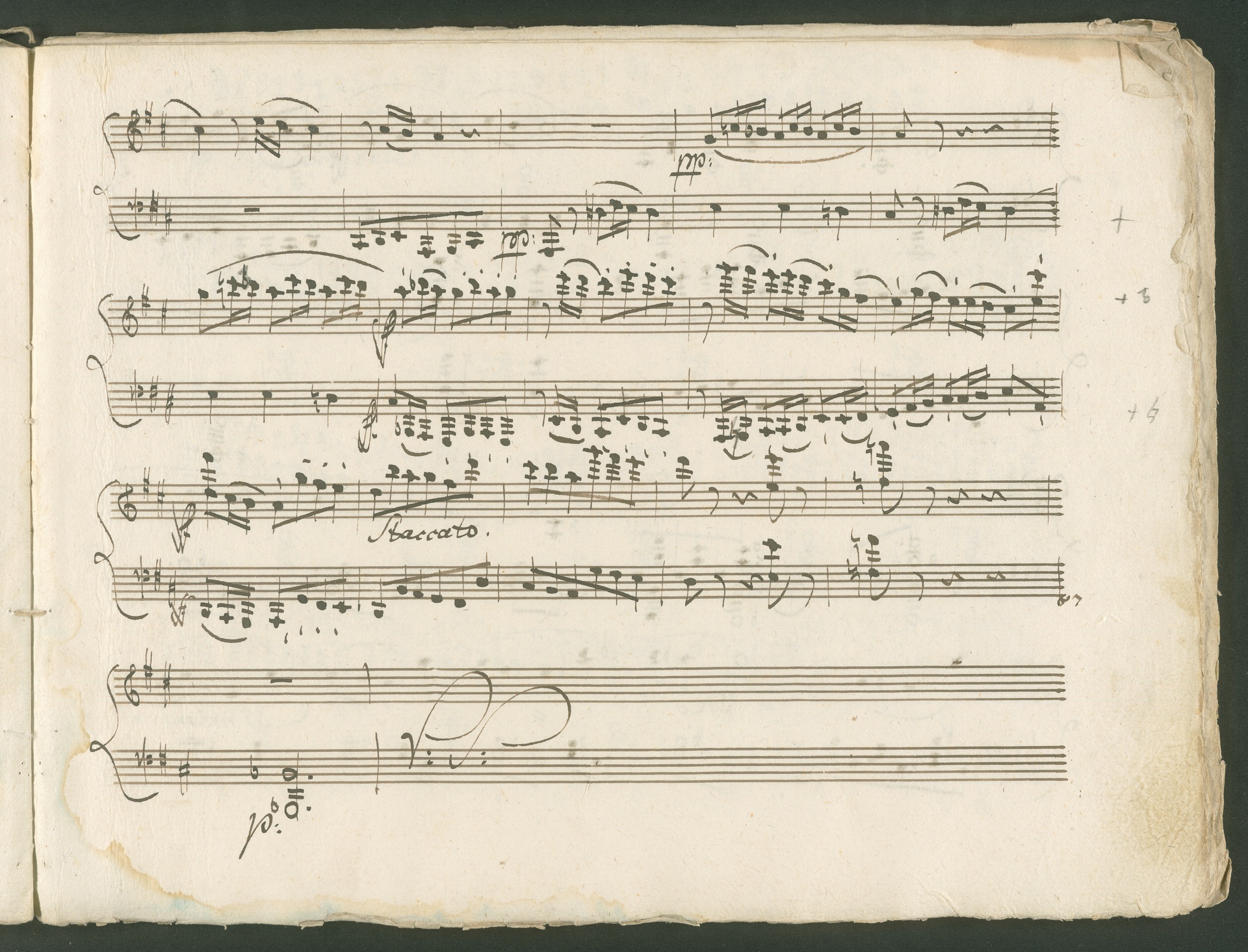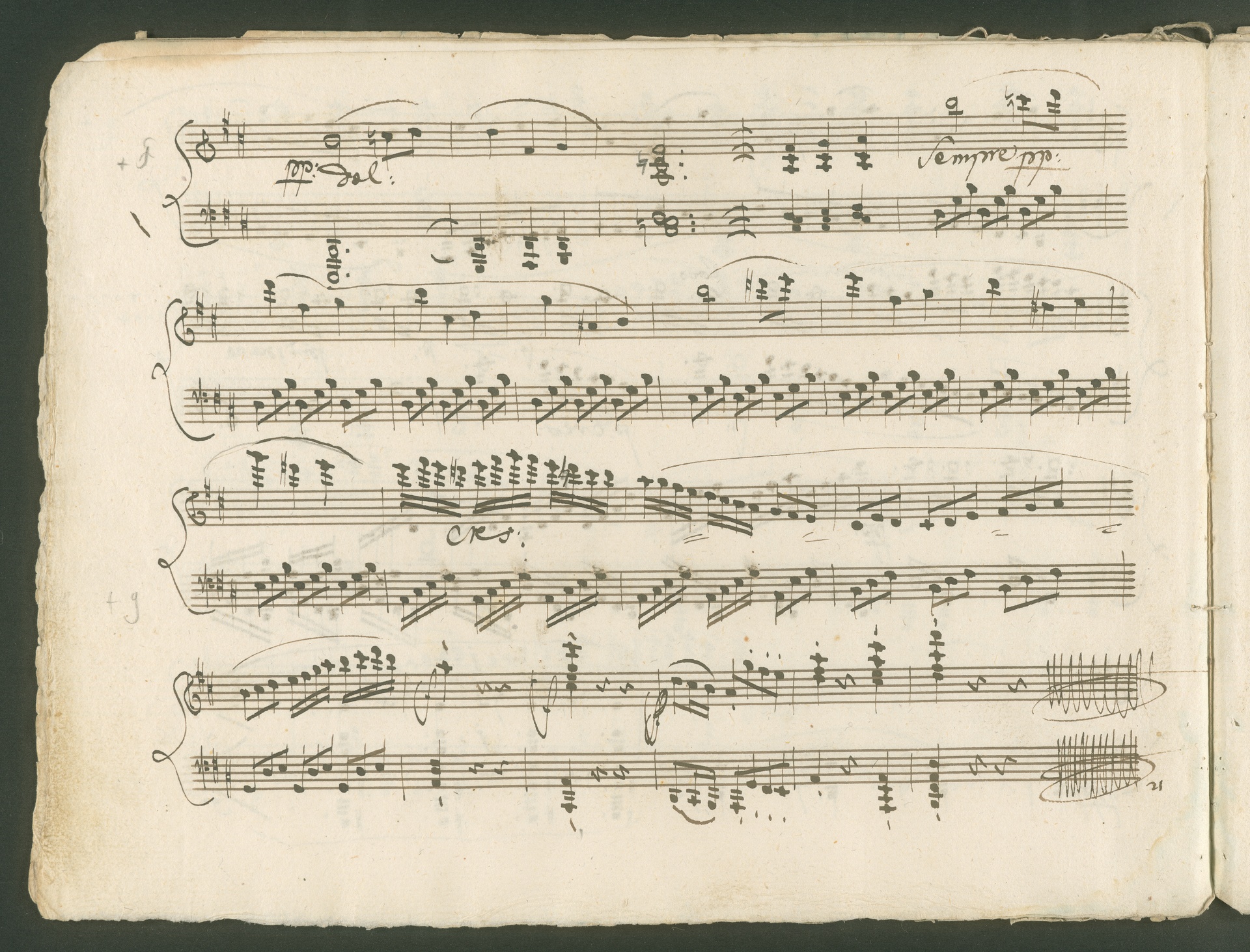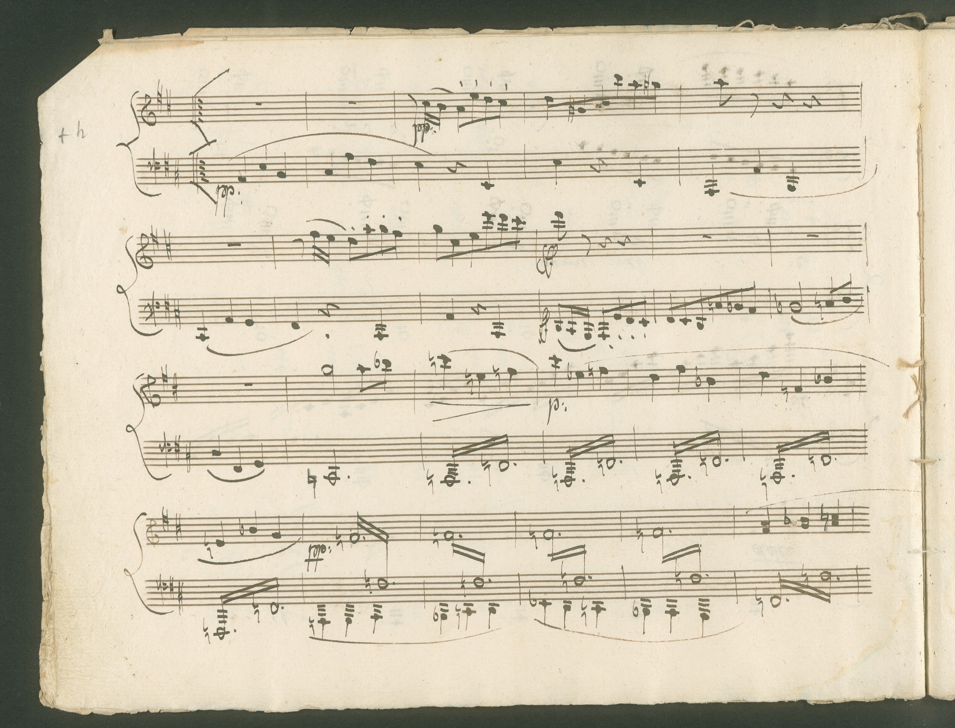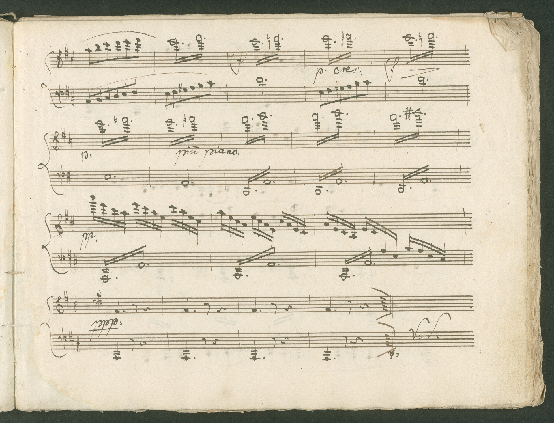 Die Abschrift hat zwei Titelblätter. Nachdem die erste Fassung (jetzt Bl. 2) mehrfach korrigiert und durch Rasuren nahezu unleserlich geworden ist, entschloss sich Beethoven offensichtlich zu einer "ordentlichen" Version, also zu einem zweiten Titelblatt (jetzt Bl. 1). Dieses zweite Blatt - aus einer anderen Papiersorte - wurde auf den ursprünglichen Titel aufgenäht (die Naht ist mittlerweile weitgehend geöffnet). Neben Titel, Widmung (an die Gräfin Erdödy) und Unterschrift ist darauf rechts quer und durchgestrichen eine weitere Bemerkung von Beethovens Hand verzeichnet: "Dieses wird die Baronin Ertmann den kommenden Dinstag spielen". Freifrau Dorothea von Ertmann war eine begabte und virtuose Pianistin, die Beethoven nicht nur als Interpretin sehr schätzte - er widmete ihr auch die Klaviersonate op. 101. Möglicherweise spricht Beethoven von der vorliegenden Abschrift, als er seinen Freund Nikolaus Zmeskall am 16. April 1809 brieflich bittet: "Wenn ich nicht komme lieber Z, welches leicht geschehen kann, bitten sie die Baronin Ertmann daß sie ihnen die Klawierstimme von dem Terzett da läßt, und haben sie hernach die Gefälligkeit mir solche mit den übrigen Stimmen noch heute zu schicken" (BGA 377, Beethoven an Nikolaus Zmeskall [Wien, 16. April 1809]). Die überprüfte Abschrift trägt zahlreiche dynamische Vorschriften, teilweise ausführlicher als das Autograph oder die Originalausgabe. Zudem enthält sie auf Bl. 7r (Bild 13) eigenhändige Fingersätze Beethovens. Hat die Freifrau Ertmann aus dieser Stimme musiziert, von Beethoven für sie eingerichtet? (J.R.)