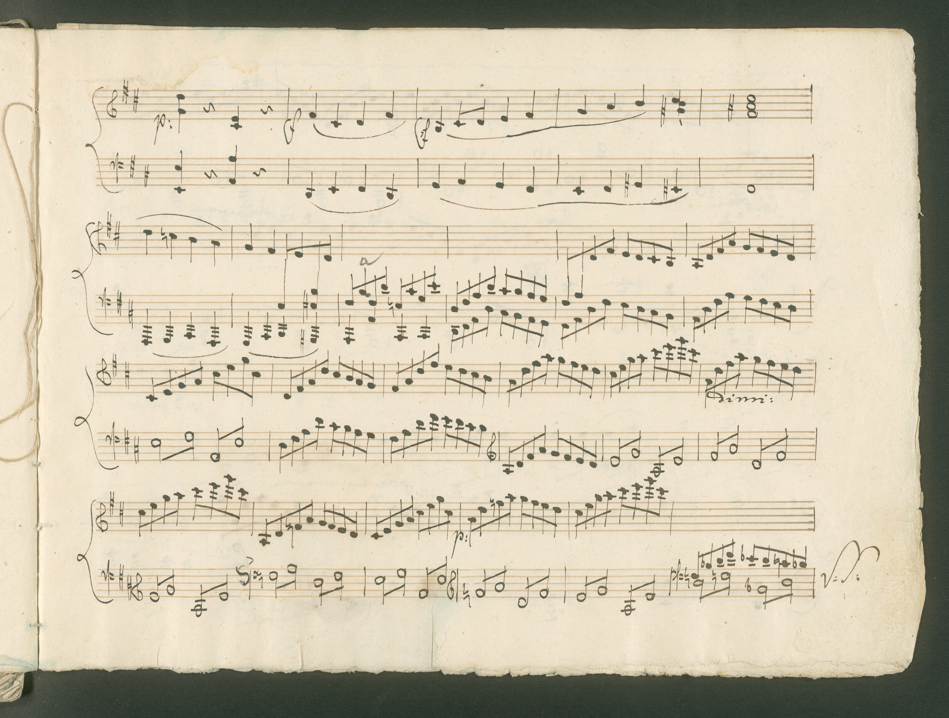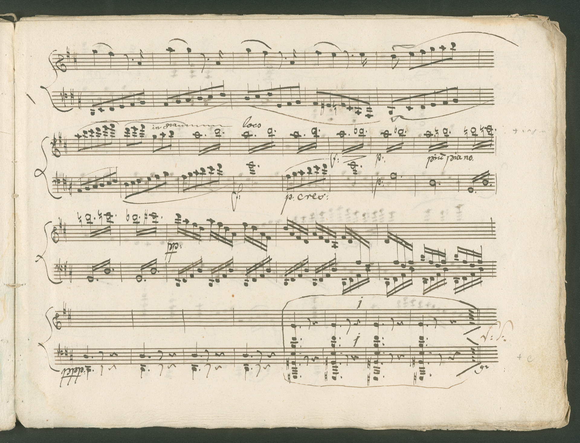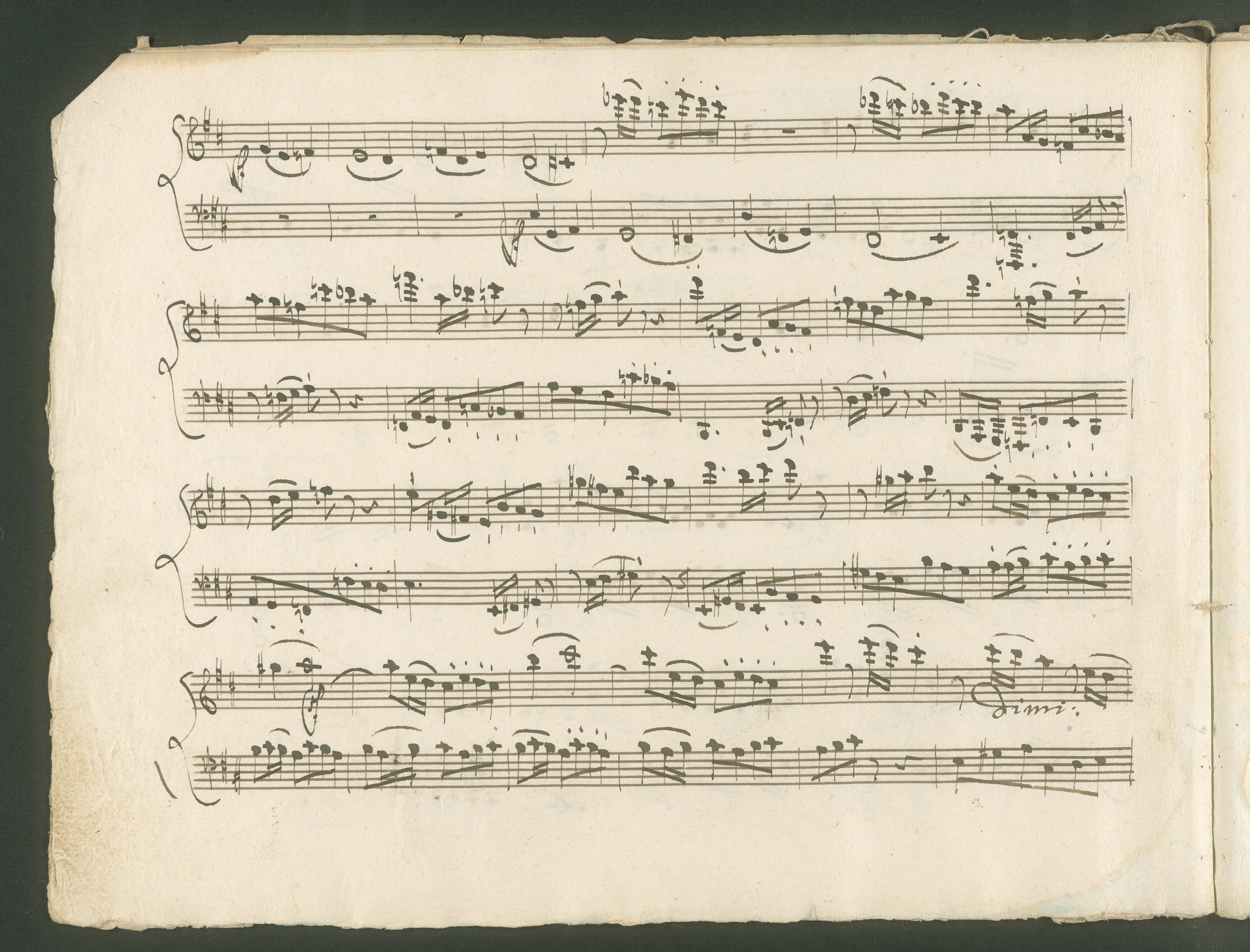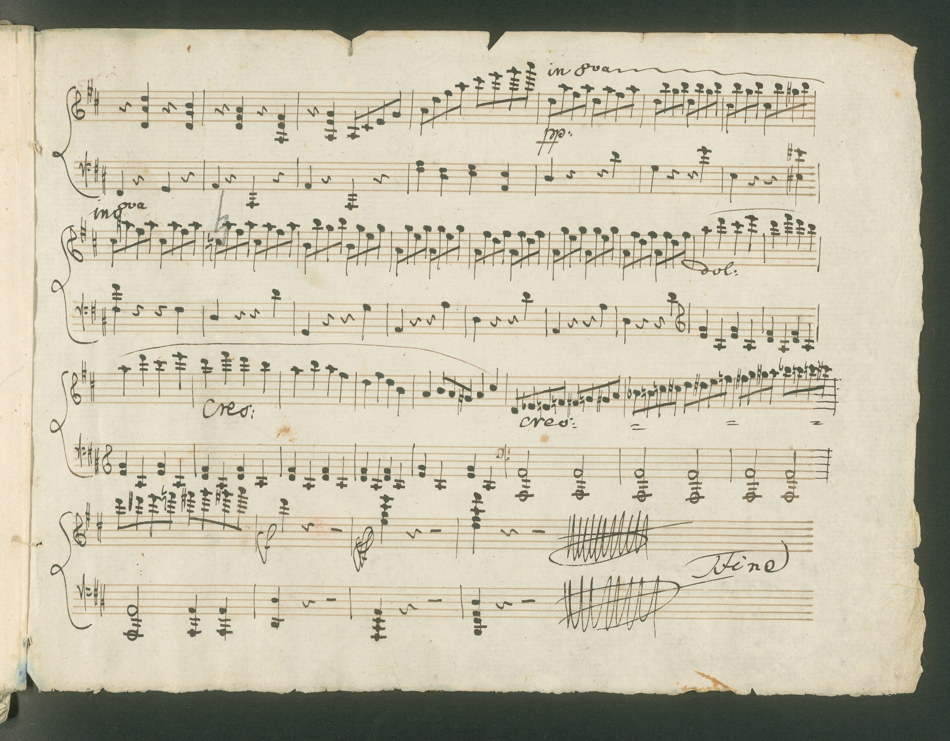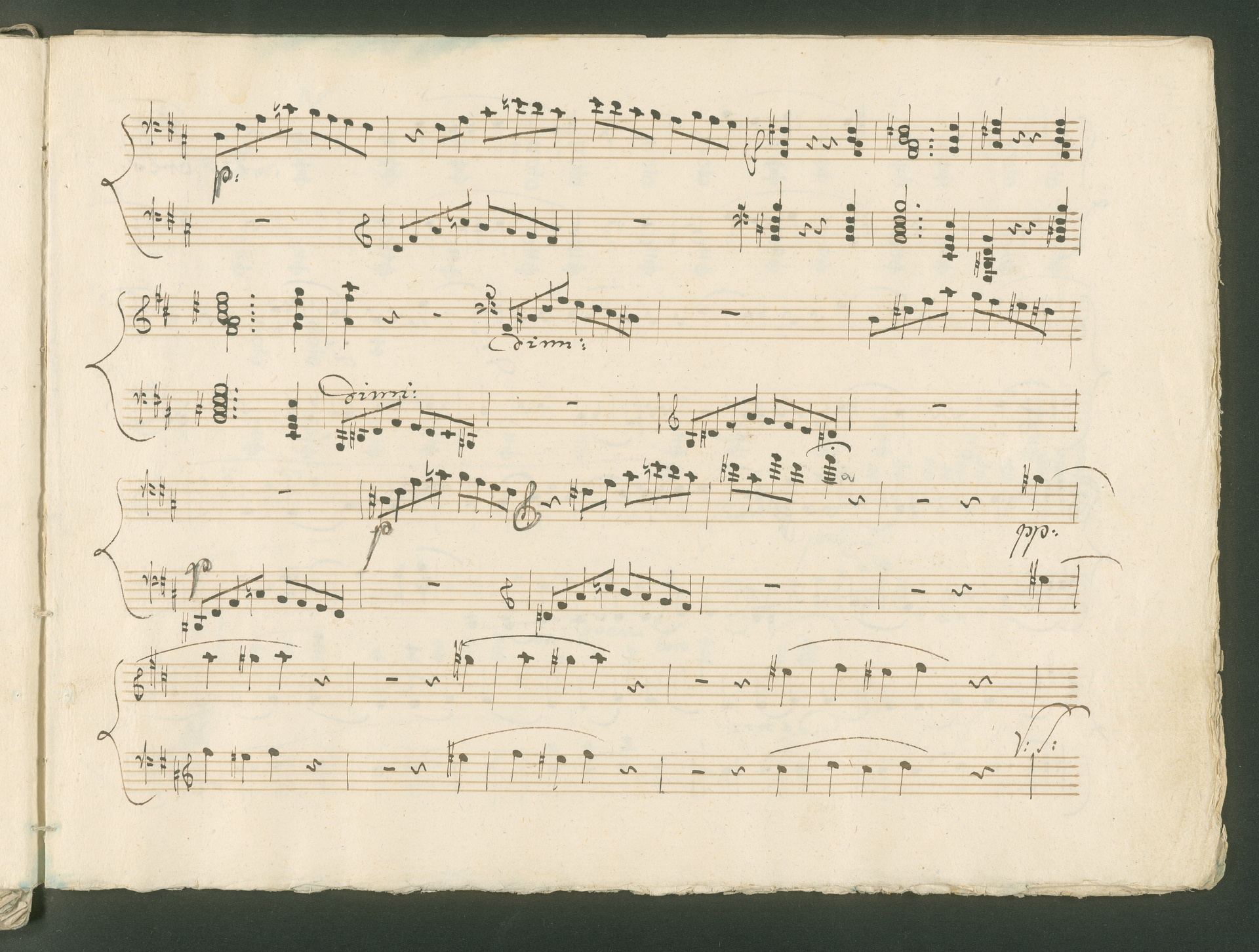 Die Abschrift hat zwei Titelblätter. Nachdem die erste Fassung (jetzt Bl. 2) mehrfach korrigiert und durch Rasuren nahezu unleserlich geworden ist, entschloss sich Beethoven offensichtlich zu einer "ordentlichen" Version, also zu einem zweiten Titelblatt (jetzt Bl. 1). Dieses zweite Blatt - aus einer anderen Papiersorte - wurde auf den ursprünglichen Titel aufgenäht (die Naht ist mittlerweile weitgehend geöffnet). Neben Titel, Widmung (an die Gräfin Erdödy) und Unterschrift ist darauf rechts quer und durchgestrichen eine weitere Bemerkung von Beethovens Hand verzeichnet: "Dieses wird die Baronin Ertmann den kommenden Dinstag spielen". Freifrau Dorothea von Ertmann war eine begabte und virtuose Pianistin, die Beethoven nicht nur als Interpretin sehr schätzte - er widmete ihr auch die Klaviersonate op. 101. Möglicherweise spricht Beethoven von der vorliegenden Abschrift, als er seinen Freund Nikolaus Zmeskall am 16. April 1809 brieflich bittet: "Wenn ich nicht komme lieber Z, welches leicht geschehen kann, bitten sie die Baronin Ertmann daß sie ihnen die Klawierstimme von dem Terzett da läßt, und haben sie hernach die Gefälligkeit mir solche mit den übrigen Stimmen noch heute zu schicken" (BGA 377, Beethoven an Nikolaus Zmeskall [Wien, 16. April 1809]). Die überprüfte Abschrift trägt zahlreiche dynamische Vorschriften, teilweise ausführlicher als das Autograph oder die Originalausgabe. Zudem enthält sie auf Bl. 7r (Bild 13) eigenhändige Fingersätze Beethovens. Hat die Freifrau Ertmann aus dieser Stimme musiziert, von Beethoven für sie eingerichtet? (J.R.)