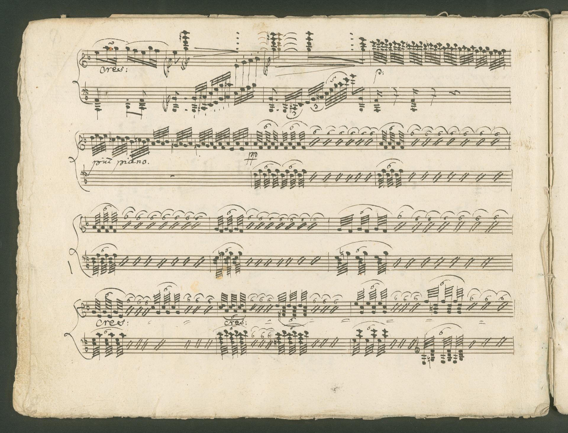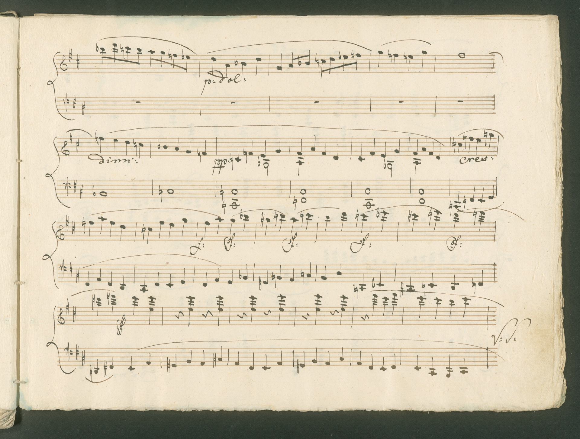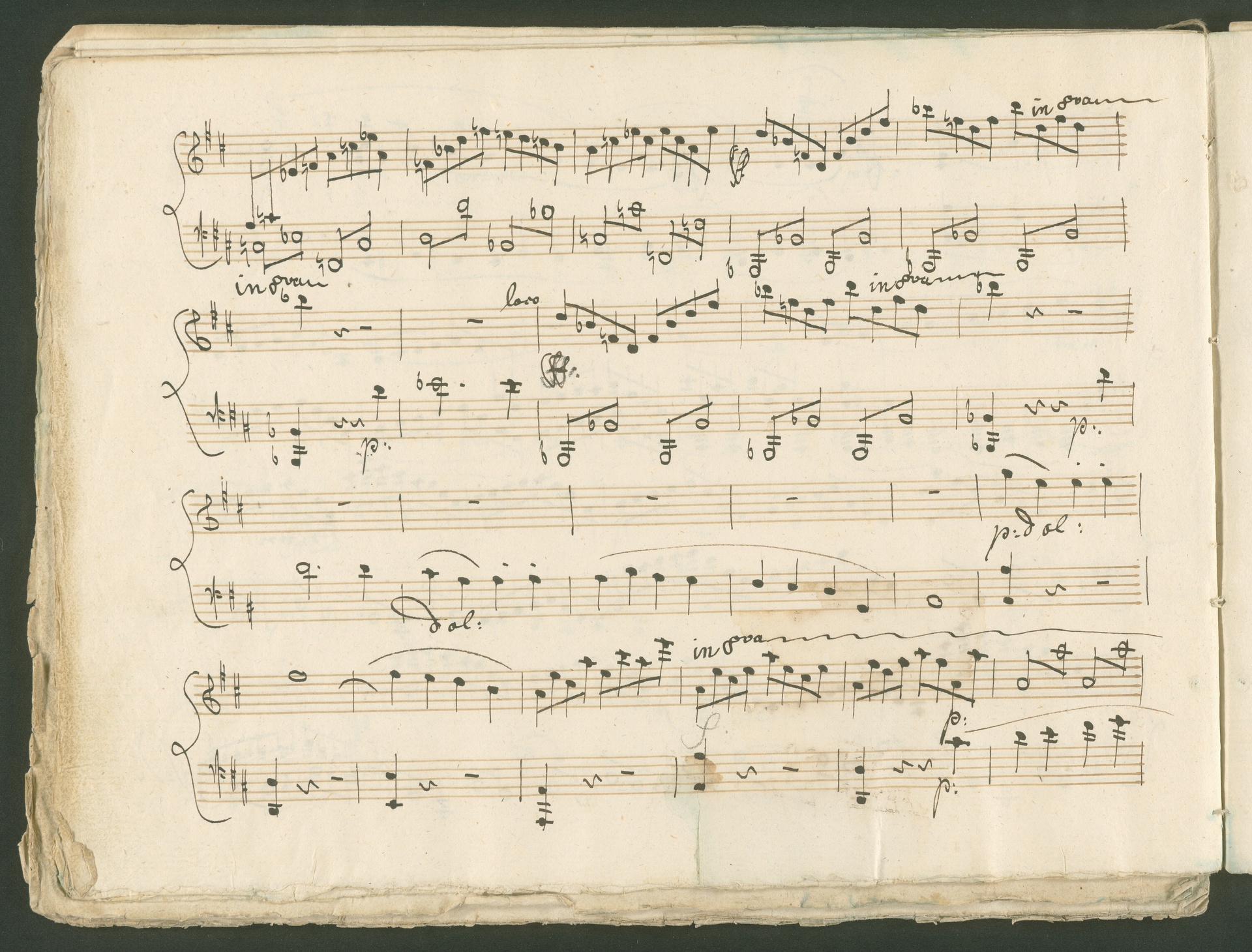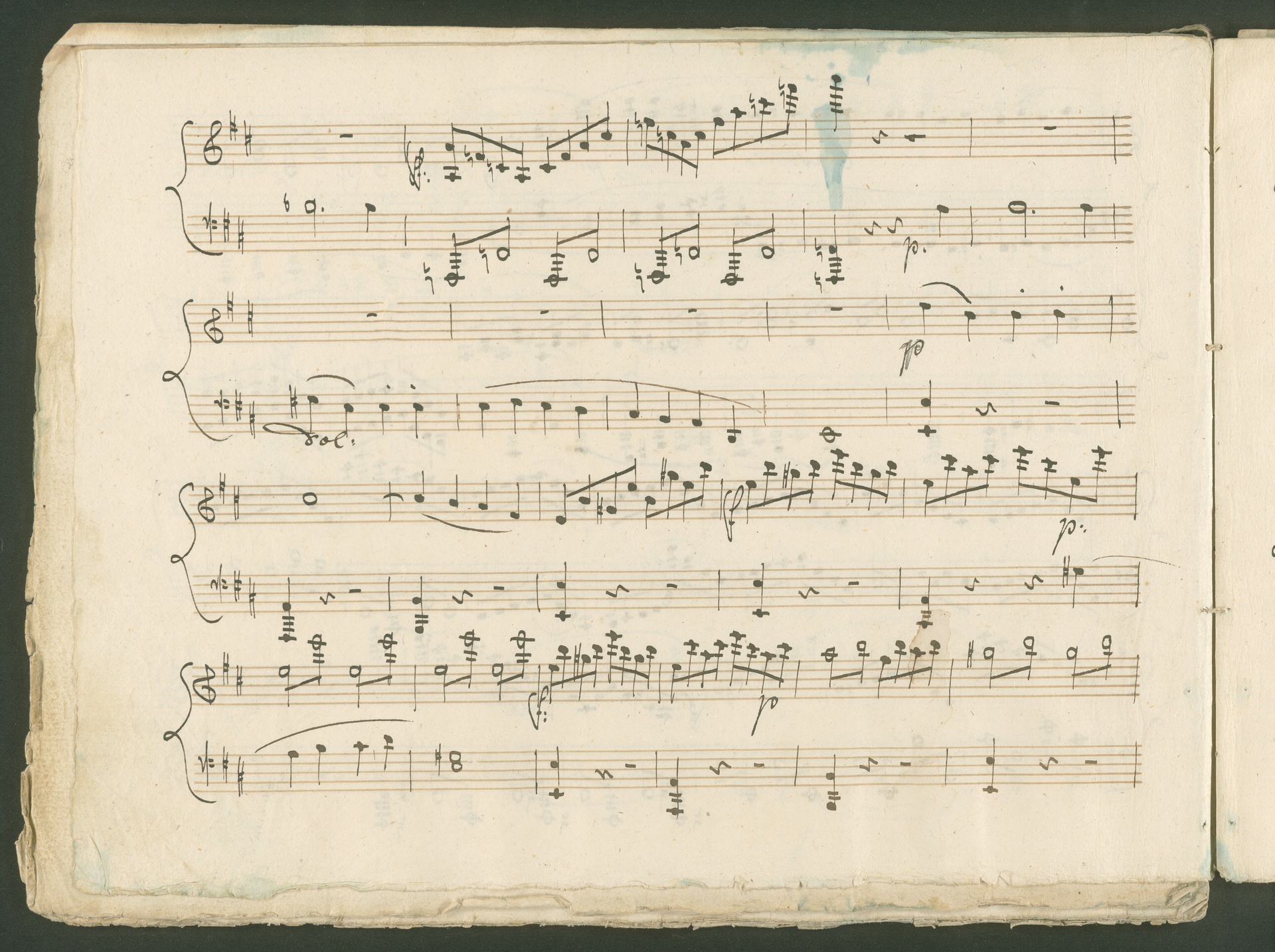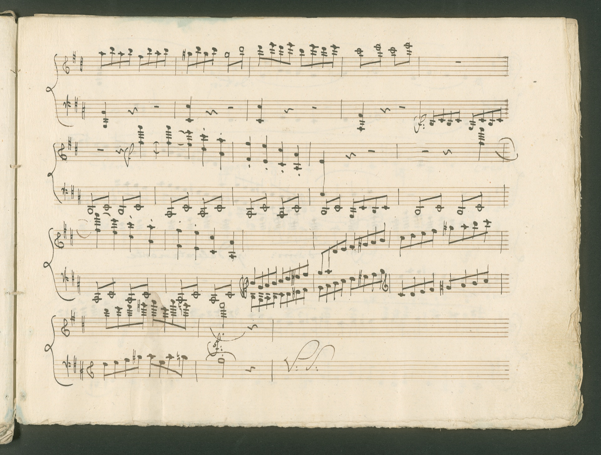 Die Abschrift hat zwei Titelblätter. Nachdem die erste Fassung (jetzt Bl. 2) mehrfach korrigiert und durch Rasuren nahezu unleserlich geworden ist, entschloss sich Beethoven offensichtlich zu einer "ordentlichen" Version, also zu einem zweiten Titelblatt (jetzt Bl. 1). Dieses zweite Blatt - aus einer anderen Papiersorte - wurde auf den ursprünglichen Titel aufgenäht (die Naht ist mittlerweile weitgehend geöffnet). Neben Titel, Widmung (an die Gräfin Erdödy) und Unterschrift ist darauf rechts quer und durchgestrichen eine weitere Bemerkung von Beethovens Hand verzeichnet: "Dieses wird die Baronin Ertmann den kommenden Dinstag spielen". Freifrau Dorothea von Ertmann war eine begabte und virtuose Pianistin, die Beethoven nicht nur als Interpretin sehr schätzte - er widmete ihr auch die Klaviersonate op. 101. Möglicherweise spricht Beethoven von der vorliegenden Abschrift, als er seinen Freund Nikolaus Zmeskall am 16. April 1809 brieflich bittet: "Wenn ich nicht komme lieber Z, welches leicht geschehen kann, bitten sie die Baronin Ertmann daß sie ihnen die Klawierstimme von dem Terzett da läßt, und haben sie hernach die Gefälligkeit mir solche mit den übrigen Stimmen noch heute zu schicken" (BGA 377, Beethoven an Nikolaus Zmeskall [Wien, 16. April 1809]). Die überprüfte Abschrift trägt zahlreiche dynamische Vorschriften, teilweise ausführlicher als das Autograph oder die Originalausgabe. Zudem enthält sie auf Bl. 7r (Bild 13) eigenhändige Fingersätze Beethovens. Hat die Freifrau Ertmann aus dieser Stimme musiziert, von Beethoven für sie eingerichtet? (J.R.)