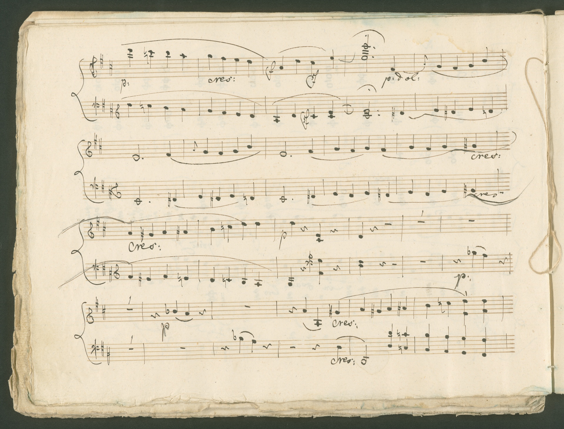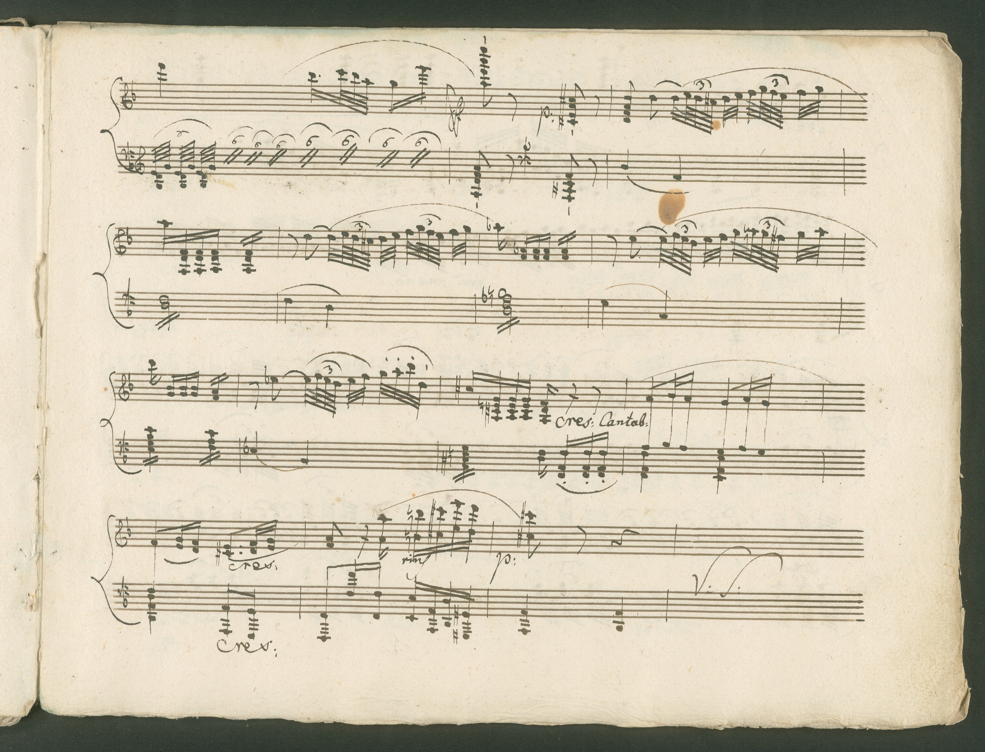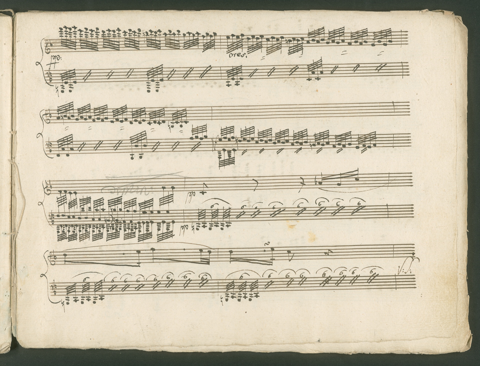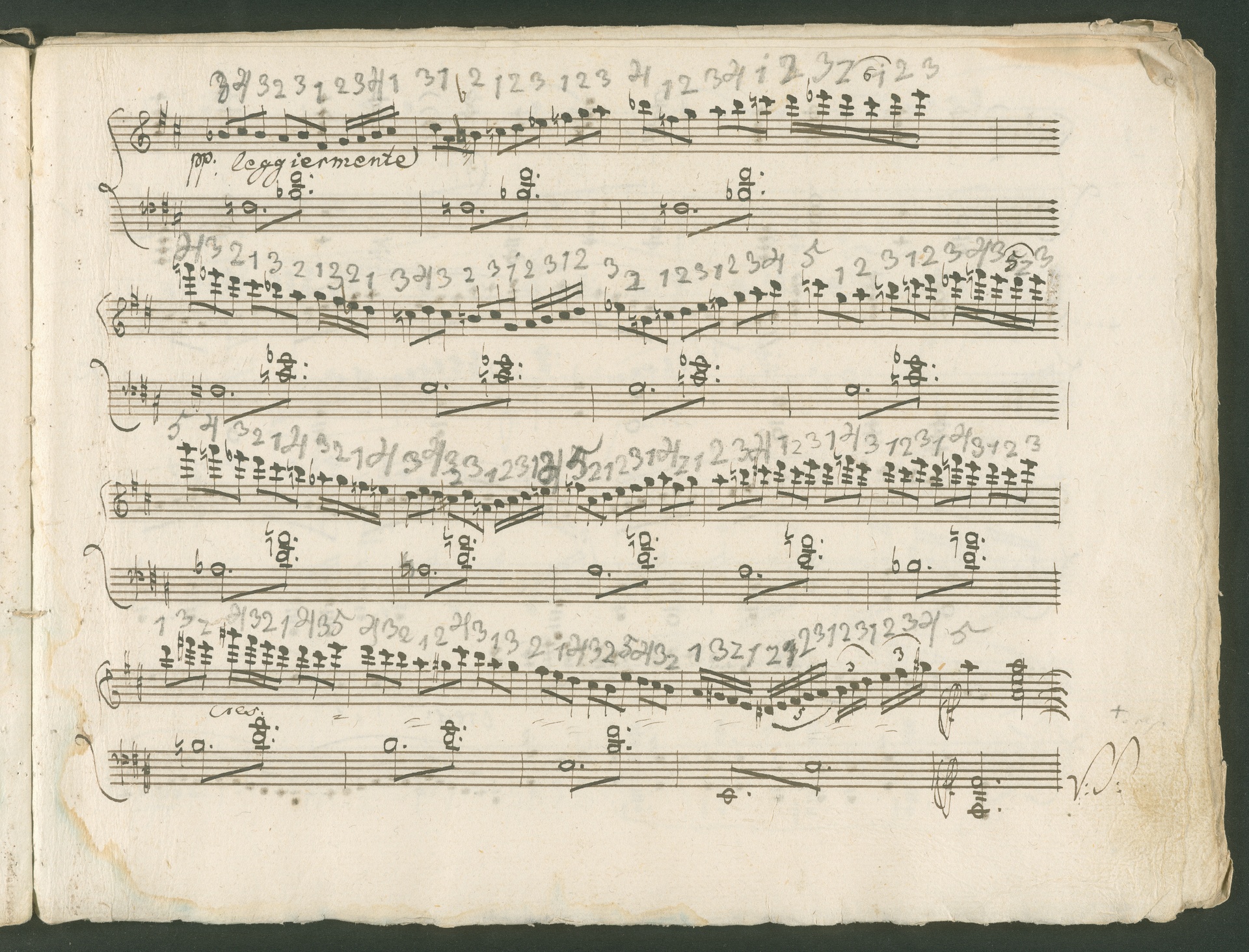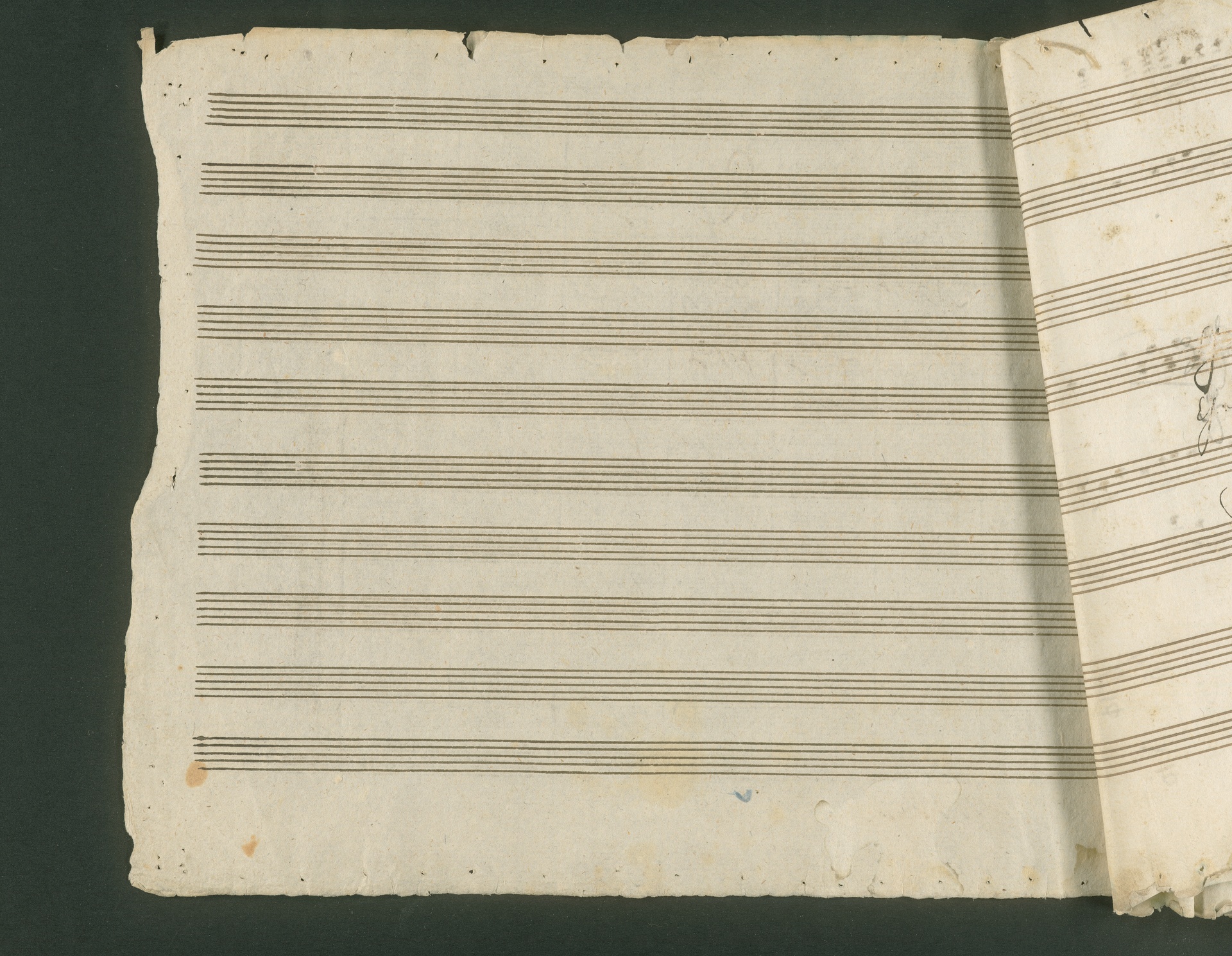 Die Abschrift hat zwei Titelblätter. Nachdem die erste Fassung (jetzt Bl. 2) mehrfach korrigiert und durch Rasuren nahezu unleserlich geworden ist, entschloss sich Beethoven offensichtlich zu einer "ordentlichen" Version, also zu einem zweiten Titelblatt (jetzt Bl. 1). Dieses zweite Blatt - aus einer anderen Papiersorte - wurde auf den ursprünglichen Titel aufgenäht (die Naht ist mittlerweile weitgehend geöffnet). Neben Titel, Widmung (an die Gräfin Erdödy) und Unterschrift ist darauf rechts quer und durchgestrichen eine weitere Bemerkung von Beethovens Hand verzeichnet: "Dieses wird die Baronin Ertmann den kommenden Dinstag spielen". Freifrau Dorothea von Ertmann war eine begabte und virtuose Pianistin, die Beethoven nicht nur als Interpretin sehr schätzte - er widmete ihr auch die Klaviersonate op. 101. Möglicherweise spricht Beethoven von der vorliegenden Abschrift, als er seinen Freund Nikolaus Zmeskall am 16. April 1809 brieflich bittet: "Wenn ich nicht komme lieber Z, welches leicht geschehen kann, bitten sie die Baronin Ertmann daß sie ihnen die Klawierstimme von dem Terzett da läßt, und haben sie hernach die Gefälligkeit mir solche mit den übrigen Stimmen noch heute zu schicken" (BGA 377, Beethoven an Nikolaus Zmeskall [Wien, 16. April 1809]). Die überprüfte Abschrift trägt zahlreiche dynamische Vorschriften, teilweise ausführlicher als das Autograph oder die Originalausgabe. Zudem enthält sie auf Bl. 7r (Bild 13) eigenhändige Fingersätze Beethovens. Hat die Freifrau Ertmann aus dieser Stimme musiziert, von Beethoven für sie eingerichtet? (J.R.)