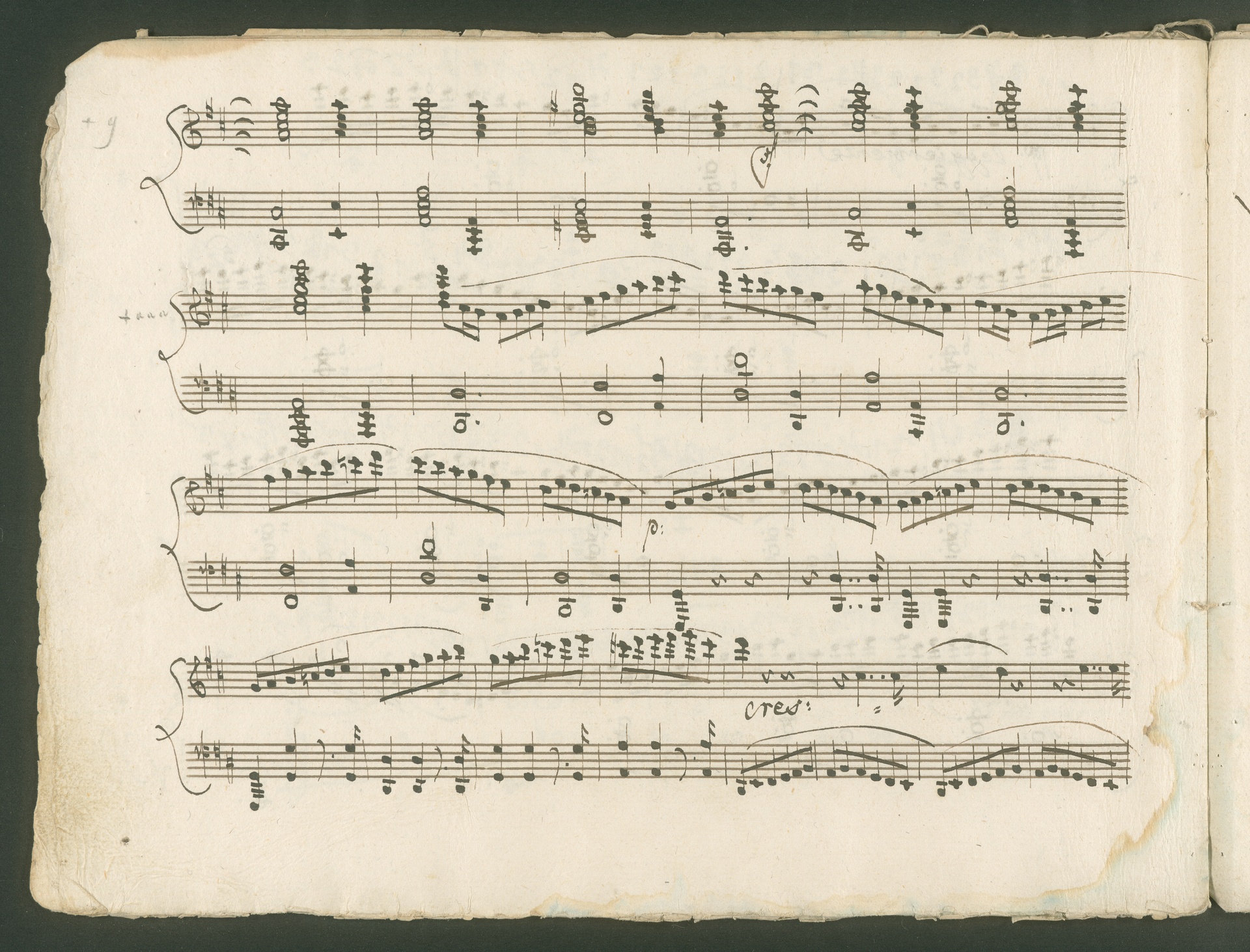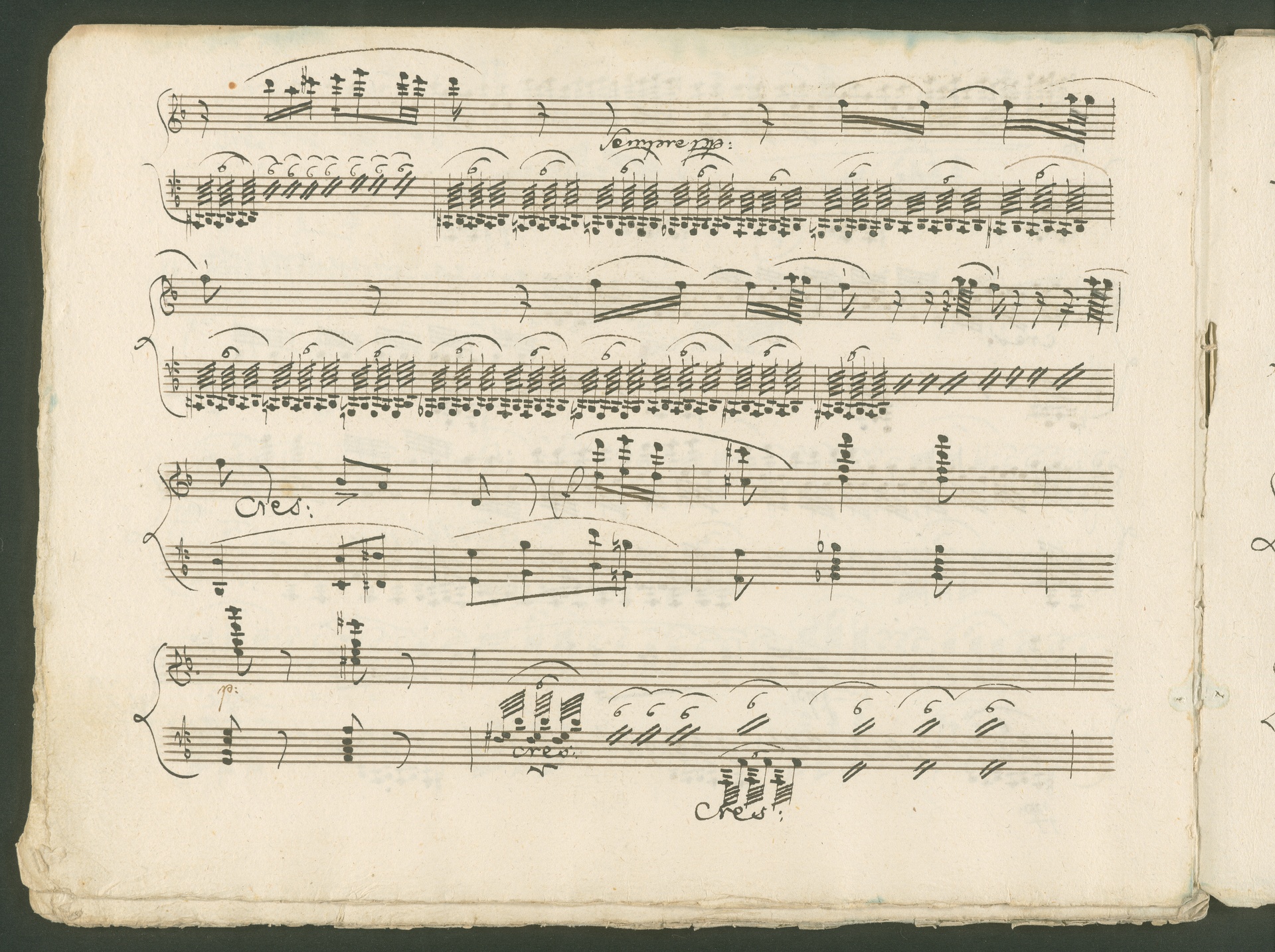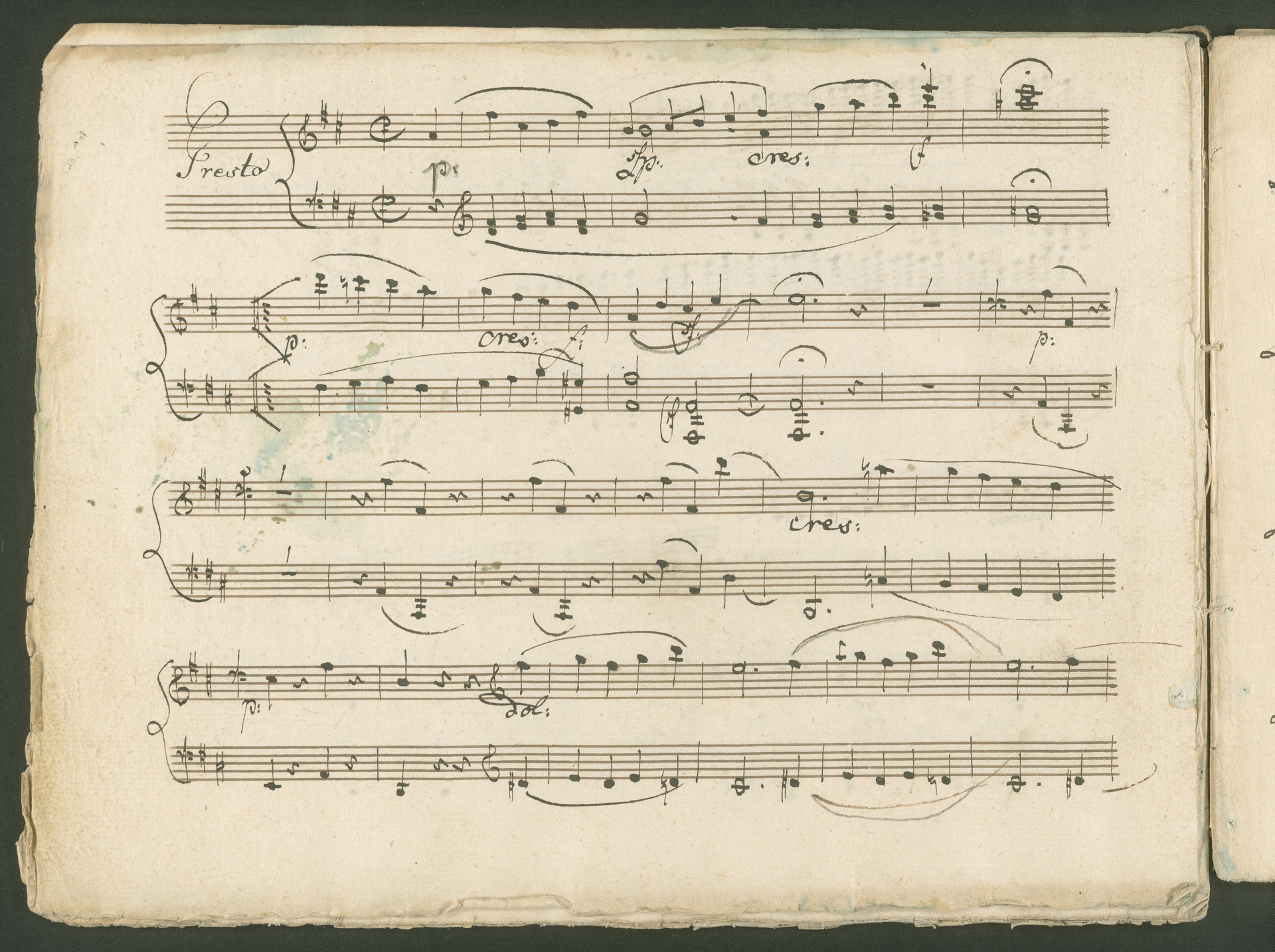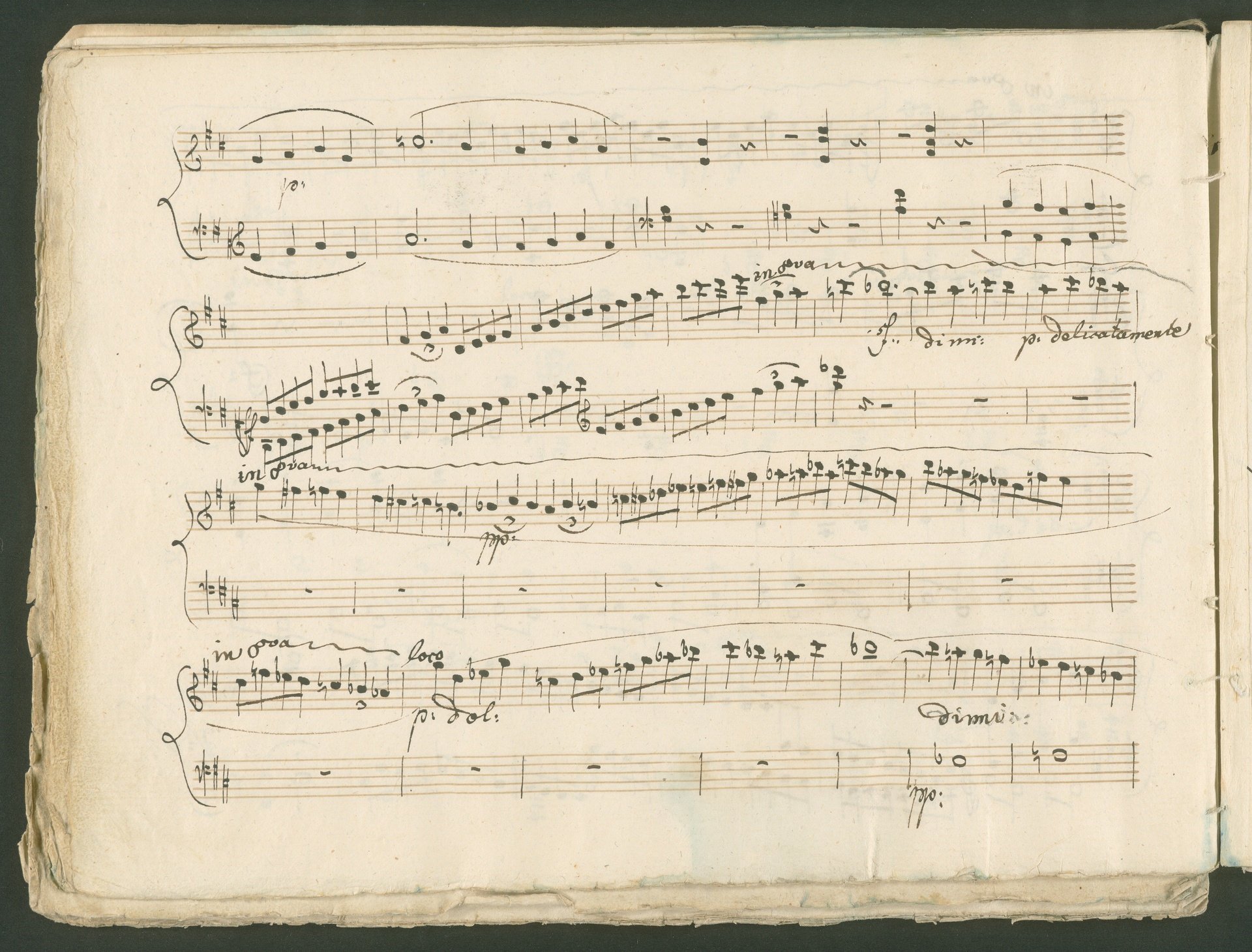 Die Abschrift hat zwei Titelblätter. Nachdem die erste Fassung (jetzt Bl. 2) mehrfach korrigiert und durch Rasuren nahezu unleserlich geworden ist, entschloss sich Beethoven offensichtlich zu einer "ordentlichen" Version, also zu einem zweiten Titelblatt (jetzt Bl. 1). Dieses zweite Blatt - aus einer anderen Papiersorte - wurde auf den ursprünglichen Titel aufgenäht (die Naht ist mittlerweile weitgehend geöffnet). Neben Titel, Widmung (an die Gräfin Erdödy) und Unterschrift ist darauf rechts quer und durchgestrichen eine weitere Bemerkung von Beethovens Hand verzeichnet: "Dieses wird die Baronin Ertmann den kommenden Dinstag spielen". Freifrau Dorothea von Ertmann war eine begabte und virtuose Pianistin, die Beethoven nicht nur als Interpretin sehr schätzte - er widmete ihr auch die Klaviersonate op. 101. Möglicherweise spricht Beethoven von der vorliegenden Abschrift, als er seinen Freund Nikolaus Zmeskall am 16. April 1809 brieflich bittet: "Wenn ich nicht komme lieber Z, welches leicht geschehen kann, bitten sie die Baronin Ertmann daß sie ihnen die Klawierstimme von dem Terzett da läßt, und haben sie hernach die Gefälligkeit mir solche mit den übrigen Stimmen noch heute zu schicken" (BGA 377, Beethoven an Nikolaus Zmeskall [Wien, 16. April 1809]). Die überprüfte Abschrift trägt zahlreiche dynamische Vorschriften, teilweise ausführlicher als das Autograph oder die Originalausgabe. Zudem enthält sie auf Bl. 7r (Bild 13) eigenhändige Fingersätze Beethovens. Hat die Freifrau Ertmann aus dieser Stimme musiziert, von Beethoven für sie eingerichtet? (J.R.)