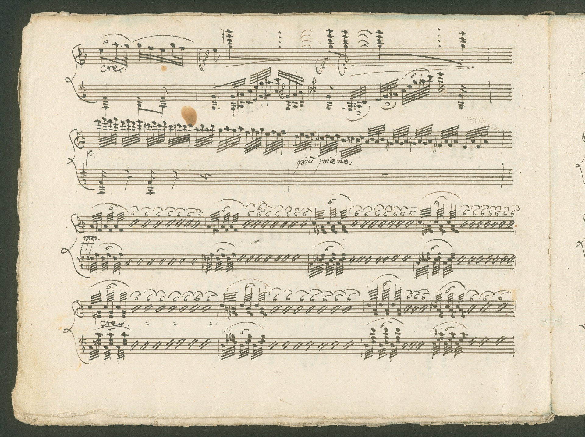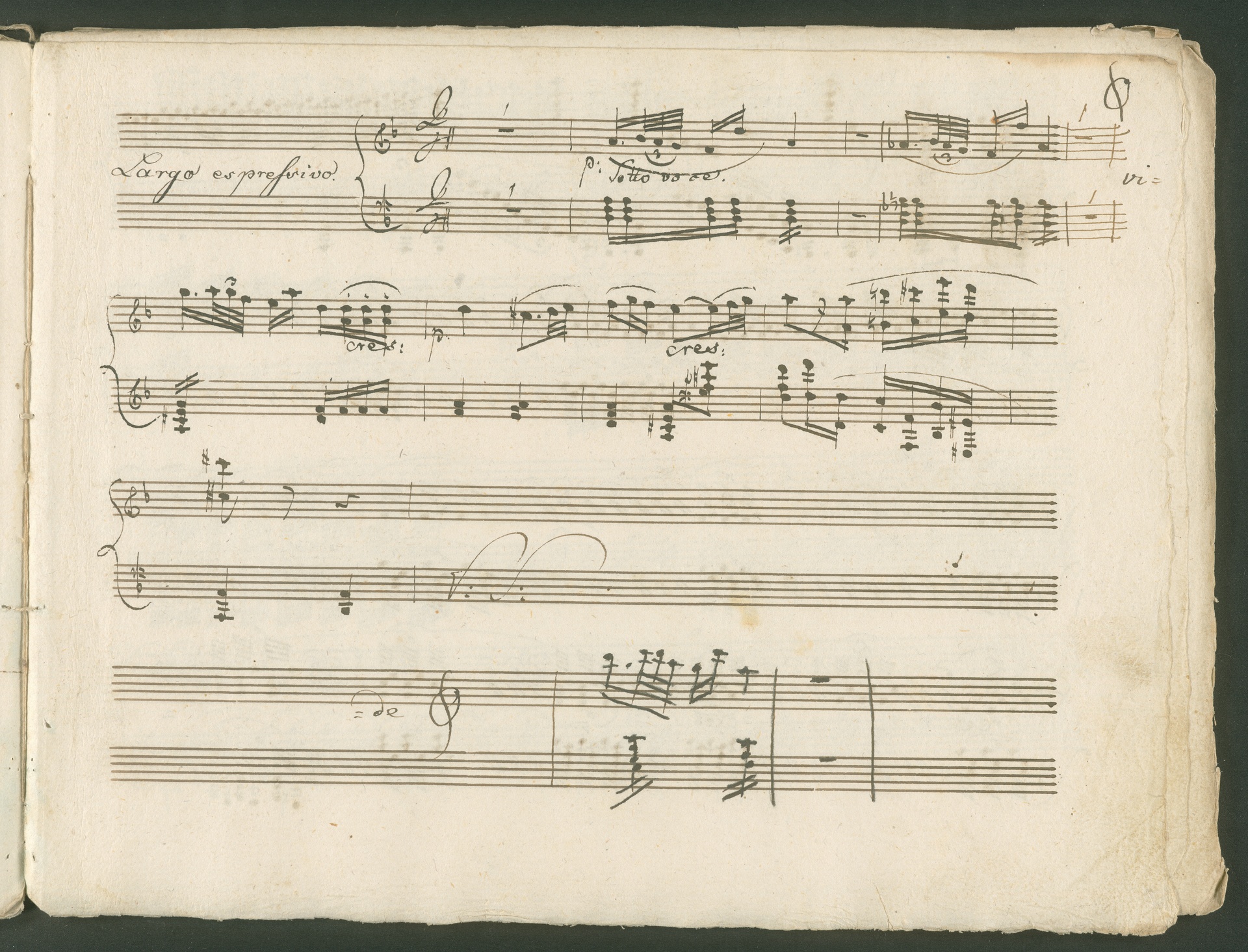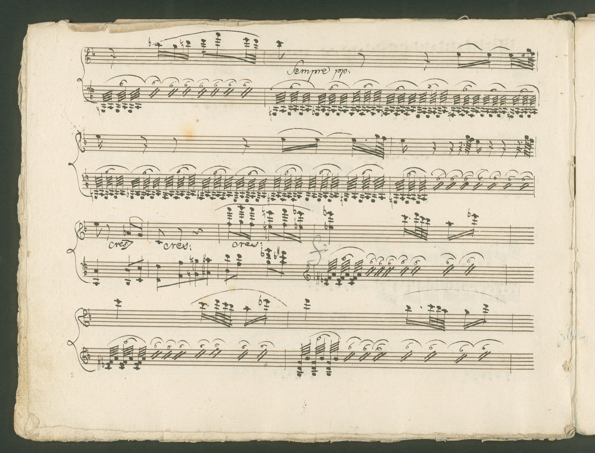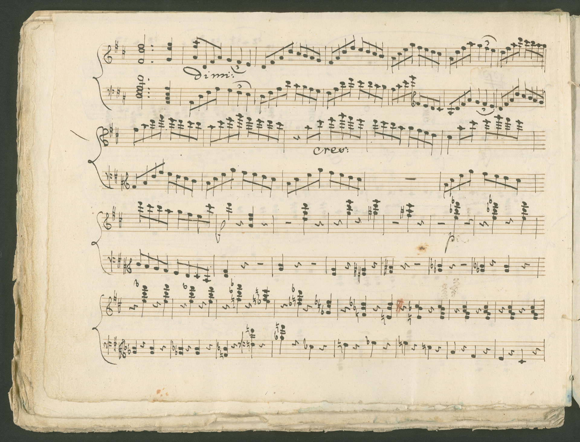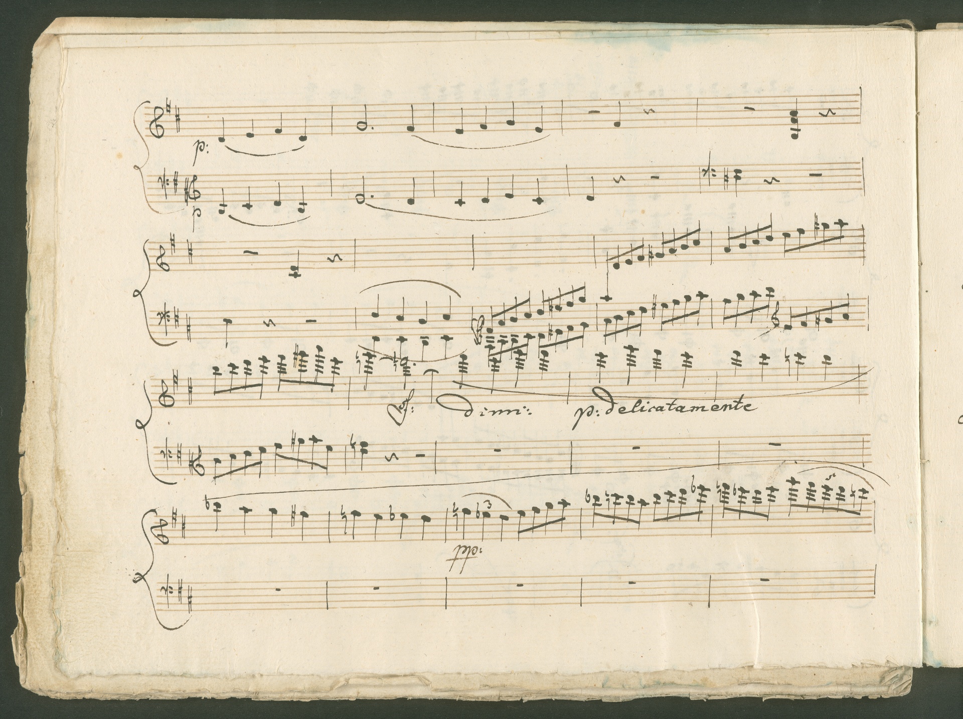Die Abschrift hat zwei Titelblätter. Nachdem die erste Fassung (jetzt Bl. 2) mehrfach korrigiert und durch Rasuren nahezu unleserlich geworden ist, entschloss sich Beethoven offensichtlich zu einer "ordentlichen" Version, also zu einem zweiten Titelblatt (jetzt Bl. 1). Dieses zweite Blatt - aus einer anderen Papiersorte - wurde auf den ursprünglichen Titel aufgenäht (die Naht ist mittlerweile weitgehend geöffnet). Neben Titel, Widmung (an die Gräfin Erdödy) und Unterschrift ist darauf rechts quer und durchgestrichen eine weitere Bemerkung von Beethovens Hand verzeichnet: "Dieses wird die Baronin Ertmann den kommenden Dinstag spielen". Freifrau Dorothea von Ertmann war eine begabte und virtuose Pianistin, die Beethoven nicht nur als Interpretin sehr schätzte - er widmete ihr auch die Klaviersonate op. 101. Möglicherweise spricht Beethoven von der vorliegenden Abschrift, als er seinen Freund Nikolaus Zmeskall am 16. April 1809 brieflich bittet: "Wenn ich nicht komme lieber Z, welches leicht geschehen kann, bitten sie die Baronin Ertmann daß sie ihnen die Klawierstimme von dem Terzett da läßt, und haben sie hernach die Gefälligkeit mir solche mit den übrigen Stimmen noch heute zu schicken" (BGA 377, Beethoven an Nikolaus Zmeskall [Wien, 16. April 1809]). Die überprüfte Abschrift trägt zahlreiche dynamische Vorschriften, teilweise ausführlicher als das Autograph oder die Originalausgabe. Zudem enthält sie auf Bl. 7r (Bild 13) eigenhändige Fingersätze Beethovens. Hat die Freifrau Ertmann aus dieser Stimme musiziert, von Beethoven für sie eingerichtet? (J.R.)