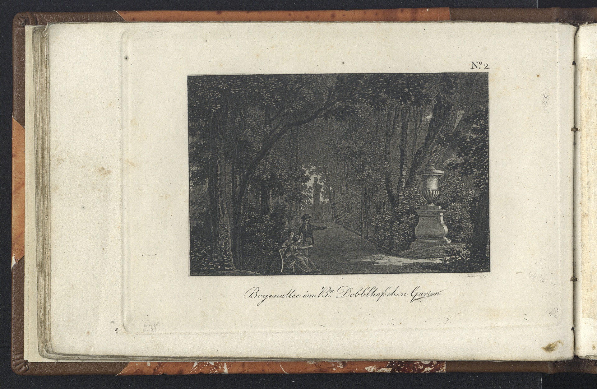 Baden, Bogenallee im Dobblhofschen Garten - Aquatinta-Radierung von Christian Haldenwang, erschienen bei Geistinger, Wien und Baden, 1803