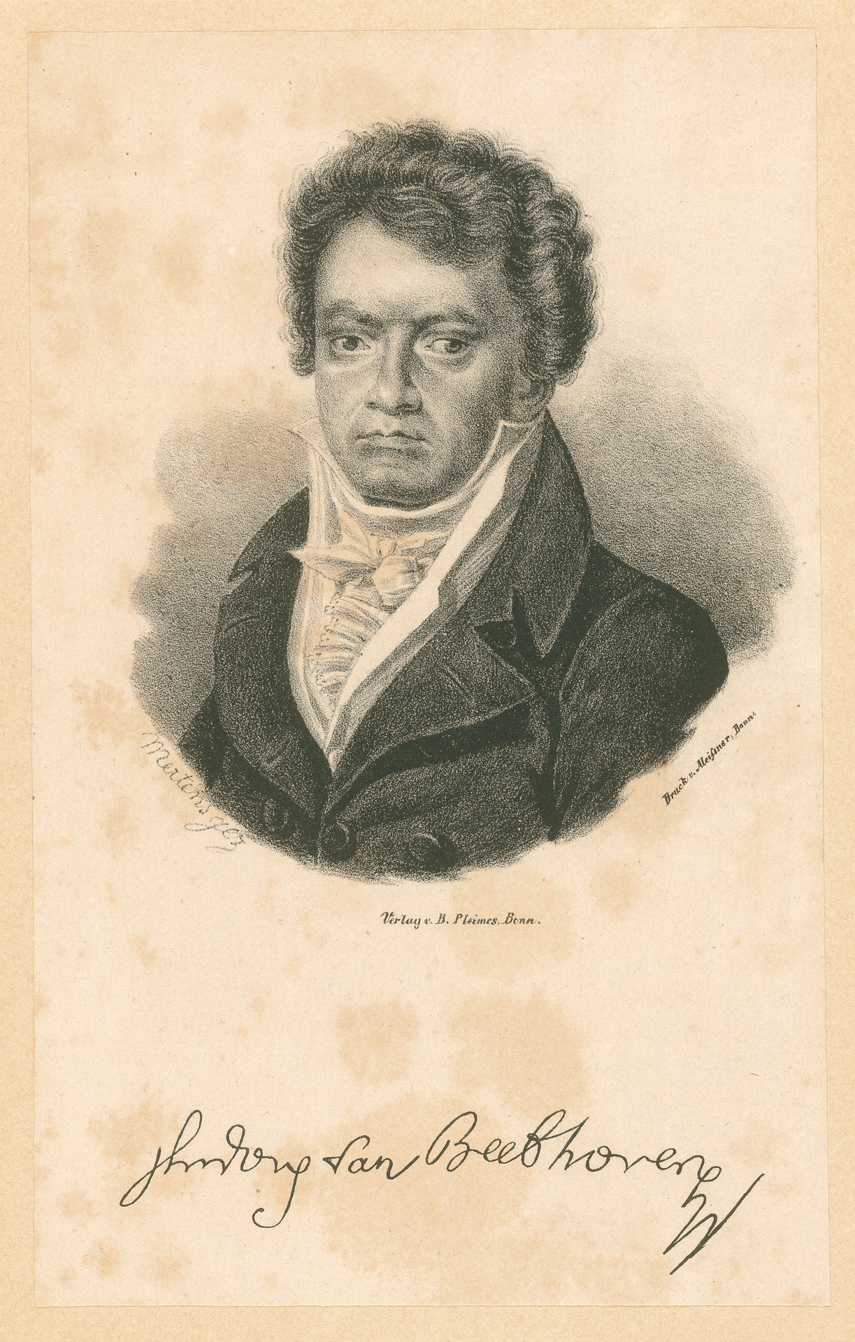 Ludwig van Beethoven - Lithographie von Mertens (möglicherweise Christian Heinrich Ludwig) nach dem Stich von Blasius Höfel von 1814, dem eine Zeichnung von Louis Letronne zu Grunde lag, erschienen im Verlag Pleimes, Bonn, 1845
