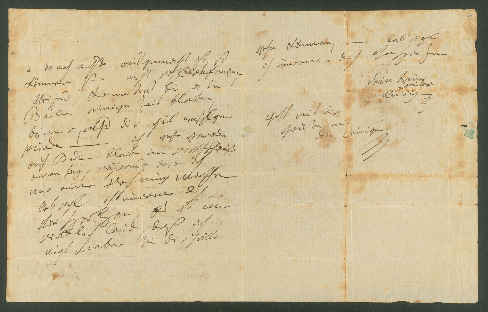 Beethoven verweist auf einen Brief, den er seinem Bruder Johann über Steiner hat zukommen lassen. Sein Arzt dränge ihn zu einer Kur in Baden. Er plane daher, am folgenden Tag, spätestens am Tag danach abzureisen. Beethoven ist enttäuscht, keine Gelegenheit mehr gehabt zu haben, mit seinem Bruder kaufmännische Dinge durchzusprechen, so z.B. die Drucklegung von op. 113 bei Steiner zur Eröffnung des Josephstädter Theaters. Er schlägt vor, Johann könne ihn in Baden besuchen. (J.R.)