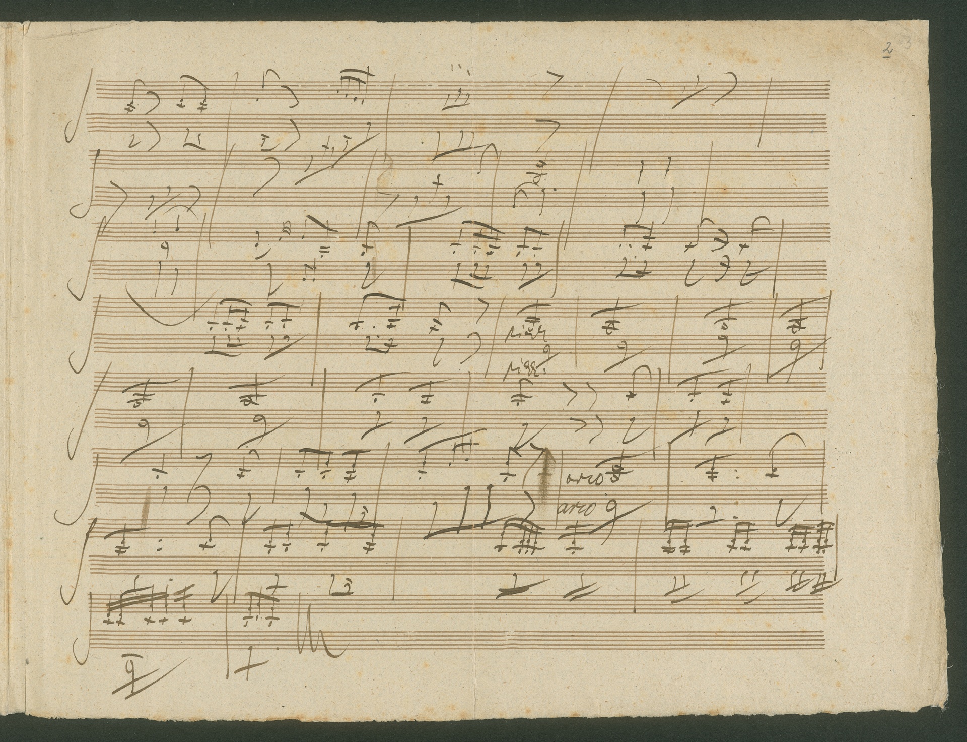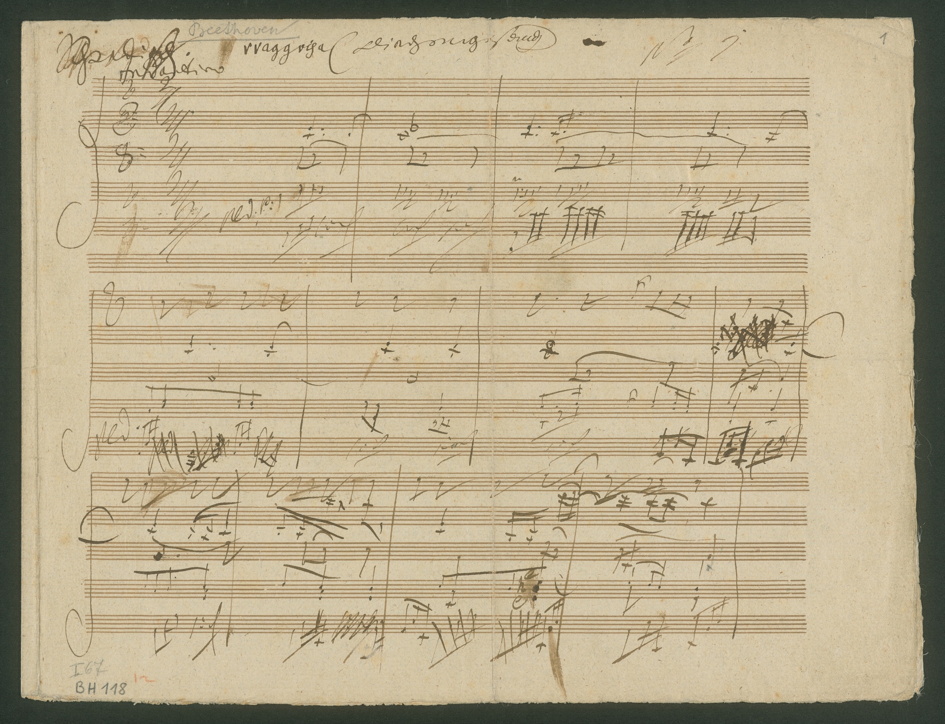 Nachdem Beethoven in den Jahren 1810-1815 bereits erfolgreich etliche irische, schottische und walisische Volkslieder für den schottischen Liedsammler und Verleger George Thomson bearbeitet hatte, trat dieser am 1. Januar 1816 mit einer neuen Idee an den Komponisten heran. Er wollte sich jetzt nicht mehr auf Großbritannien beschränken, sondern dachte über Veröffentlichungen kontinentaler Lieder nach. In besagtem Brief dachte er konkret an jeweils zwei oder drei Lieder aus Deutschland, Polen, Russland, Tirol, Venedig und Spanien. Beethoven schickte Thomson ein Paket mit entsprechenden Vertonungen am 2. Mai 1816. In dem Brief vom 8. Juli 1816, mit dem Thomson die Lieferung bestätigte, wünschte sich der Verleger zusätzlich noch elf weitere Lieder. Sieben Melodien schickte er in dem Schreiben mit, vier weitere sollte sich Beethoven selbst aussuchen, vorzugsweise ein schwedisches, dänisches, sizilisches und kalabrisches Lied. Beethoven wählte eine schwedische, eine ungarische und zwei tirolische Melodien, die er nach der für Thomson üblichen Art umsetzte: für eine Singstimme mit Begleitung für Klavier, Violine und Violoncello. Drei dieser vier Vertonung finden sich auf diesem Blatt. Auf den beiden ersten Seiten die vollständige Niederschrift des schwedischen Wiegenlieds (WoO 158, 1. Abteilung Nr. 17), allerdings ohne die Singstimme. Auf Seite 2 unten beginnt ein Entwurf des Tiroler Lieds (WoO 158, 1. Abteilung Nr. 7) und auf der letzten Seite befindet sich eine Skizze zum ungarischen Weinleselied (WoO 158, 1. Abteilung Nr. 22). Woher Beethoven die Melodien nahm, ist nicht ganz klar. Das ungarische Lied erschien im 16. Jahrgang der Allgemeinen musikalischen Zeitung 1816, nicht jedoch das schwedische Wiegenlied. Gedruckte Volksliedsammlungen gab es damals jedoch schon im Handel zu kaufen. (J.R.)