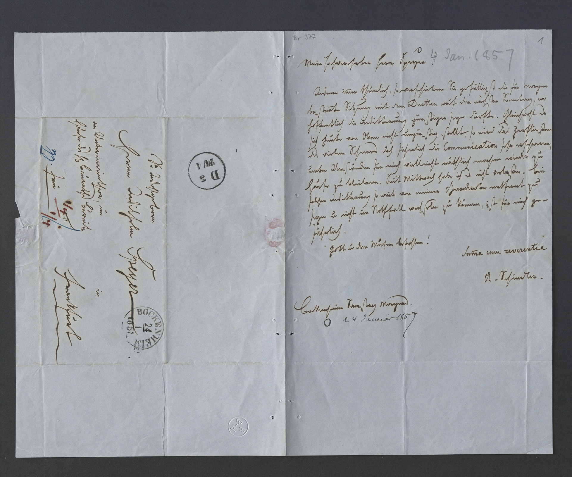 Anton Schindler, Brief an Wilhelm Speyer in Frankfurt am Main, Bockenheim, 24. Januar 1857, Autograph