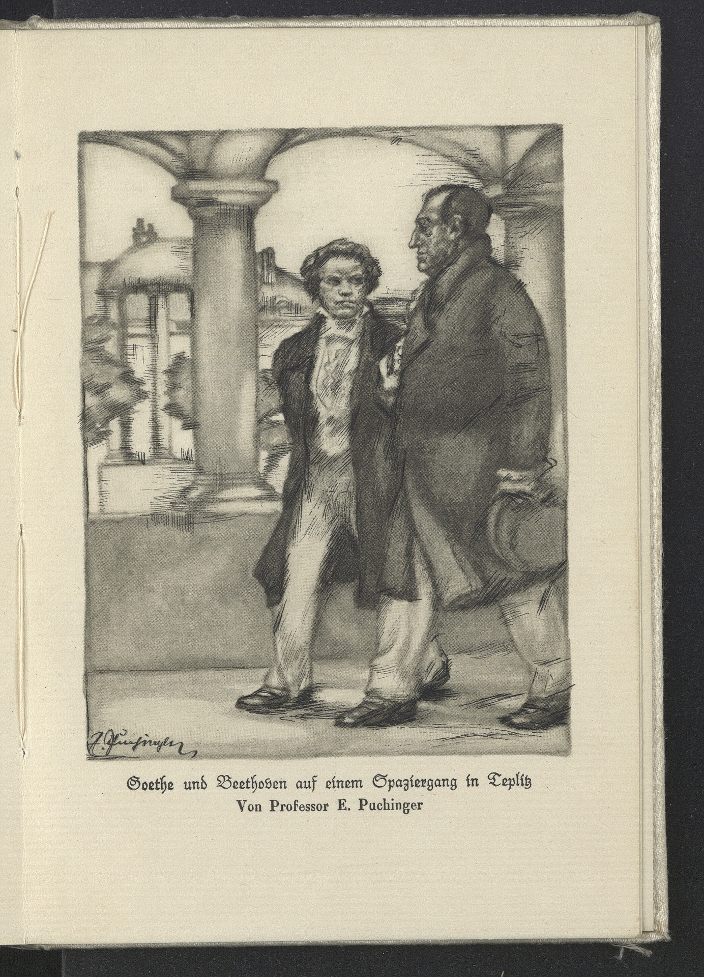 Beethoven und Goethe auf einem Spaziergang in Teplitz - Druck einer Zeichnung von Erwin Puchinger, gedruckt bei Elbemühl Papierfabriken und Graphische Industrie, Wien 1927