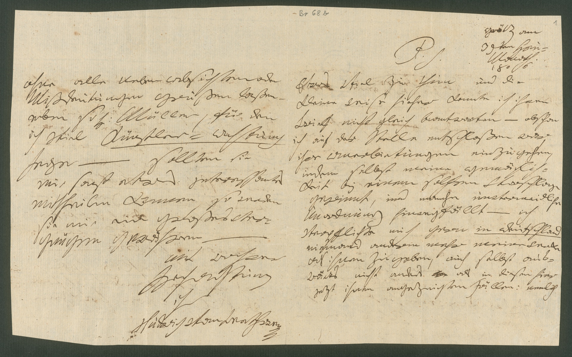 Zuletzt betont er in Bezug auf seinen letzten Brief vom 5. Juli (HCB Br 67, BG 254), die Grüße an Friedrich Rochlitz und August Eberhard Müller seien nicht ironisch gemeint gewesen, "ich habe ihn wirklich von Herzen ohne alle NebenAbsichten oder Mißdeutungen grüßen laßen" (was tatsächlich der Formulierung nicht ohne weiteres zu entnehmen war).