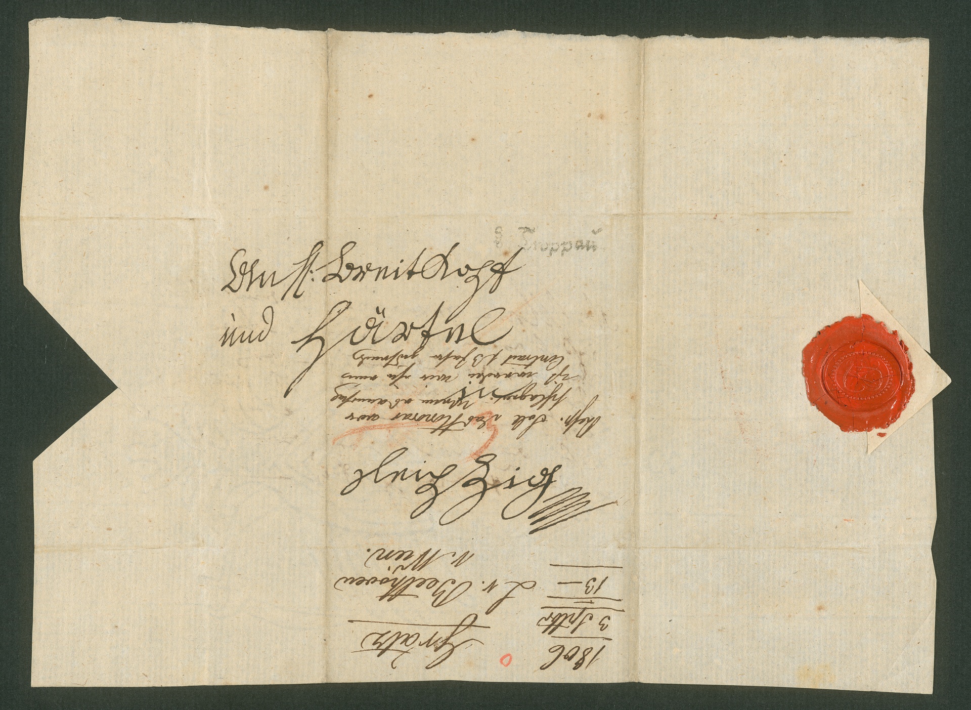 In einer Nachschrift auf der Umschlagrückseite teilt er seinen Aufenthaltsort bei Fürst Lichnowsky in Troppau/Schlesien mit. (J.R.)