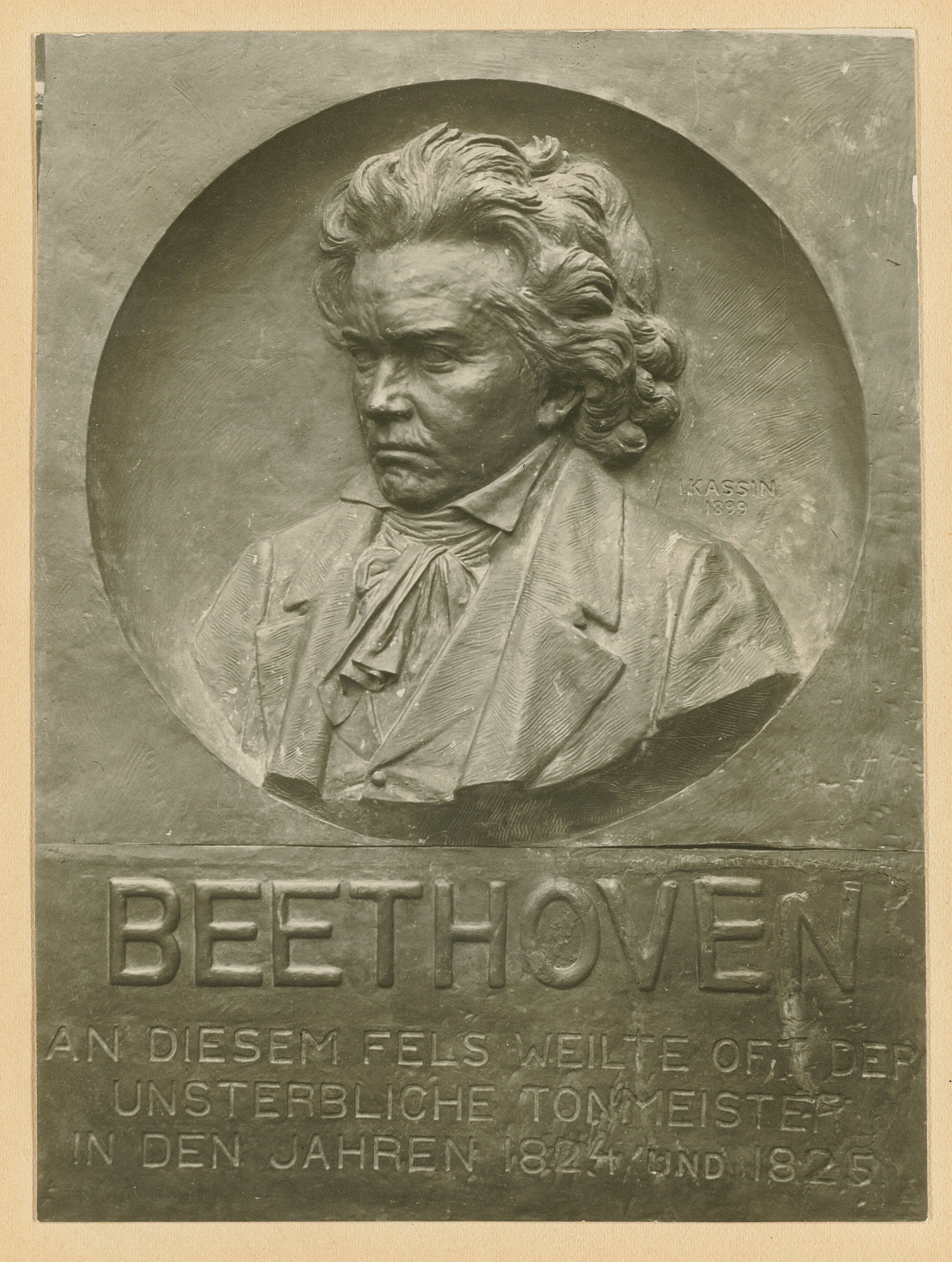 Ludwig van Beethoven, Gedenktafel - reliefierte Gedenkplatte von Joseph Kassin am Beethovenstein in Baden (Helenental), 1900 enthüllt, Fotografie, Baden, um 1925