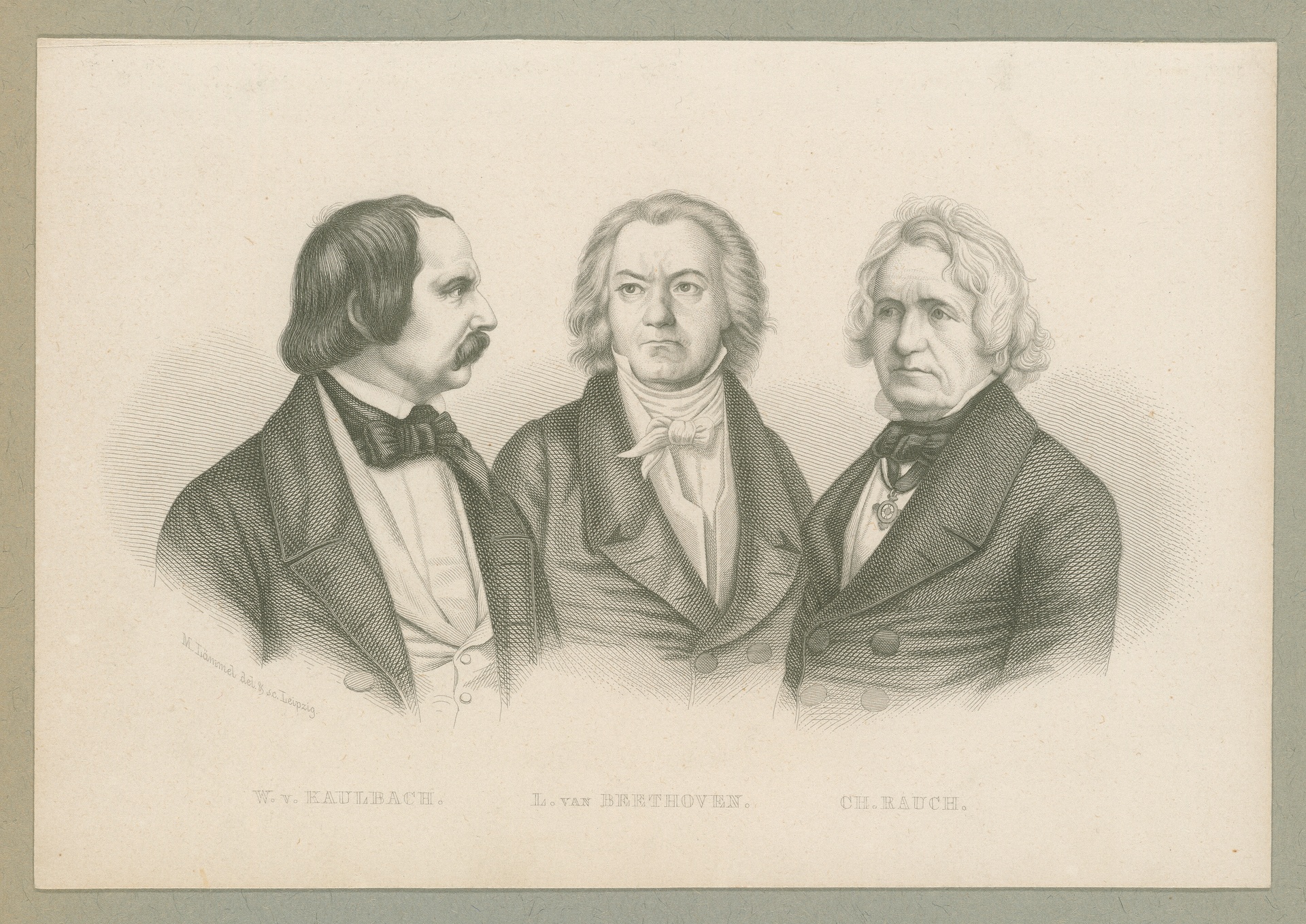 Gruppenportrait: Ludwig van Beethoven, Wilhelm von Kaulbach und Christian Daniel Rauch - Stich von M. Lämmel nach einer eigenen Zeichnung
