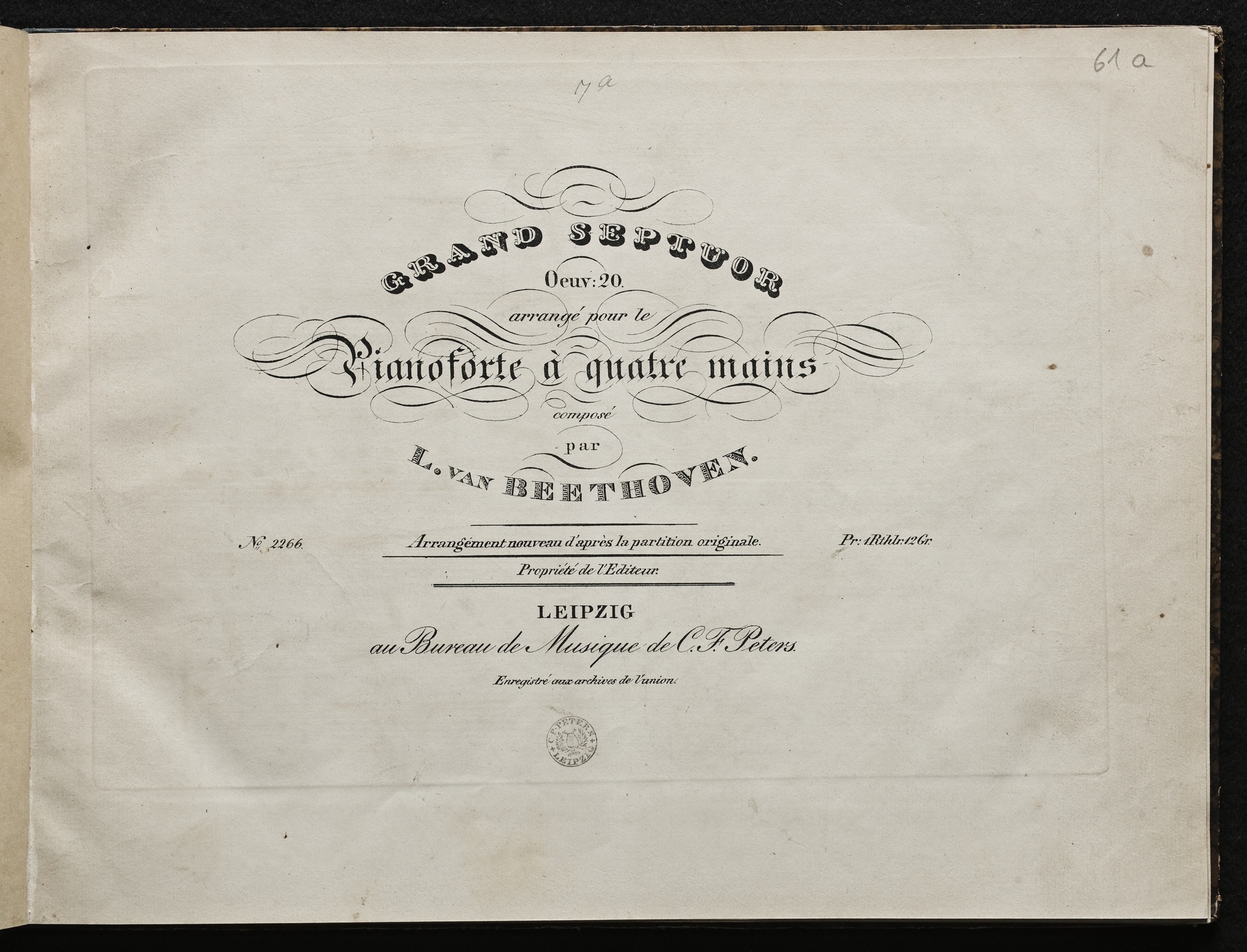 Ludwig van Beethoven, Septett für Violine, Viola, Klarinette, Horn, Fagott, Violoncello, Kontrabass (Es-Dur) op. 20, Bearbeitung für Klavier zu 4 Händen, Peters, 2266