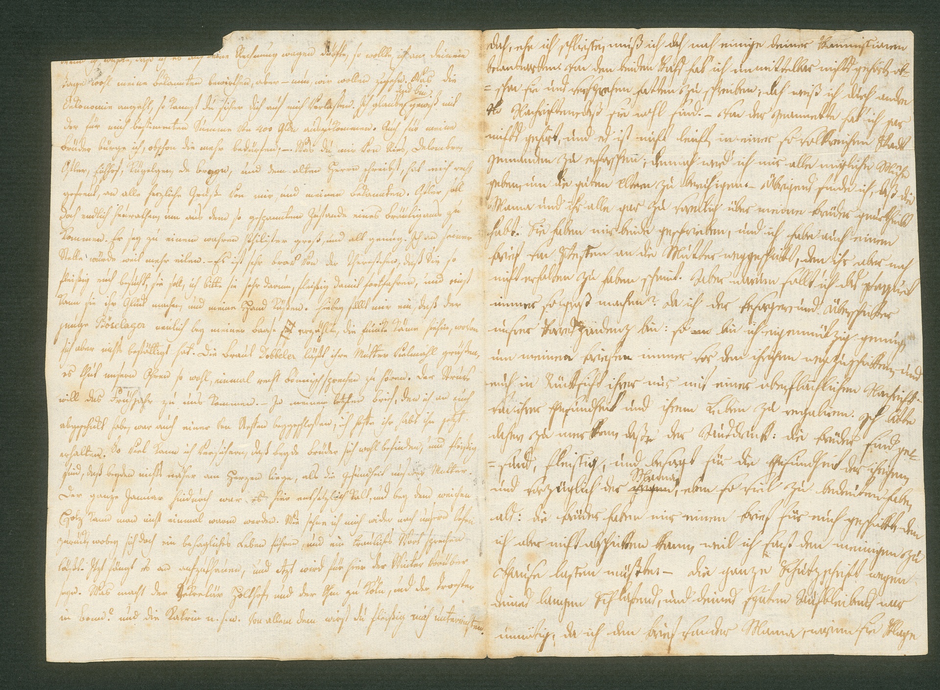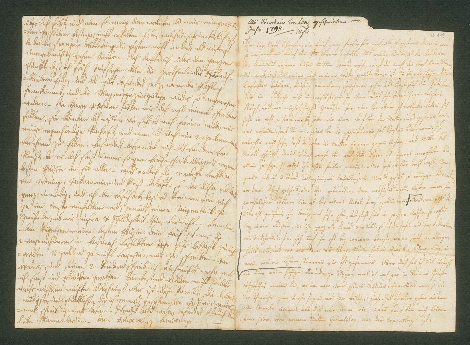 Am 9. Januar 1795 erhielt Lorenz von Breuning einen Brief von seiner Schwester Eleonore, in dem sie von der sich bessernden Gesundheit ihrer Mutter und von gemeinsamen Bonner Freunden berichtete. Lorenz rät der Mutter, den ärztlichen Empfehlungen zu folgen, spazieren zu gehen, im Frühjahr eine Kräuterkur zu machen, streng Diät zu halten, nur mageres Fleisch und frisches Gemüse, aber nichts Schwerverdauliches zu essen. Da sich Lorenz noch nicht ans Alleinsein gewöhnt hat, möchte er wenigstens eine Zeit lang zwei Briefe im Monat von zu Hause erhalten. Er besucht täglich vier Kollegstunden und geht abends zu Bekannten, um mit ihnen Schach zu spielen, Tee zu trinken oder zu musizieren. Er trifft sich oft mit Beethoven, der sich in Wien gut eingerichtet hat und ein angesehener Komponist geworden ist. Theaterbesuche gibt es nur selten. Lorenz kommt mit 400 Gulden für den Lebensunterhalt aus. Eine verantwortliche Haushaltung kann Lorenz auch für seine in Jena und Göttingen Jura studierenden Brüder Christoph und Stephan verbürgen, auch wenn sie mehr Geld bräuchten als er. Er weiß, dass es ihnen gut geht und sie fleißig sind. Eleonores Grüße und Nachrichten von Bonner Freunden (unter anderen fallen die Namen Ries, Ostler, Eichhof, Kügelgen, Delombre) werden kurz kommentiert und erwidert. Lorenz sehnt sich an den warmen Ofen zu Hause zurück und vermisst das behagliche, vertraute Leben im Kreis der Familie. Eleonore erwartete auch Mitteilungen über Bonner Bekannte, die sich in Wien aufhielten. Lorenz weiß jedoch wenig, da sie in der großen Stadt schwer zu erreichen sind. Er will sich bemühen, etwas über Jeannette d'Honrath in Erfahrung bringen, damit ihre Eltern beruhigt sein können. Über die geschätzte Familie Werner wird er ein anderes Mal berichten. Lorenz verteidigt seine Brüder gegen Eleonores Vorwurf, sie würden ihre Angehörigen in Bonn vernachlässigen. Sie haben ihm beide geschrieben, aber Lorenz leitet die Briefe erst weiter, wenn er seinen eigenen fertiggestellt hat. (F.G.)