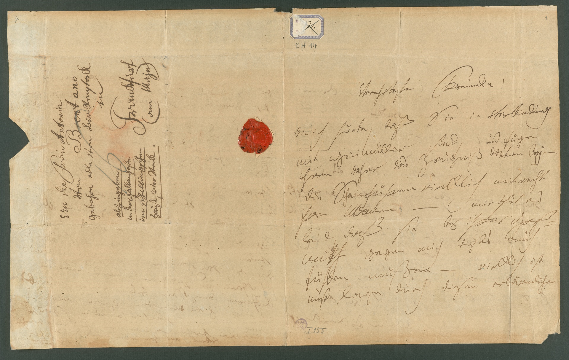 Beethoven übersendet einen "Schein", vermutlich einen Schuldschein. Er hatte in den Jahren 1813/14 mehrere Darlehen bei Franz und Antonie Brentano aufgenommen und ist offenbar noch nicht in der Lage, diese zurückzuzahlen.