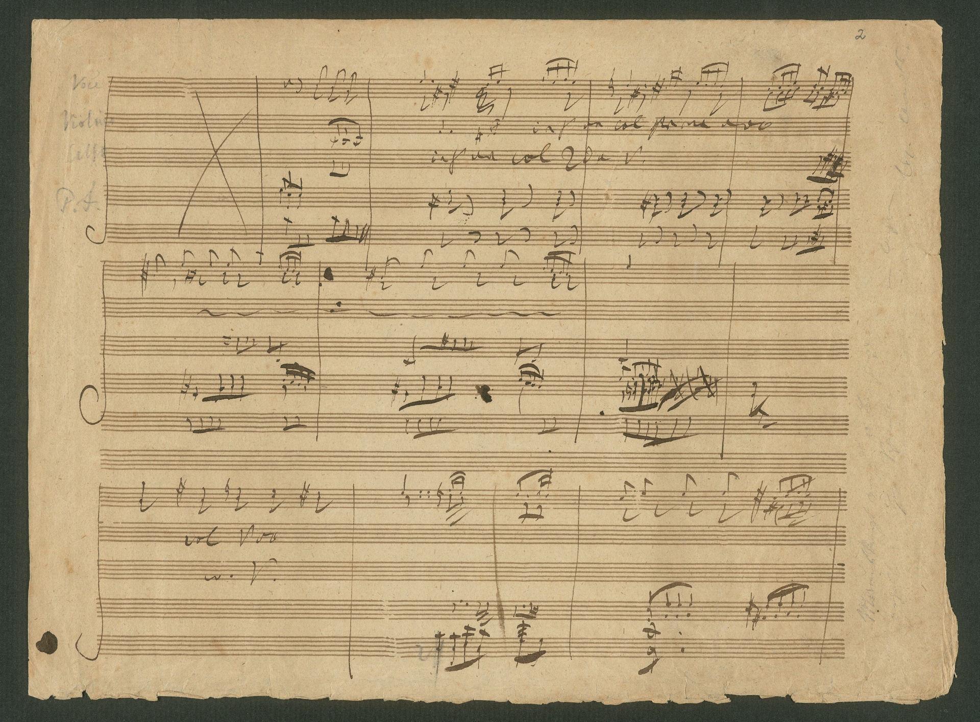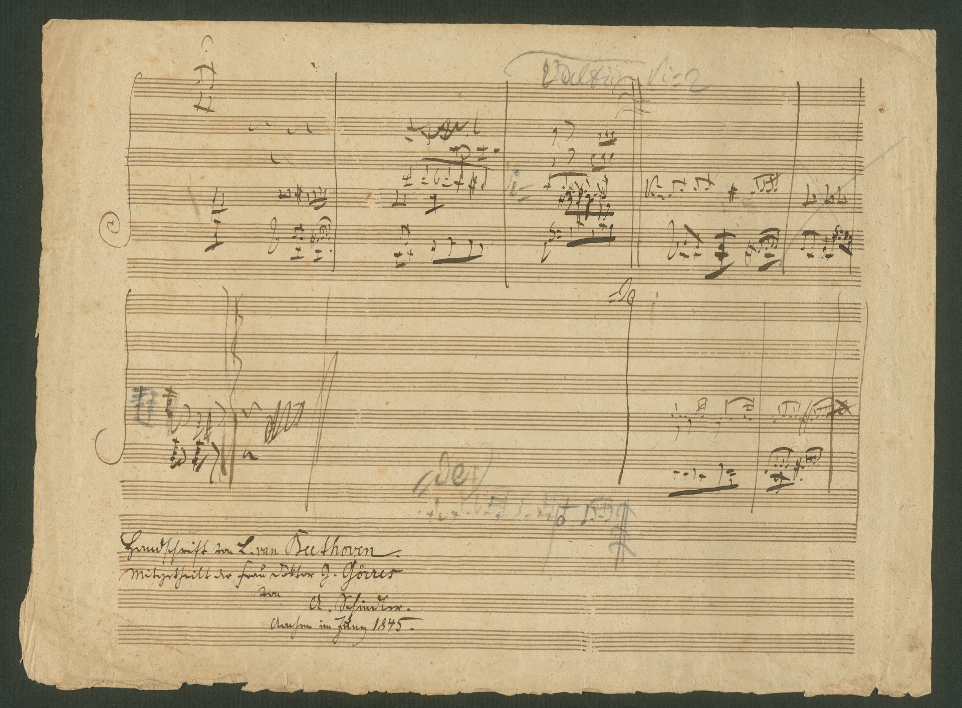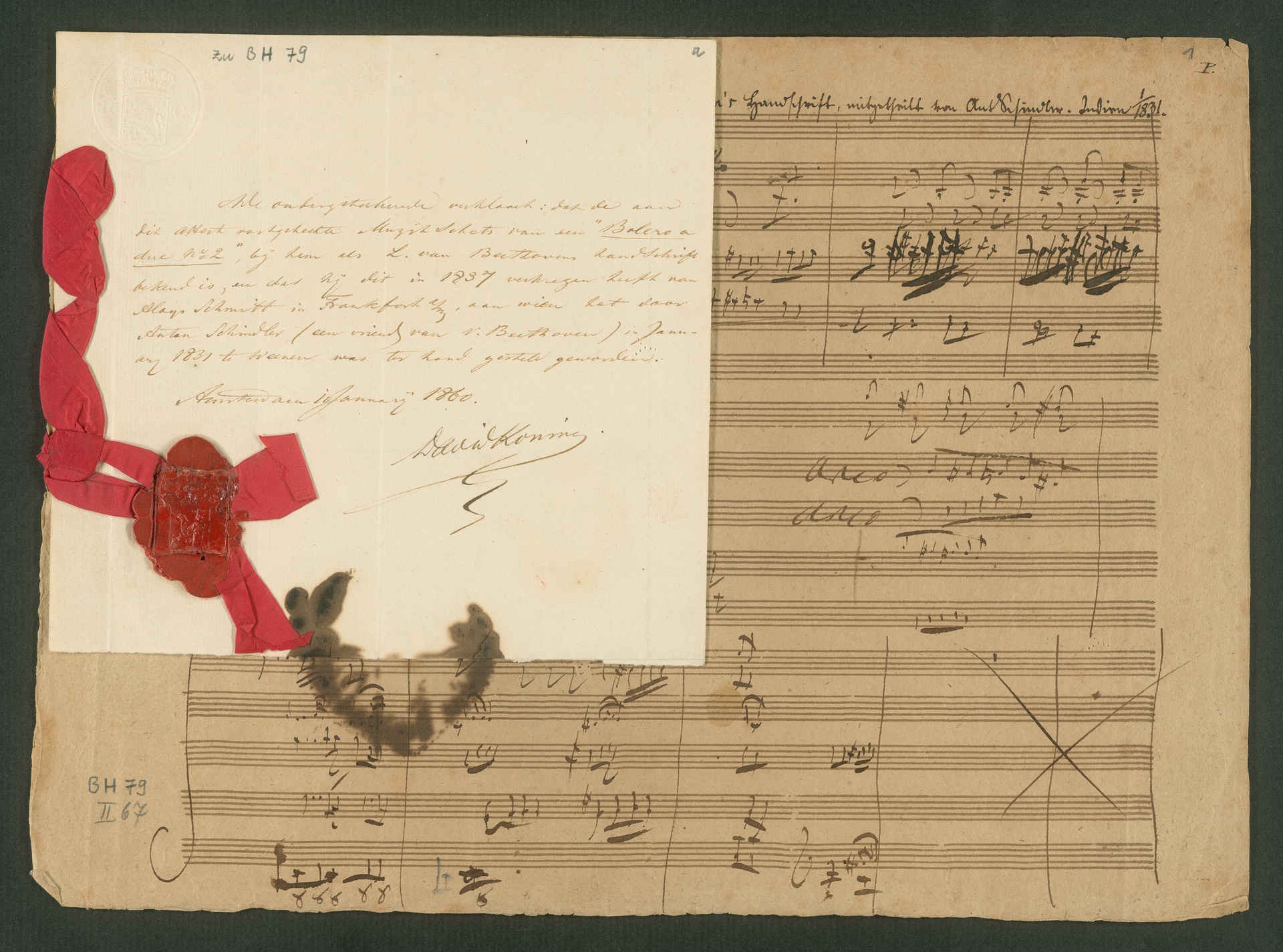 Das Autograph einer Volksliedbearbeitung, eines spanischer Bolero aus WoO 158. Angeregt durch den britischen Verleger und Volksliedsammler George Thomson, für den Beethoven zwischen 1803 und 1820 insgesamt 126 schottische, irische und walisische Lieder bearbeitete, machte sich Beethoven im Frühjahr 1816 daran, selbst ausgewählte Melodien anderer Völker in ähnlicher Weise, für Singstimme und Klaviertrio, in Musik zu setzen. Thomson erwarb zwar im November 1818 die Eigentumsrechte an den "Liedern verschiedener Völker", veröffentlichte sie jedoch letztlich nicht. Das Lied Nr. 20 ist der zweite Bolero in der Sammlung, die als WoO 158 bekannt ist. Es beginnt - entgegen der sich auf dem Blatt befindlichen falschen Seitenzählung - auf der zweiten Seite und ist von Beethoven mit "Bolero a due N° 2" überschrieben. Auf der ersten Seite stehen die letzten Takte des vorhergehenden Liedes Nr. 19, auch einem Bolero, wahrscheinlich um den korrekten Anschluß in der Reihenfolge sicherzustellen. Die beiden Blätter der Handschrift kamen auf unterschiedlichen Wegen im Beethoven-Haus zusammen und müssen schon in der Mitte des 19. Jahrhunderts getrennt worden sein. Beide tragen unabhängige Echtheitsvermerk von der Hand Anton Schindlers, das erste Blatt einen von 1831, das zweite von 1845. (J.R.)