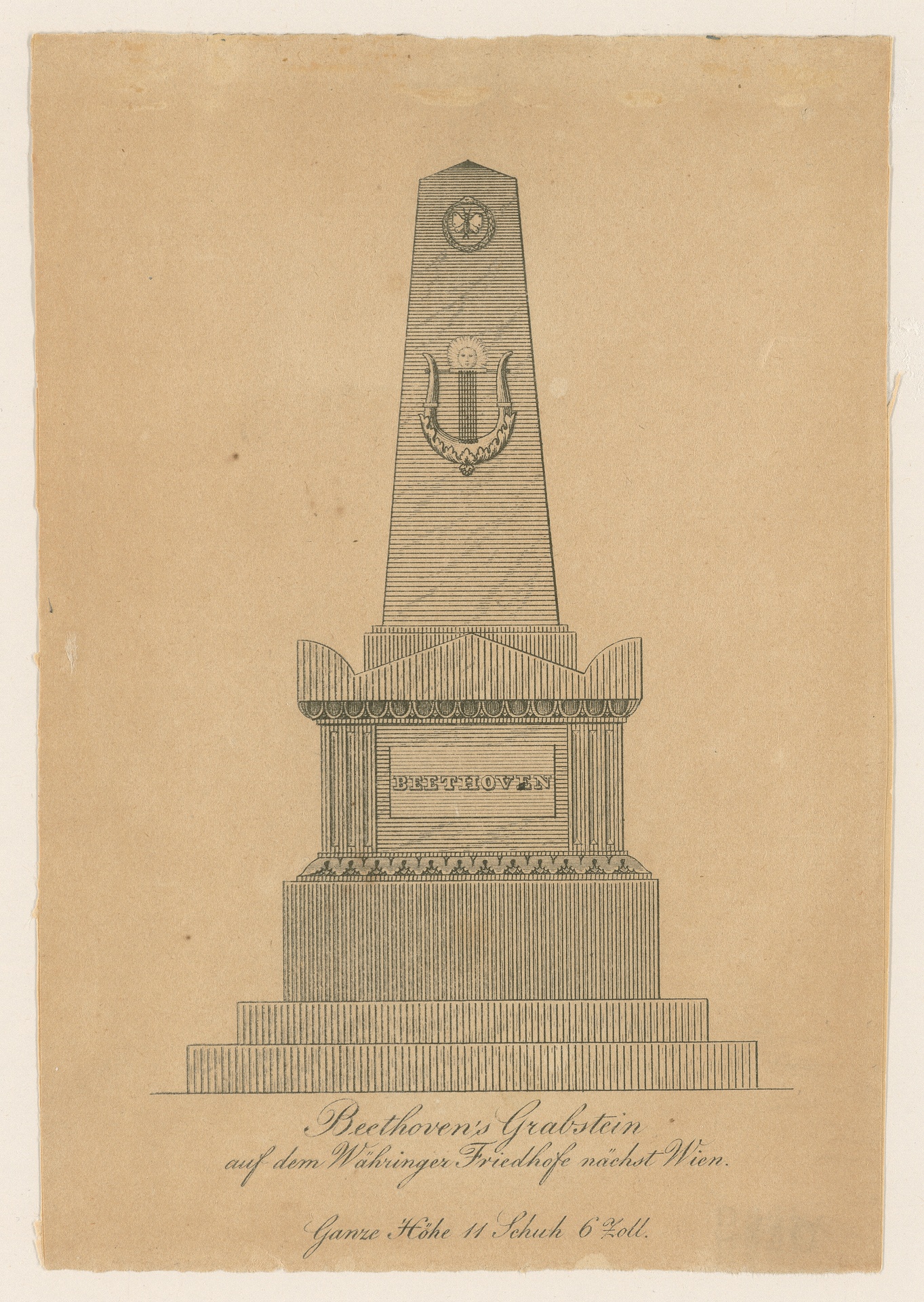 Beethovens Grabstein auf dem Währinger Ortsfriedhof, um 1829 - Nicht bezeichneter Stich mit der Abbildung des von Ferdinand Schubert entworfenen Grabmales