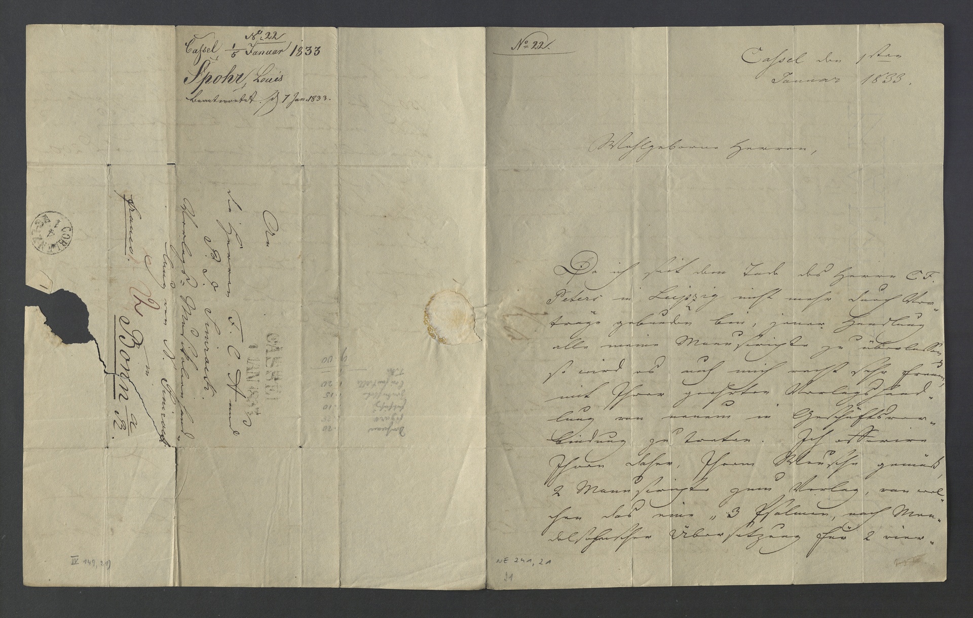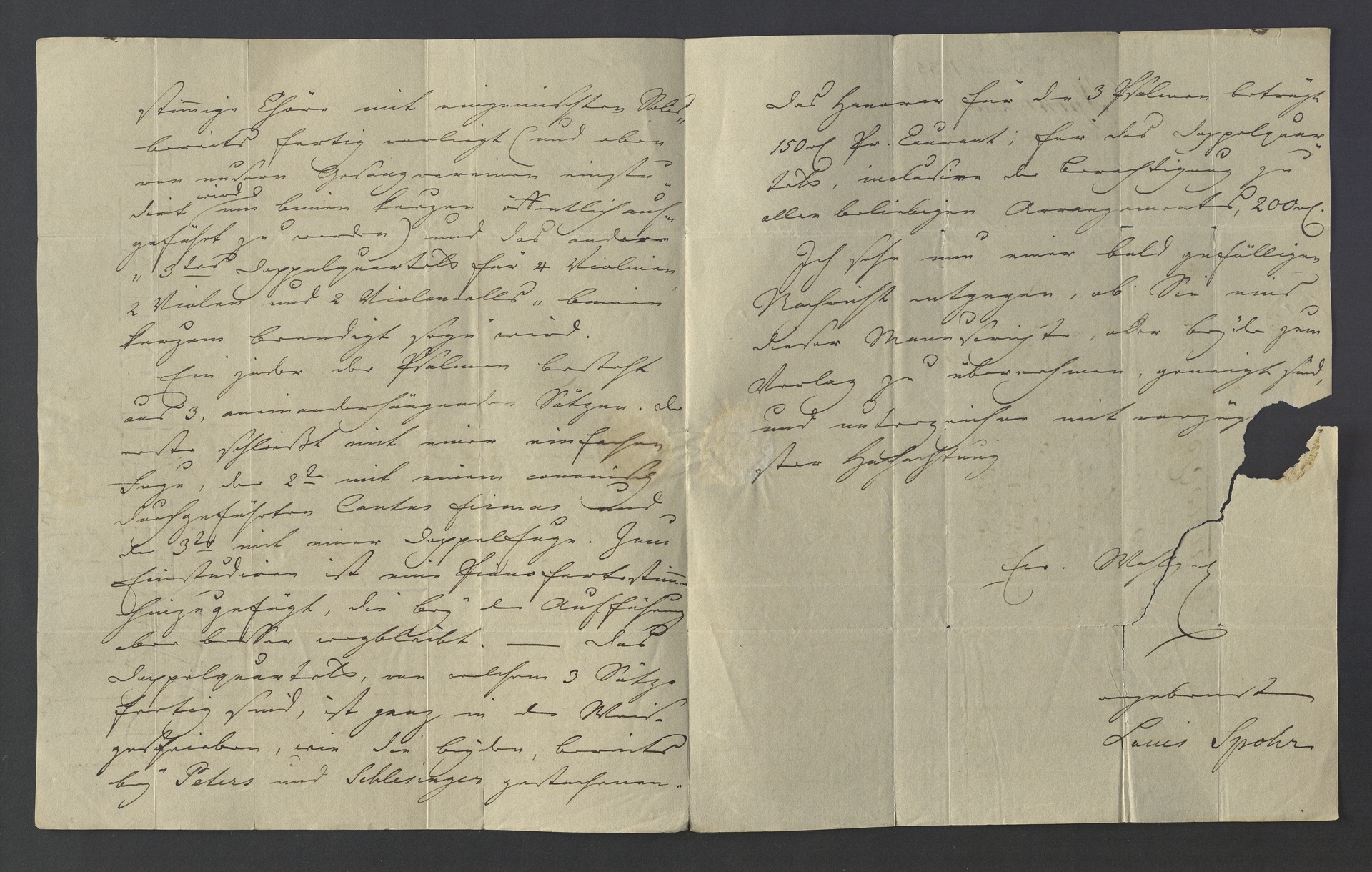 Text: "Da ich seit dem Tode des Herrn C. F. Peters in Leipzig nicht mehr durch Verträge gebunden bin, jener Handlung alle meine Manuscripte zu überlassen, so wird es auch mich recht freuen, mit Ihrer geehrten Verlagshandlung von neuem in Geschäftsverbindung zu treten. Ich offerire Ihnen daher Ihrem Wunsche gemäß, 2 Manuscripte zum Verlag, von welchem das eine 3 Psalmen nach Mendelsohnscher Übersetzung für 2 vierstimmige Chöre mit eingemischten Solis bereits fertig vorliegt (und eben von unsern Gesangvereinen einstudirt wird um binnen kurzen öffentlich aufgeführt zu werden) und das andere 3tes Doppelquartett für 4 Violinen, 2 Violen und 2 Violoncells binnen kurzem beendigt seyn wird. Ein jeder der Psalmen besteht aus 3, aneinanderhängenden Sätzen. Der erste schließt mit einer einfachen Fuge, der 2te mit einem canonisch durchgeführten Cantus firmus und der 3te mit einer Doppelfuge. Zum Einstudiren ist eine Pianofortestimme hinzugefügt, die bey der Aufführung aber besser wegbleibt. - Das Doppelquartett, von welchem 3 Sätze fertig sind, ist ganz in der Weise geschrieben, wie die beyden, bereits bey Peters und Schlesinger gesochenen. Das Honorar für die 3 Psalmen beträgt 150 Rth. Pr[eußisch] Courant; für das Doppelquartett, inclusive der Berechtigung zu allen beliebigen Arrangements, 200 Rth. Ich sehe nuneiner baldgefälligen Nachricht entgegen, ob Sie eins dieser Manuscripte, oder beyde zum Verlag zu übernehmen, geneigt sind, und unterzeichne mit vorzüglichster Hochachtung Ew. Wohlgeb. ergebenster Louis Spohr". Karl Traugott Goldbach, Spohr-Briefe: <http://bit.ly/1P6Kqsv>