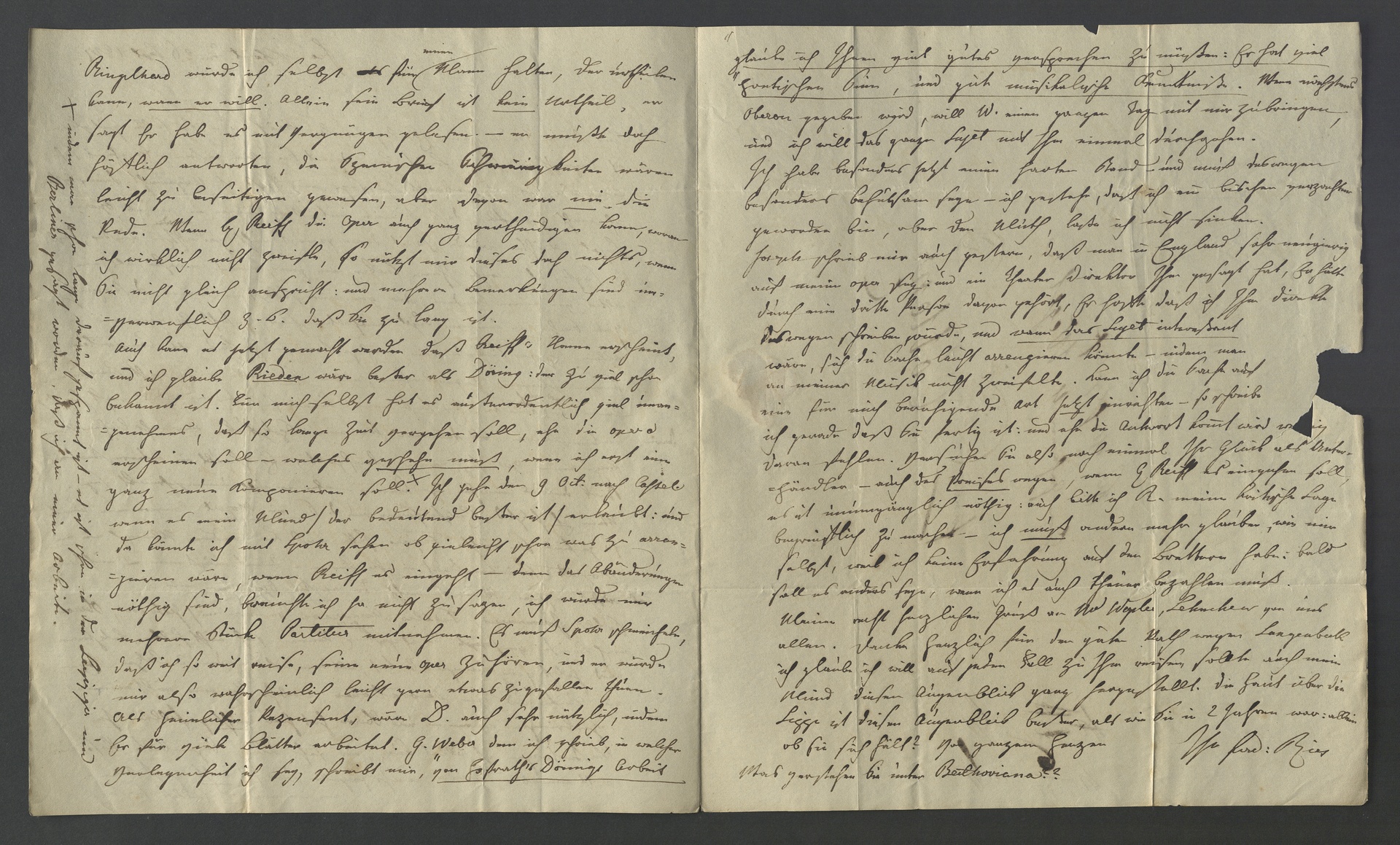 Die musikalische Welt erwartet Ries' erste Oper. "Die Räuberbraut" wurde bereits in einigen Musikzeitschriften angekündigt. Doch bevor Johann Joseph Reiff, der sein Textbuch noch immer verteidigt, nicht einlenkt und die Umarbeitung des Librettos durch einen anderen Textdichter gestattet, kann nichts geschehen. Reiffs aufgebrachte Erwiderung legt Ries zur Kenntnis Wegelers bei (nicht erhalten). Nun soll Wegeler mit Reiff verhandeln und ihm Ries' missliche Lage verständlich machen. Er müsse auf das Urteil anderer vertrauen, solange er selbst keine Erfahrung mit dem Theater habe. Außer Georg Döring scheint noch ein weiterer nicht identifizierter Textdichter geeignet, die Umarbeitung und Kürzung des Librettos vorzunehmen. Döring, dem Gottfried Weber "viel poetischen Sinn und gute musikalische Kenntnisse" zusprach, ist Ries auch als "heimlicher Rezensent" willkommen. Von Weber in Darmstadt, der das ganze Sujet mit Ries durchzugehen versprach, wie von Louis Spohr in Kassel erhofft sich Ries Unterstützung. Aus Ries' Rückfrage in der Nachschrift "Was verstehen Sie unter Beethoviana??" ist zu schließen, dass Wegeler mit der Materialsammlung für eine Beethoven-Biographie (zunächst für Schindler, siehe W 80) begonnen hat. (F.G.)