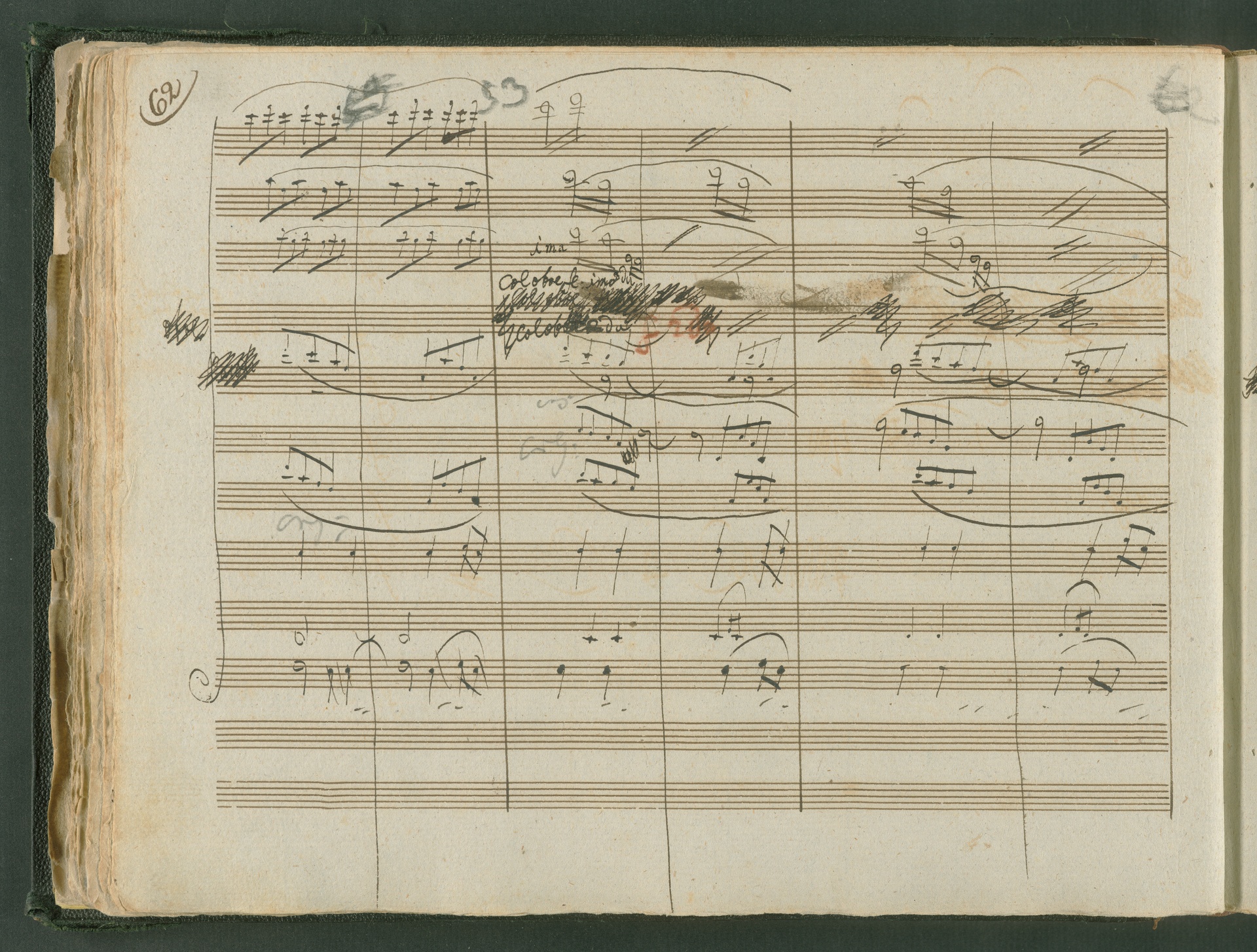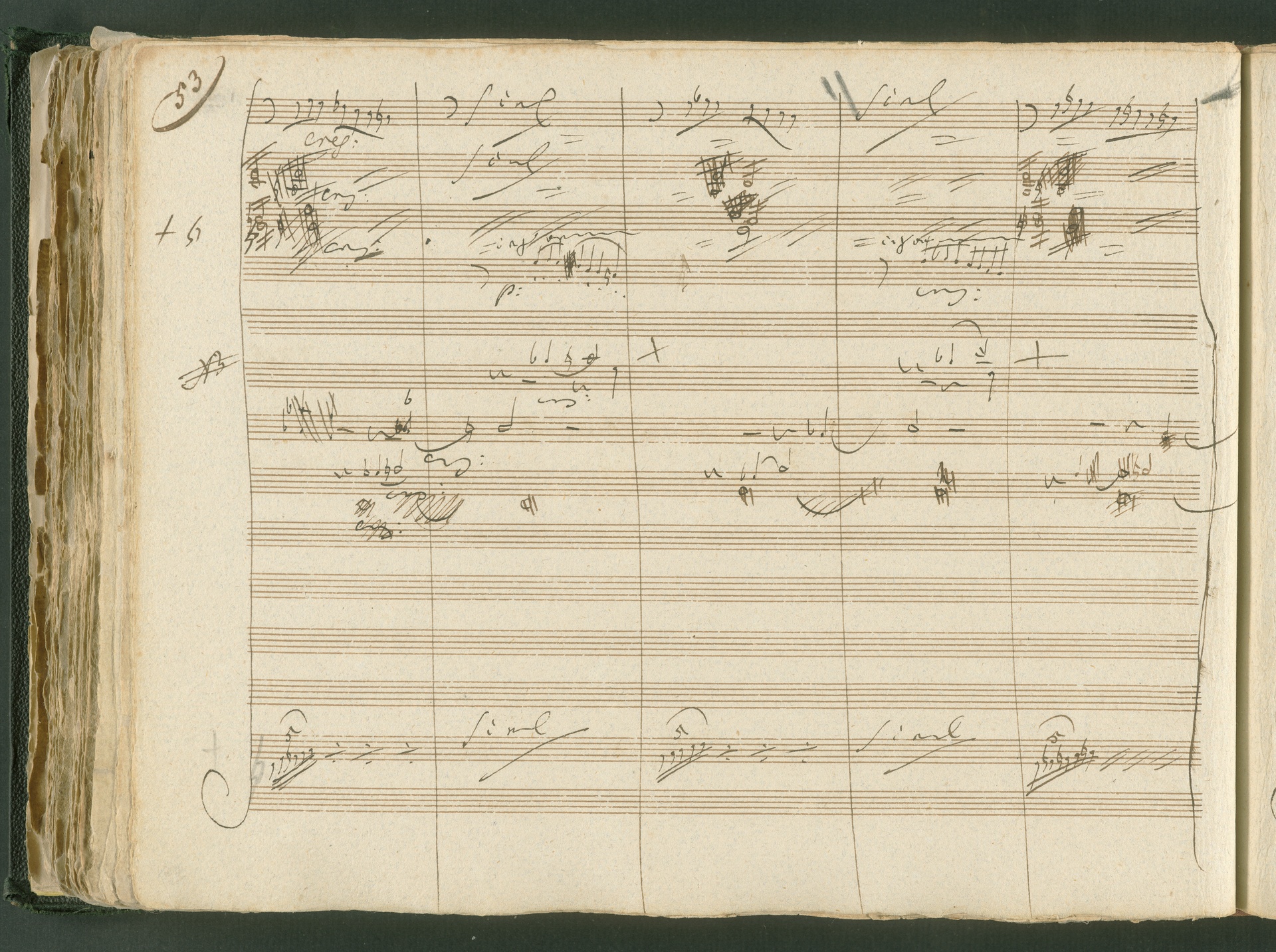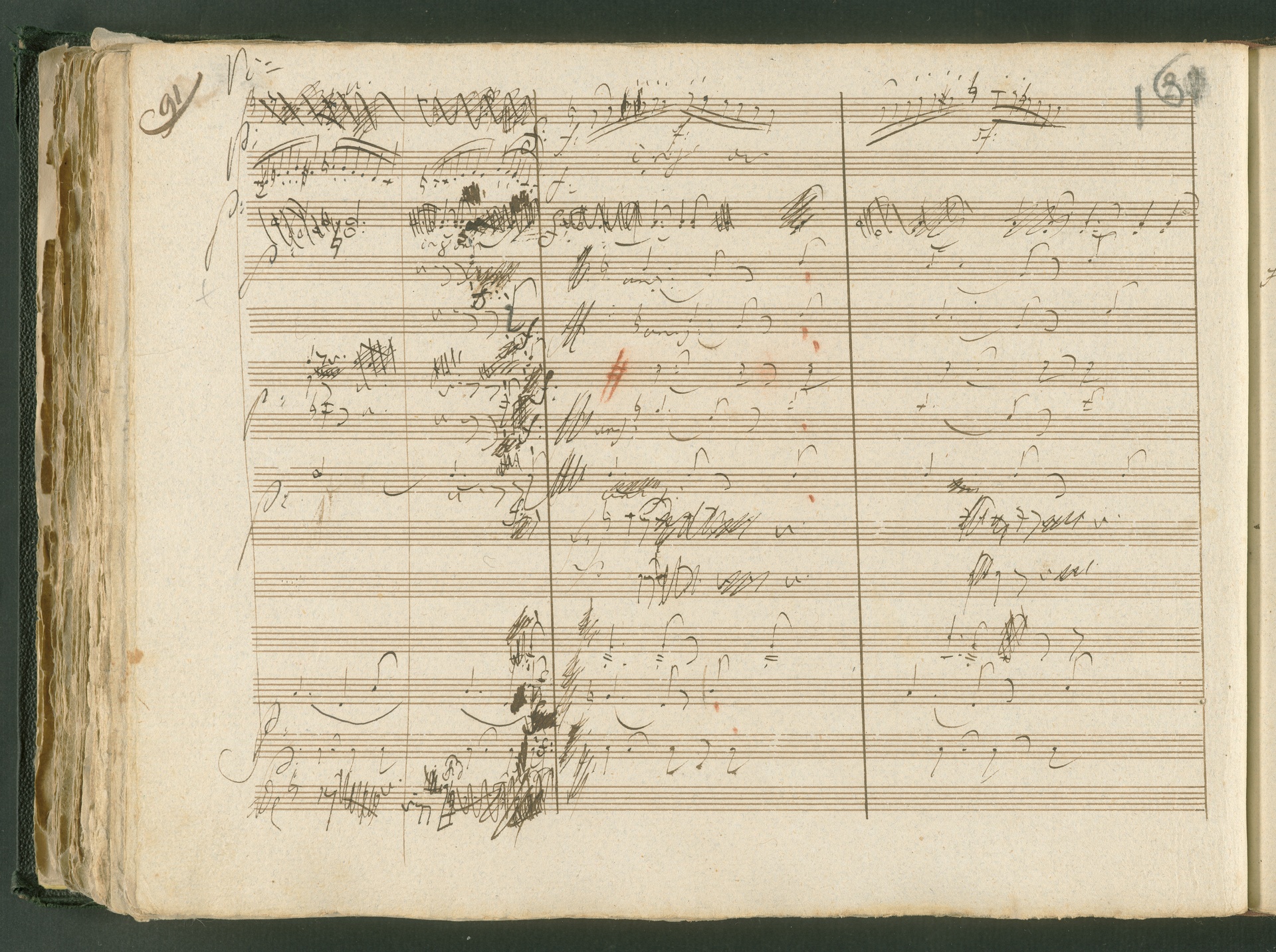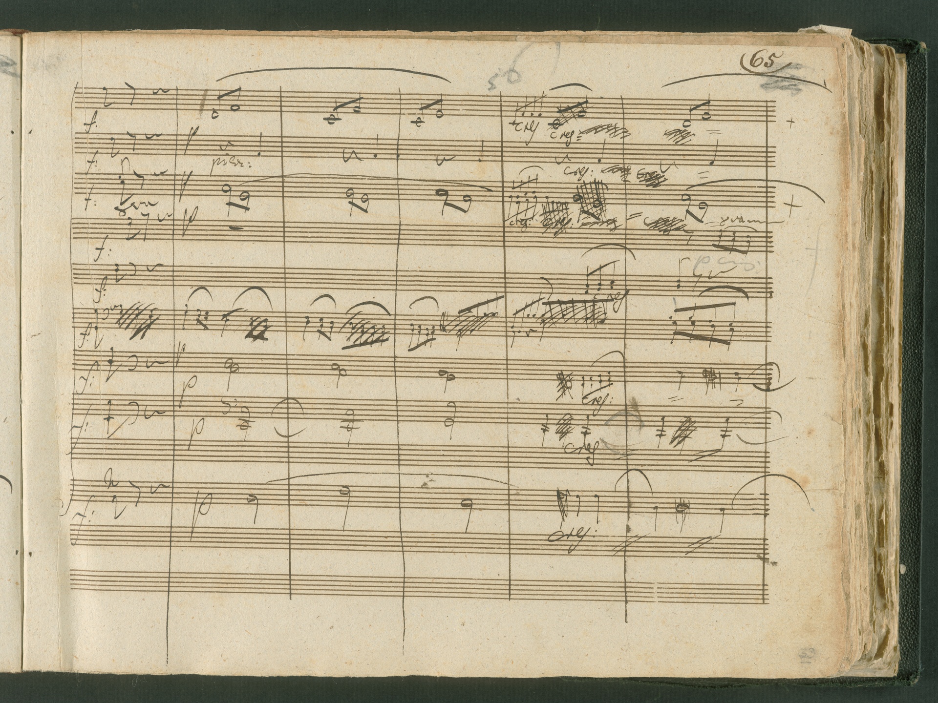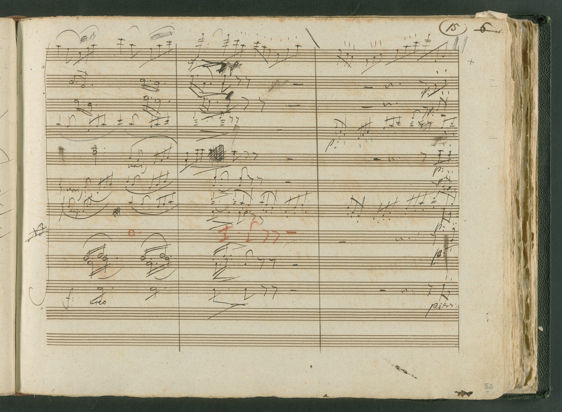 Wir sehen hier den unbestreitbar größten Schatz des Beethoven-Archivs: das vollständige Autograph der 6. Sinfonie op. 68, der "Pastorale". Es ist jedoch ein Irrtum zu glauben, dieses Autograph wäre der saubere Abschluß einer Entwicklung, an deren Ende ein fertiges, "ordentliches" Manuskript steht. Vielmehr lässt sich an diesem Autograph der Kompositionsprozeß verfolgen: unter dem abgeschlossenen Text sind mehrere Schichten sichtbar.