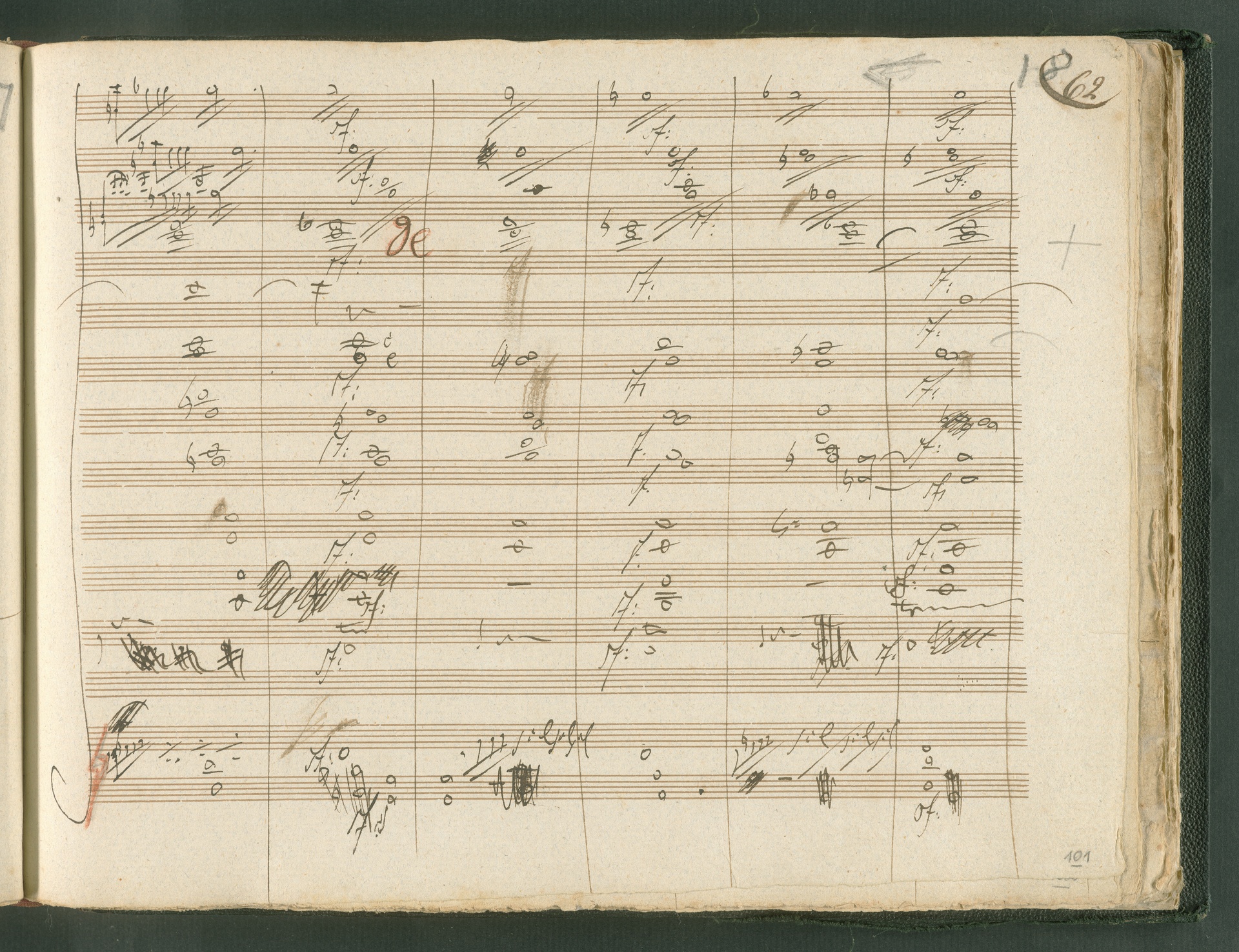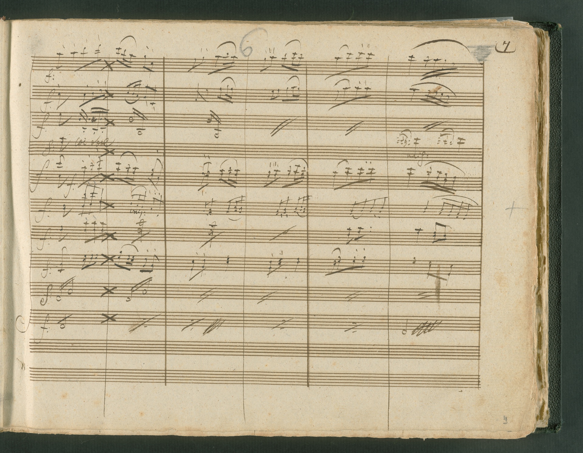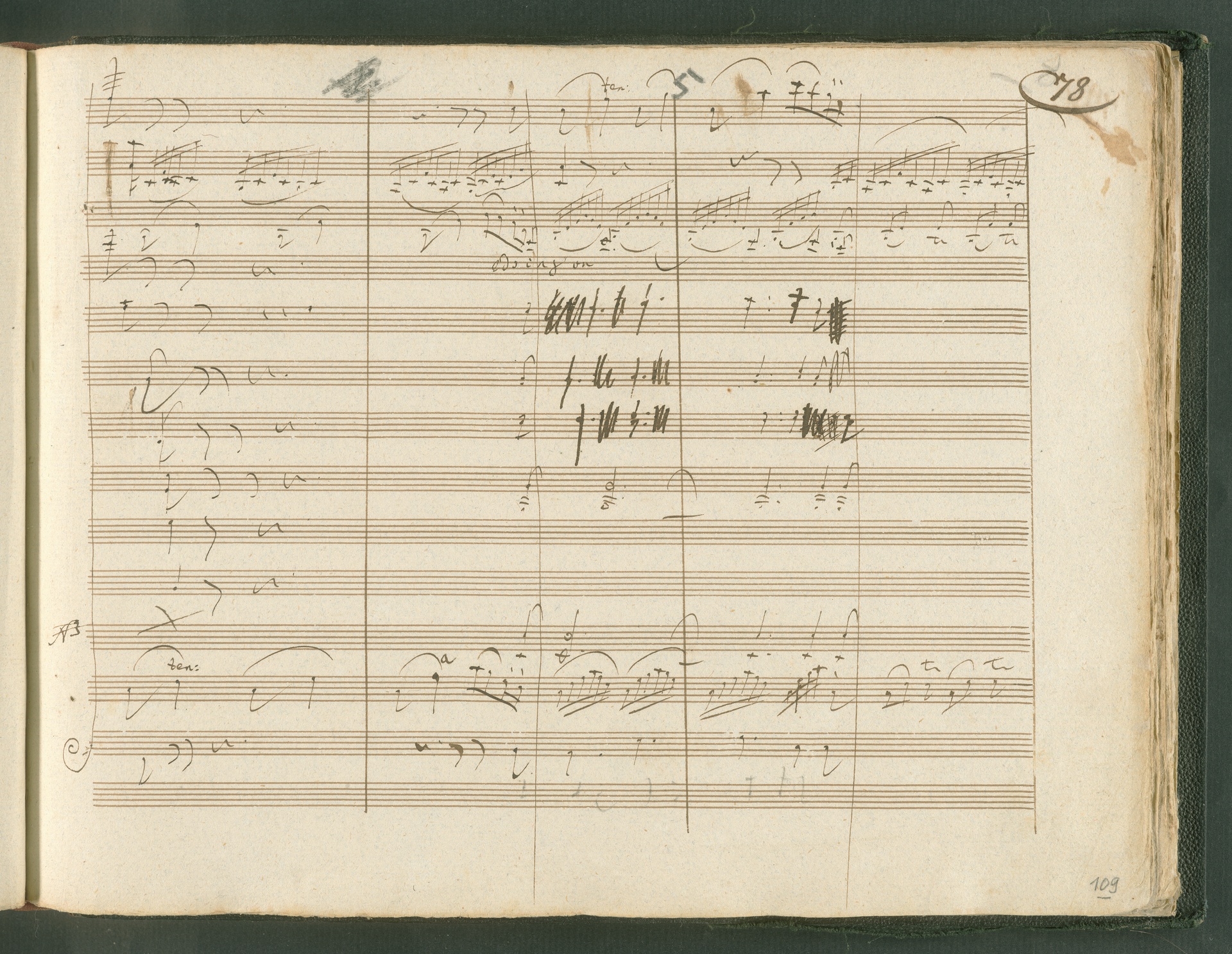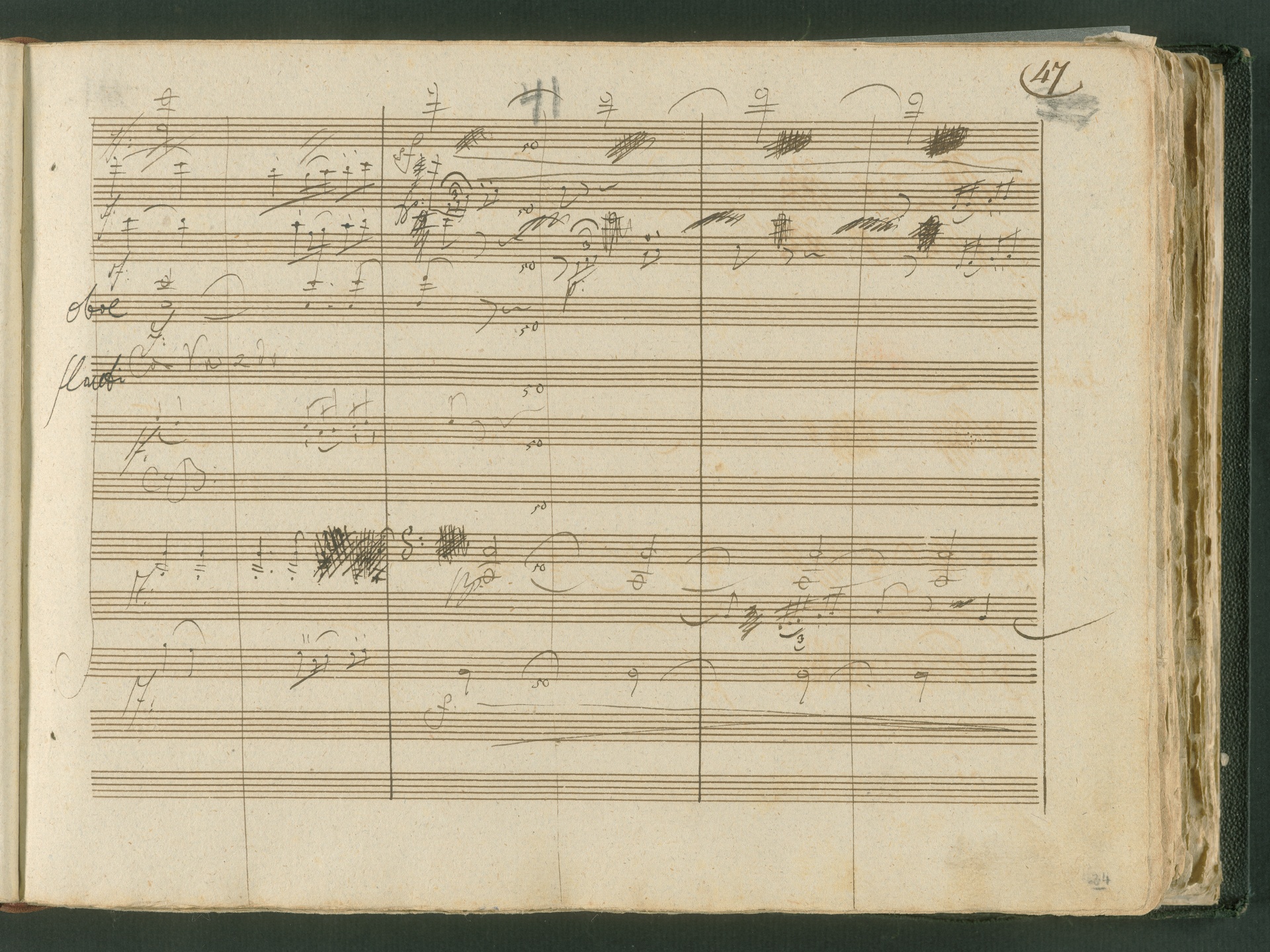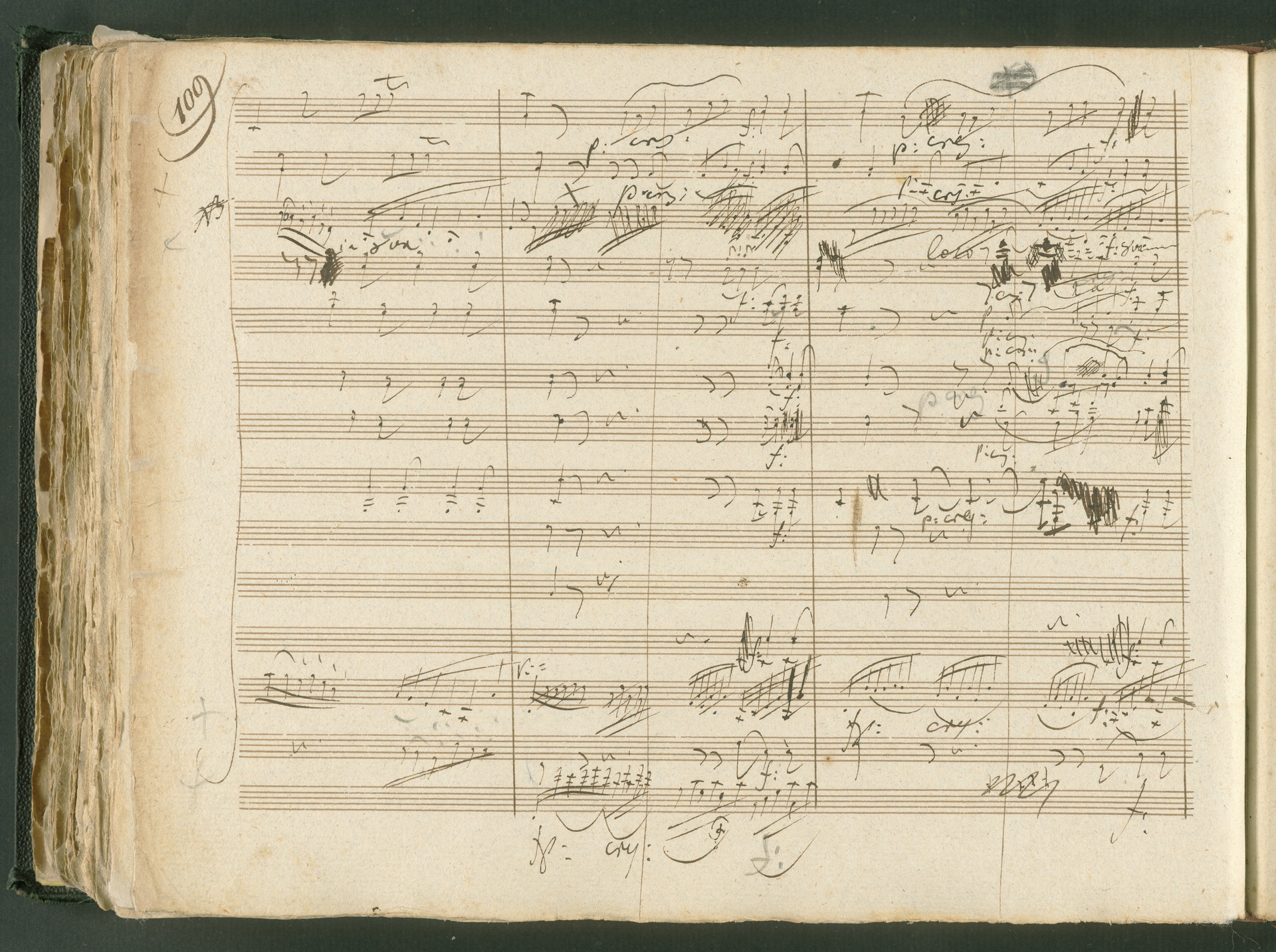 Wir sehen hier den unbestreitbar größten Schatz des Beethoven-Archivs: das vollständige Autograph der 6. Sinfonie op. 68, der "Pastorale". Es ist jedoch ein Irrtum zu glauben, dieses Autograph wäre der saubere Abschluß einer Entwicklung, an deren Ende ein fertiges, "ordentliches" Manuskript steht. Vielmehr lässt sich an diesem Autograph der Kompositionsprozeß verfolgen: unter dem abgeschlossenen Text sind mehrere Schichten sichtbar.