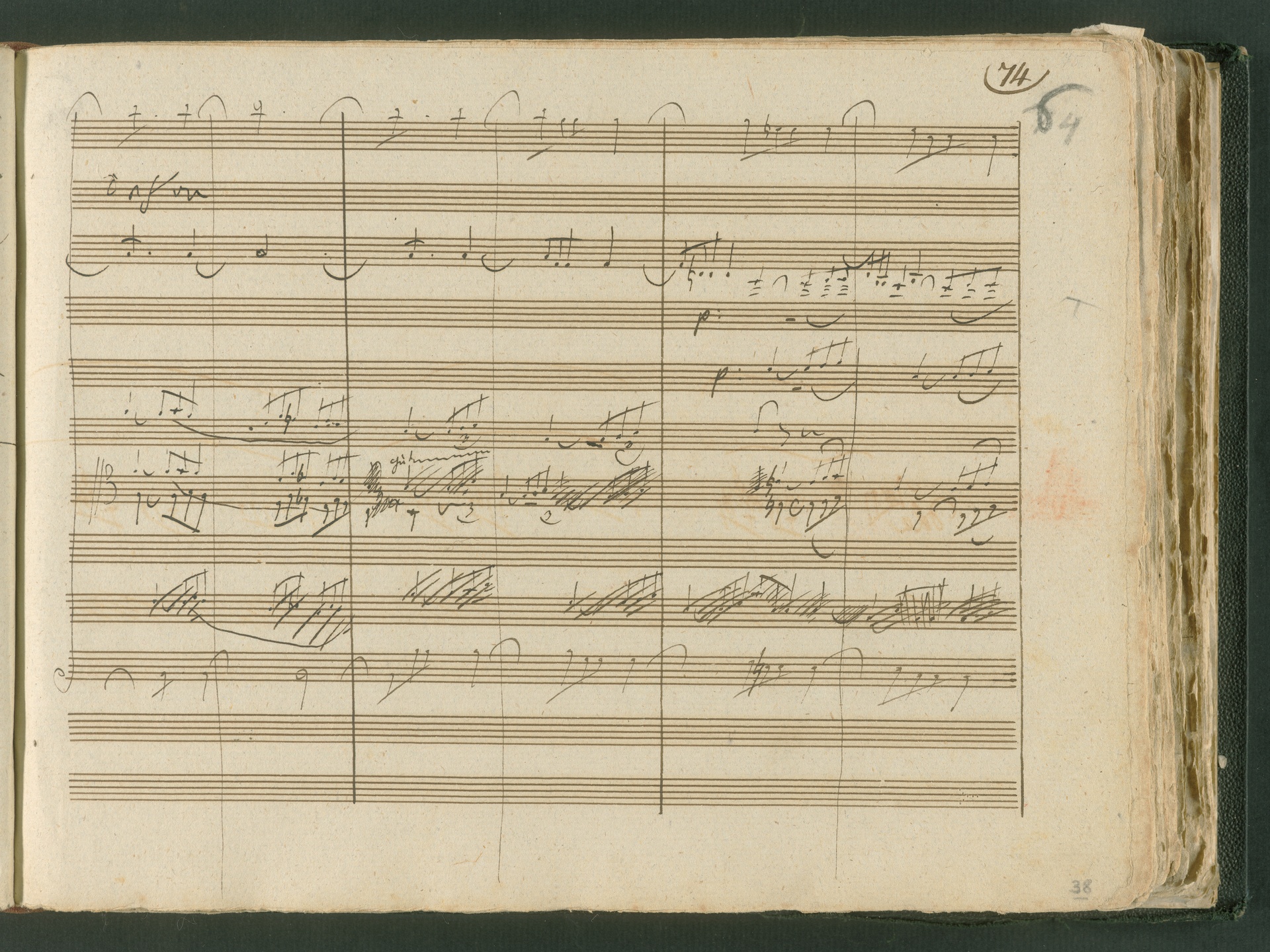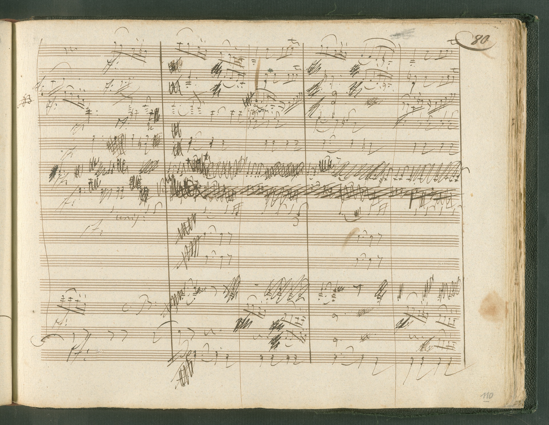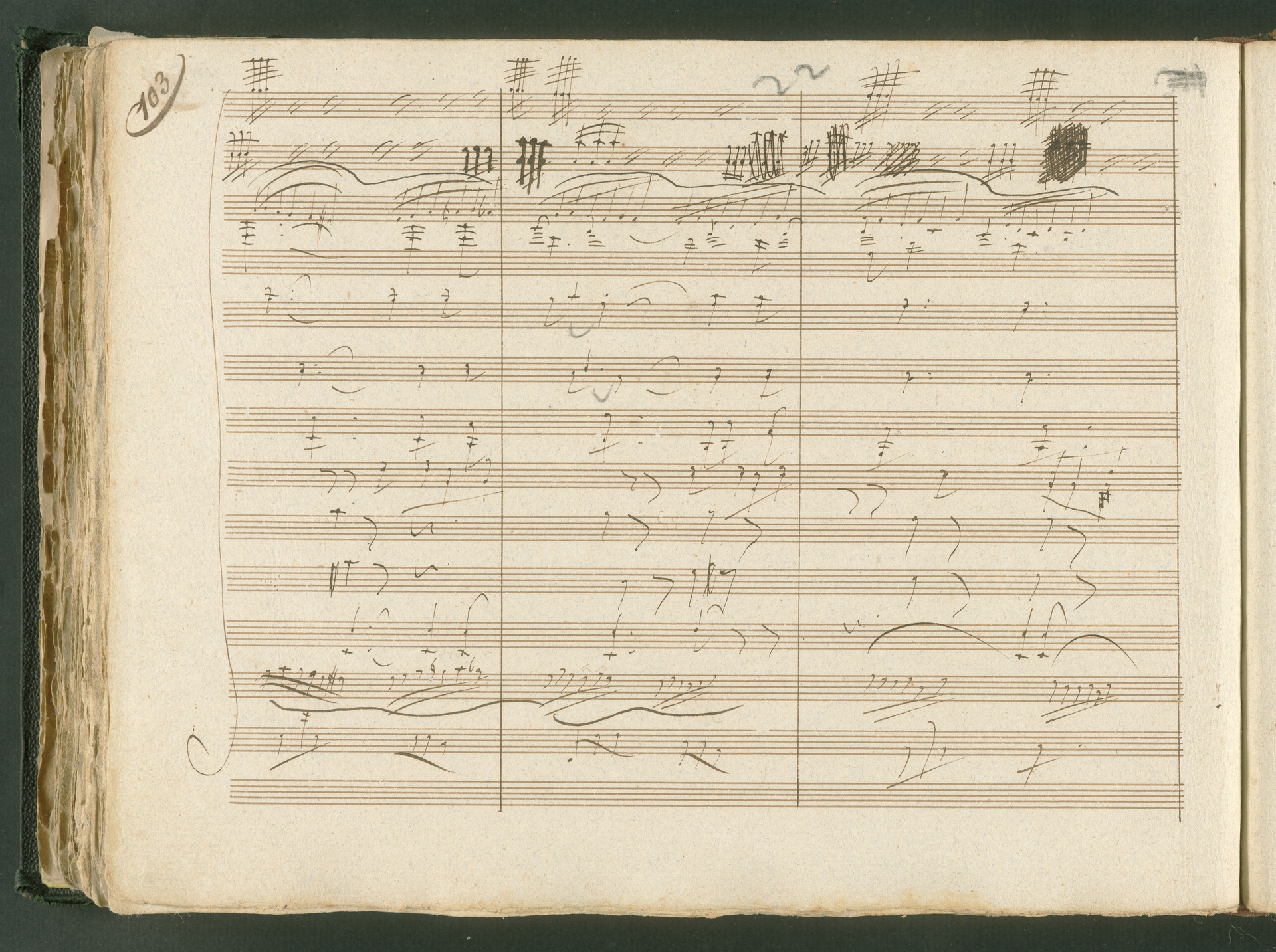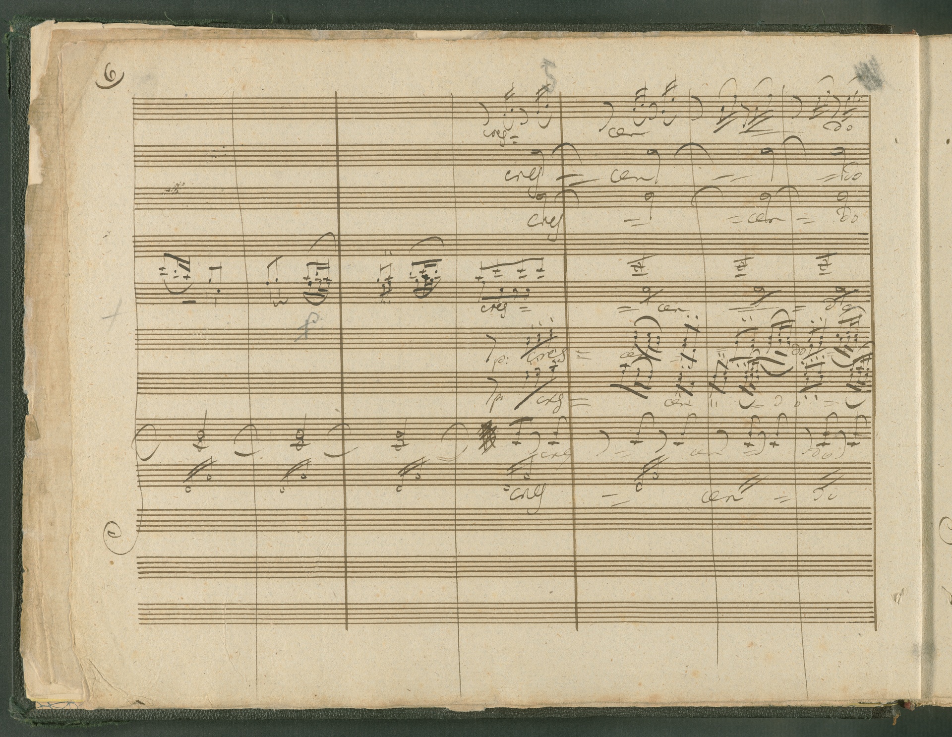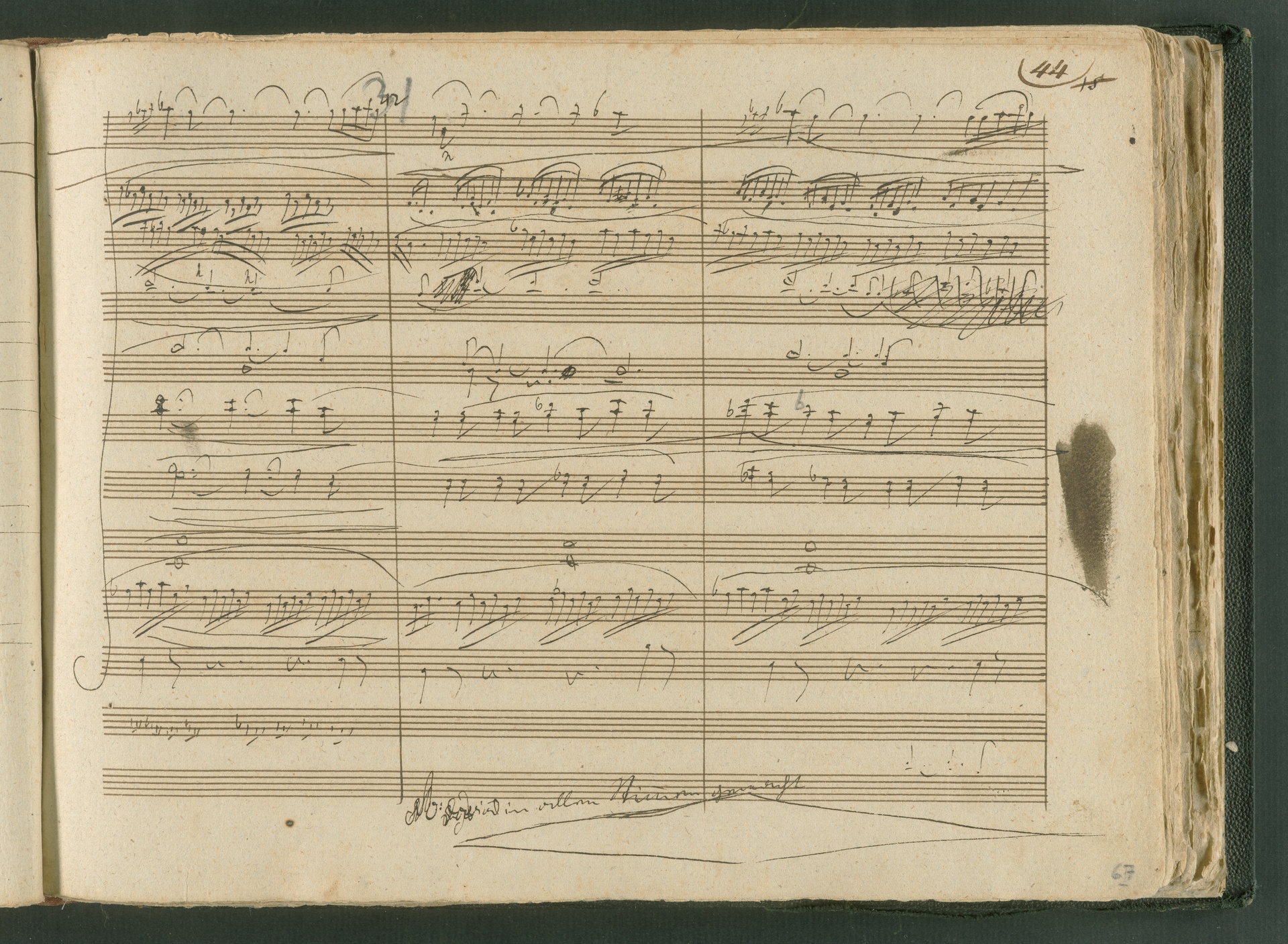 Wir sehen hier den unbestreitbar größten Schatz des Beethoven-Archivs: das vollständige Autograph der 6. Sinfonie op. 68, der "Pastorale". Es ist jedoch ein Irrtum zu glauben, dieses Autograph wäre der saubere Abschluß einer Entwicklung, an deren Ende ein fertiges, "ordentliches" Manuskript steht. Vielmehr lässt sich an diesem Autograph der Kompositionsprozeß verfolgen: unter dem abgeschlossenen Text sind mehrere Schichten sichtbar.