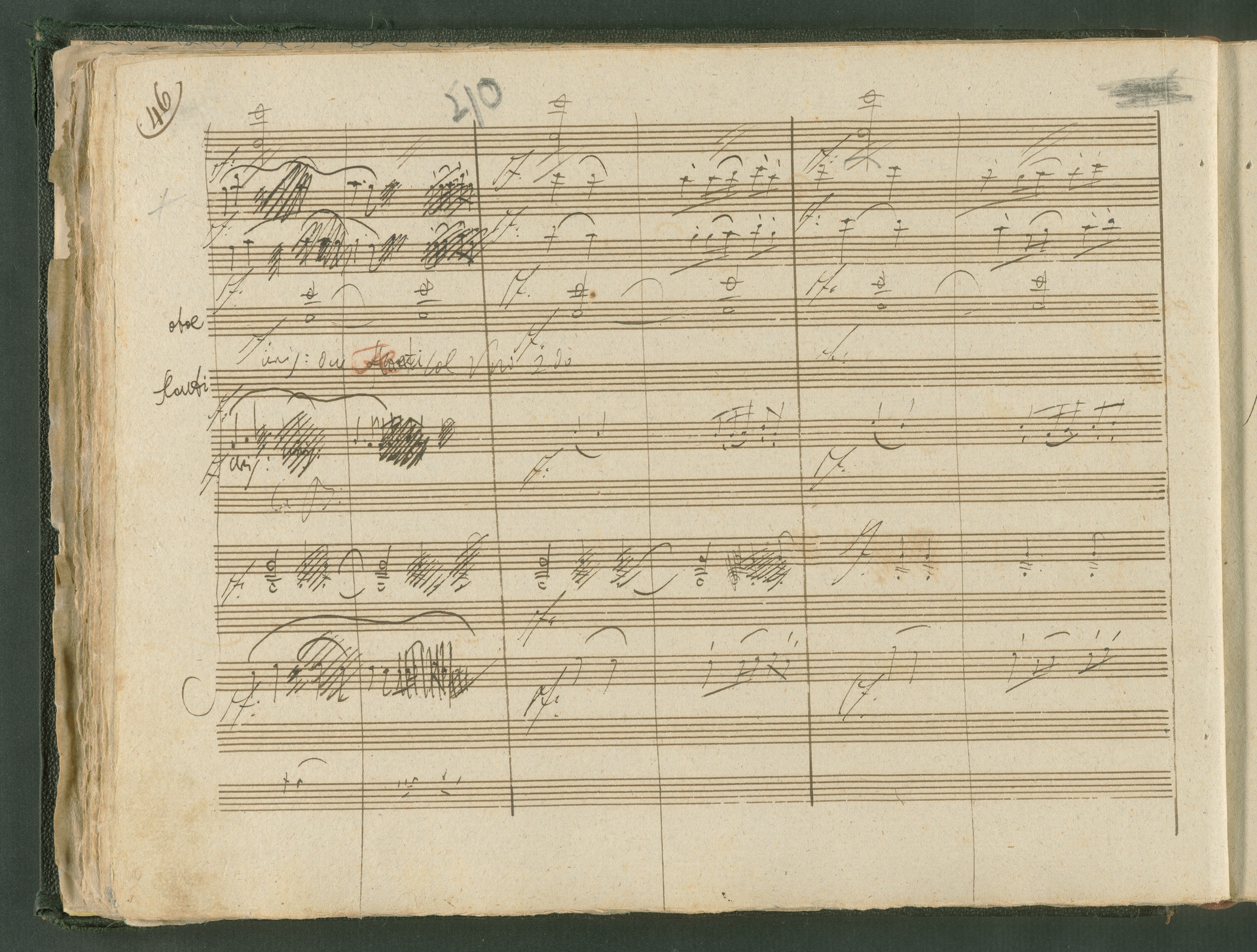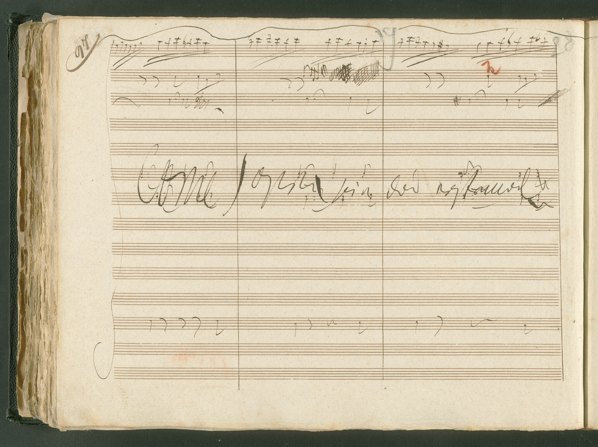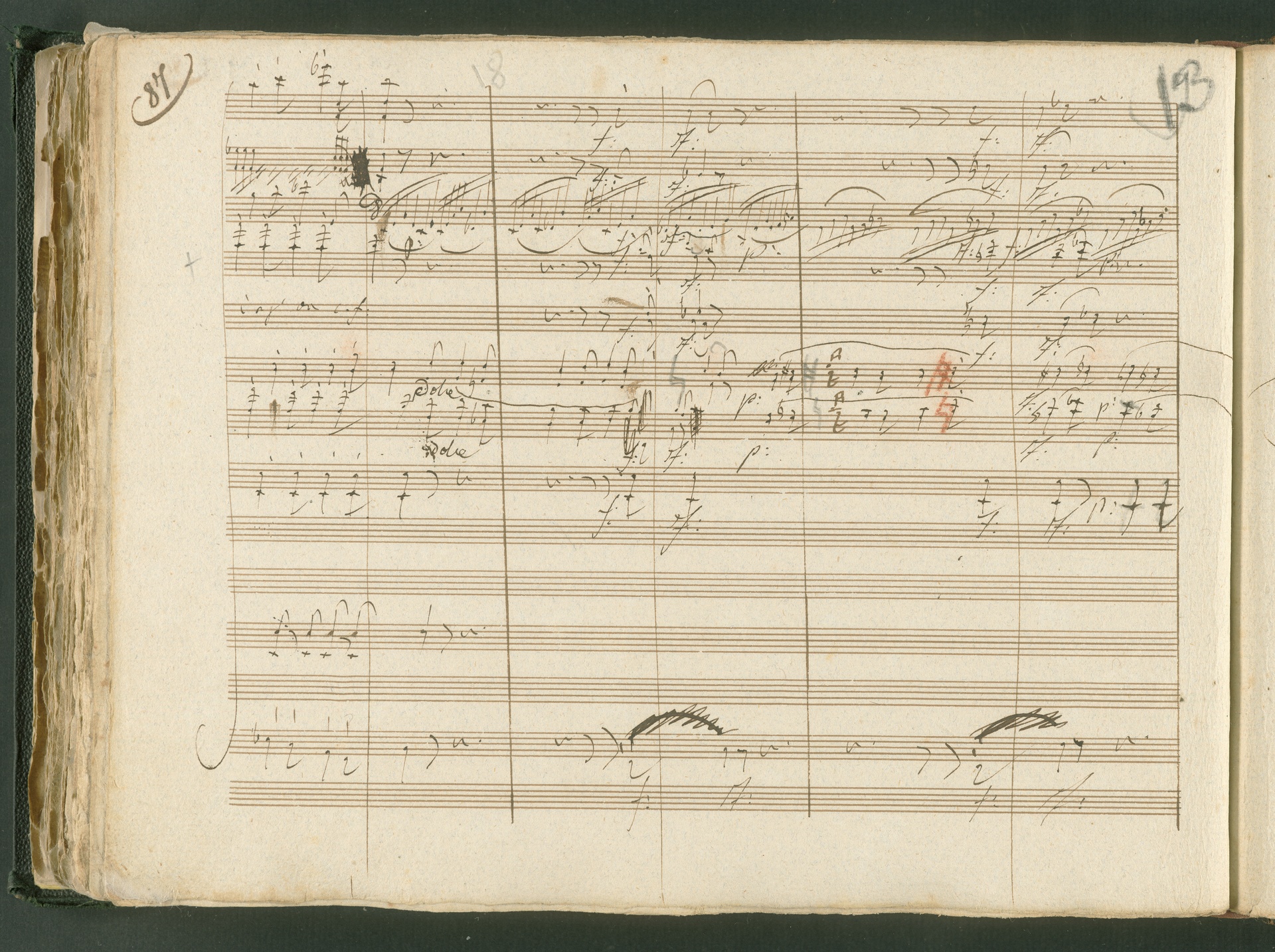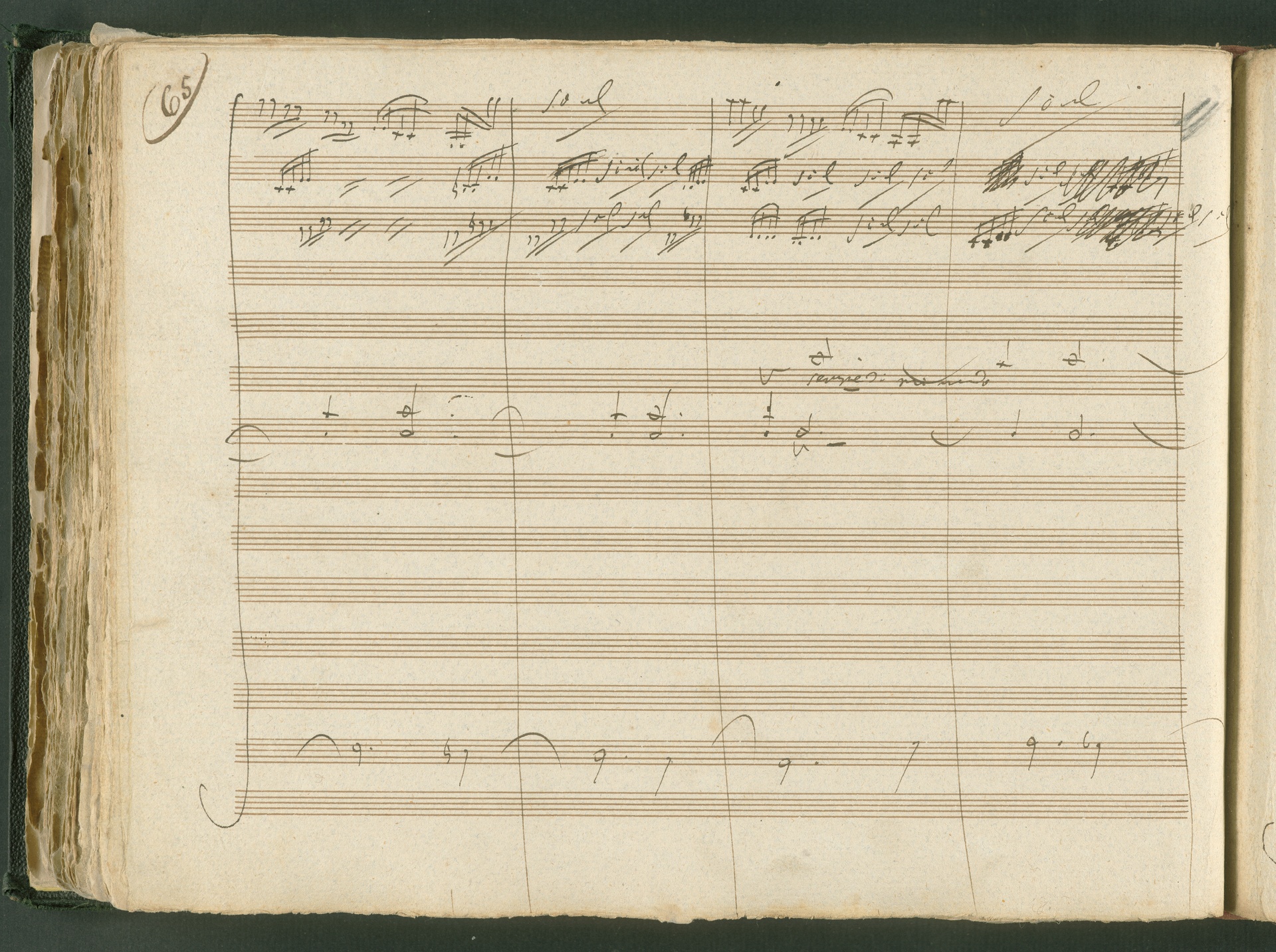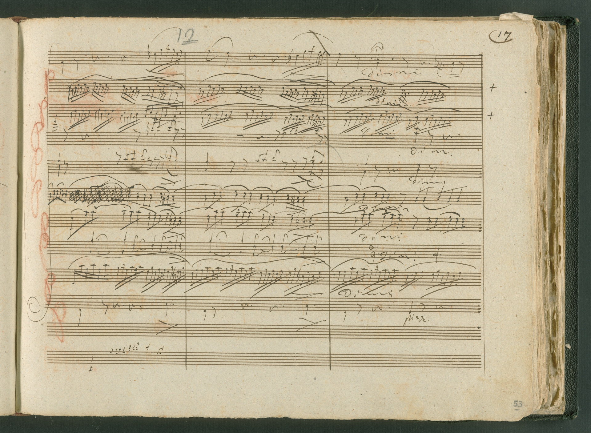 Wir sehen hier den unbestreitbar größten Schatz des Beethoven-Archivs: das vollständige Autograph der 6. Sinfonie op. 68, der "Pastorale". Es ist jedoch ein Irrtum zu glauben, dieses Autograph wäre der saubere Abschluß einer Entwicklung, an deren Ende ein fertiges, "ordentliches" Manuskript steht. Vielmehr lässt sich an diesem Autograph der Kompositionsprozeß verfolgen: unter dem abgeschlossenen Text sind mehrere Schichten sichtbar.