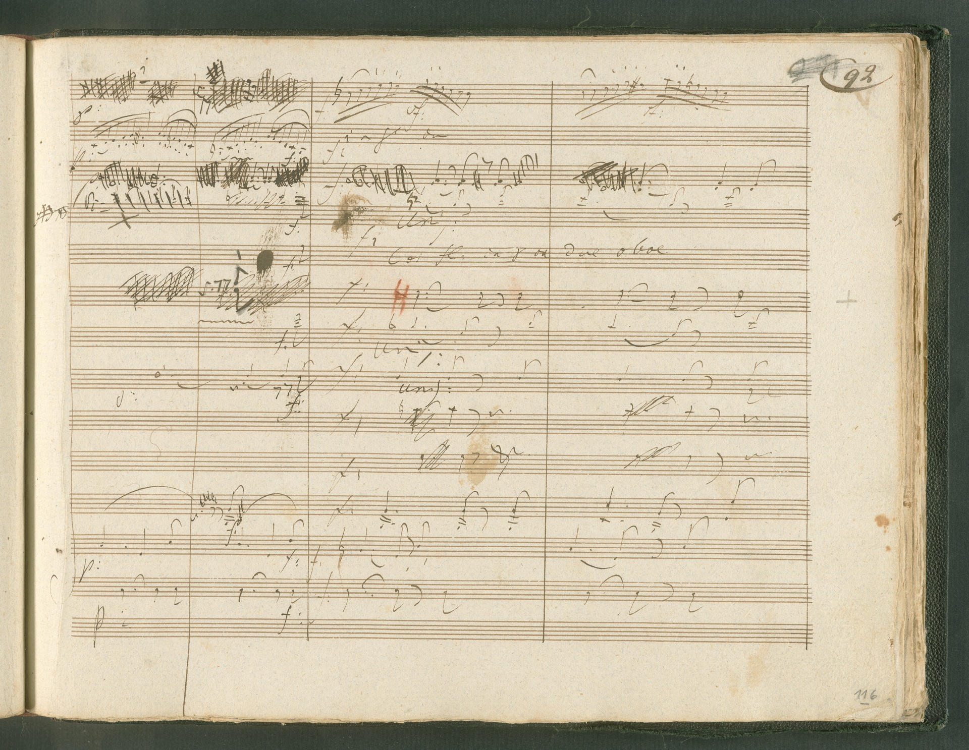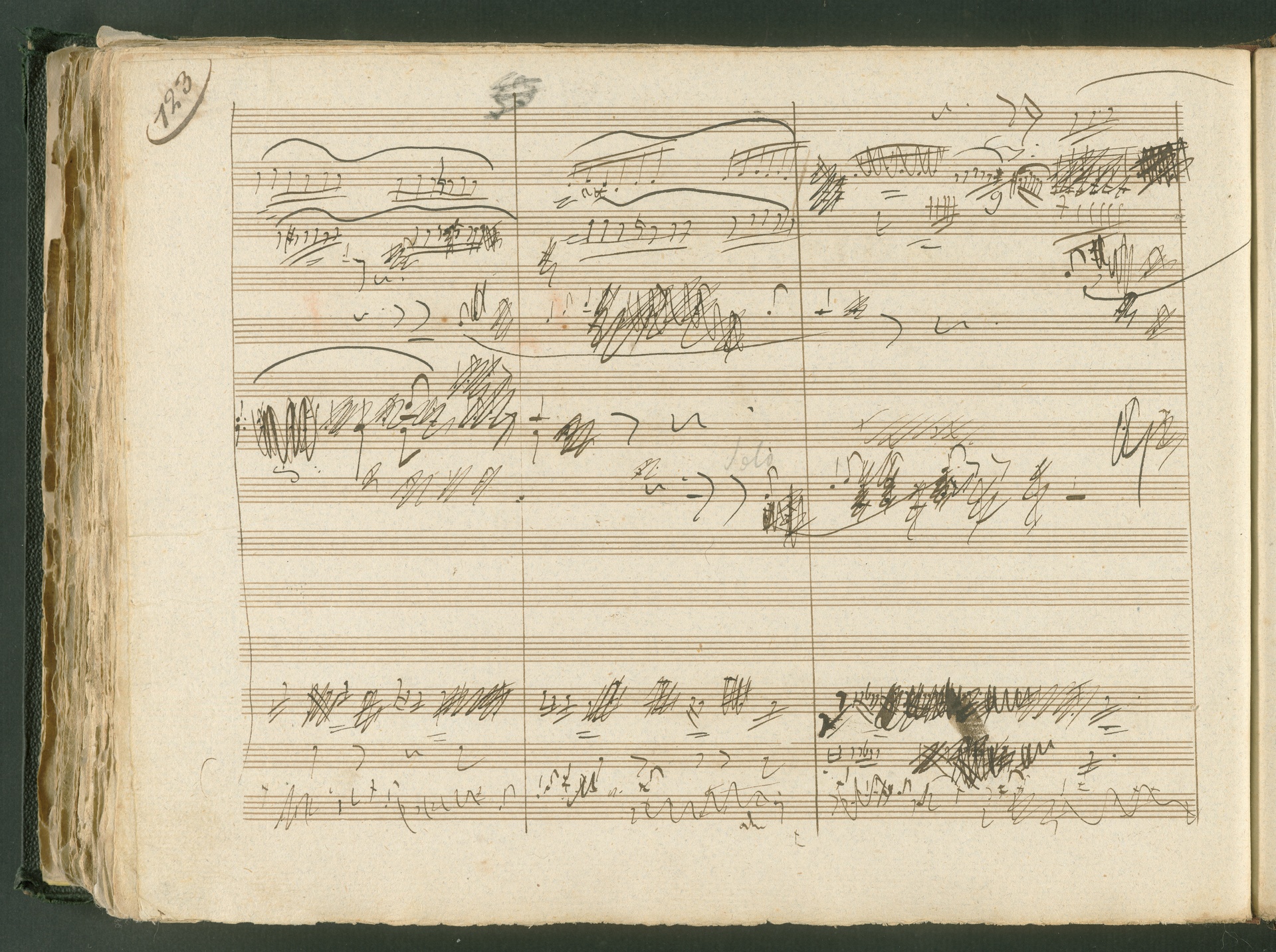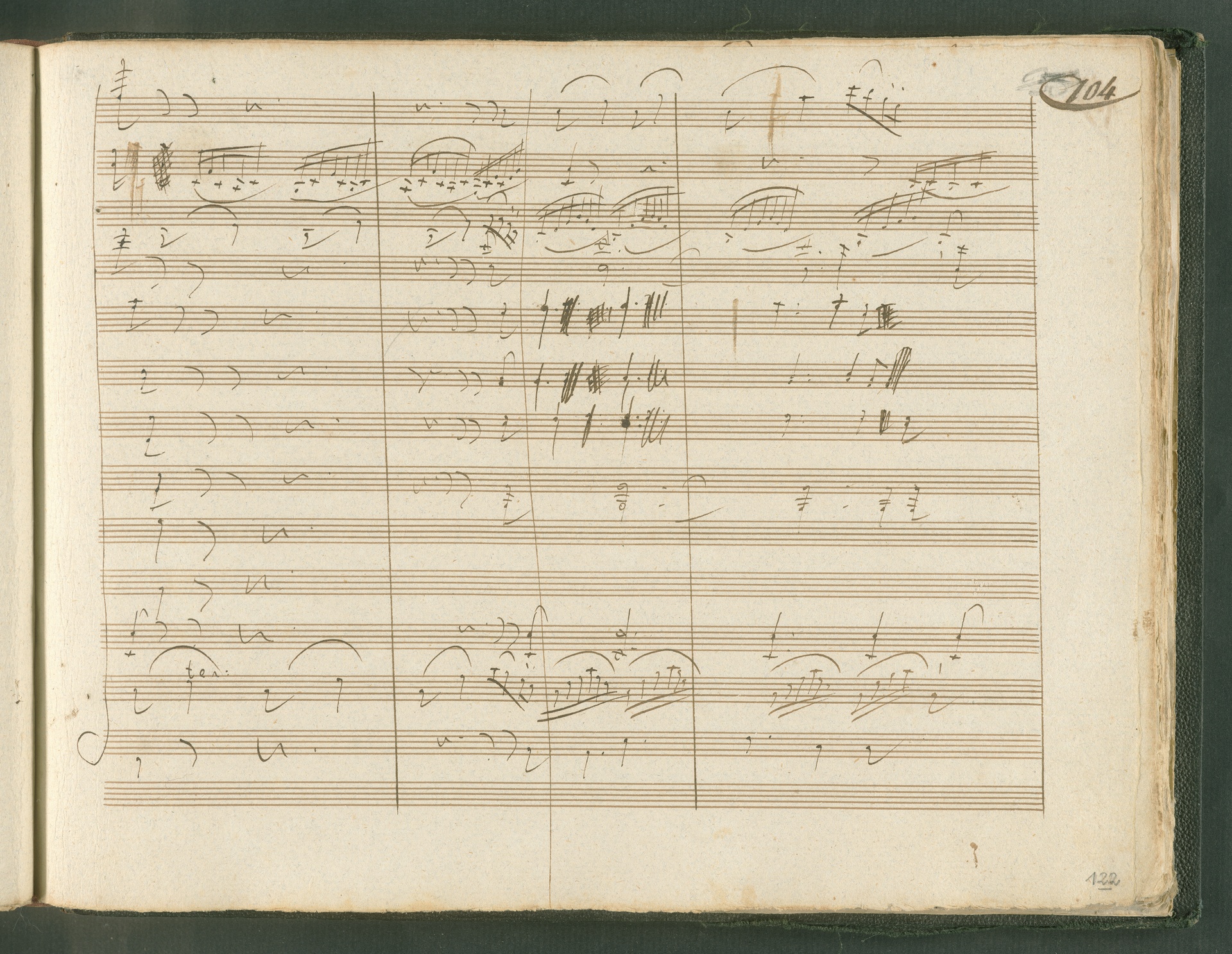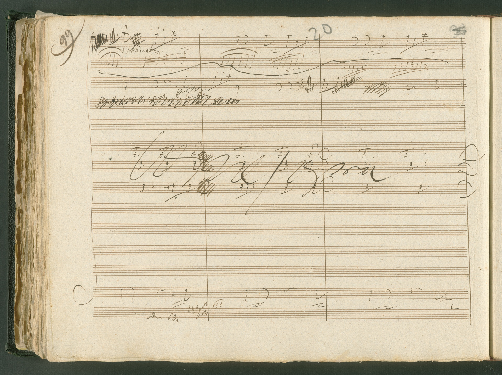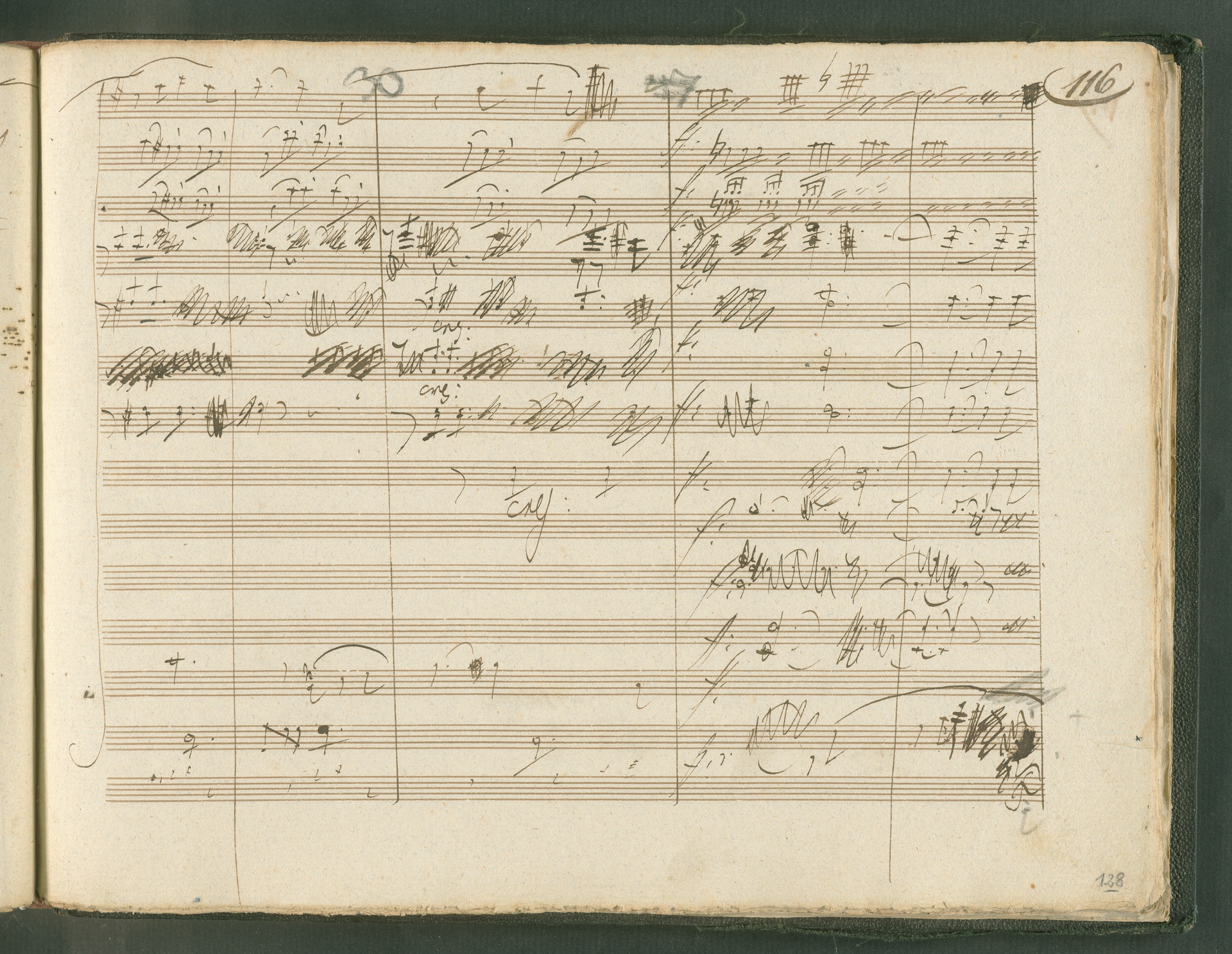 Wir sehen hier den unbestreitbar größten Schatz des Beethoven-Archivs: das vollständige Autograph der 6. Sinfonie op. 68, der "Pastorale". Es ist jedoch ein Irrtum zu glauben, dieses Autograph wäre der saubere Abschluß einer Entwicklung, an deren Ende ein fertiges, "ordentliches" Manuskript steht. Vielmehr lässt sich an diesem Autograph der Kompositionsprozeß verfolgen: unter dem abgeschlossenen Text sind mehrere Schichten sichtbar.