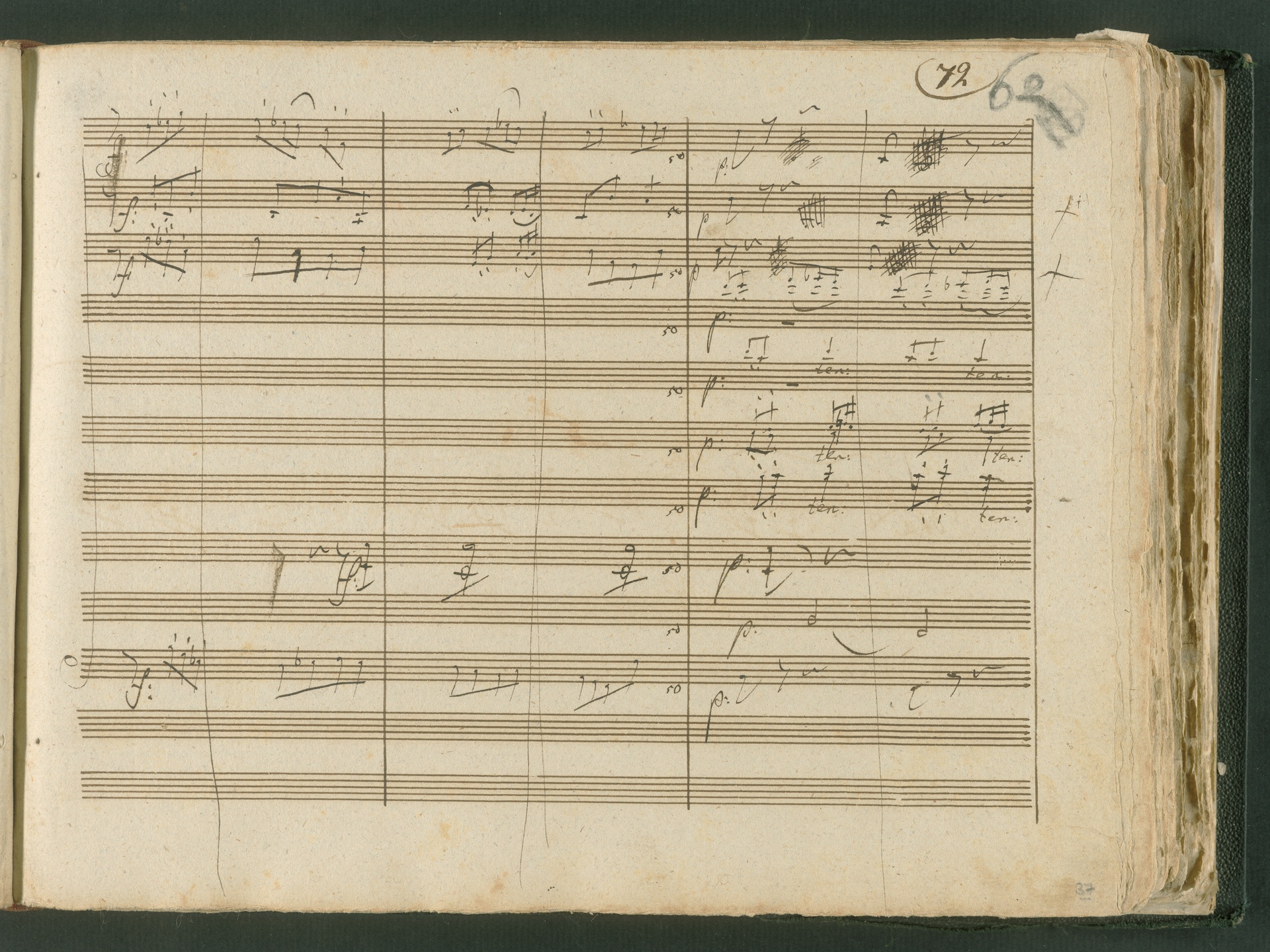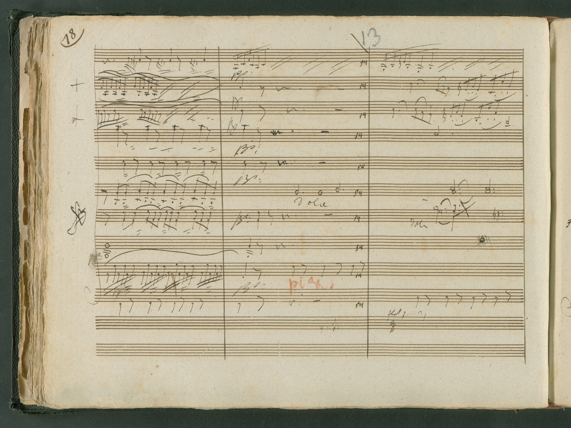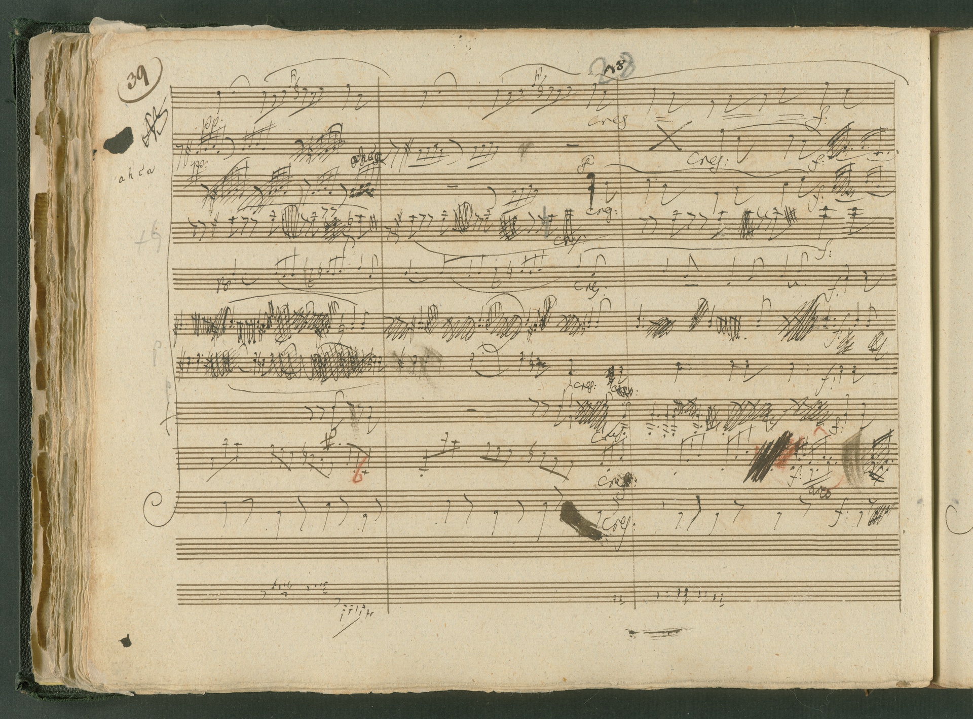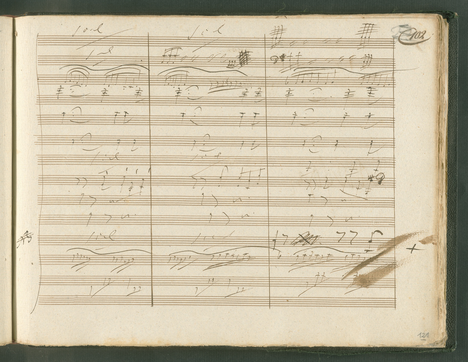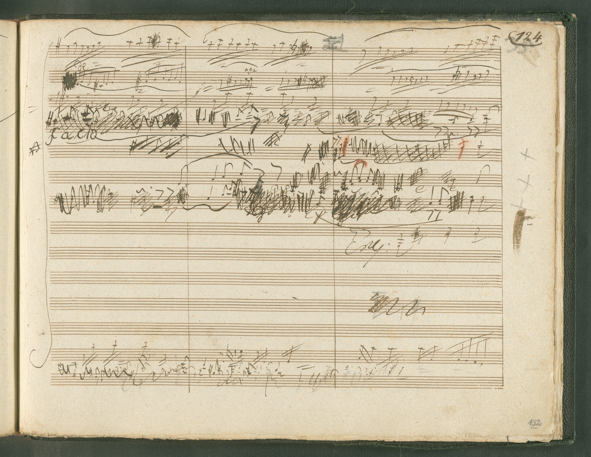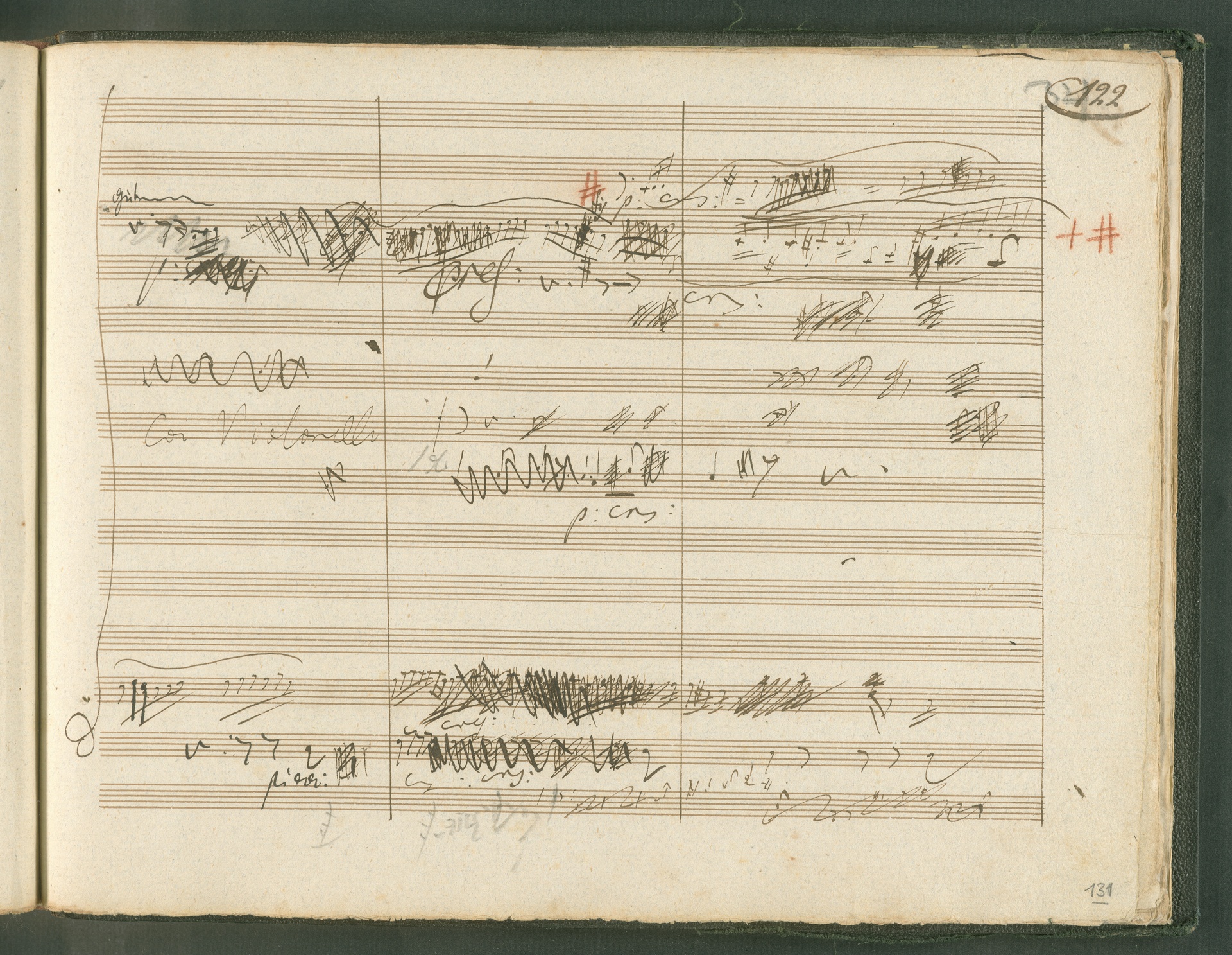 Wir sehen hier den unbestreitbar größten Schatz des Beethoven-Archivs: das vollständige Autograph der 6. Sinfonie op. 68, der "Pastorale". Es ist jedoch ein Irrtum zu glauben, dieses Autograph wäre der saubere Abschluß einer Entwicklung, an deren Ende ein fertiges, "ordentliches" Manuskript steht. Vielmehr lässt sich an diesem Autograph der Kompositionsprozeß verfolgen: unter dem abgeschlossenen Text sind mehrere Schichten sichtbar.
