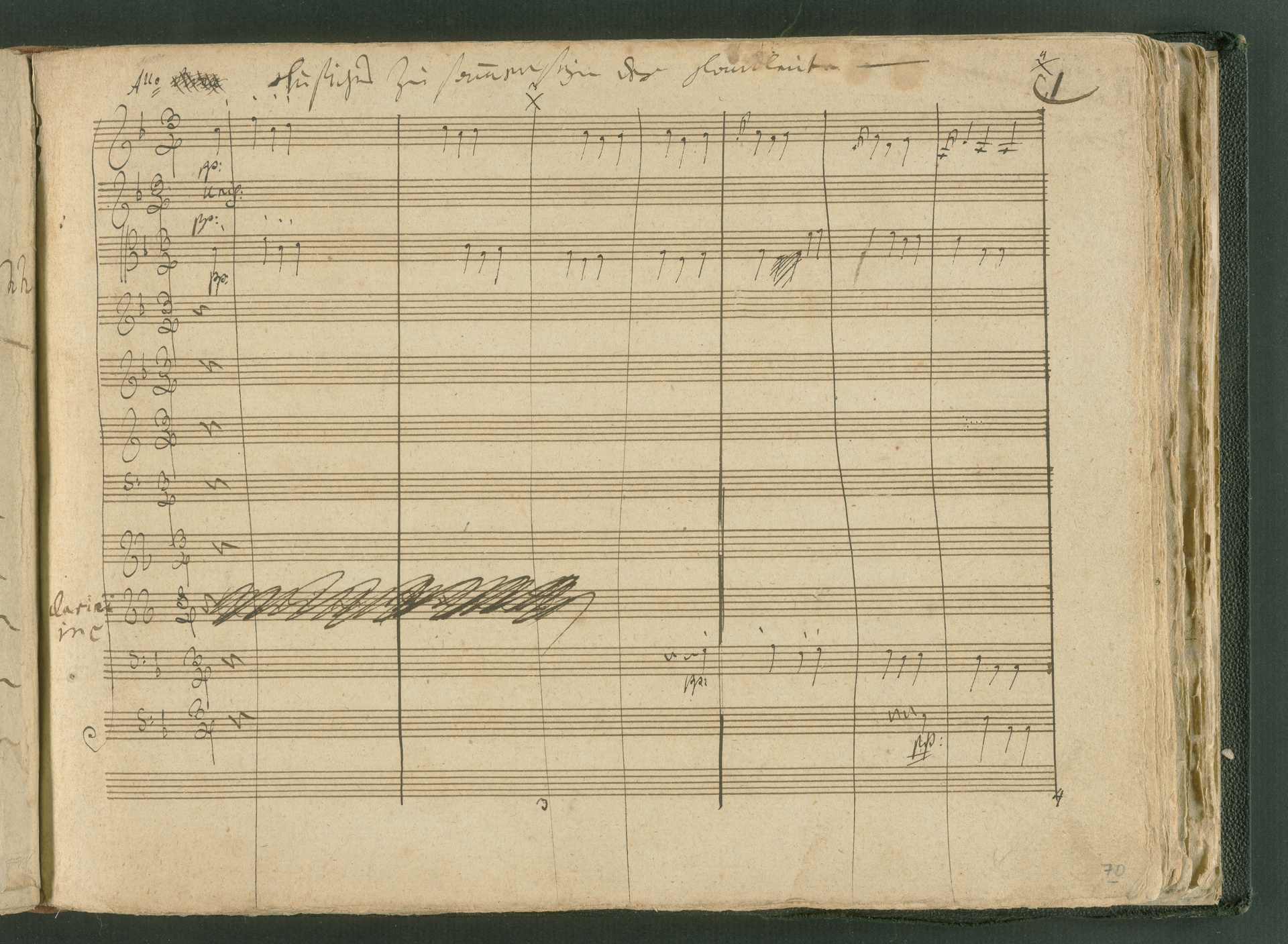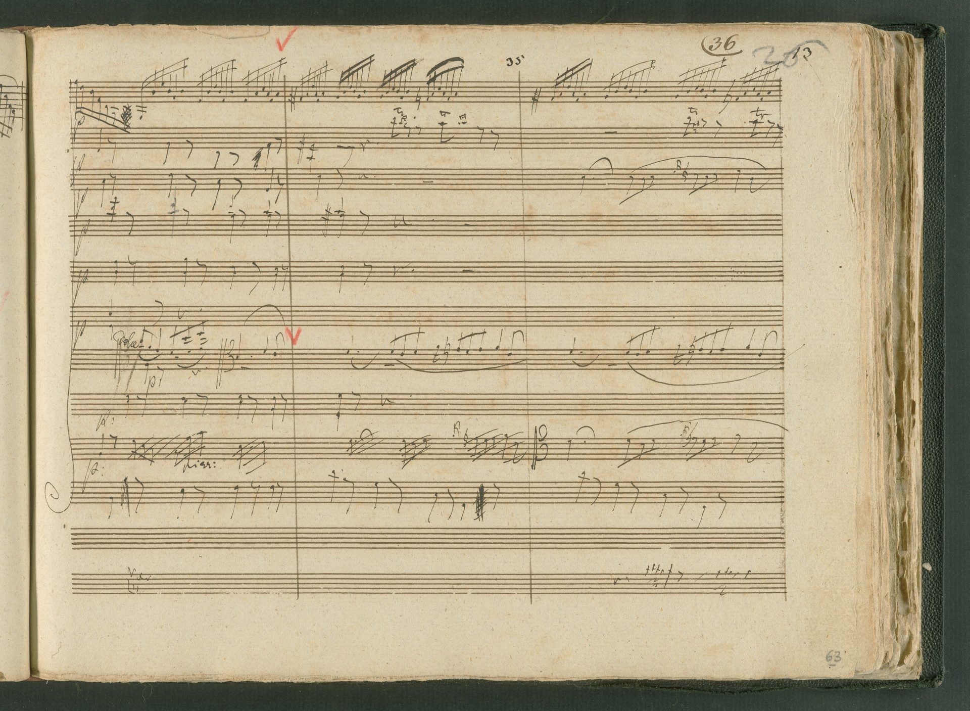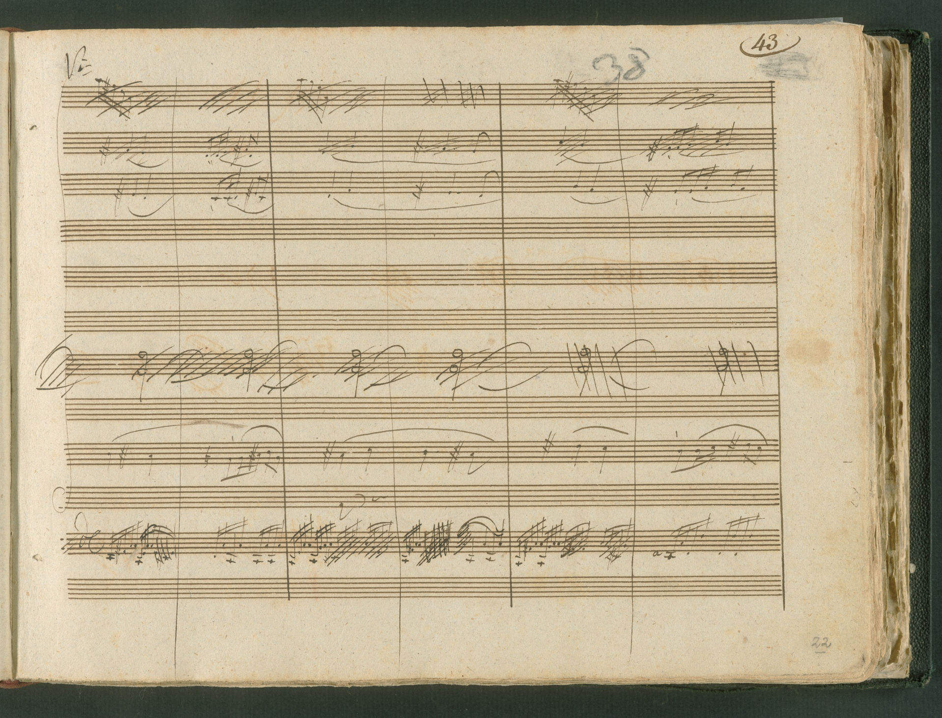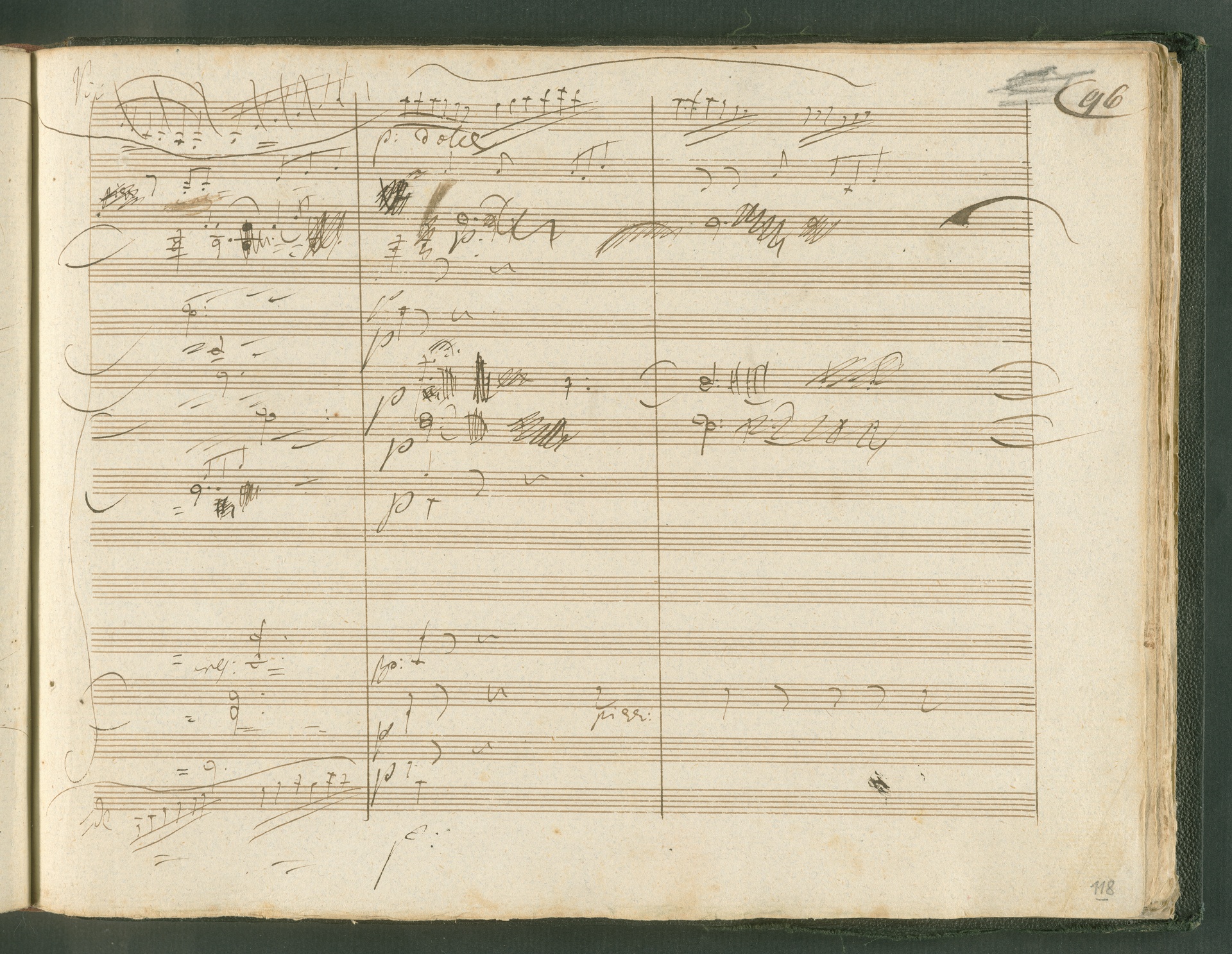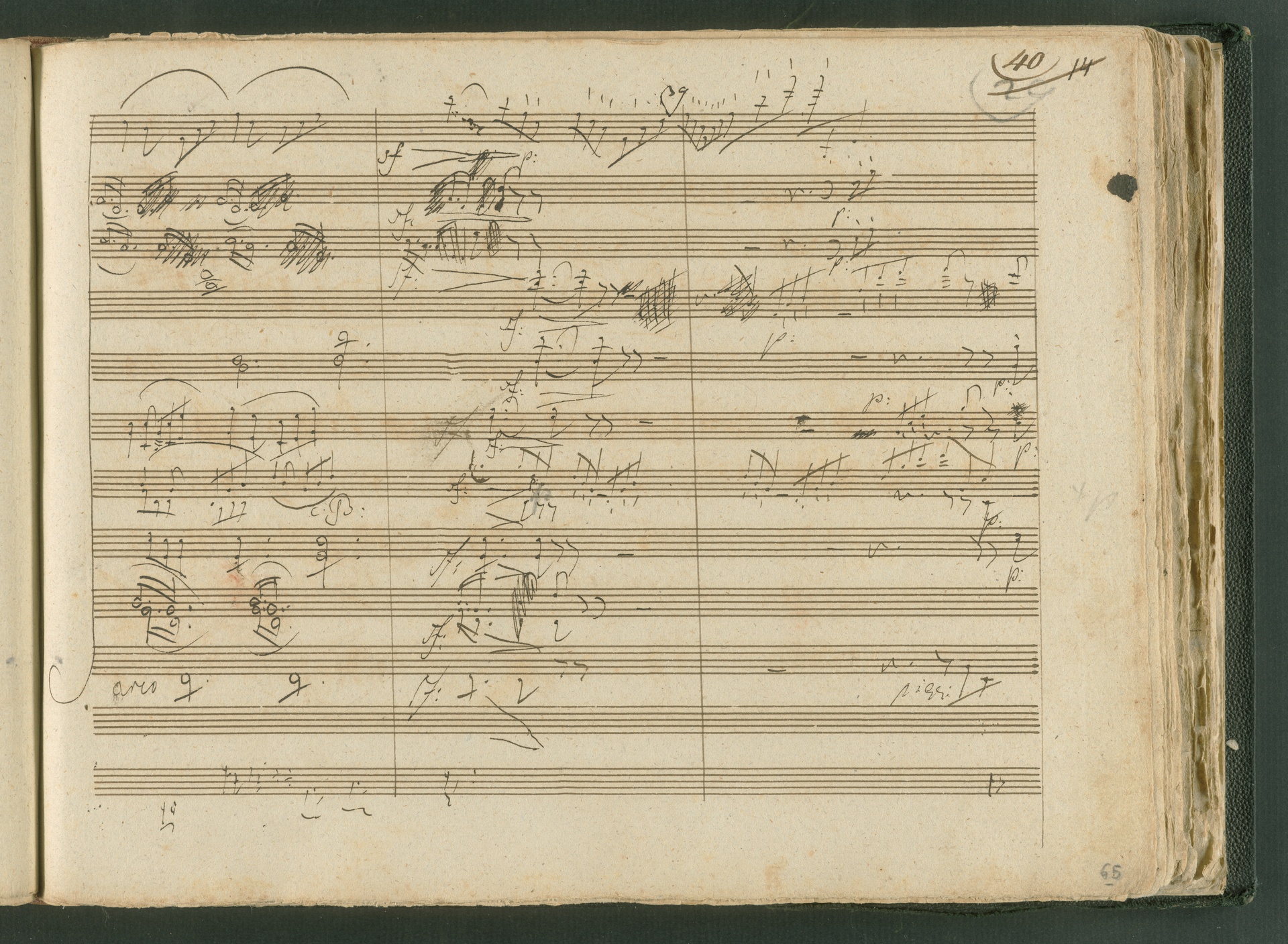 Wir sehen hier den unbestreitbar größten Schatz des Beethoven-Archivs: das vollständige Autograph der 6. Sinfonie op. 68, der "Pastorale". Es ist jedoch ein Irrtum zu glauben, dieses Autograph wäre der saubere Abschluß einer Entwicklung, an deren Ende ein fertiges, "ordentliches" Manuskript steht. Vielmehr lässt sich an diesem Autograph der Kompositionsprozeß verfolgen: unter dem abgeschlossenen Text sind mehrere Schichten sichtbar.