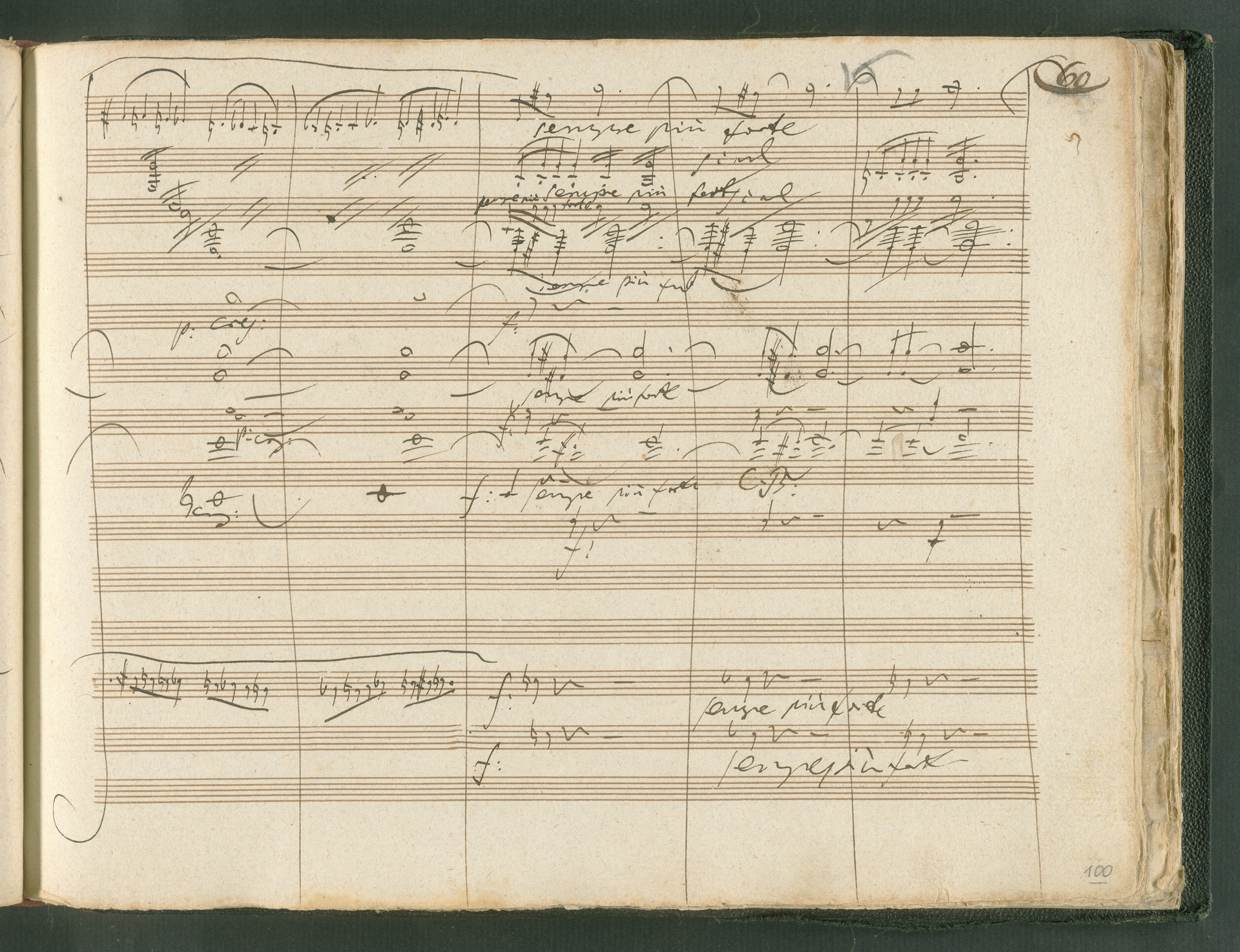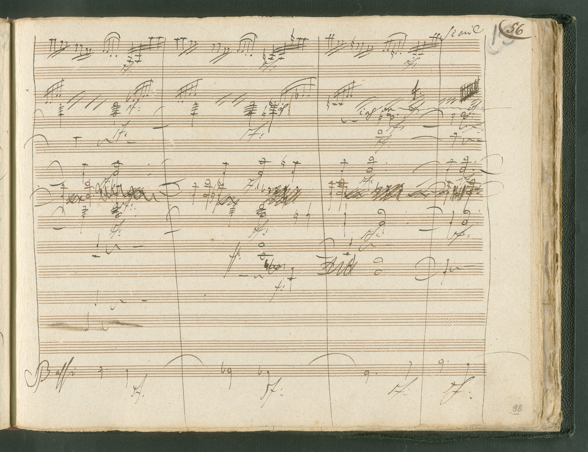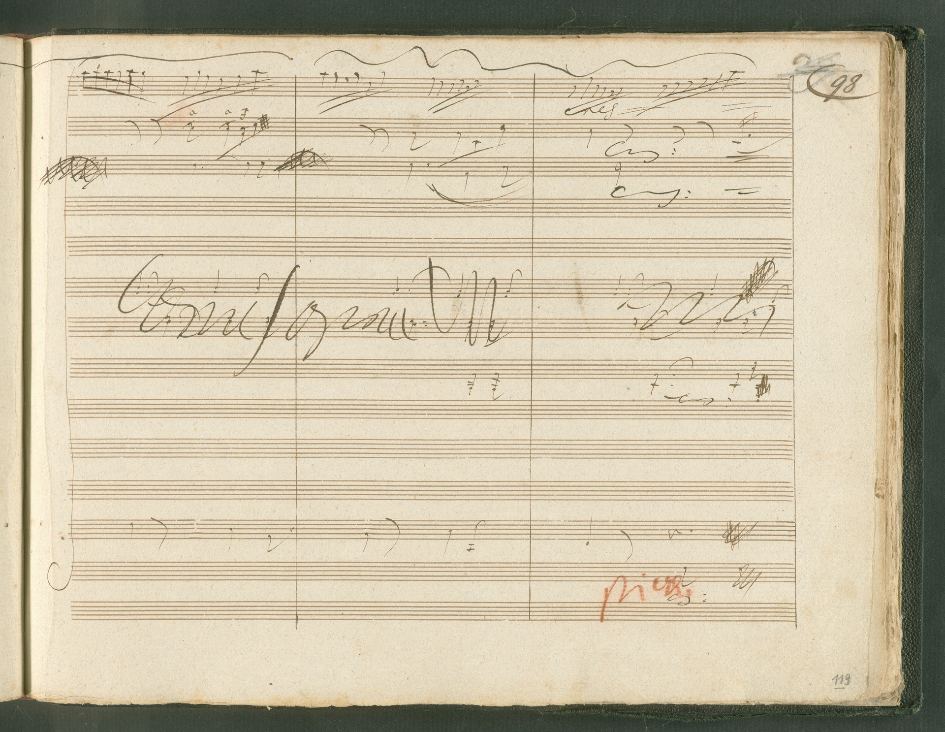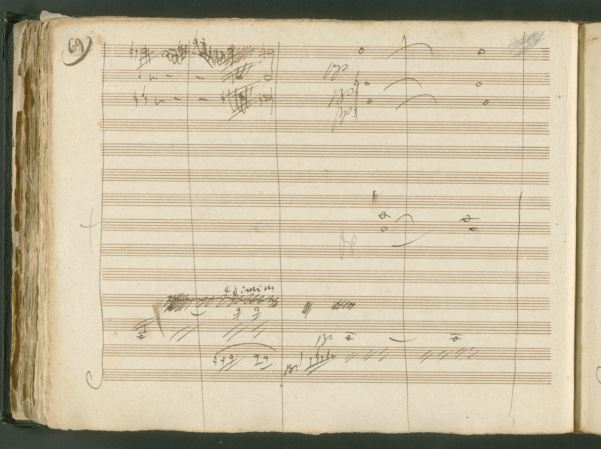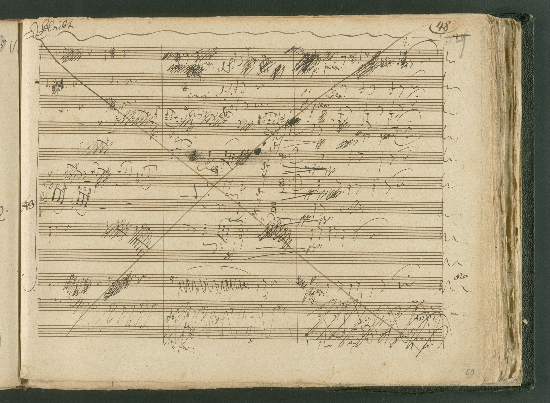 Wir sehen hier den unbestreitbar größten Schatz des Beethoven-Archivs: das vollständige Autograph der 6. Sinfonie op. 68, der "Pastorale". Es ist jedoch ein Irrtum zu glauben, dieses Autograph wäre der saubere Abschluß einer Entwicklung, an deren Ende ein fertiges, "ordentliches" Manuskript steht. Vielmehr lässt sich an diesem Autograph der Kompositionsprozeß verfolgen: unter dem abgeschlossenen Text sind mehrere Schichten sichtbar.