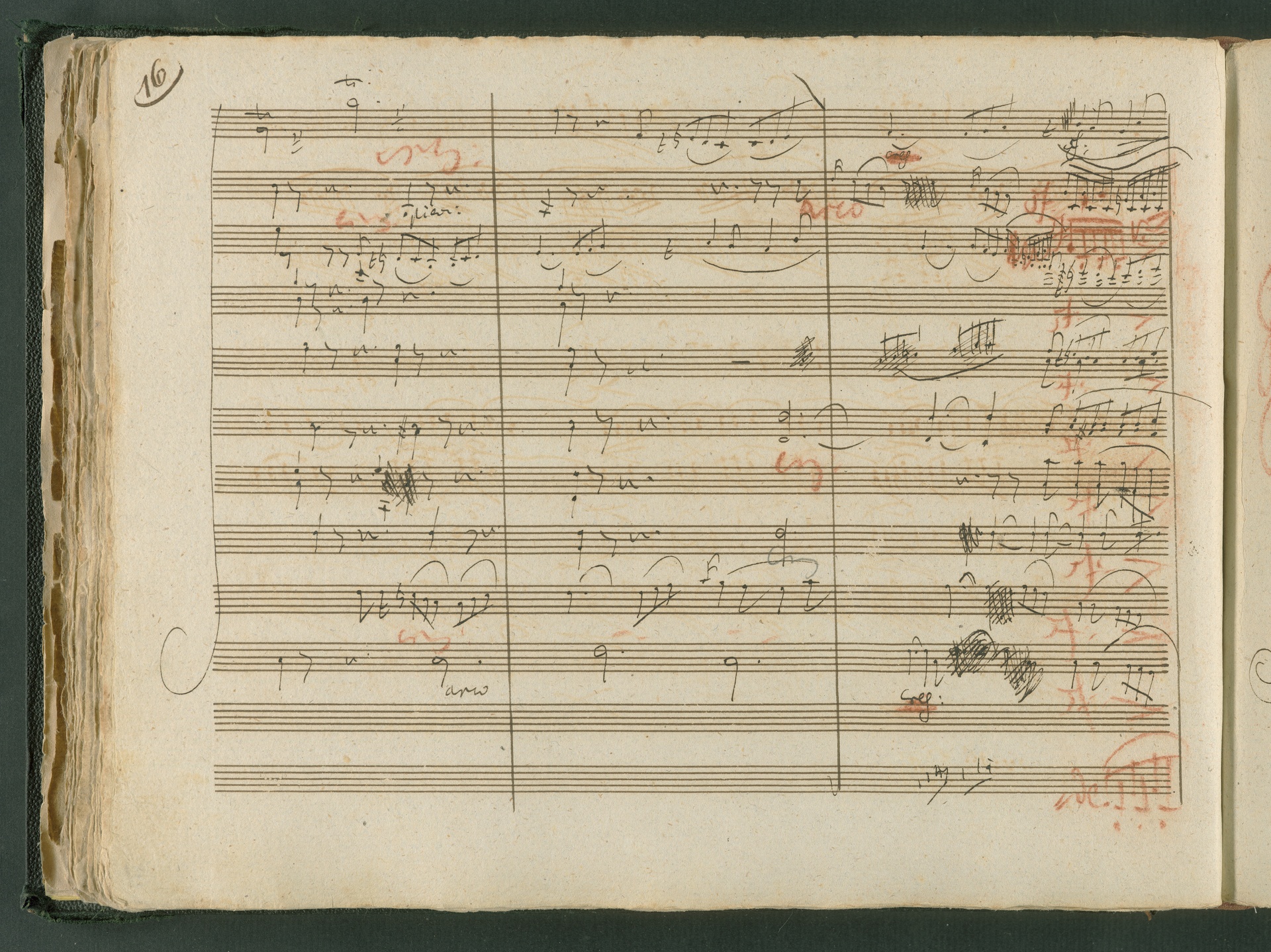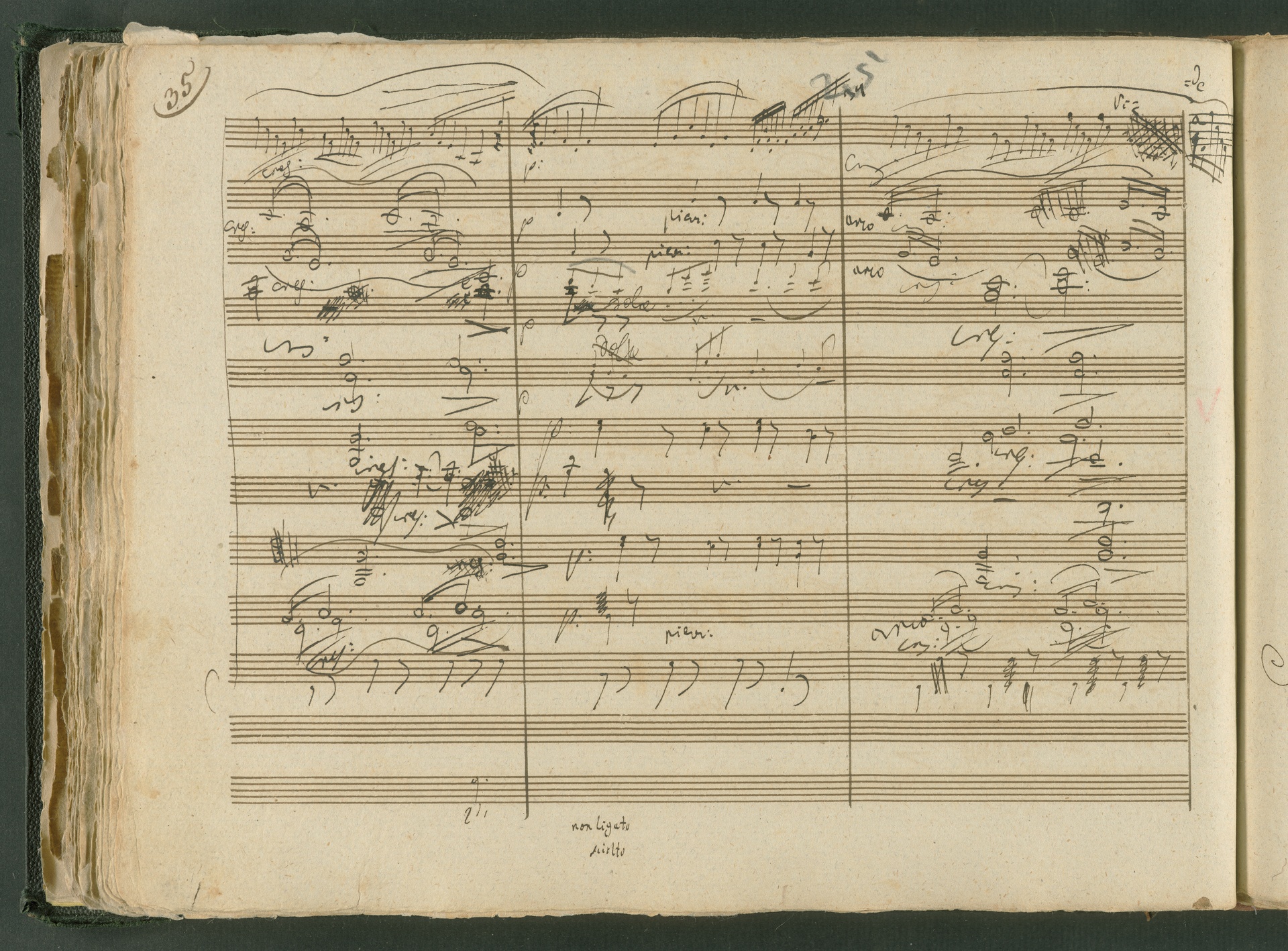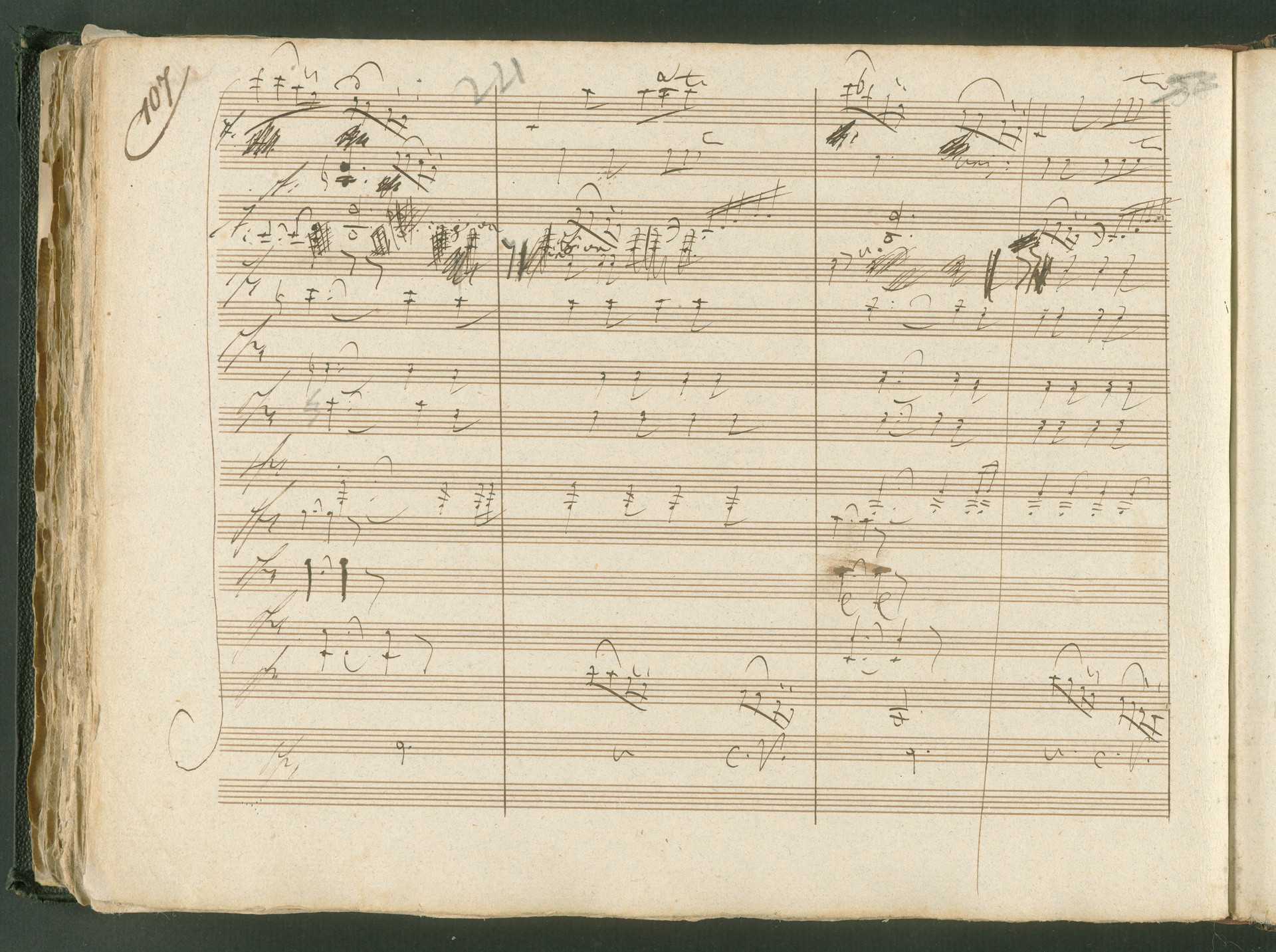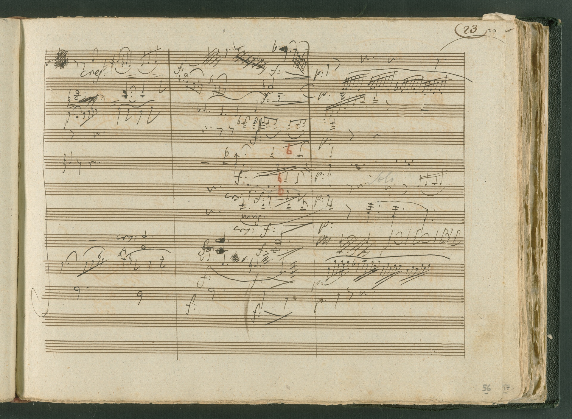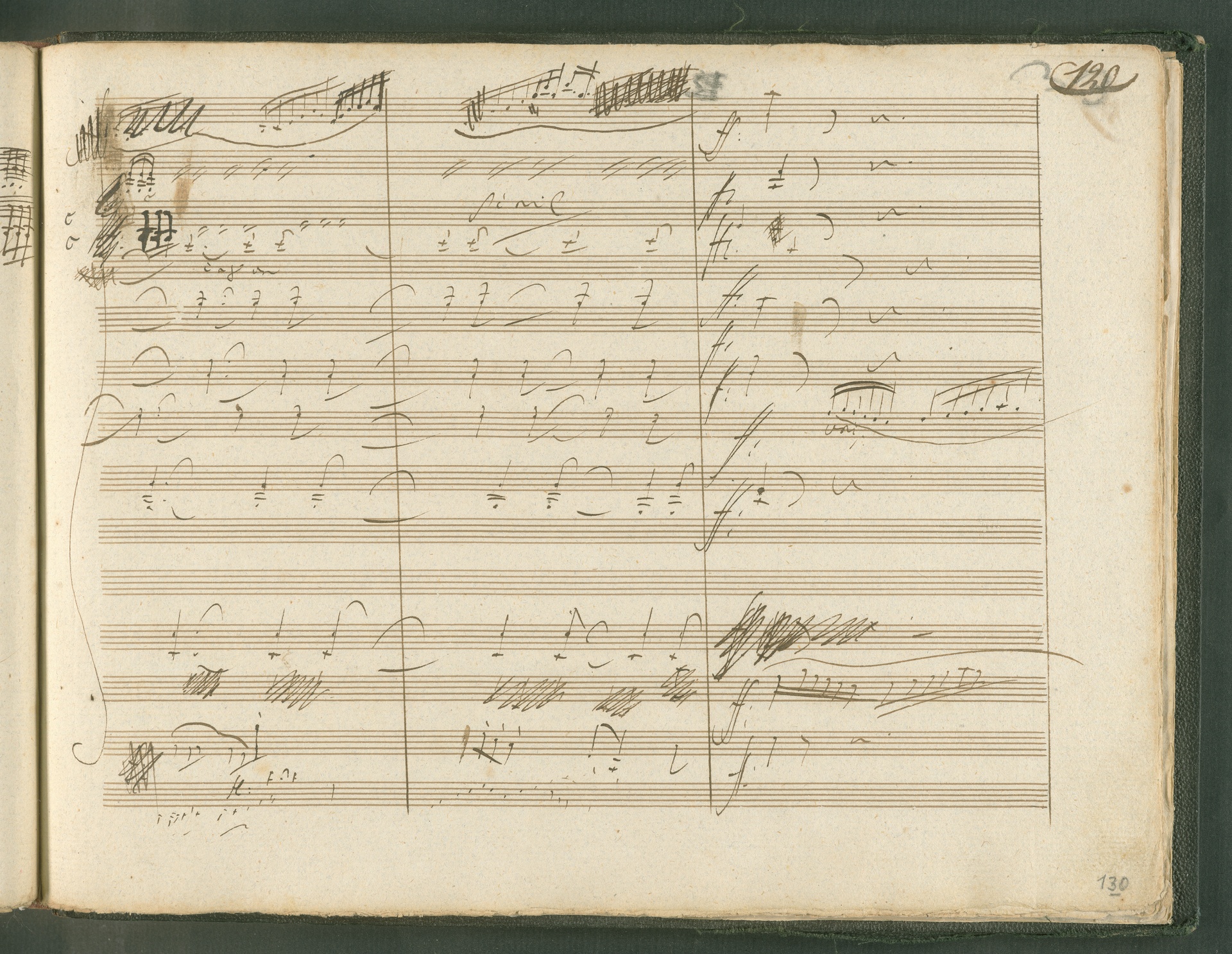 Wir sehen hier den unbestreitbar größten Schatz des Beethoven-Archivs: das vollständige Autograph der 6. Sinfonie op. 68, der "Pastorale". Es ist jedoch ein Irrtum zu glauben, dieses Autograph wäre der saubere Abschluß einer Entwicklung, an deren Ende ein fertiges, "ordentliches" Manuskript steht. Vielmehr lässt sich an diesem Autograph der Kompositionsprozeß verfolgen: unter dem abgeschlossenen Text sind mehrere Schichten sichtbar.