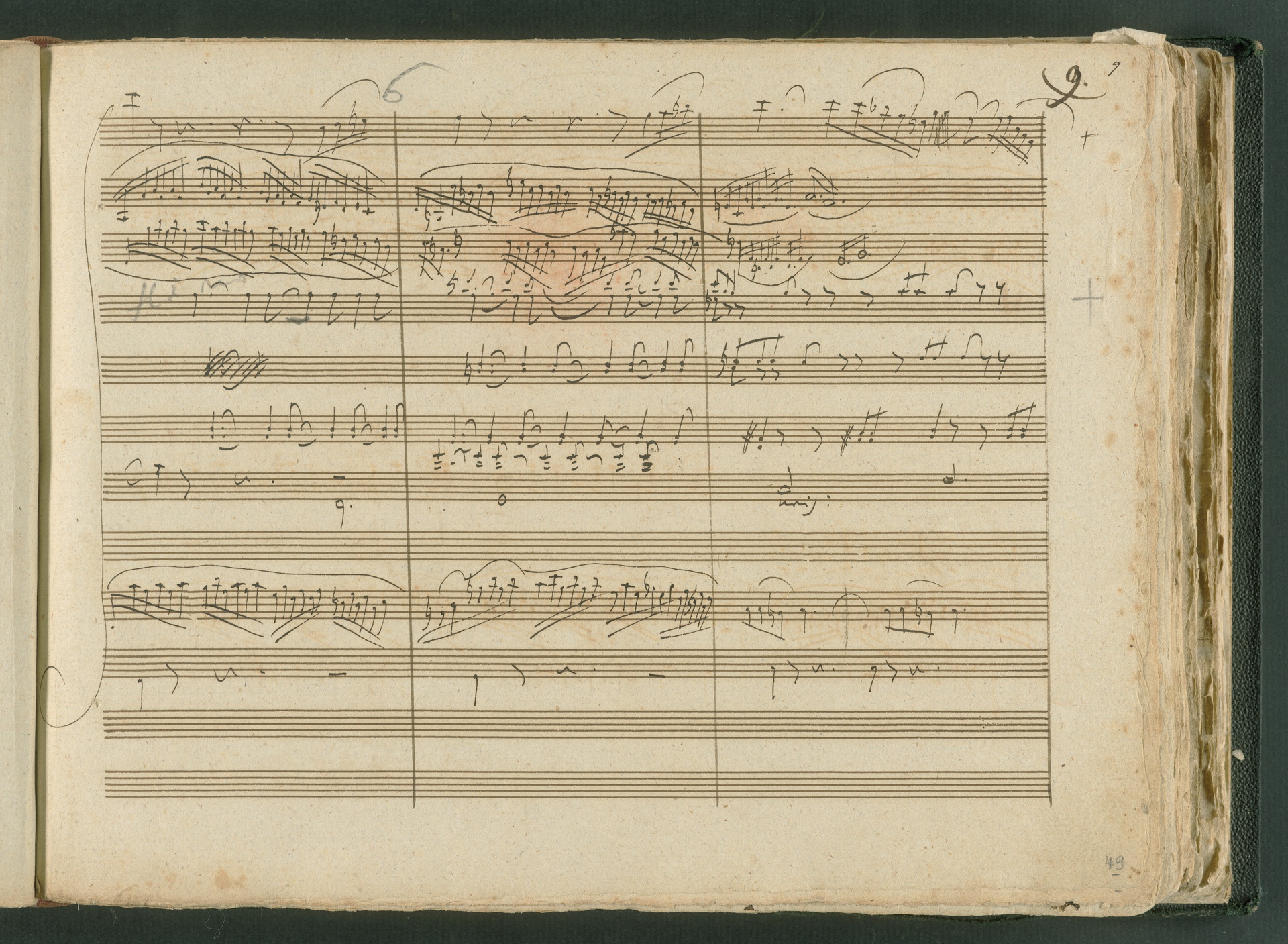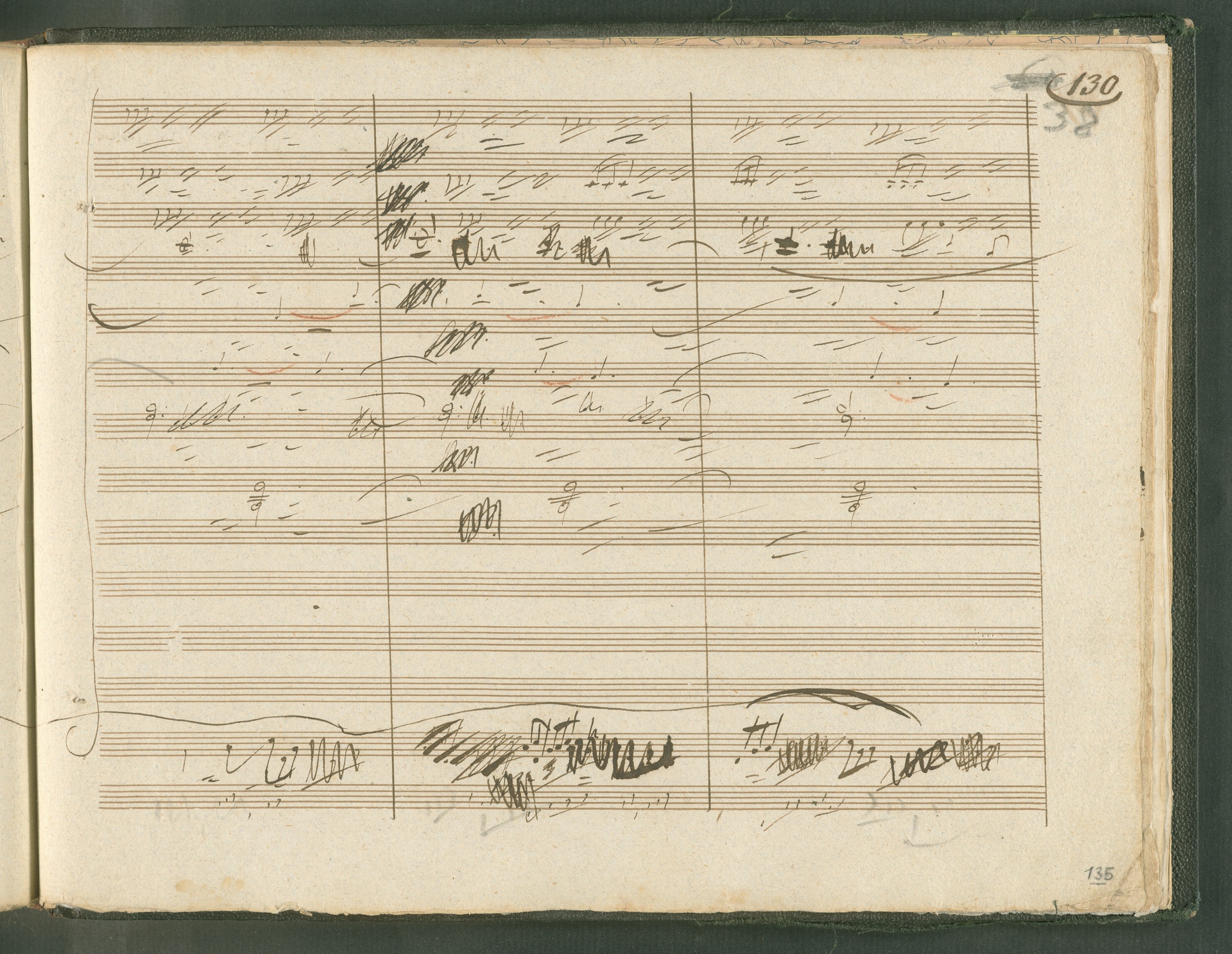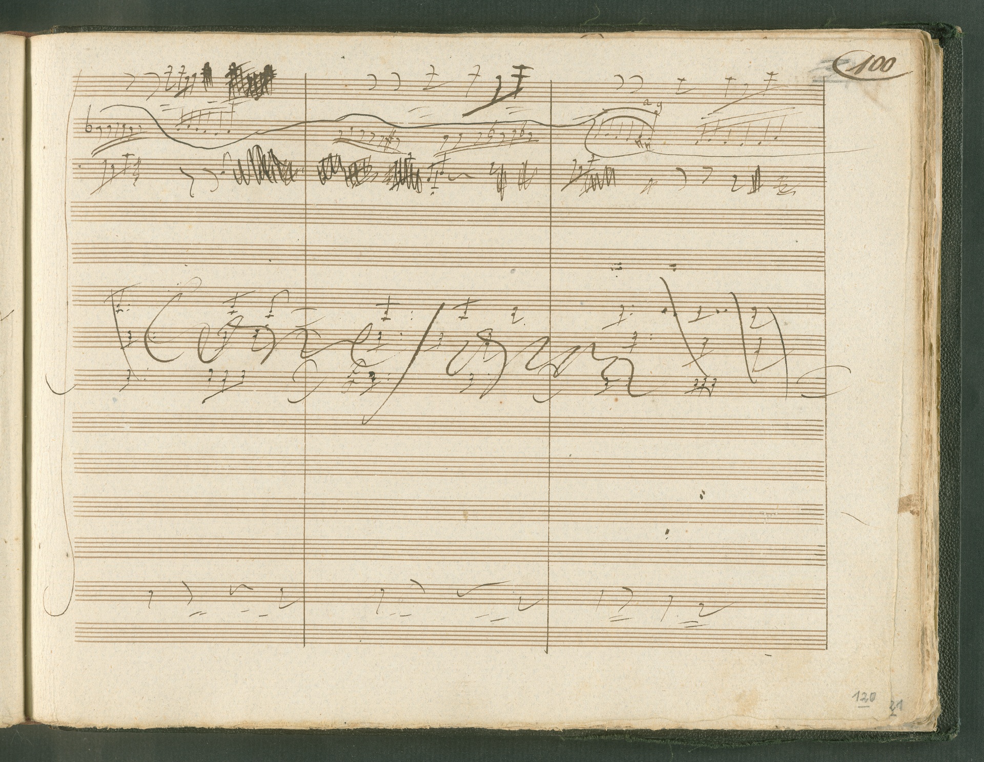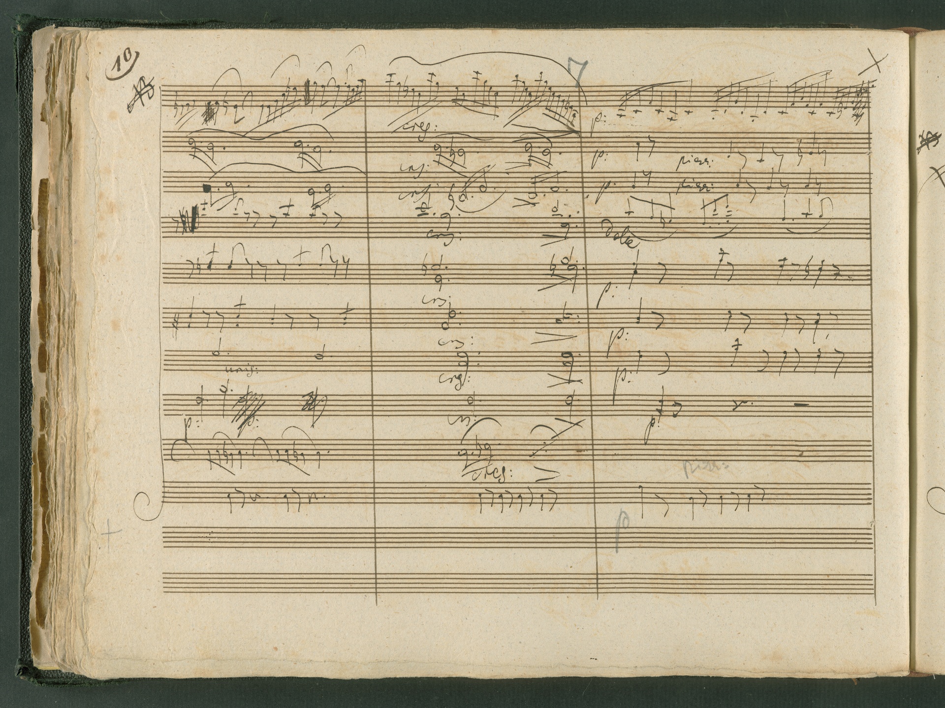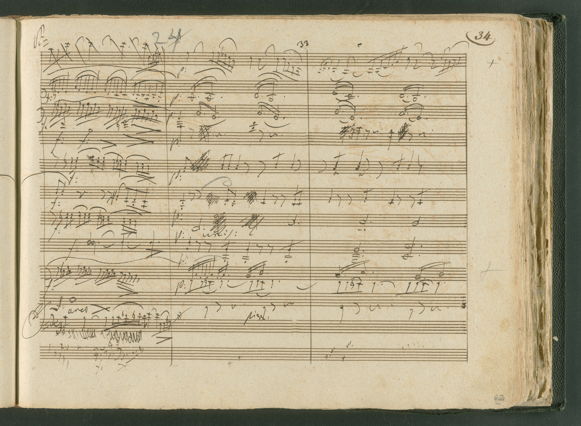 Wir sehen hier den unbestreitbar größten Schatz des Beethoven-Archivs: das vollständige Autograph der 6. Sinfonie op. 68, der "Pastorale". Es ist jedoch ein Irrtum zu glauben, dieses Autograph wäre der saubere Abschluß einer Entwicklung, an deren Ende ein fertiges, "ordentliches" Manuskript steht. Vielmehr lässt sich an diesem Autograph der Kompositionsprozeß verfolgen: unter dem abgeschlossenen Text sind mehrere Schichten sichtbar.