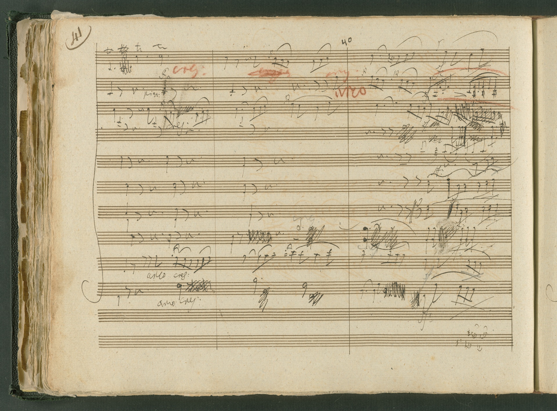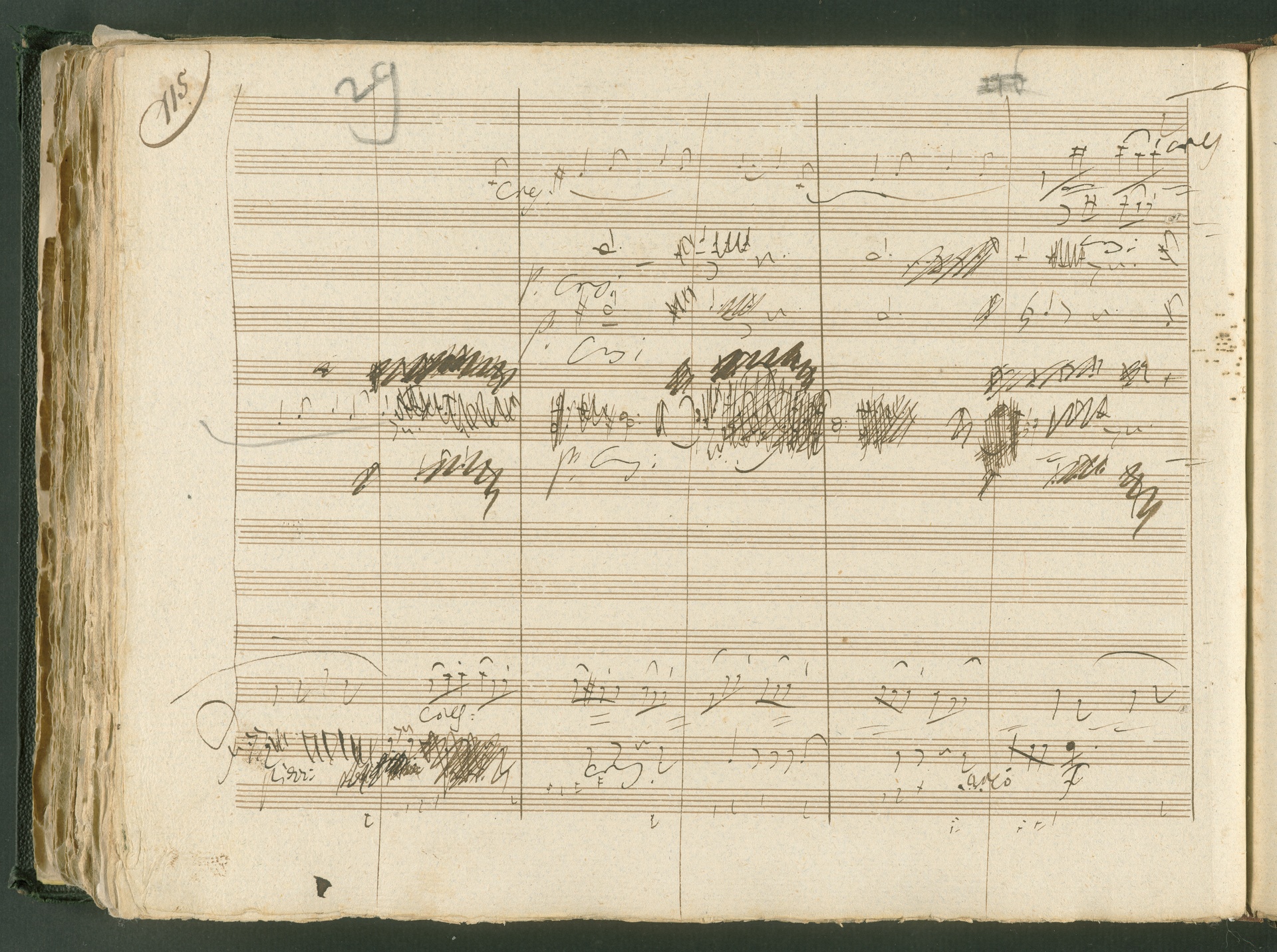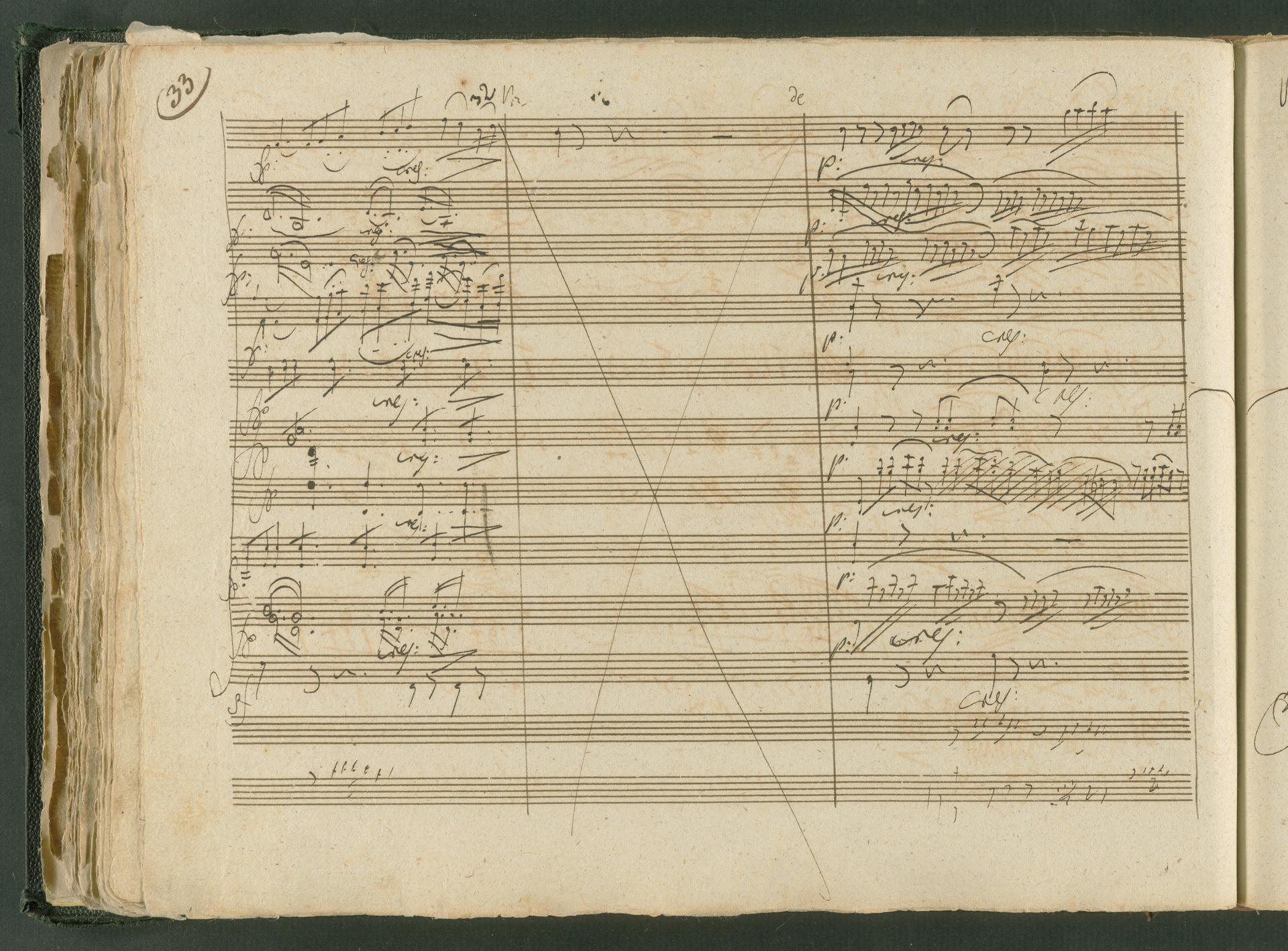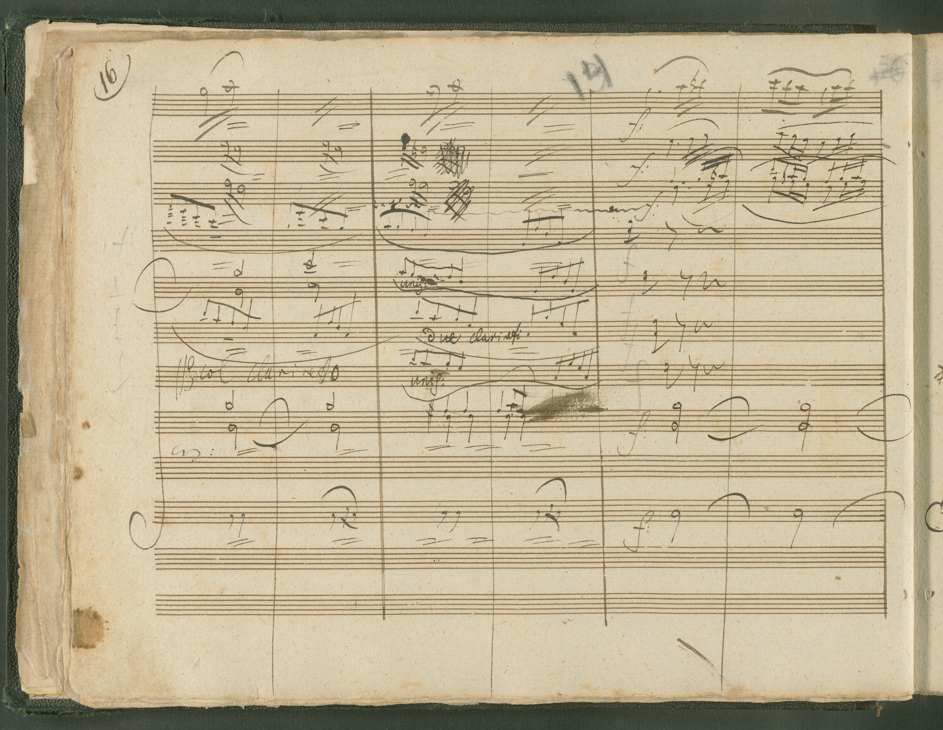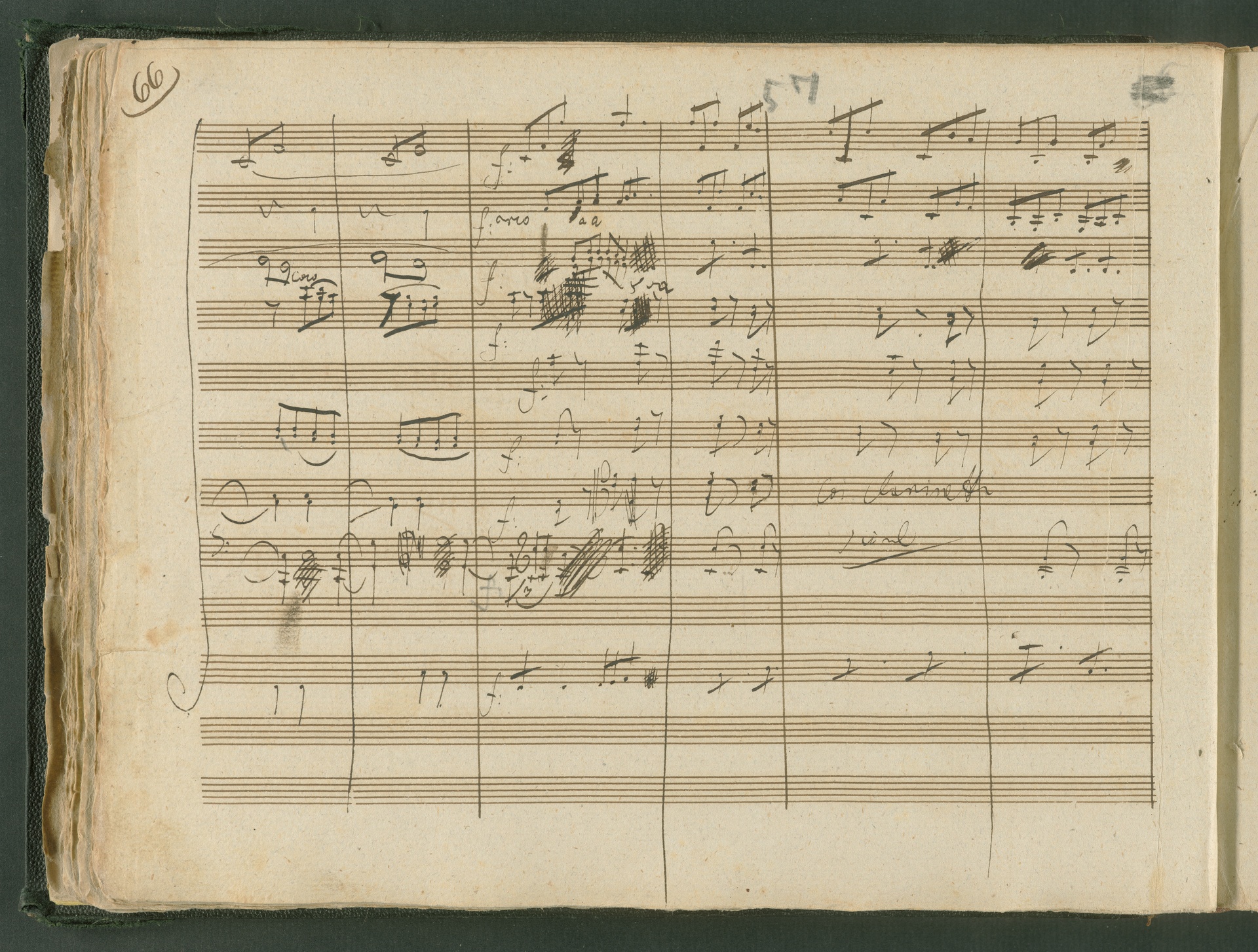 Wir sehen hier den unbestreitbar größten Schatz des Beethoven-Archivs: das vollständige Autograph der 6. Sinfonie op. 68, der "Pastorale". Es ist jedoch ein Irrtum zu glauben, dieses Autograph wäre der saubere Abschluß einer Entwicklung, an deren Ende ein fertiges, "ordentliches" Manuskript steht. Vielmehr lässt sich an diesem Autograph der Kompositionsprozeß verfolgen: unter dem abgeschlossenen Text sind mehrere Schichten sichtbar.