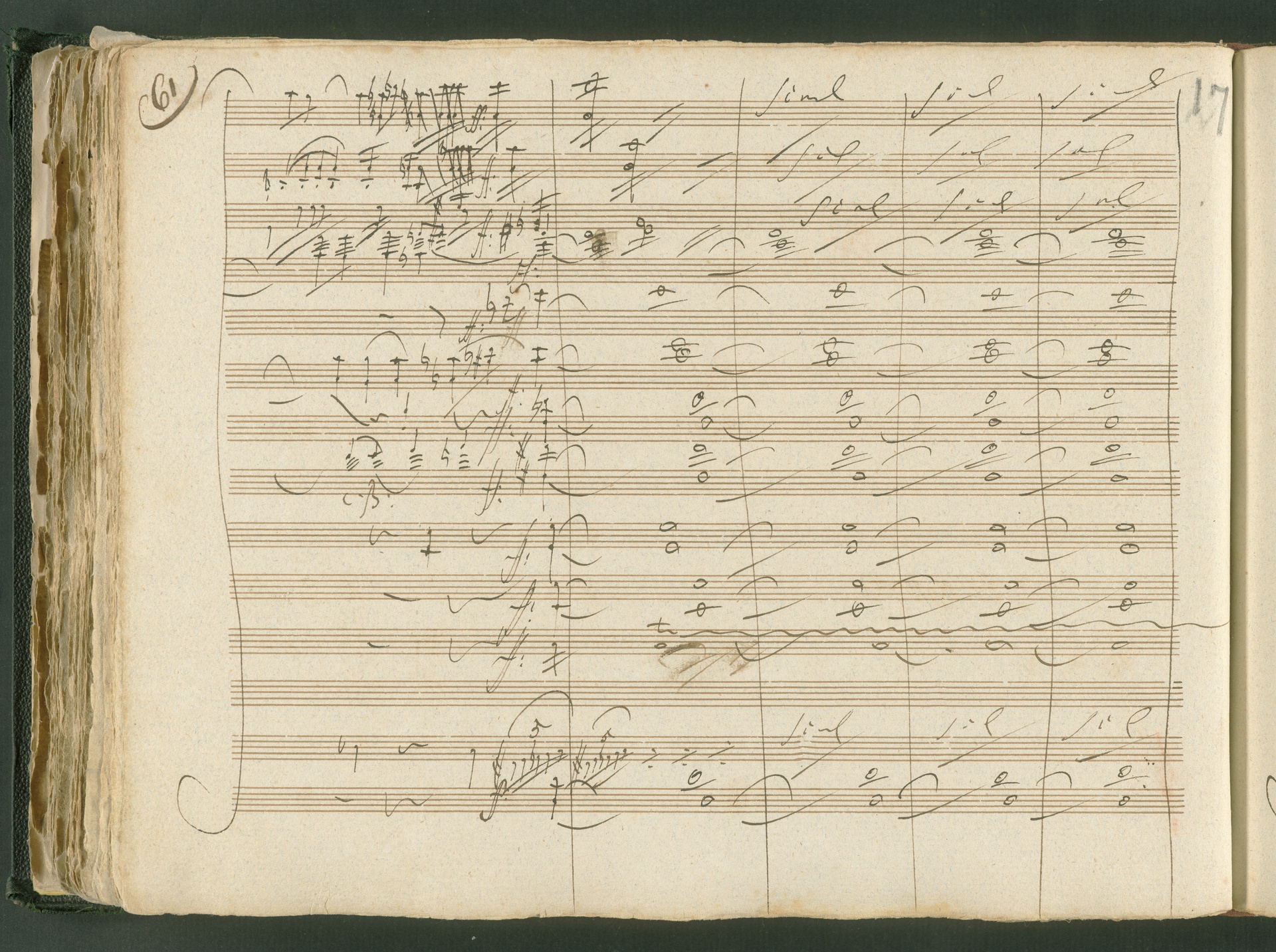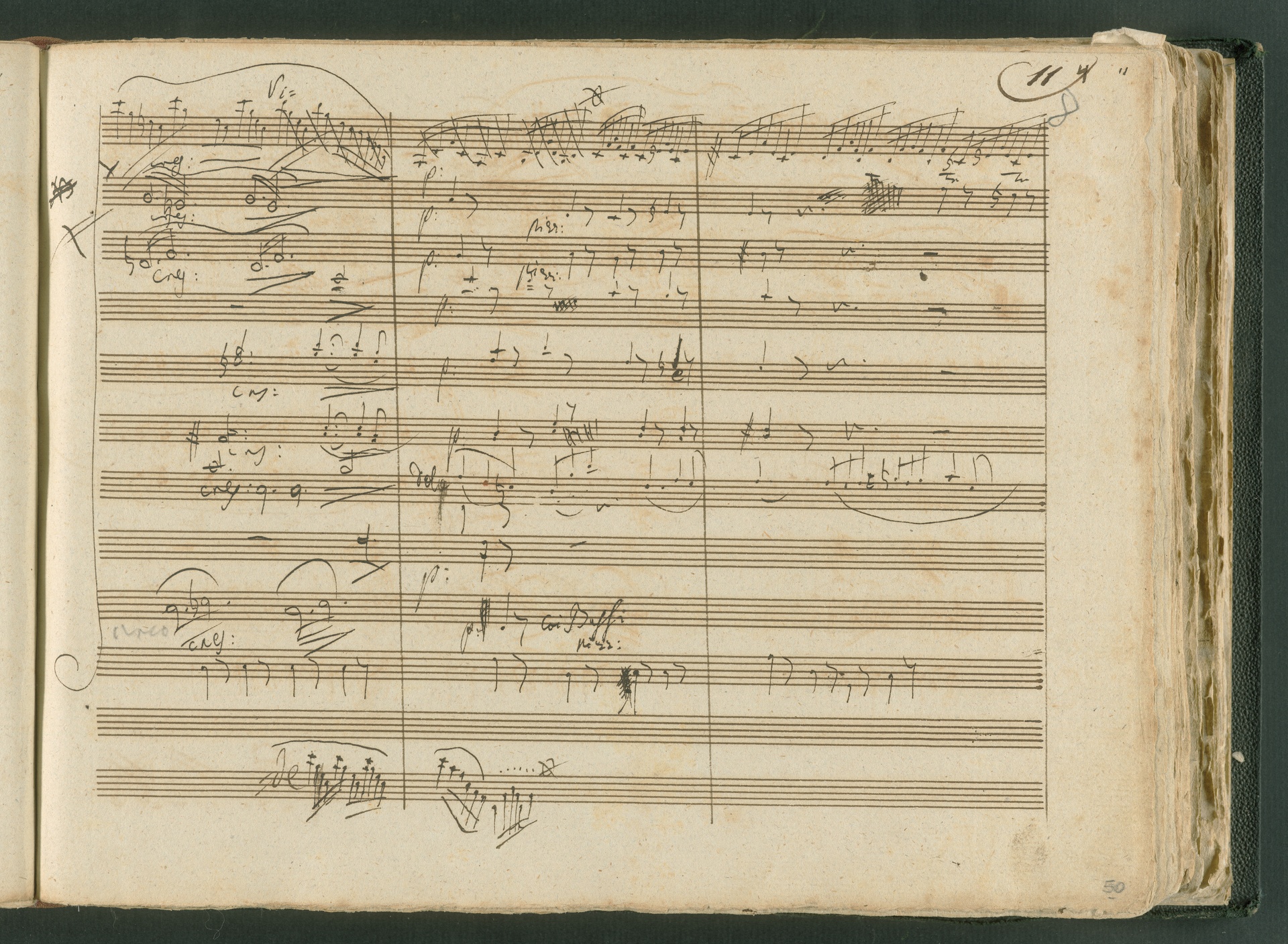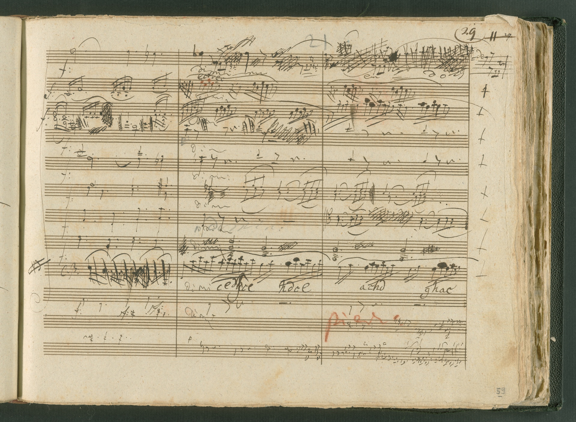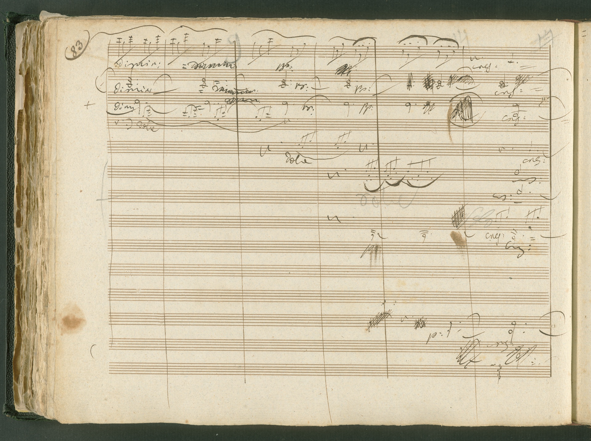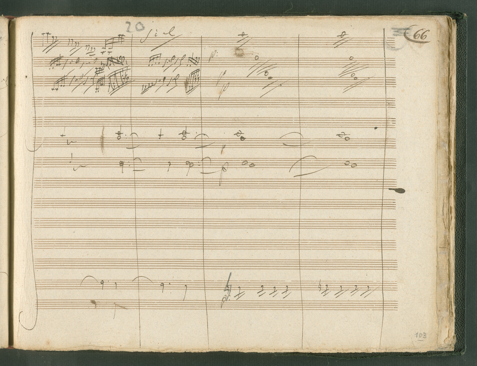 Wir sehen hier den unbestreitbar größten Schatz des Beethoven-Archivs: das vollständige Autograph der 6. Sinfonie op. 68, der "Pastorale". Es ist jedoch ein Irrtum zu glauben, dieses Autograph wäre der saubere Abschluß einer Entwicklung, an deren Ende ein fertiges, "ordentliches" Manuskript steht. Vielmehr lässt sich an diesem Autograph der Kompositionsprozeß verfolgen: unter dem abgeschlossenen Text sind mehrere Schichten sichtbar.