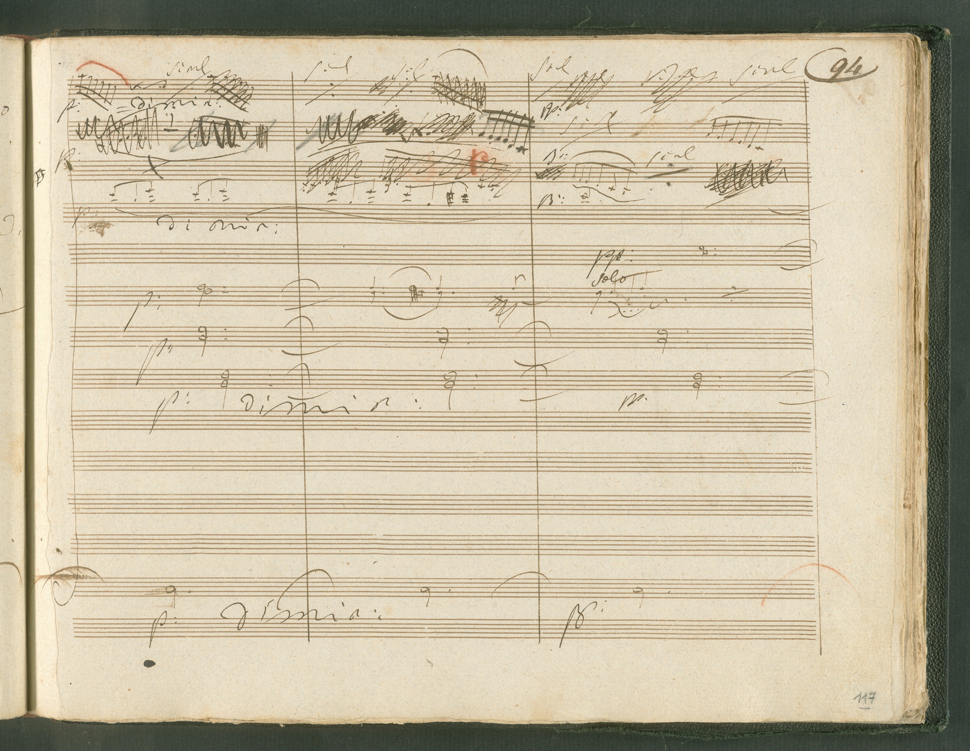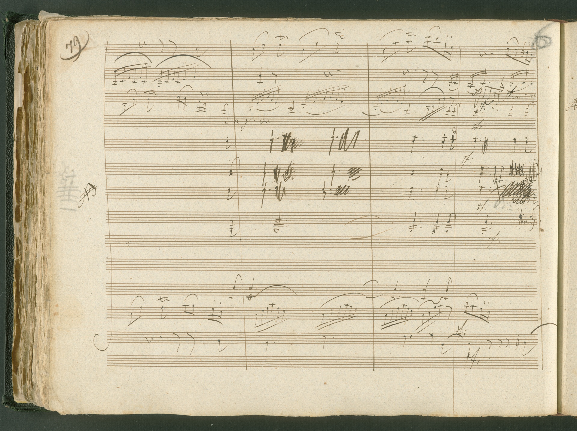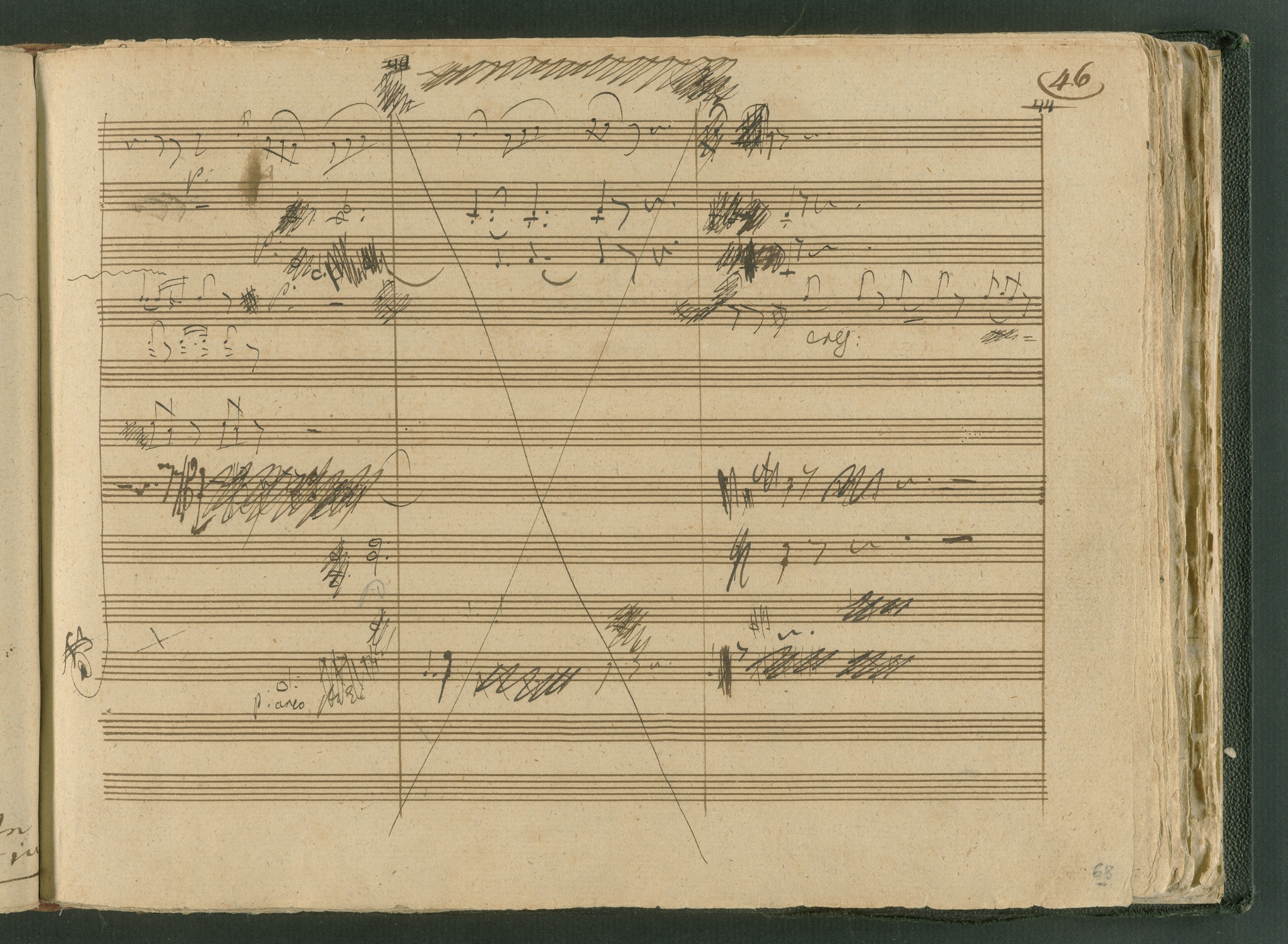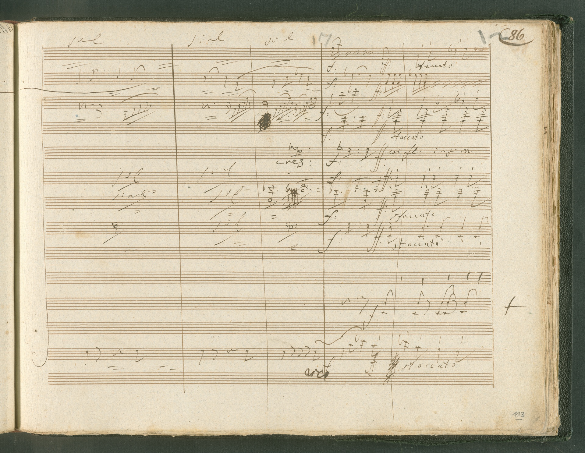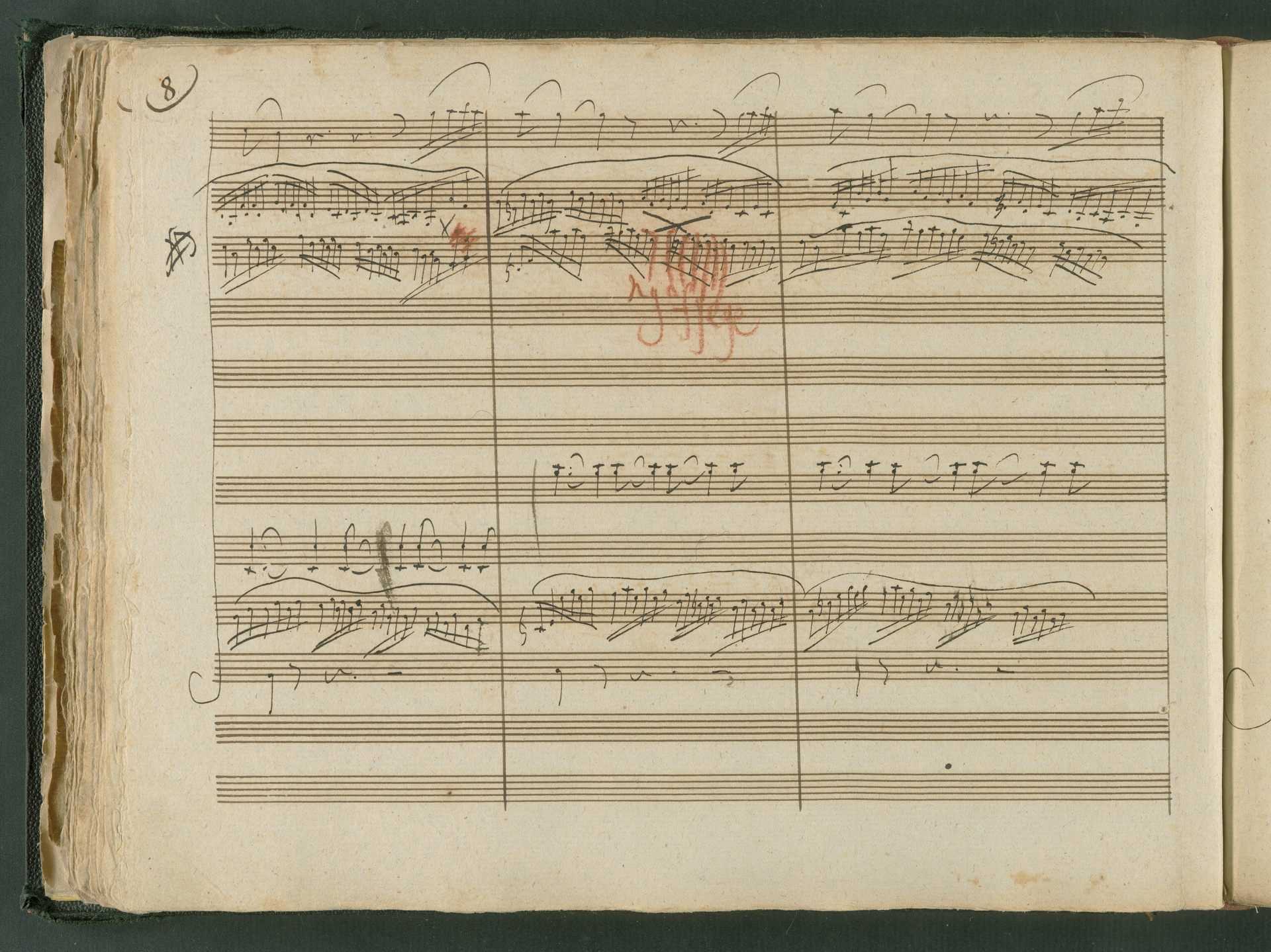 Wir sehen hier den unbestreitbar größten Schatz des Beethoven-Archivs: das vollständige Autograph der 6. Sinfonie op. 68, der "Pastorale". Es ist jedoch ein Irrtum zu glauben, dieses Autograph wäre der saubere Abschluß einer Entwicklung, an deren Ende ein fertiges, "ordentliches" Manuskript steht. Vielmehr lässt sich an diesem Autograph der Kompositionsprozeß verfolgen: unter dem abgeschlossenen Text sind mehrere Schichten sichtbar.