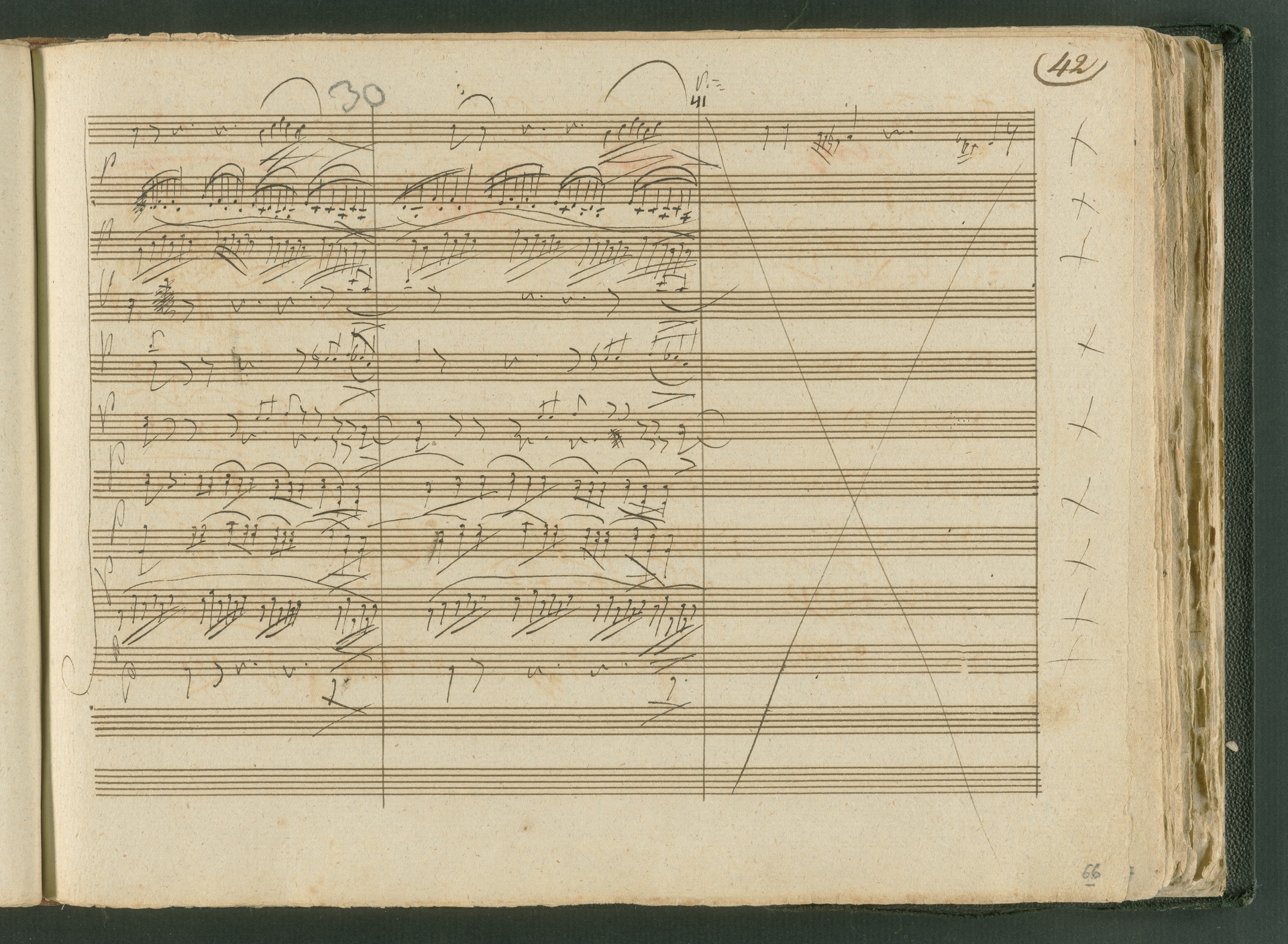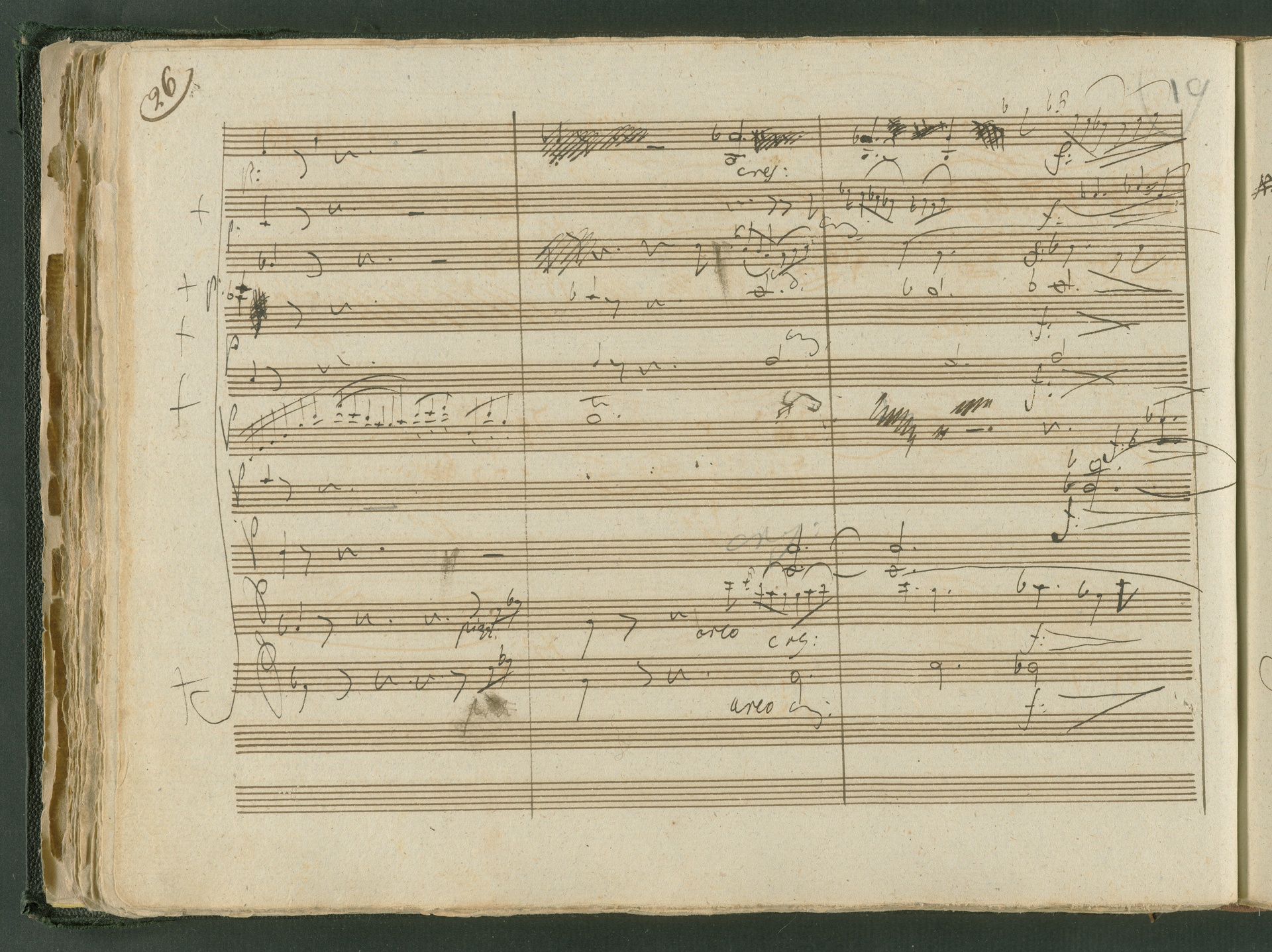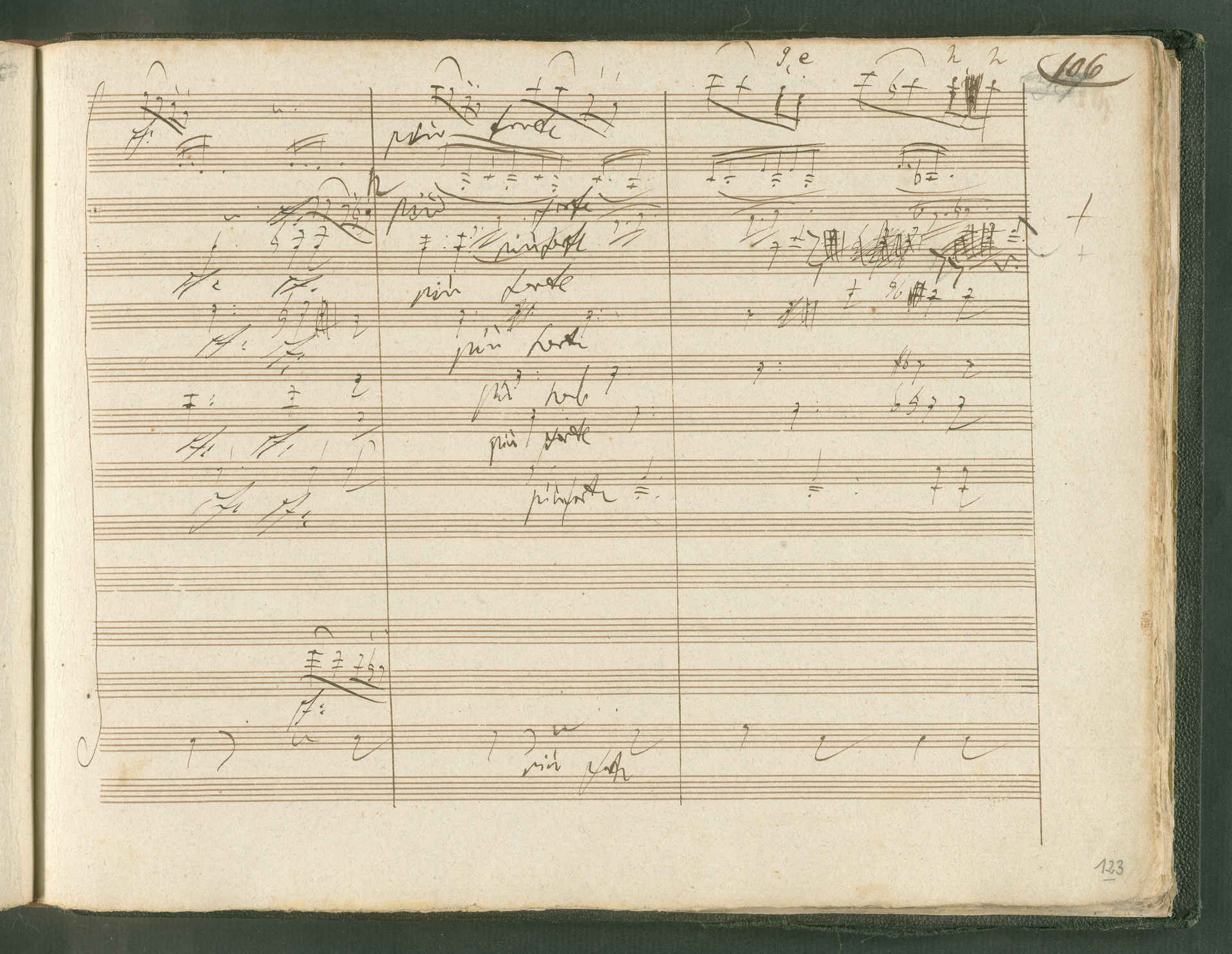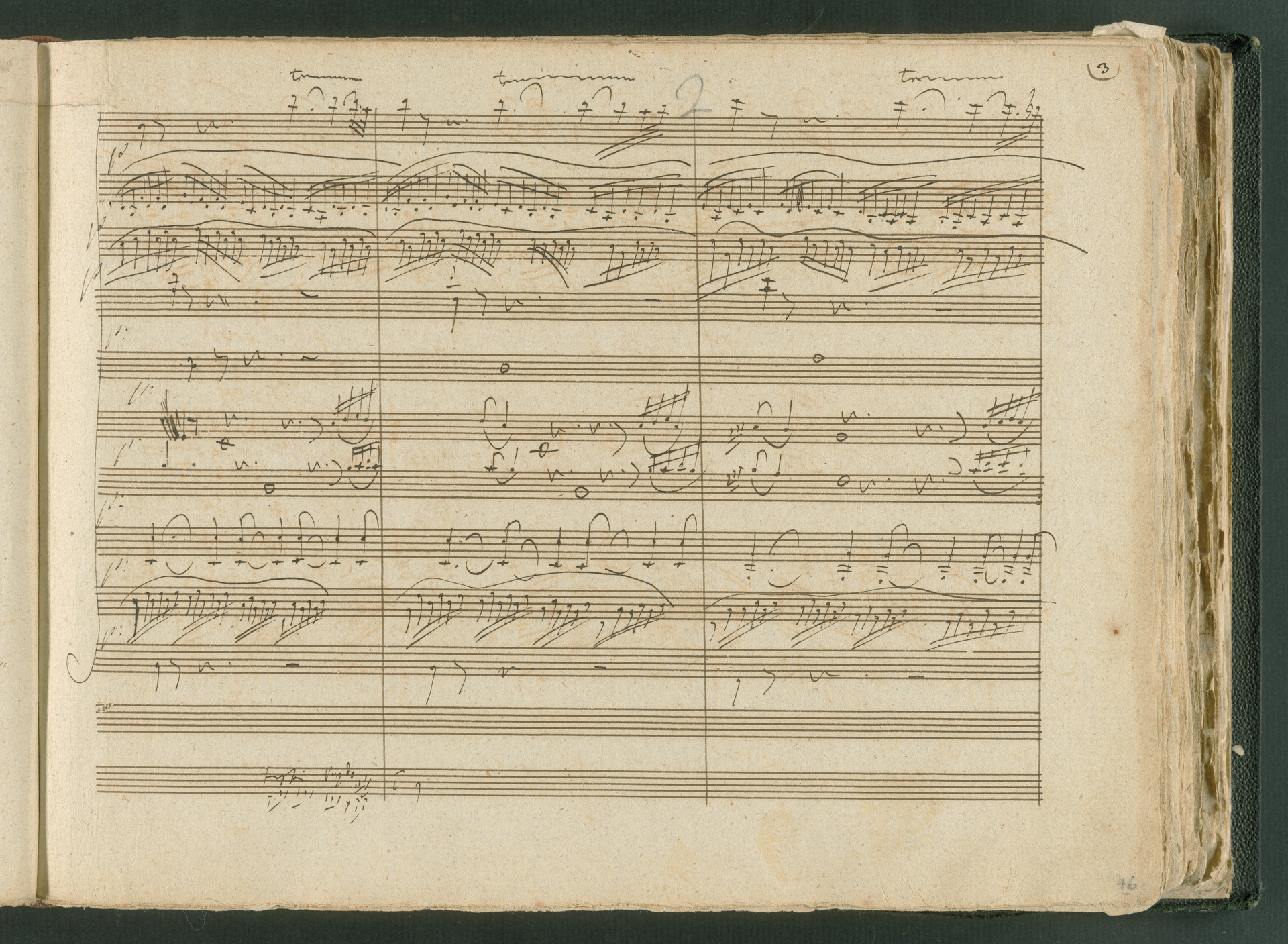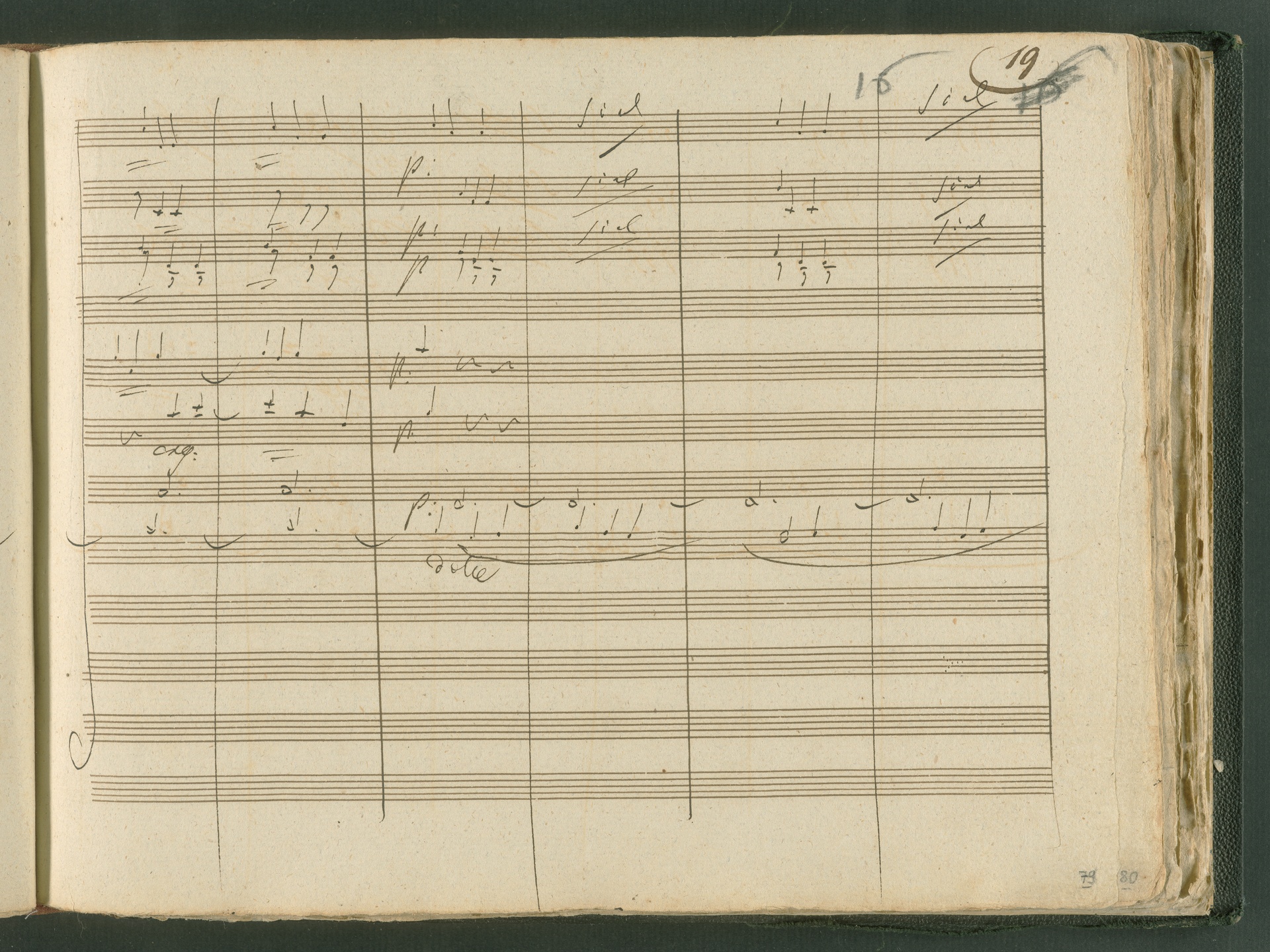 Wir sehen hier den unbestreitbar größten Schatz des Beethoven-Archivs: das vollständige Autograph der 6. Sinfonie op. 68, der "Pastorale". Es ist jedoch ein Irrtum zu glauben, dieses Autograph wäre der saubere Abschluß einer Entwicklung, an deren Ende ein fertiges, "ordentliches" Manuskript steht. Vielmehr lässt sich an diesem Autograph der Kompositionsprozeß verfolgen: unter dem abgeschlossenen Text sind mehrere Schichten sichtbar.