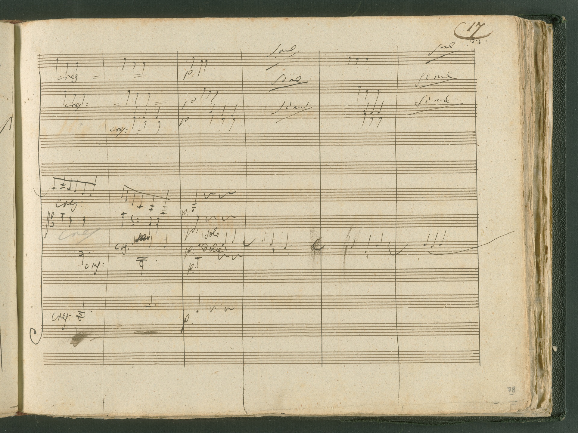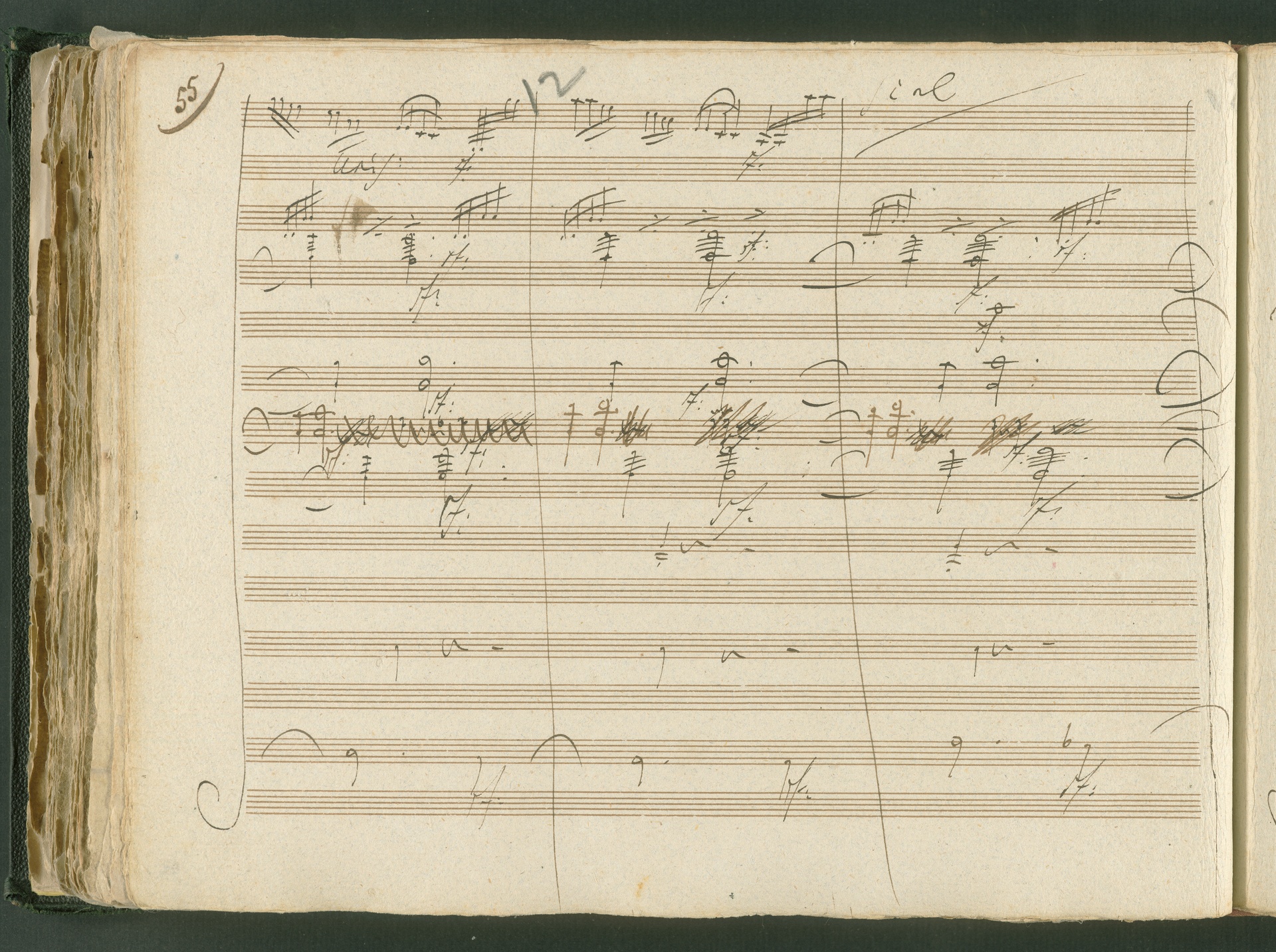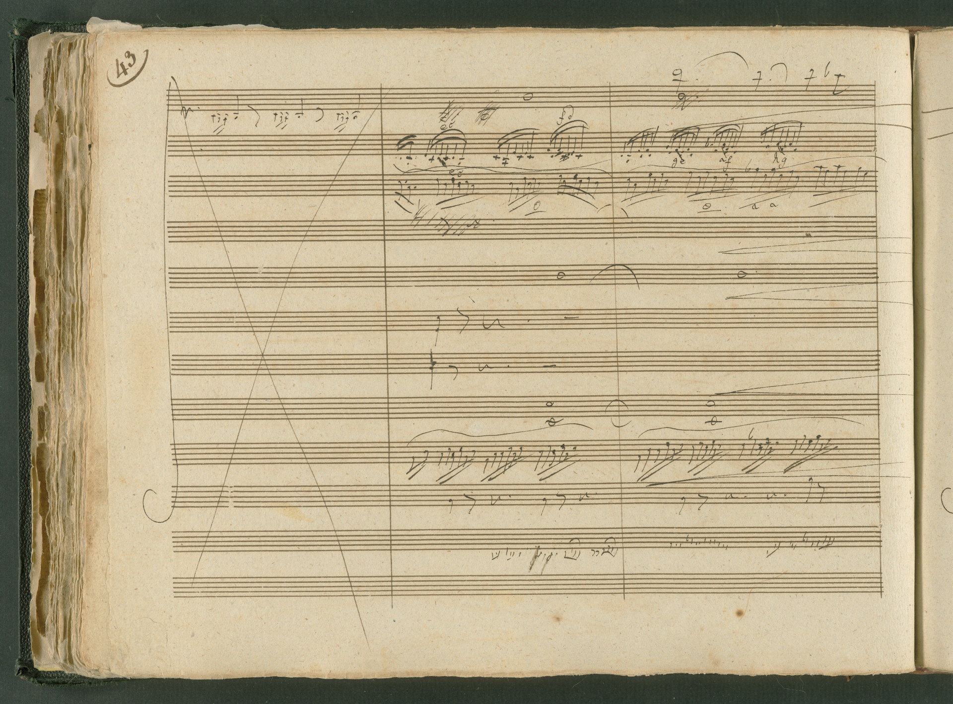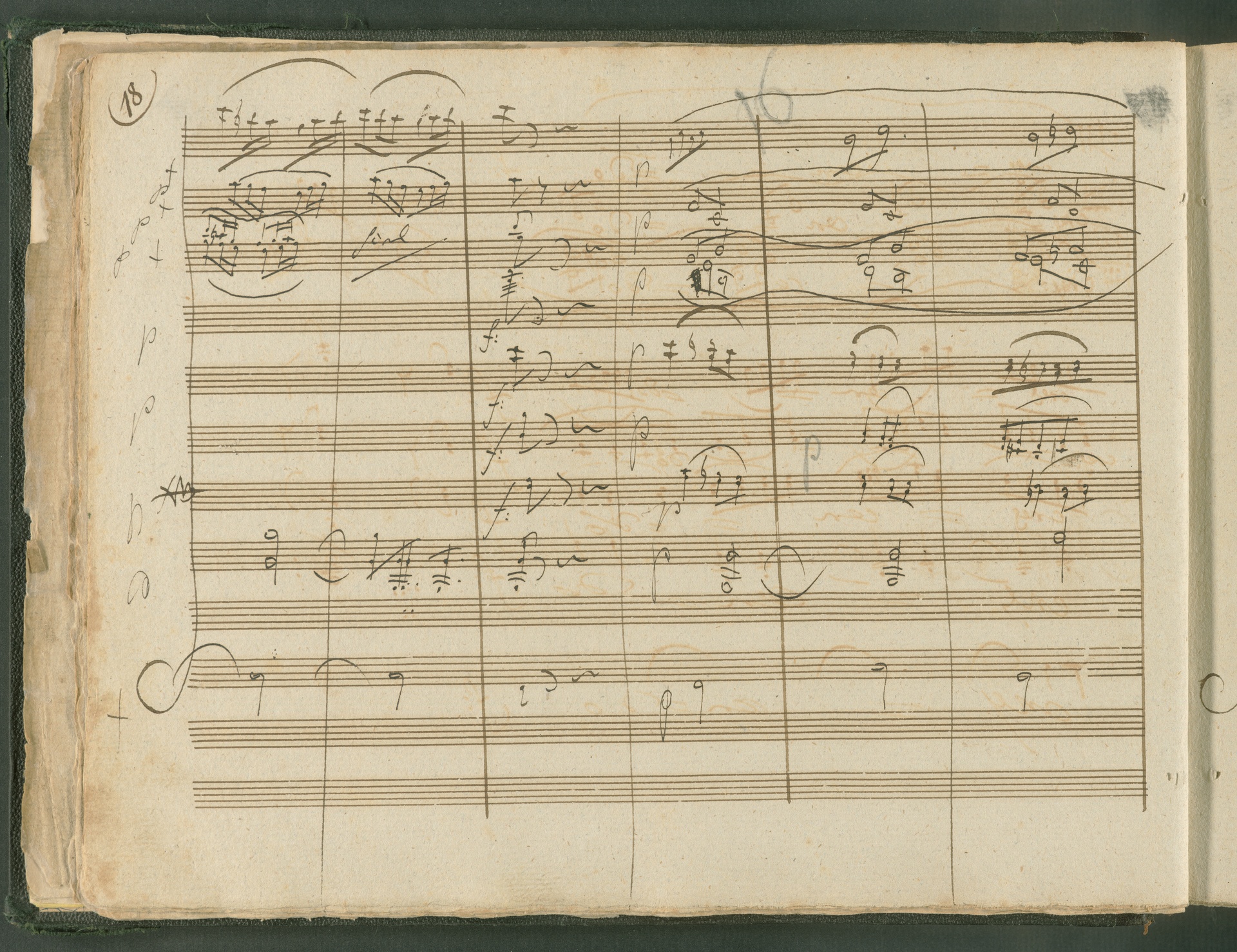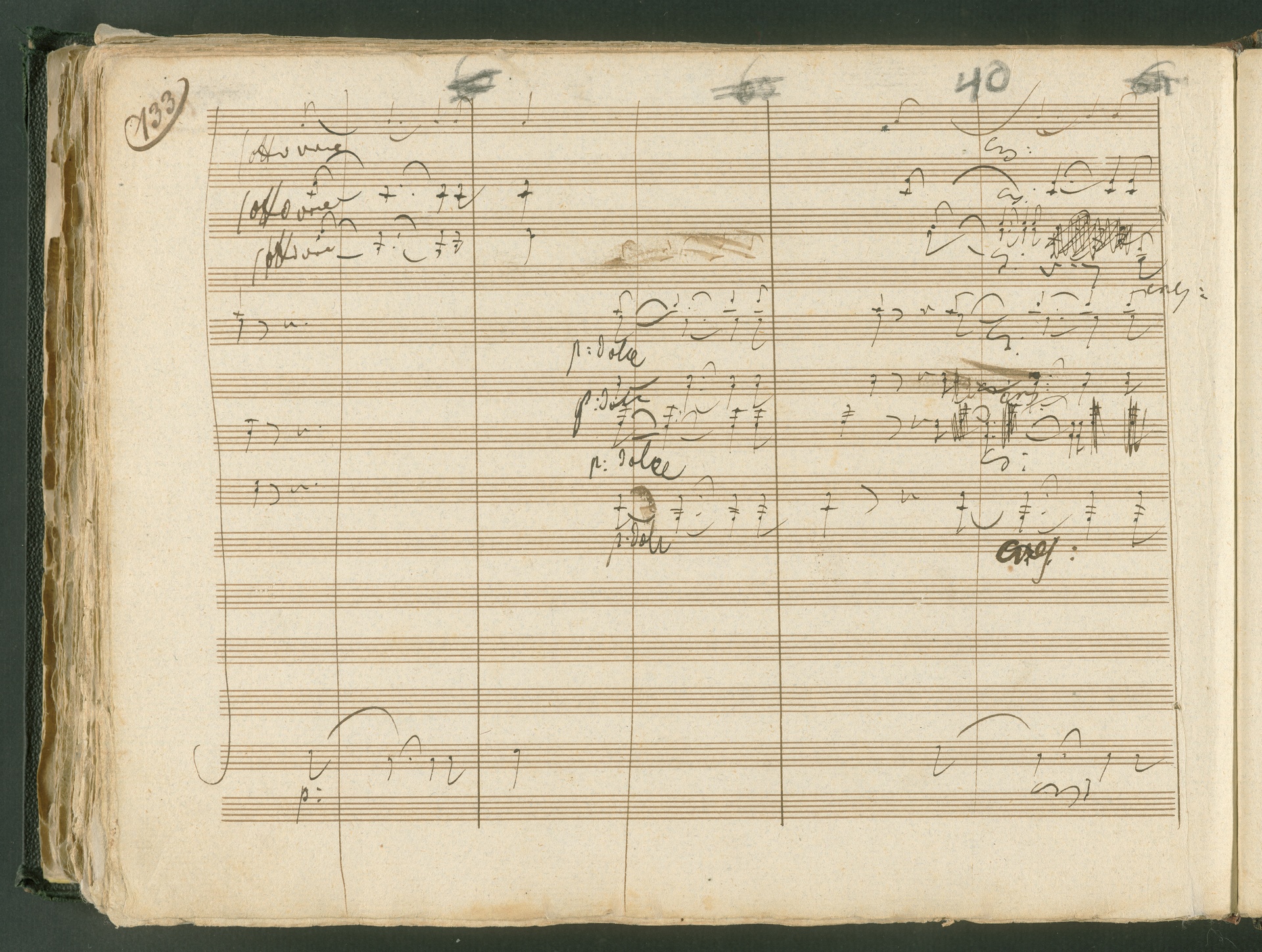 Wir sehen hier den unbestreitbar größten Schatz des Beethoven-Archivs: das vollständige Autograph der 6. Sinfonie op. 68, der "Pastorale". Es ist jedoch ein Irrtum zu glauben, dieses Autograph wäre der saubere Abschluß einer Entwicklung, an deren Ende ein fertiges, "ordentliches" Manuskript steht. Vielmehr lässt sich an diesem Autograph der Kompositionsprozeß verfolgen: unter dem abgeschlossenen Text sind mehrere Schichten sichtbar.