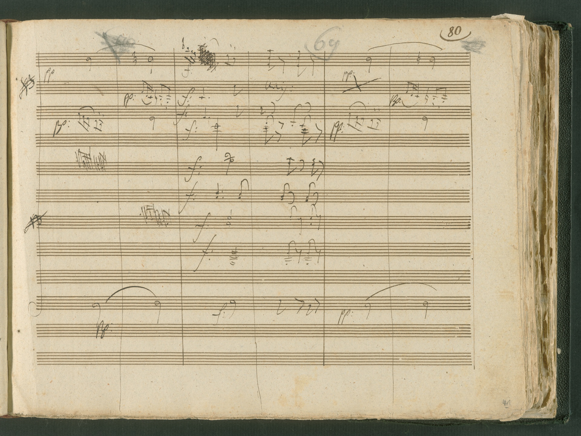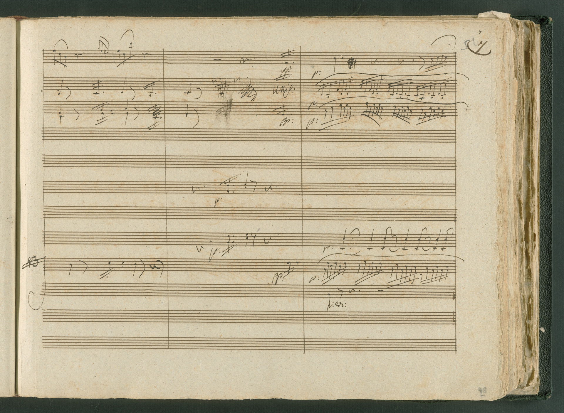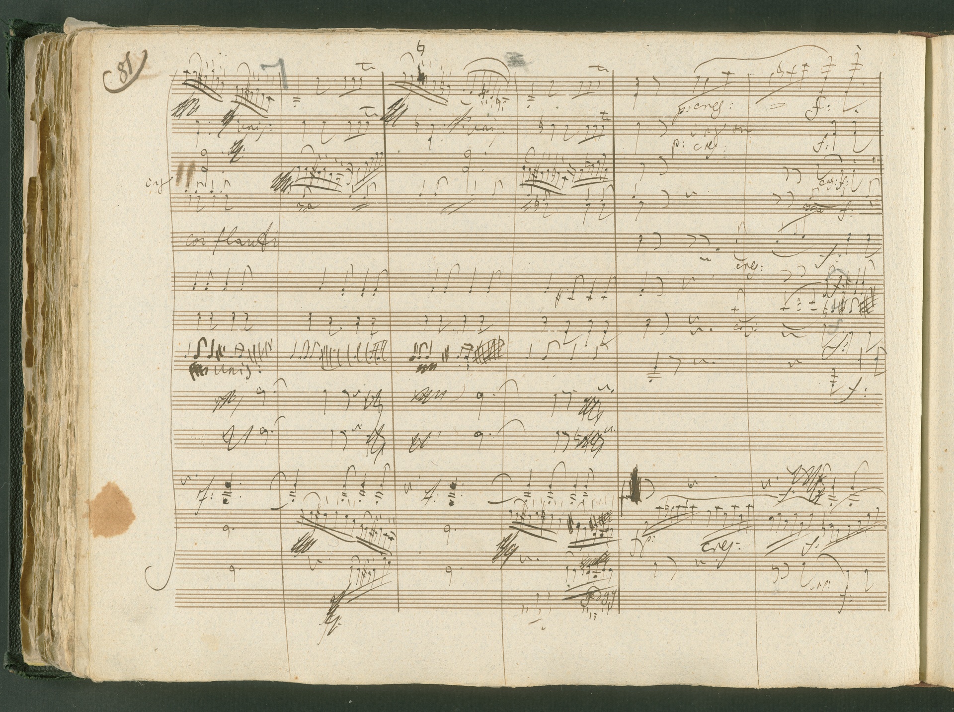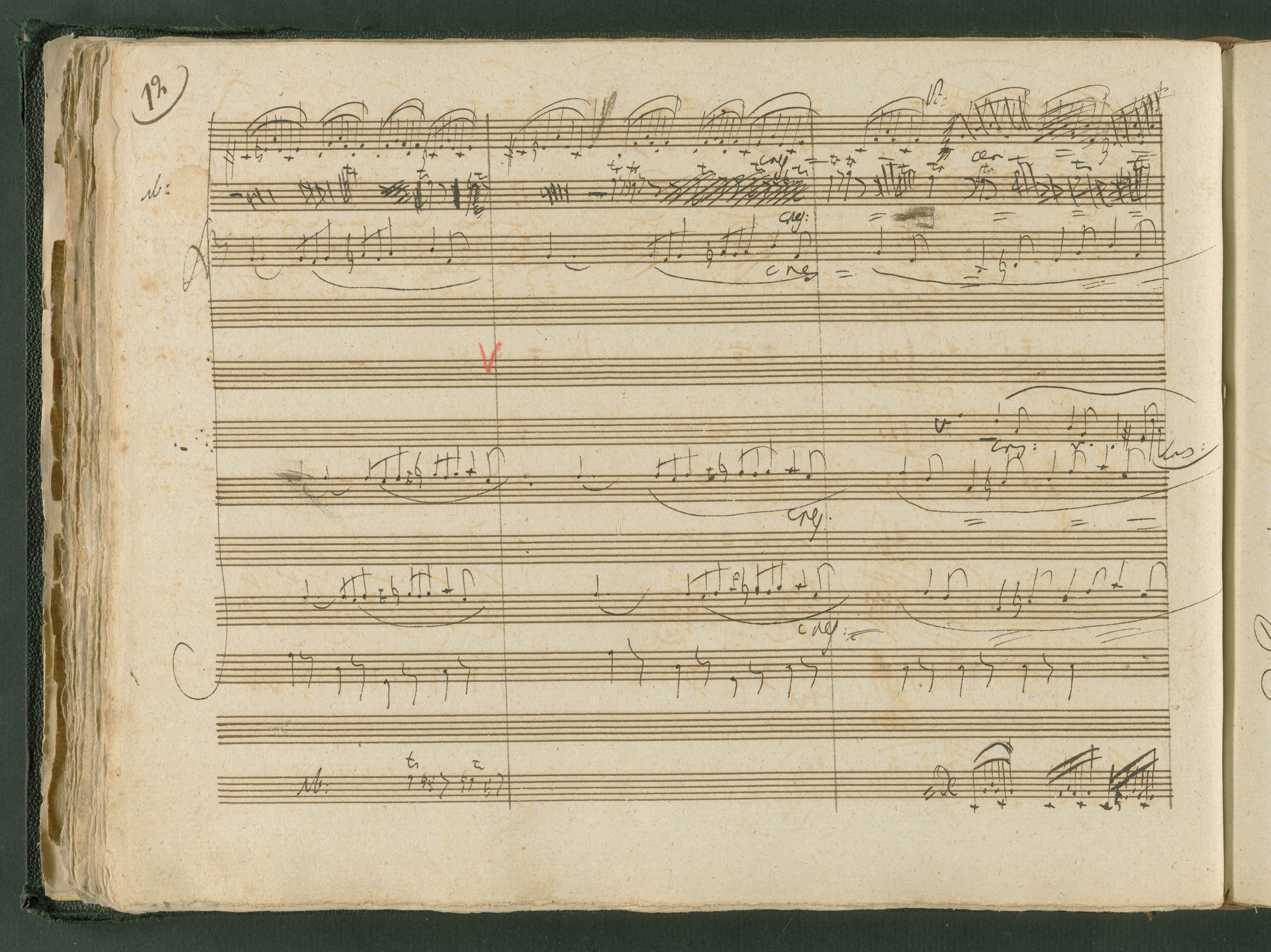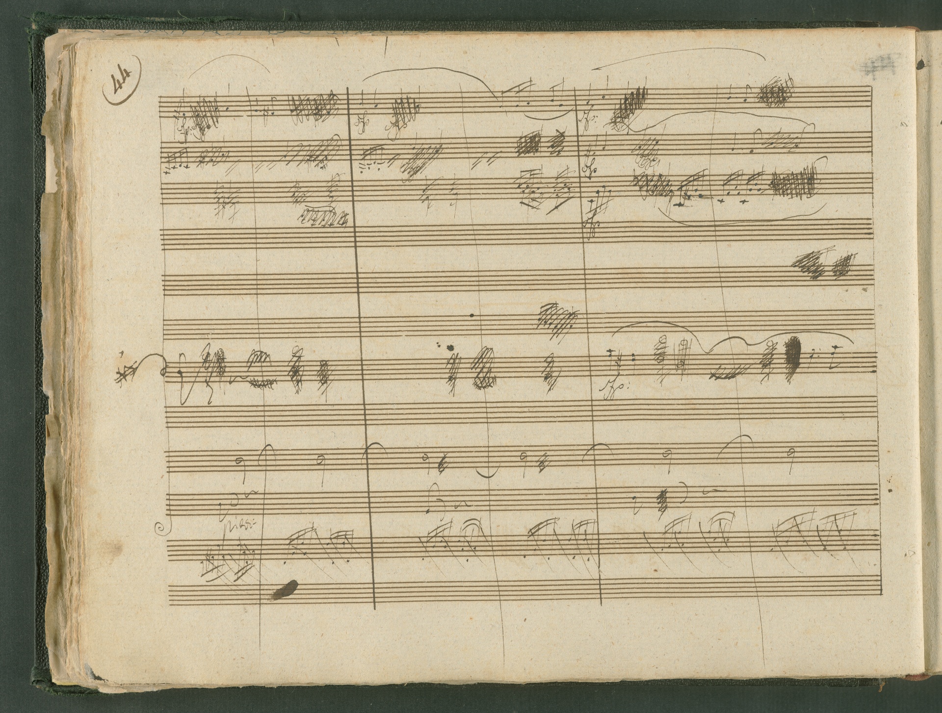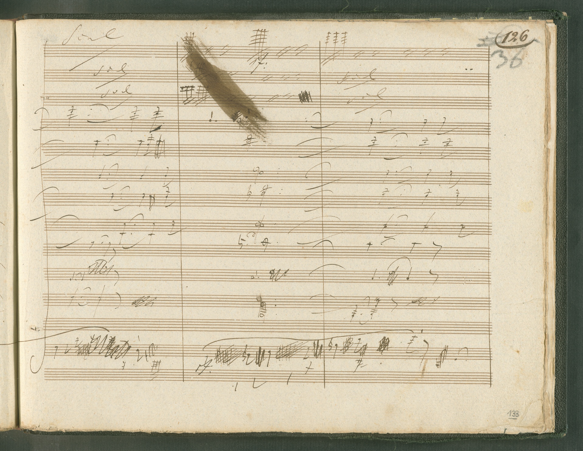 Wir sehen hier den unbestreitbar größten Schatz des Beethoven-Archivs: das vollständige Autograph der 6. Sinfonie op. 68, der "Pastorale". Es ist jedoch ein Irrtum zu glauben, dieses Autograph wäre der saubere Abschluß einer Entwicklung, an deren Ende ein fertiges, "ordentliches" Manuskript steht. Vielmehr lässt sich an diesem Autograph der Kompositionsprozeß verfolgen: unter dem abgeschlossenen Text sind mehrere Schichten sichtbar.