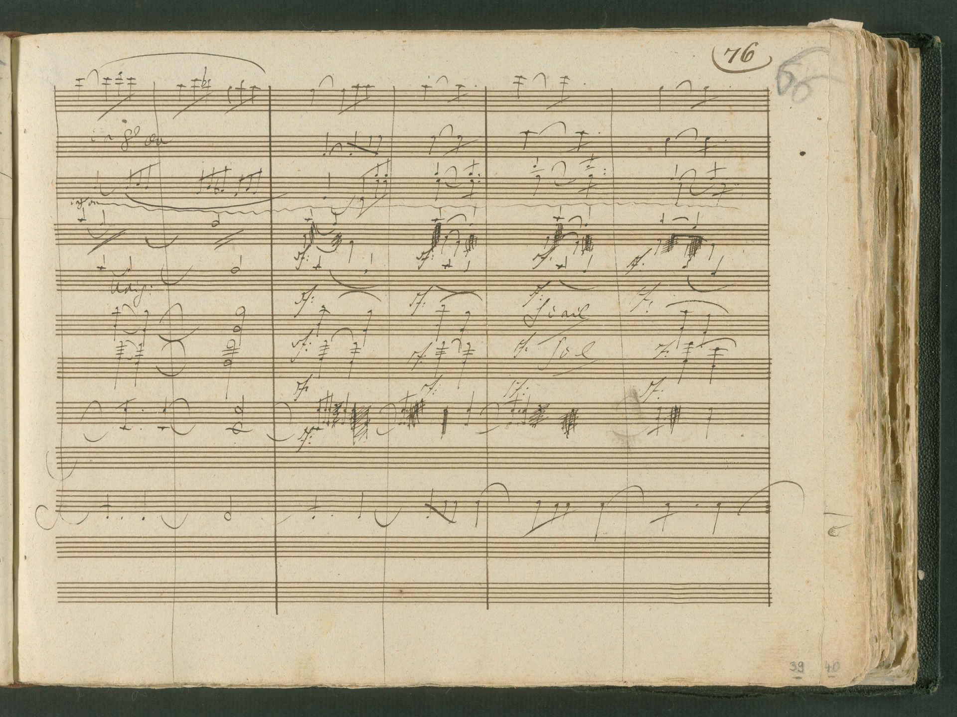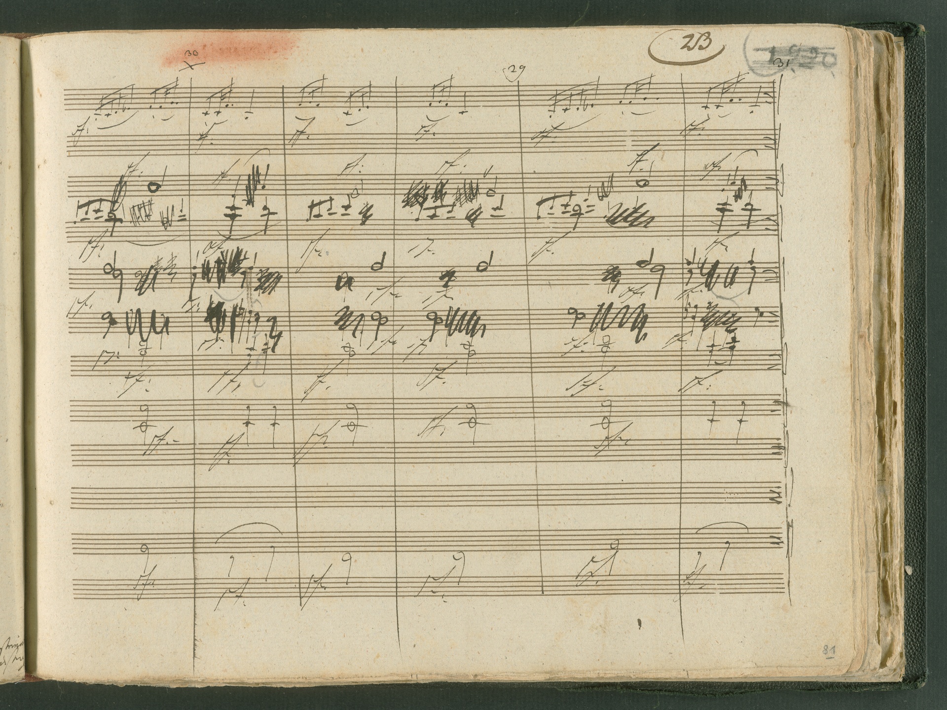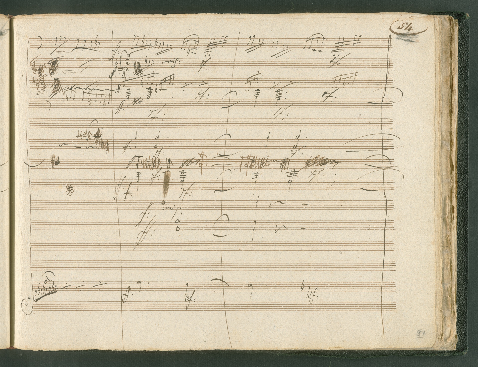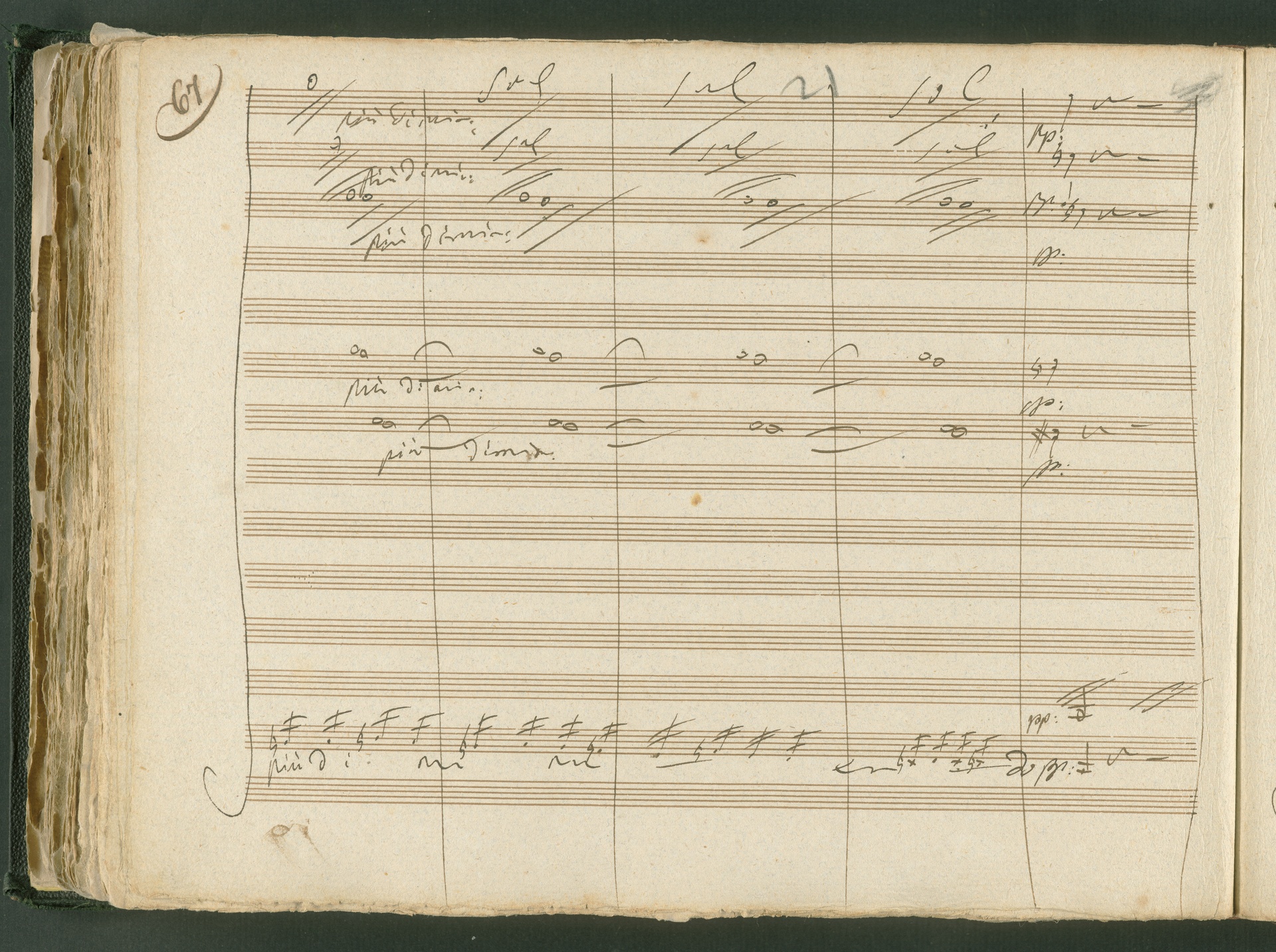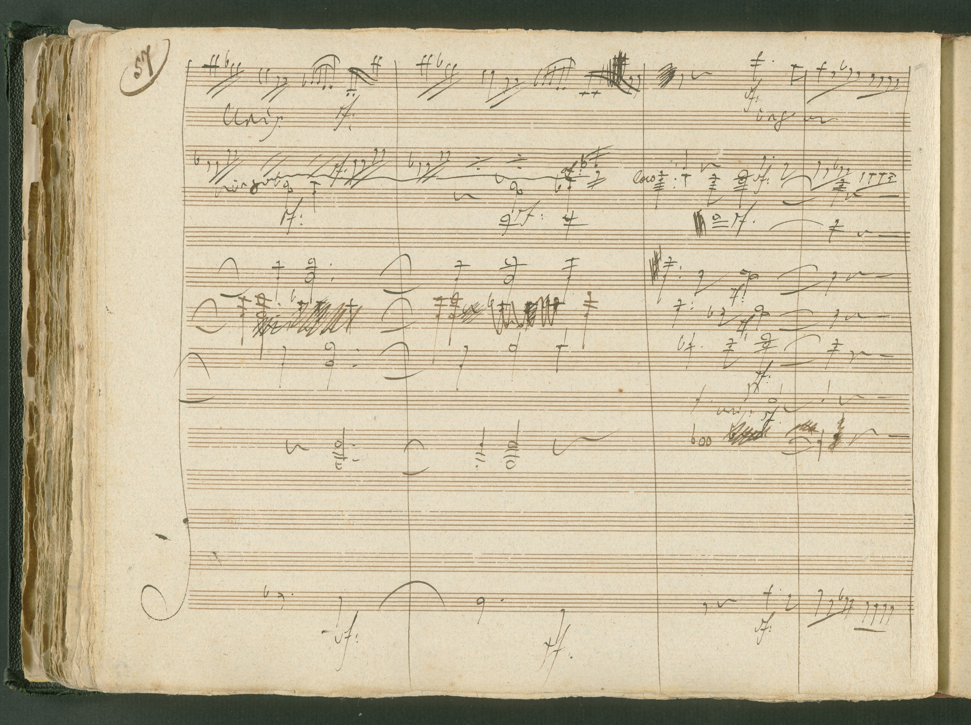Wir sehen hier den unbestreitbar größten Schatz des Beethoven-Archivs: das vollständige Autograph der 6. Sinfonie op. 68, der "Pastorale". Es ist jedoch ein Irrtum zu glauben, dieses Autograph wäre der saubere Abschluß einer Entwicklung, an deren Ende ein fertiges, "ordentliches" Manuskript steht. Vielmehr lässt sich an diesem Autograph der Kompositionsprozeß verfolgen: unter dem abgeschlossenen Text sind mehrere Schichten sichtbar.