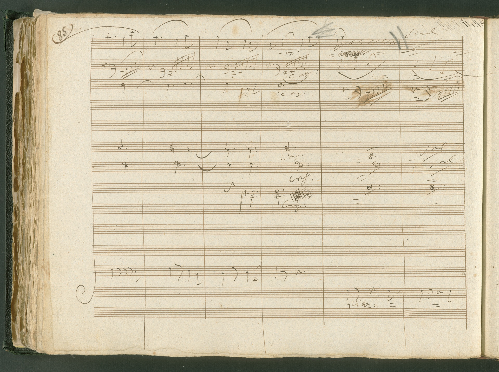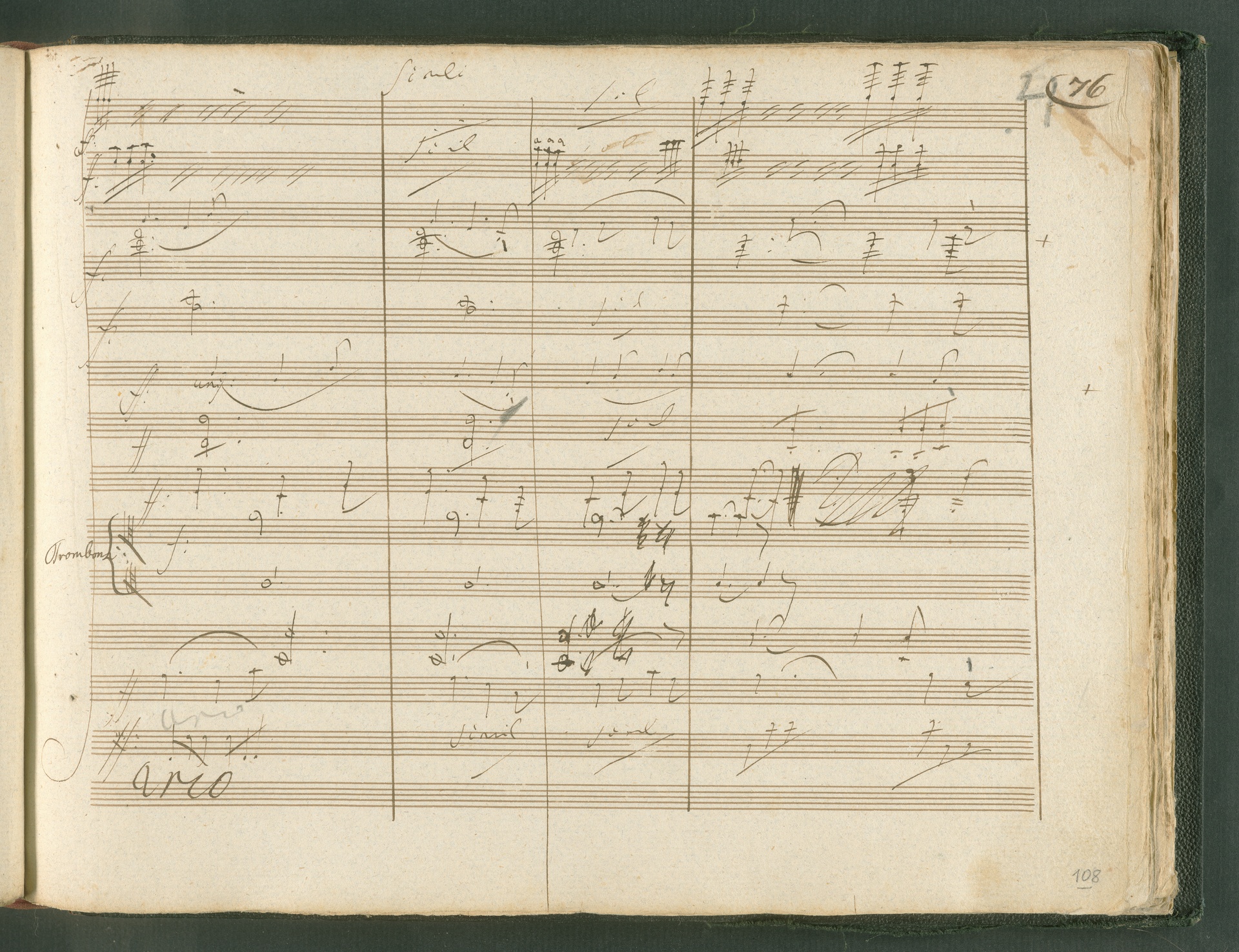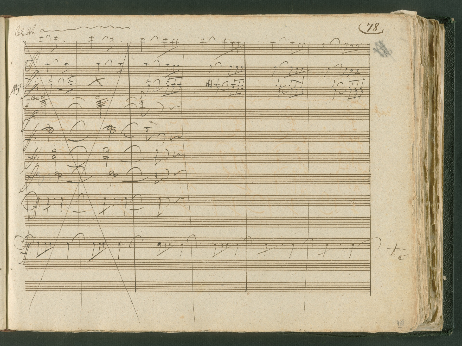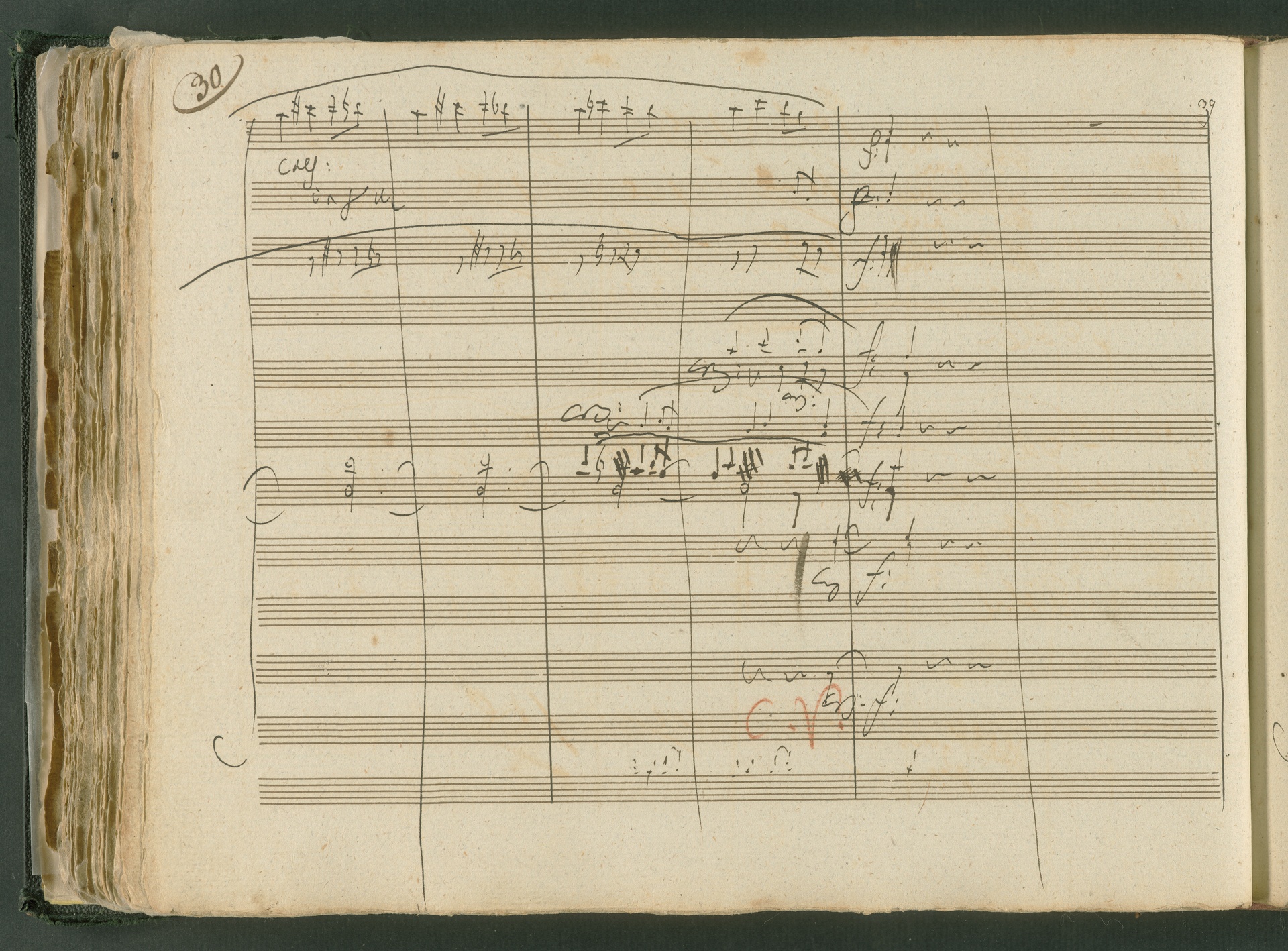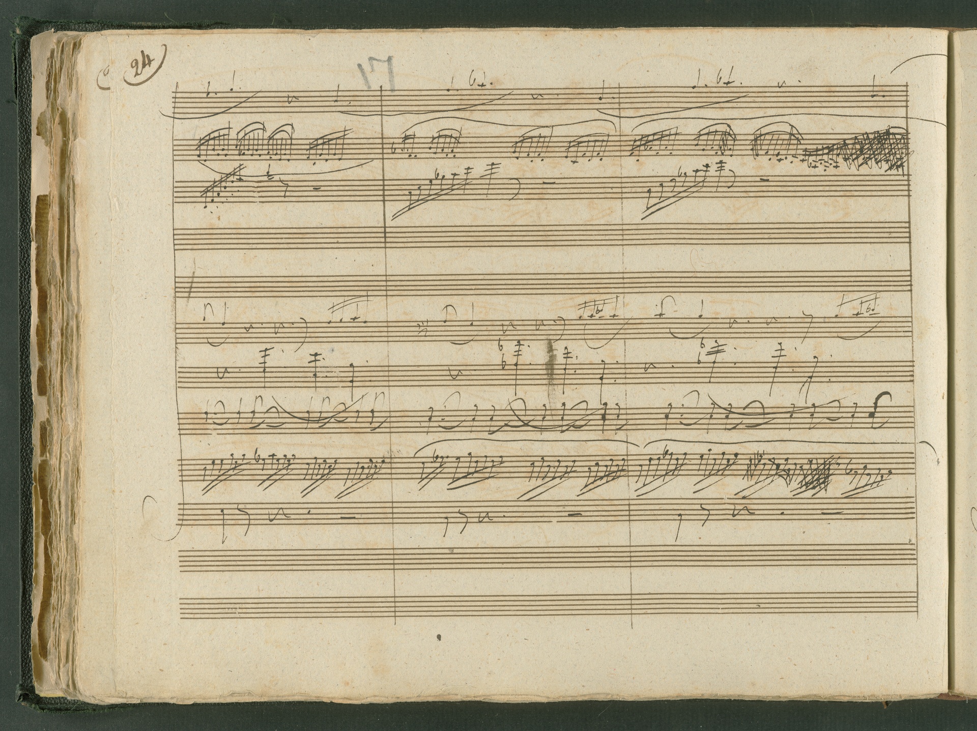 Wir sehen hier den unbestreitbar größten Schatz des Beethoven-Archivs: das vollständige Autograph der 6. Sinfonie op. 68, der "Pastorale". Es ist jedoch ein Irrtum zu glauben, dieses Autograph wäre der saubere Abschluß einer Entwicklung, an deren Ende ein fertiges, "ordentliches" Manuskript steht. Vielmehr lässt sich an diesem Autograph der Kompositionsprozeß verfolgen: unter dem abgeschlossenen Text sind mehrere Schichten sichtbar.
