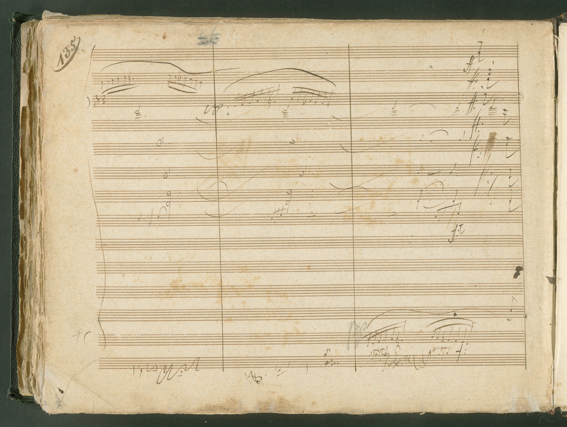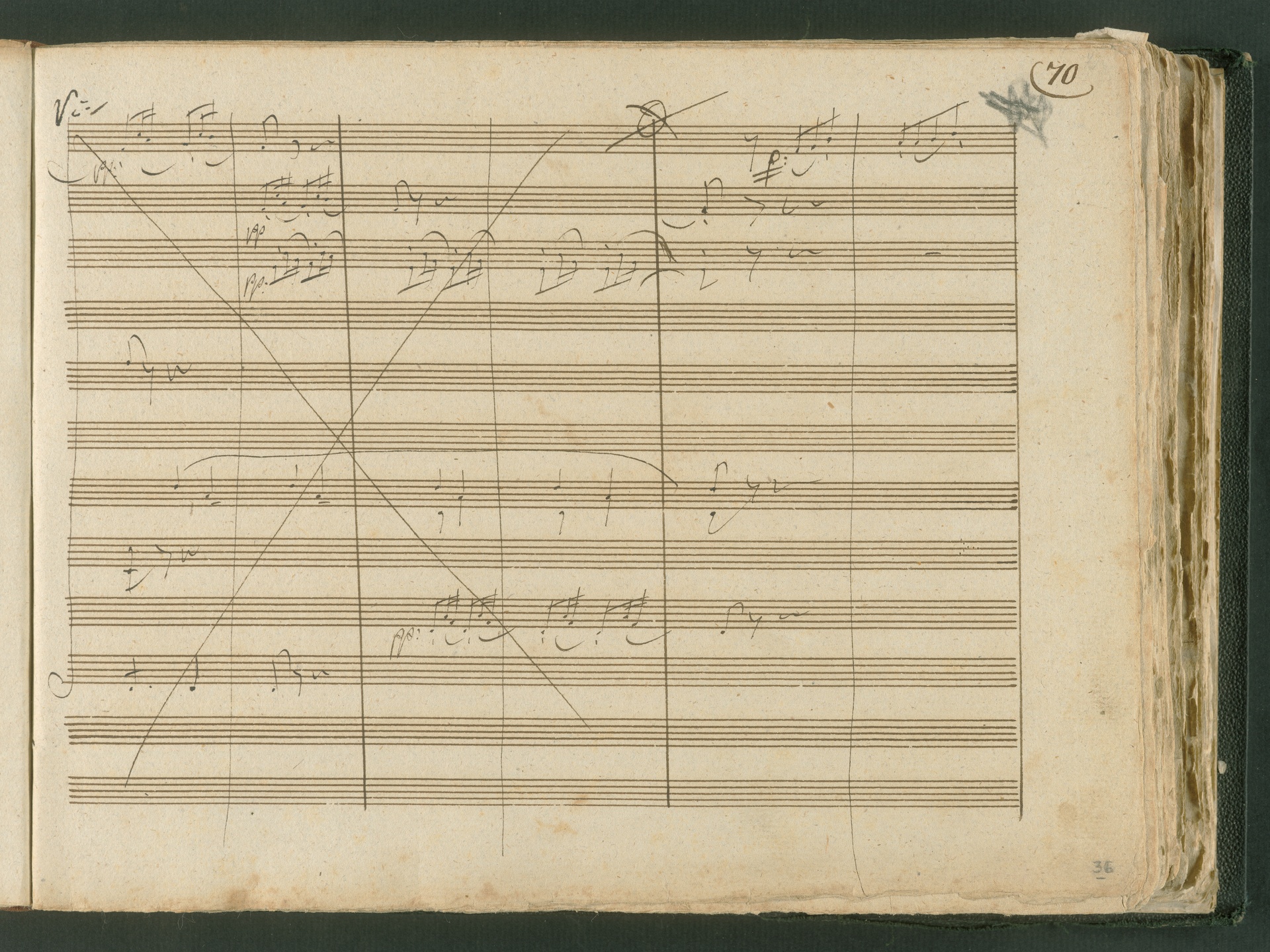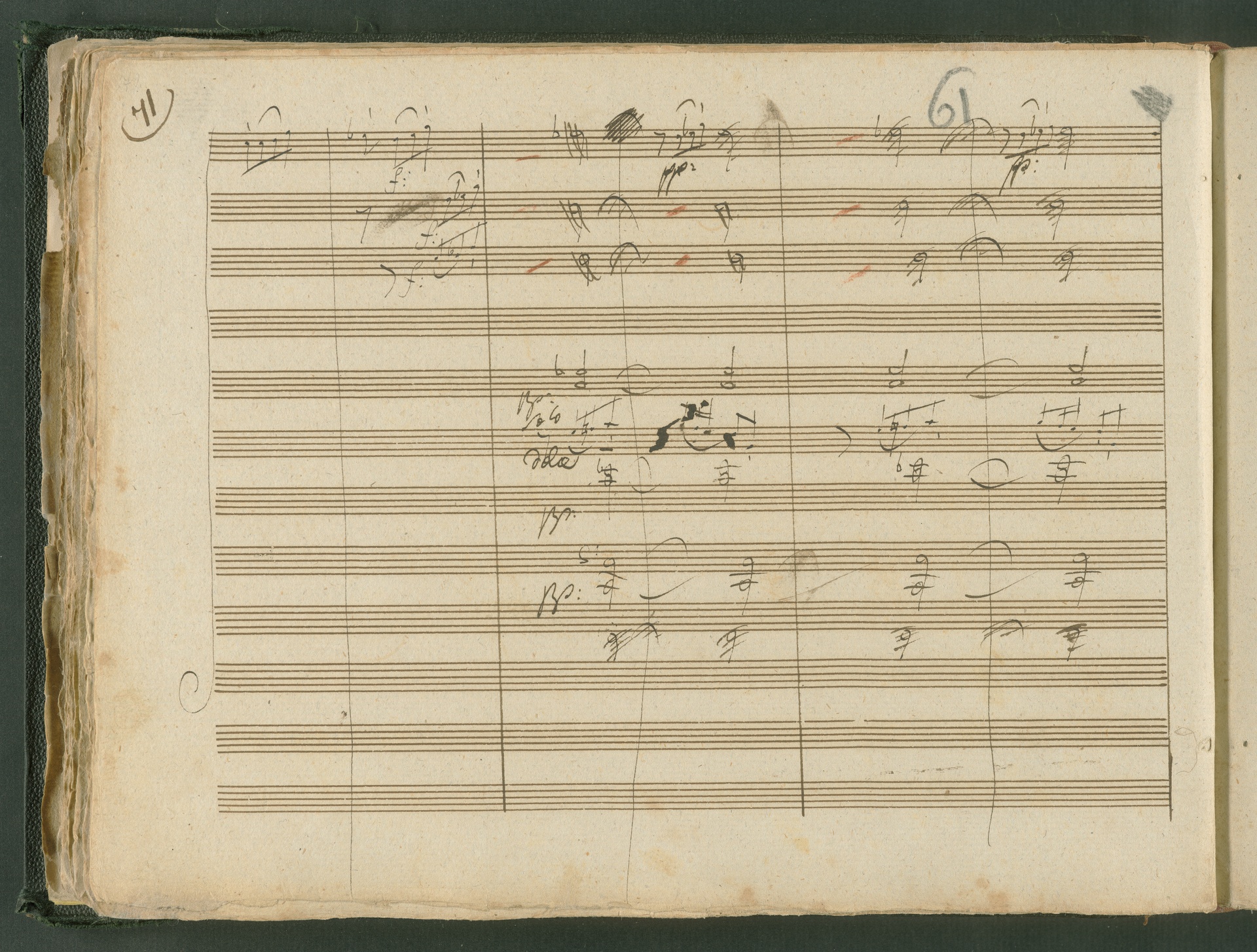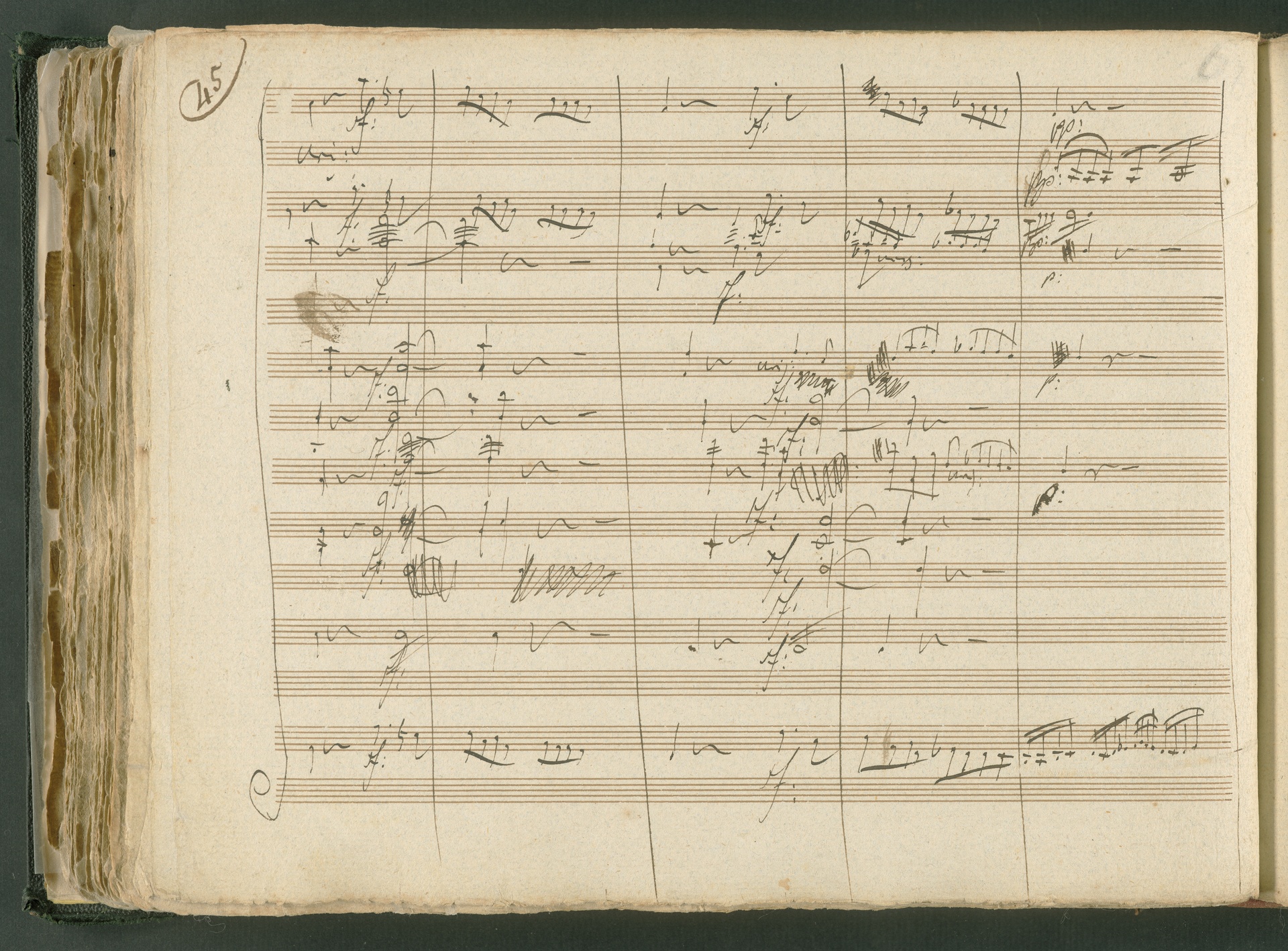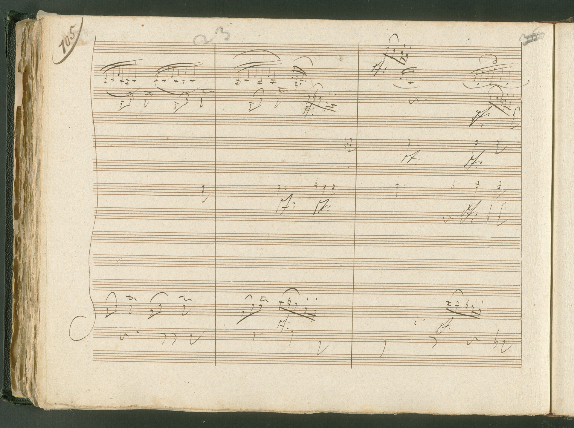 Wir sehen hier den unbestreitbar größten Schatz des Beethoven-Archivs: das vollständige Autograph der 6. Sinfonie op. 68, der "Pastorale". Es ist jedoch ein Irrtum zu glauben, dieses Autograph wäre der saubere Abschluß einer Entwicklung, an deren Ende ein fertiges, "ordentliches" Manuskript steht. Vielmehr lässt sich an diesem Autograph der Kompositionsprozeß verfolgen: unter dem abgeschlossenen Text sind mehrere Schichten sichtbar.