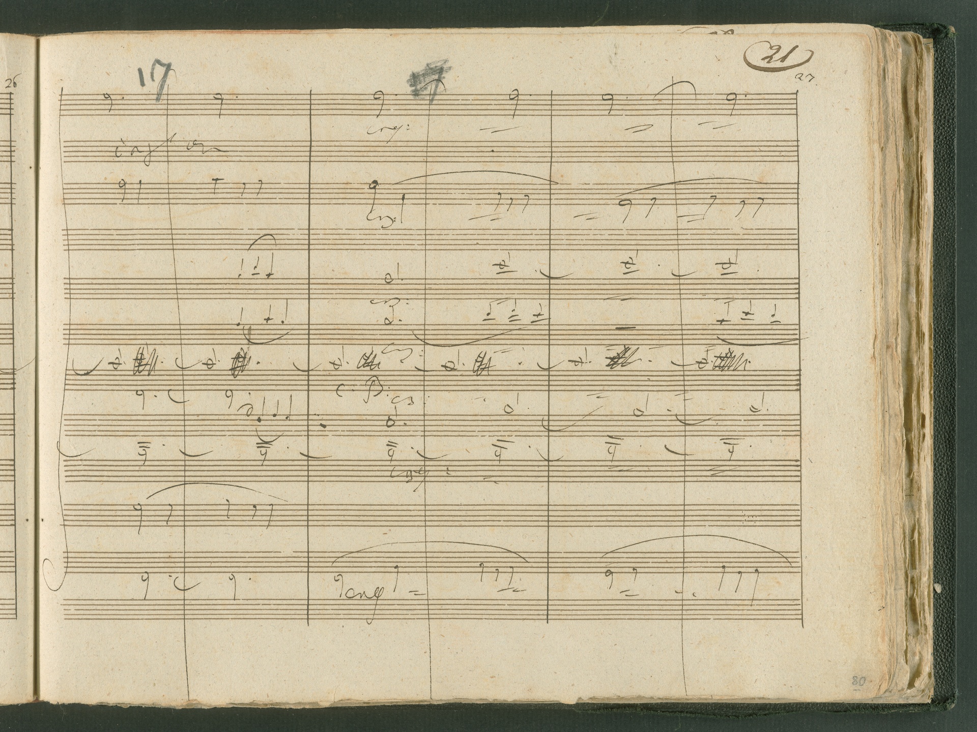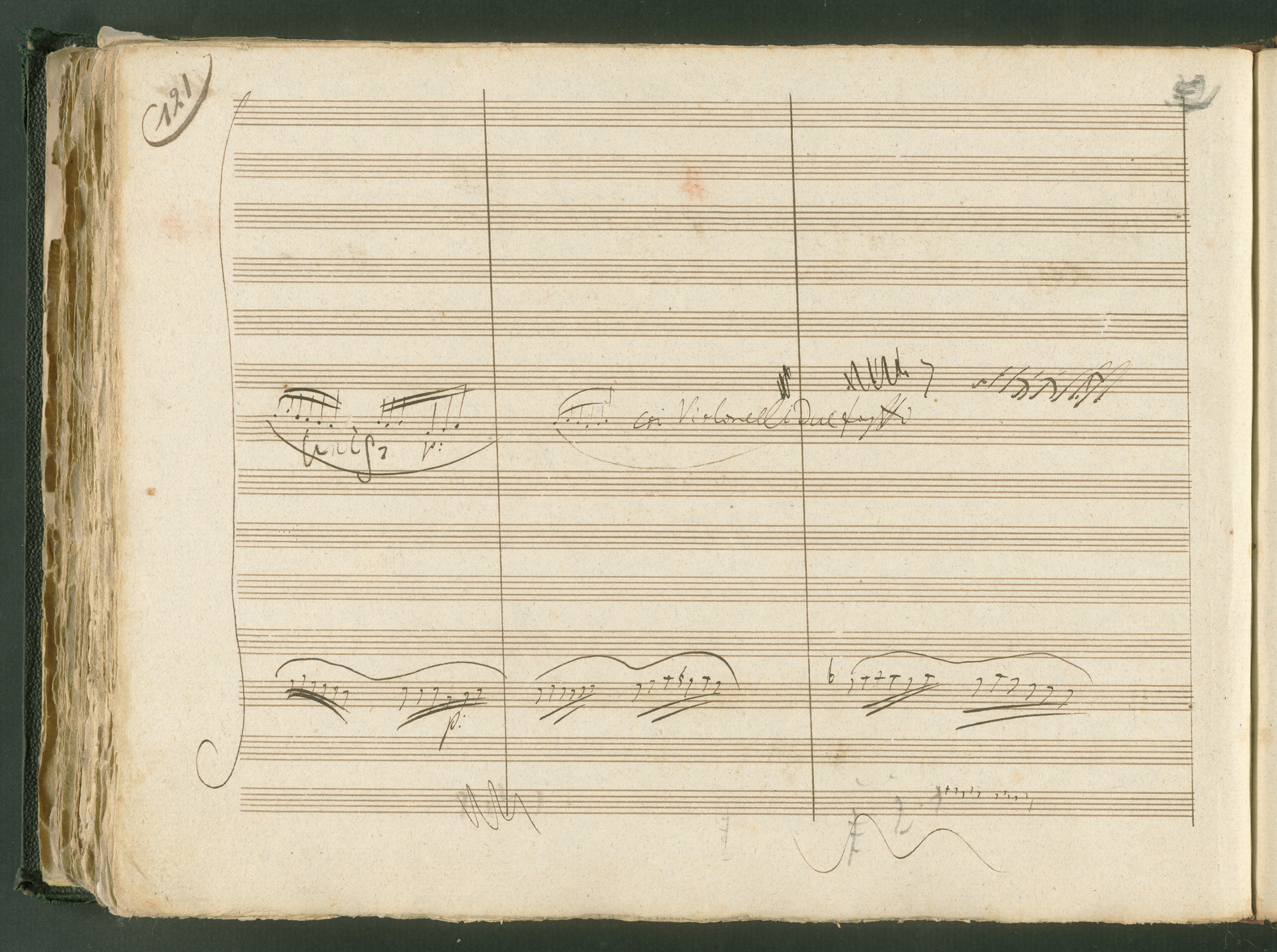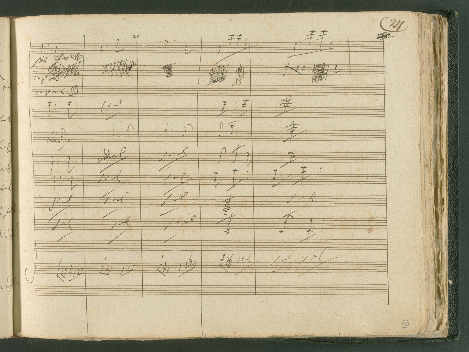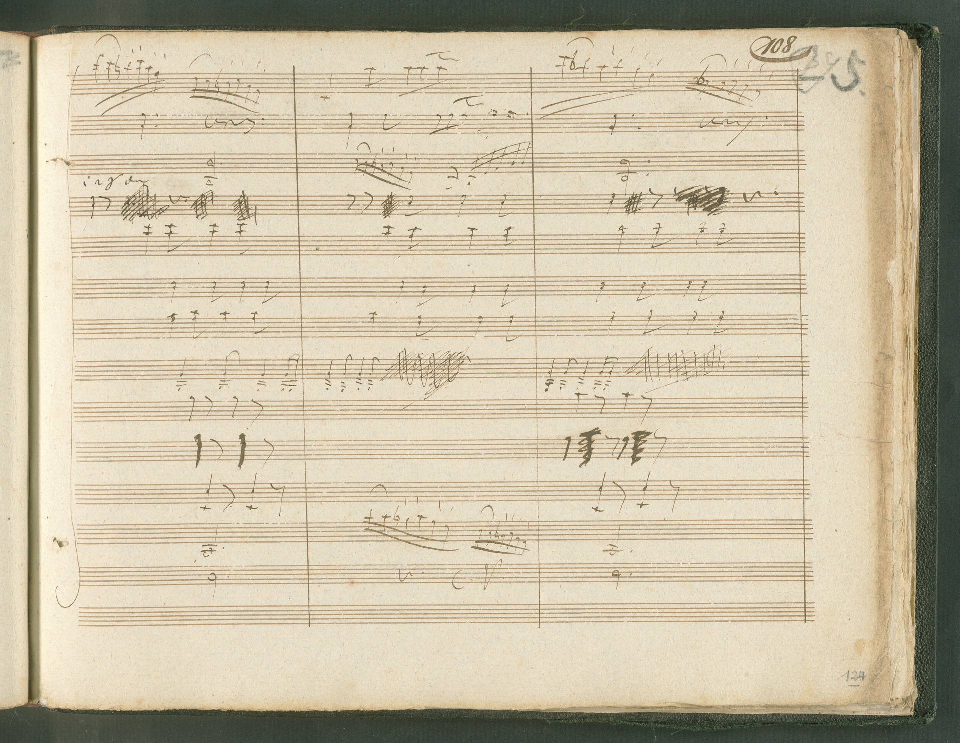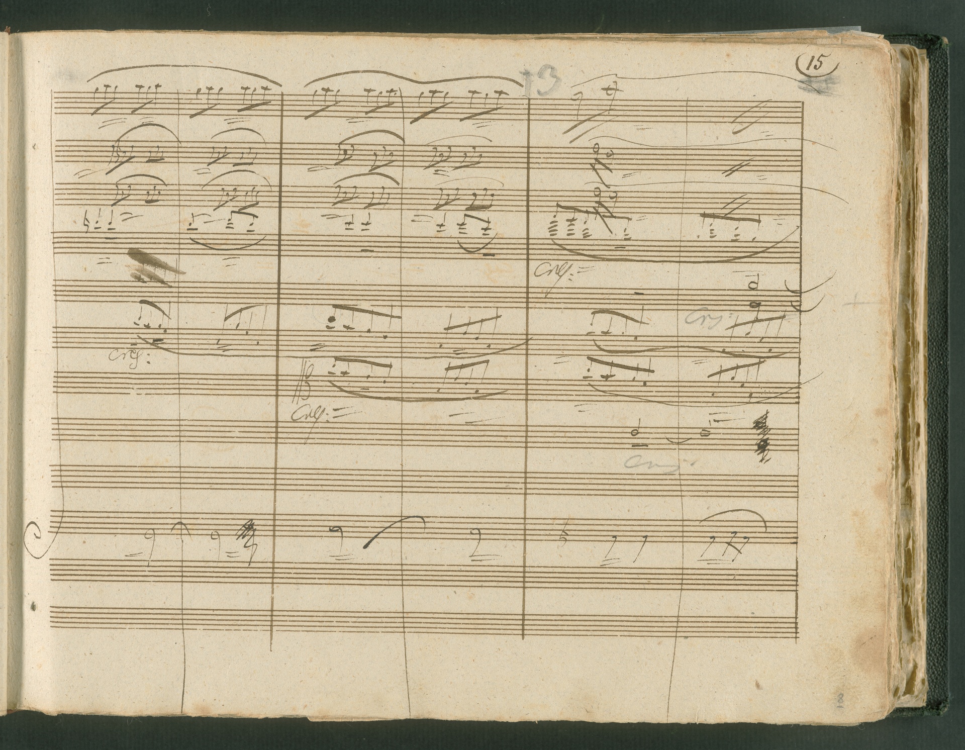 Wir sehen hier den unbestreitbar größten Schatz des Beethoven-Archivs: das vollständige Autograph der 6. Sinfonie op. 68, der "Pastorale". Es ist jedoch ein Irrtum zu glauben, dieses Autograph wäre der saubere Abschluß einer Entwicklung, an deren Ende ein fertiges, "ordentliches" Manuskript steht. Vielmehr lässt sich an diesem Autograph der Kompositionsprozeß verfolgen: unter dem abgeschlossenen Text sind mehrere Schichten sichtbar.