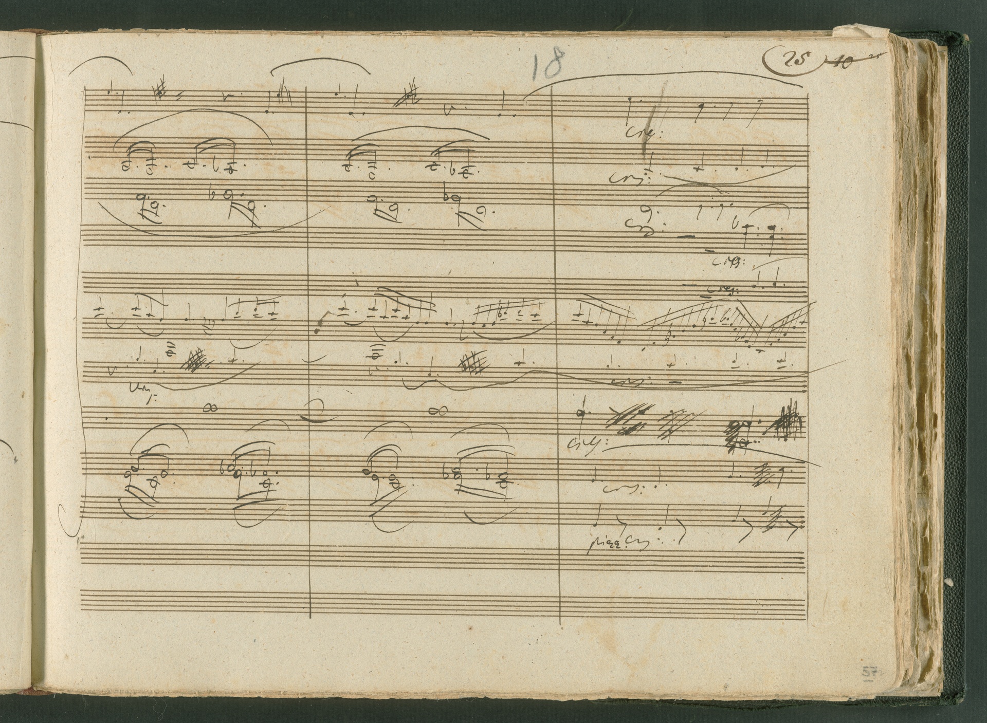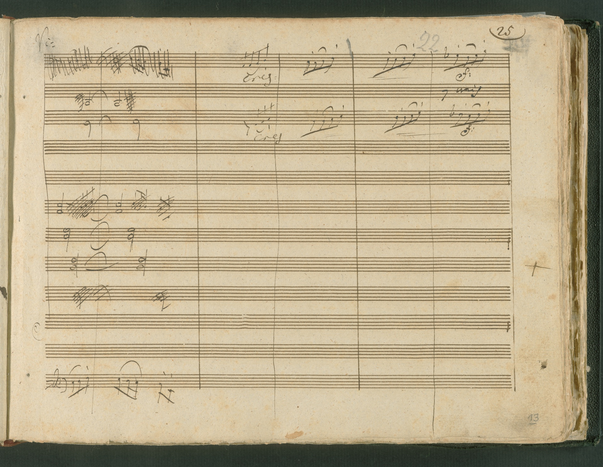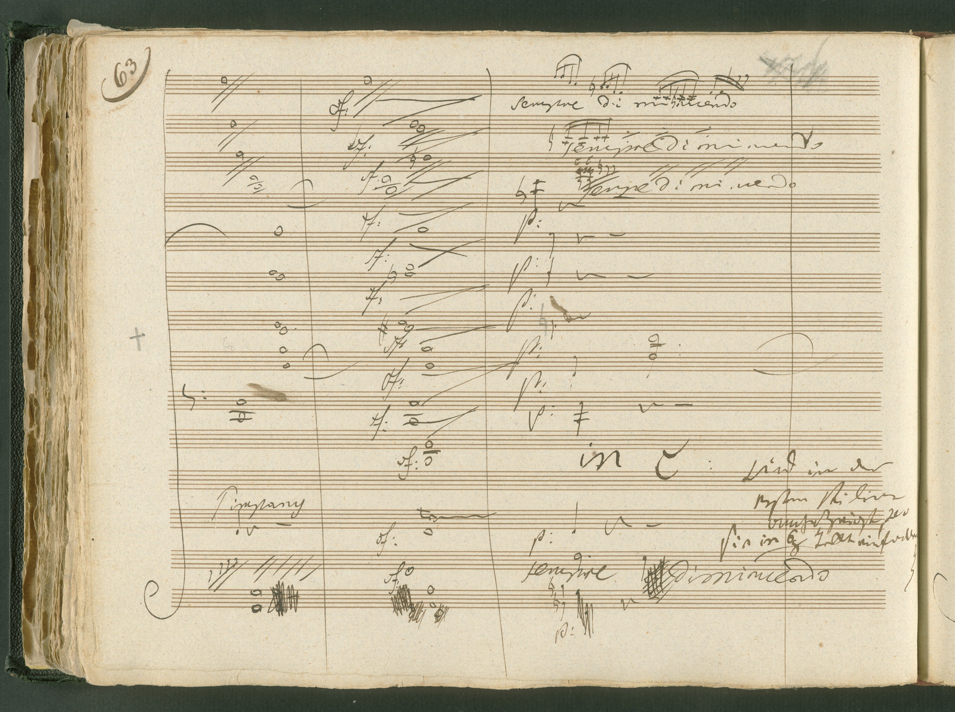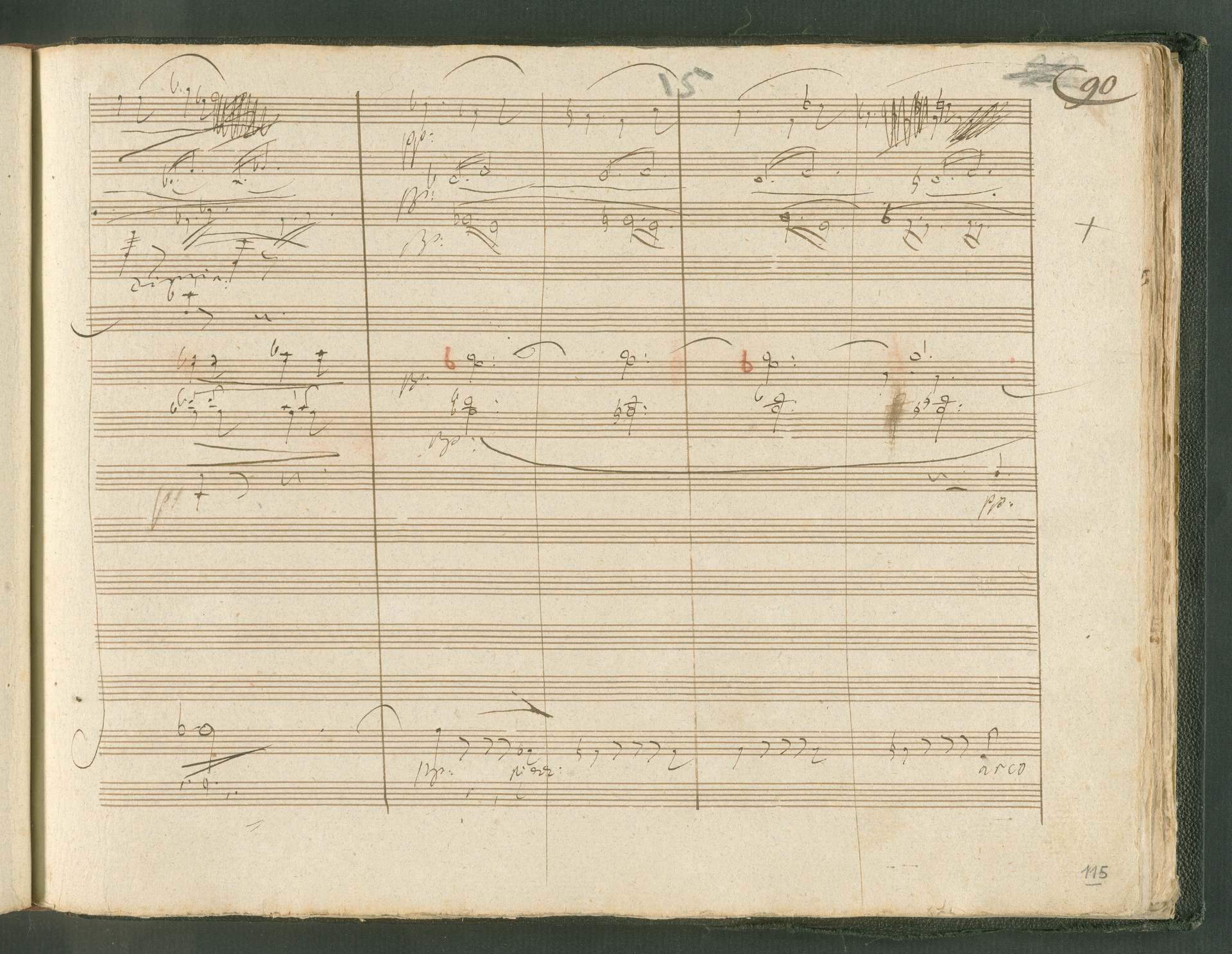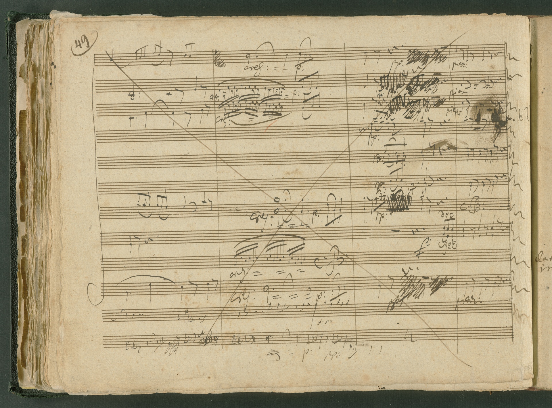 Wir sehen hier den unbestreitbar größten Schatz des Beethoven-Archivs: das vollständige Autograph der 6. Sinfonie op. 68, der "Pastorale". Es ist jedoch ein Irrtum zu glauben, dieses Autograph wäre der saubere Abschluß einer Entwicklung, an deren Ende ein fertiges, "ordentliches" Manuskript steht. Vielmehr lässt sich an diesem Autograph der Kompositionsprozeß verfolgen: unter dem abgeschlossenen Text sind mehrere Schichten sichtbar.