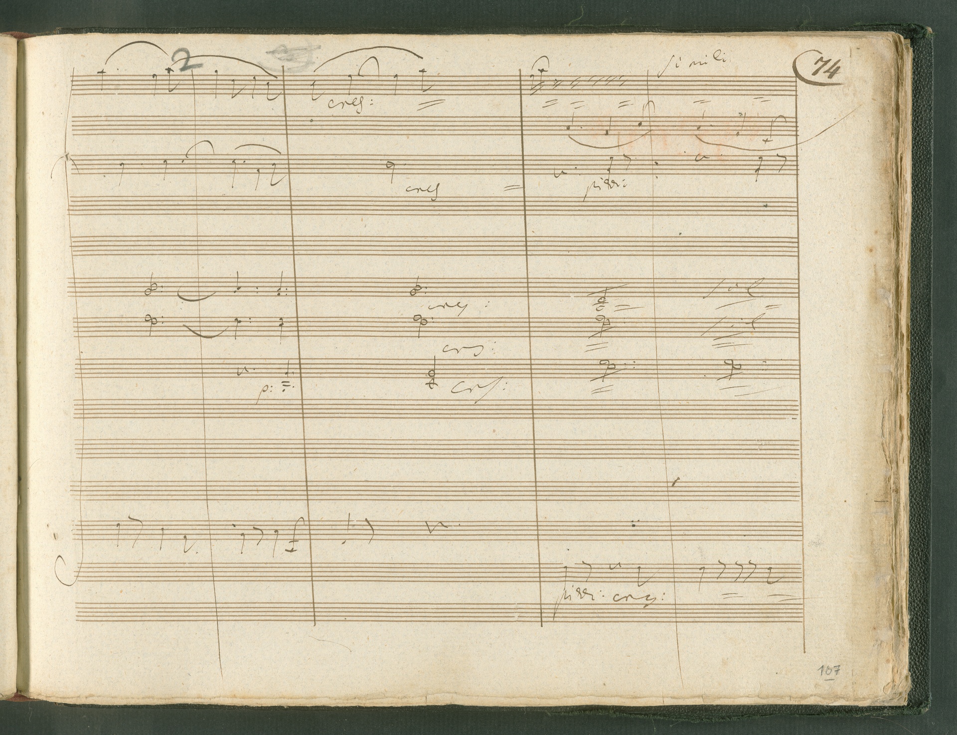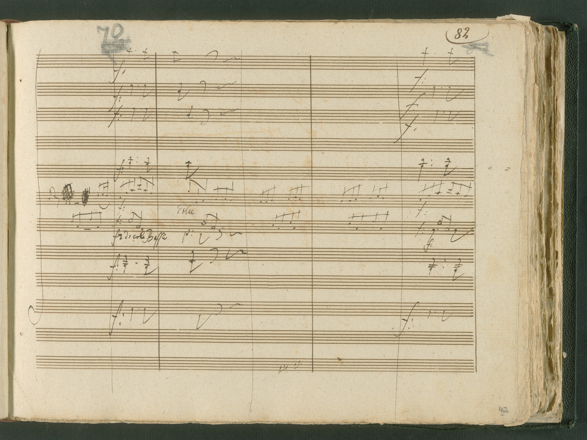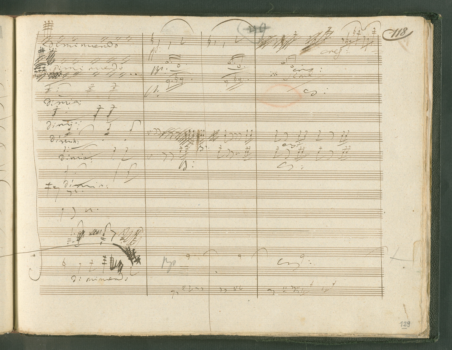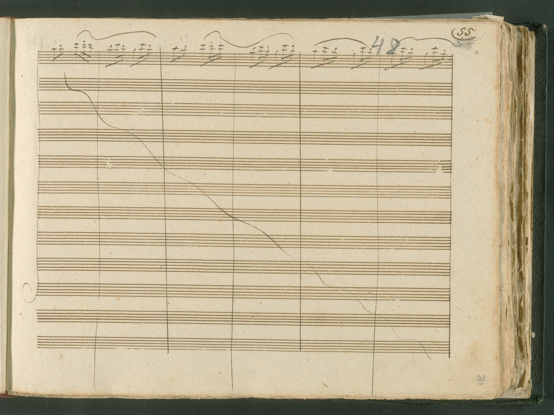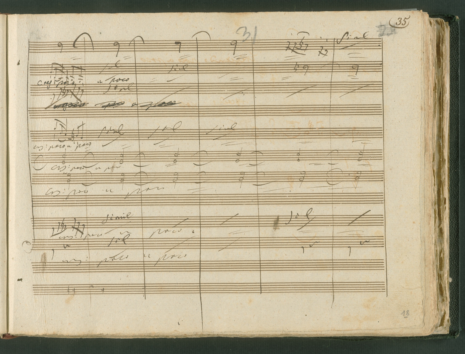 Wir sehen hier den unbestreitbar größten Schatz des Beethoven-Archivs: das vollständige Autograph der 6. Sinfonie op. 68, der "Pastorale". Es ist jedoch ein Irrtum zu glauben, dieses Autograph wäre der saubere Abschluß einer Entwicklung, an deren Ende ein fertiges, "ordentliches" Manuskript steht. Vielmehr lässt sich an diesem Autograph der Kompositionsprozeß verfolgen: unter dem abgeschlossenen Text sind mehrere Schichten sichtbar.