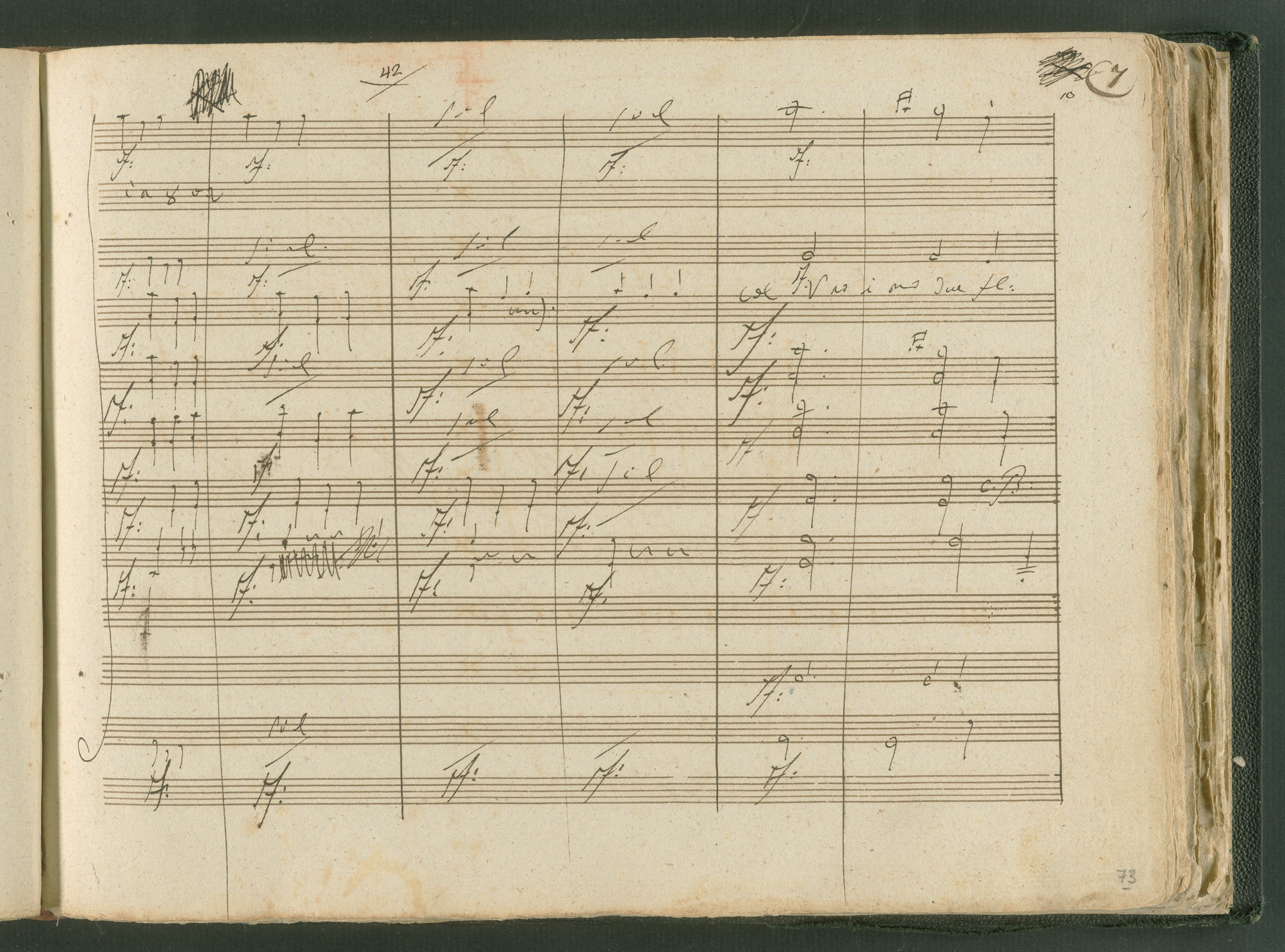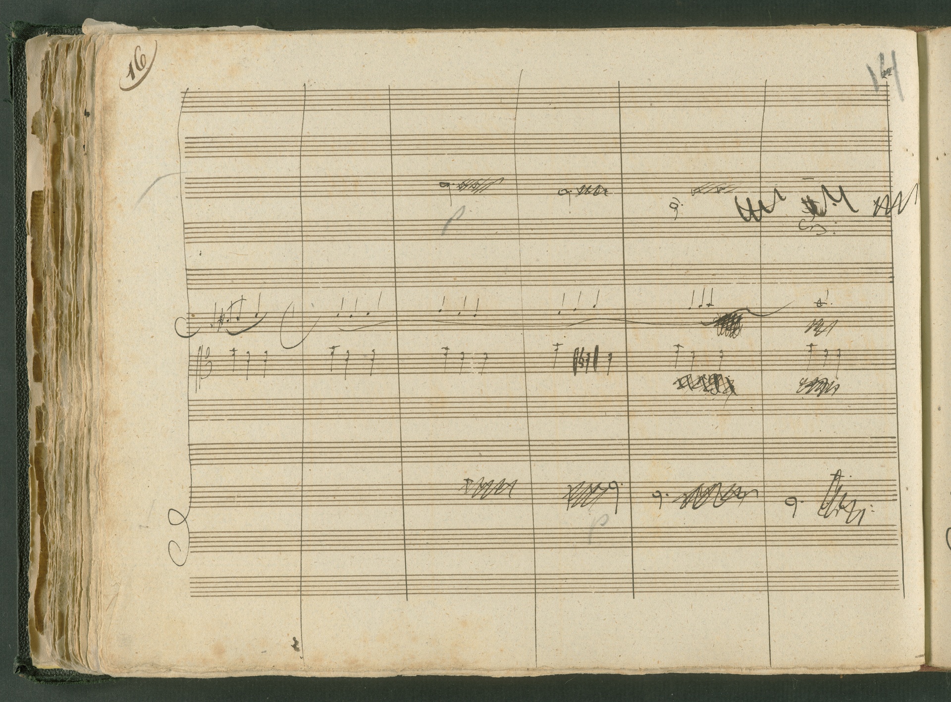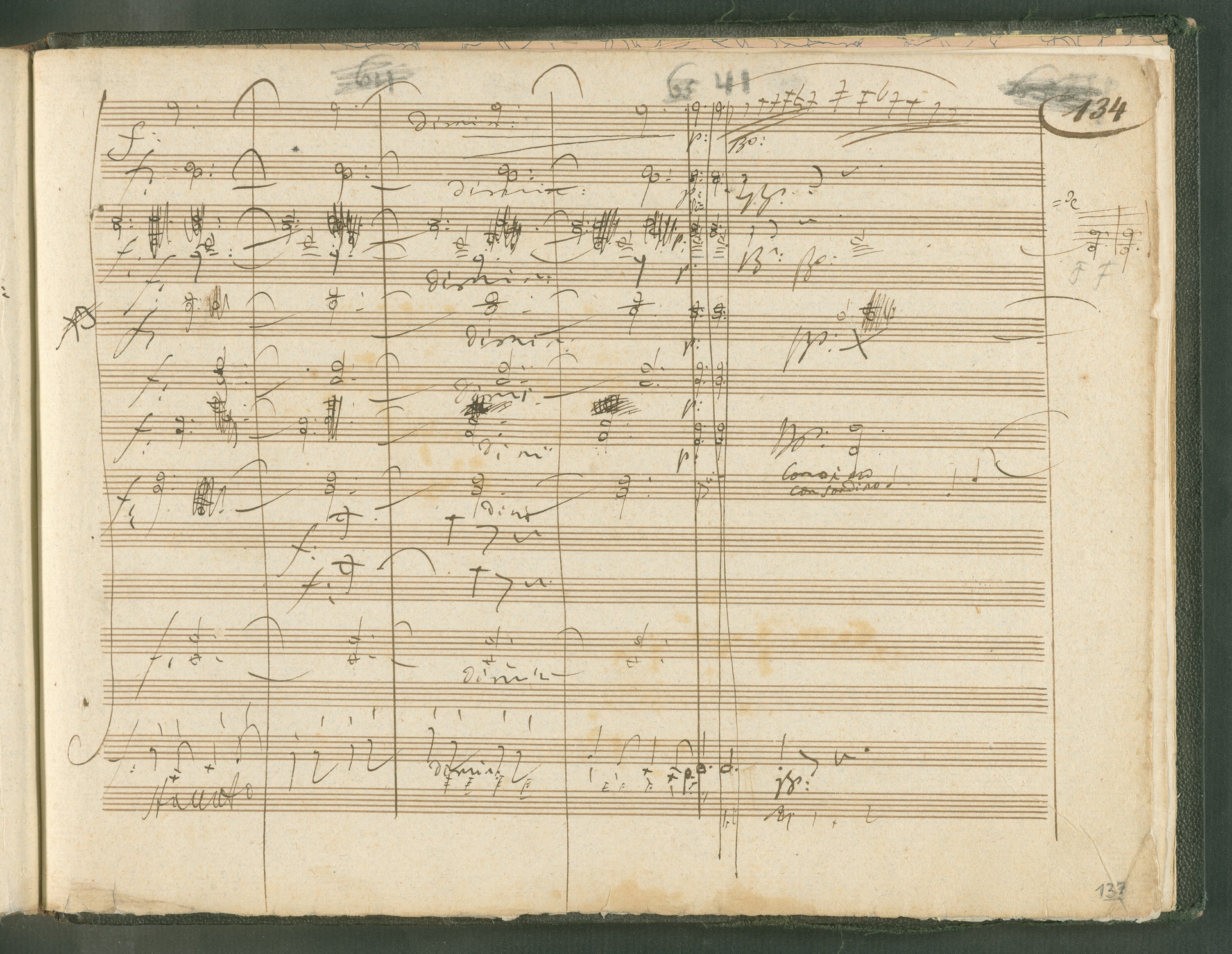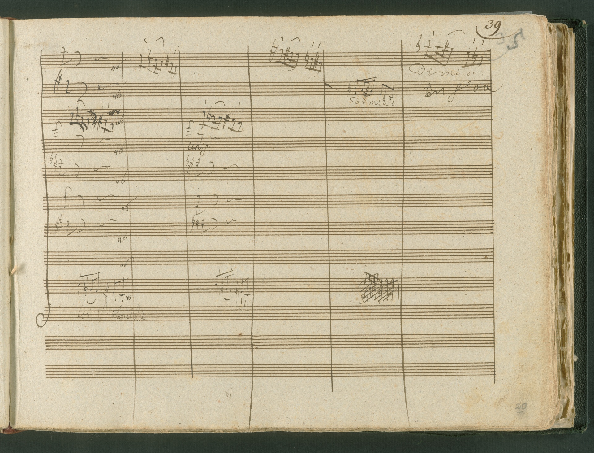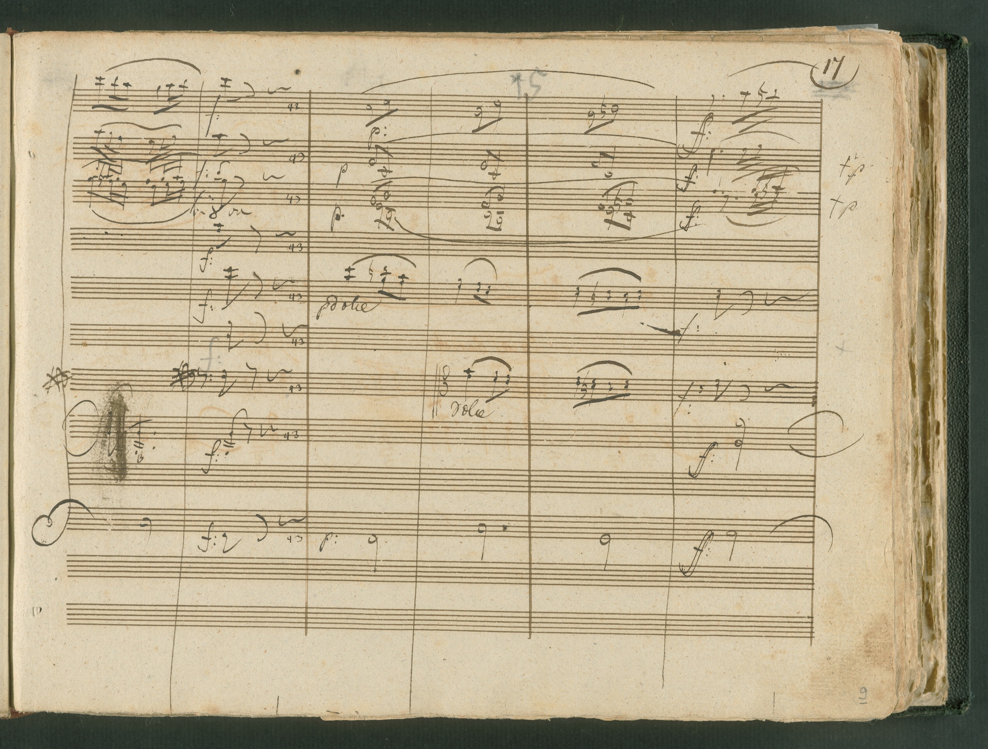 Wir sehen hier den unbestreitbar größten Schatz des Beethoven-Archivs: das vollständige Autograph der 6. Sinfonie op. 68, der "Pastorale". Es ist jedoch ein Irrtum zu glauben, dieses Autograph wäre der saubere Abschluß einer Entwicklung, an deren Ende ein fertiges, "ordentliches" Manuskript steht. Vielmehr lässt sich an diesem Autograph der Kompositionsprozeß verfolgen: unter dem abgeschlossenen Text sind mehrere Schichten sichtbar.