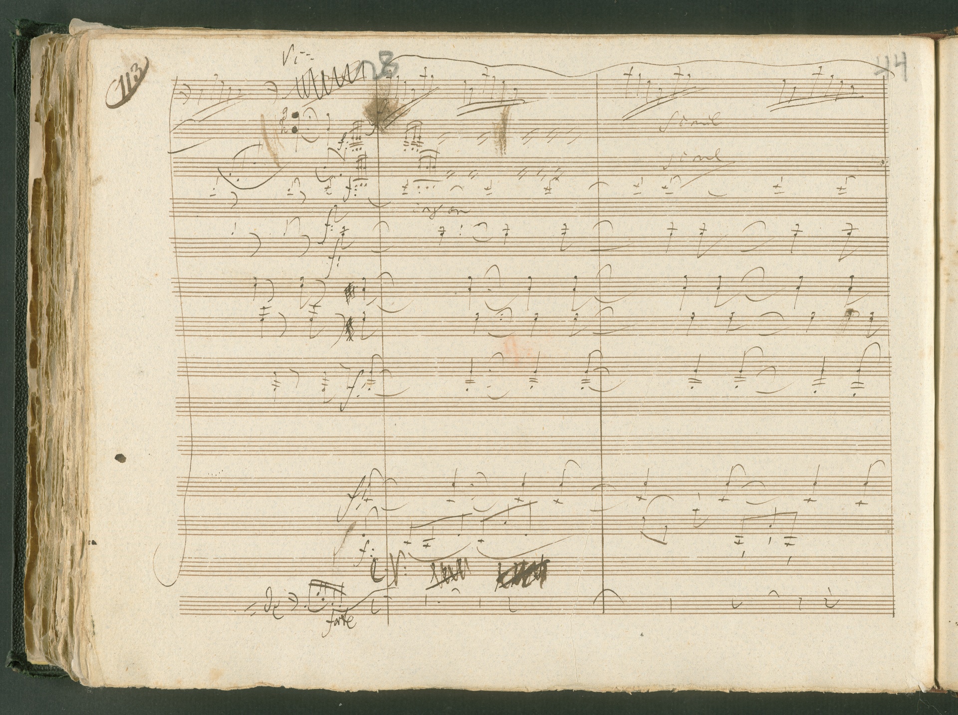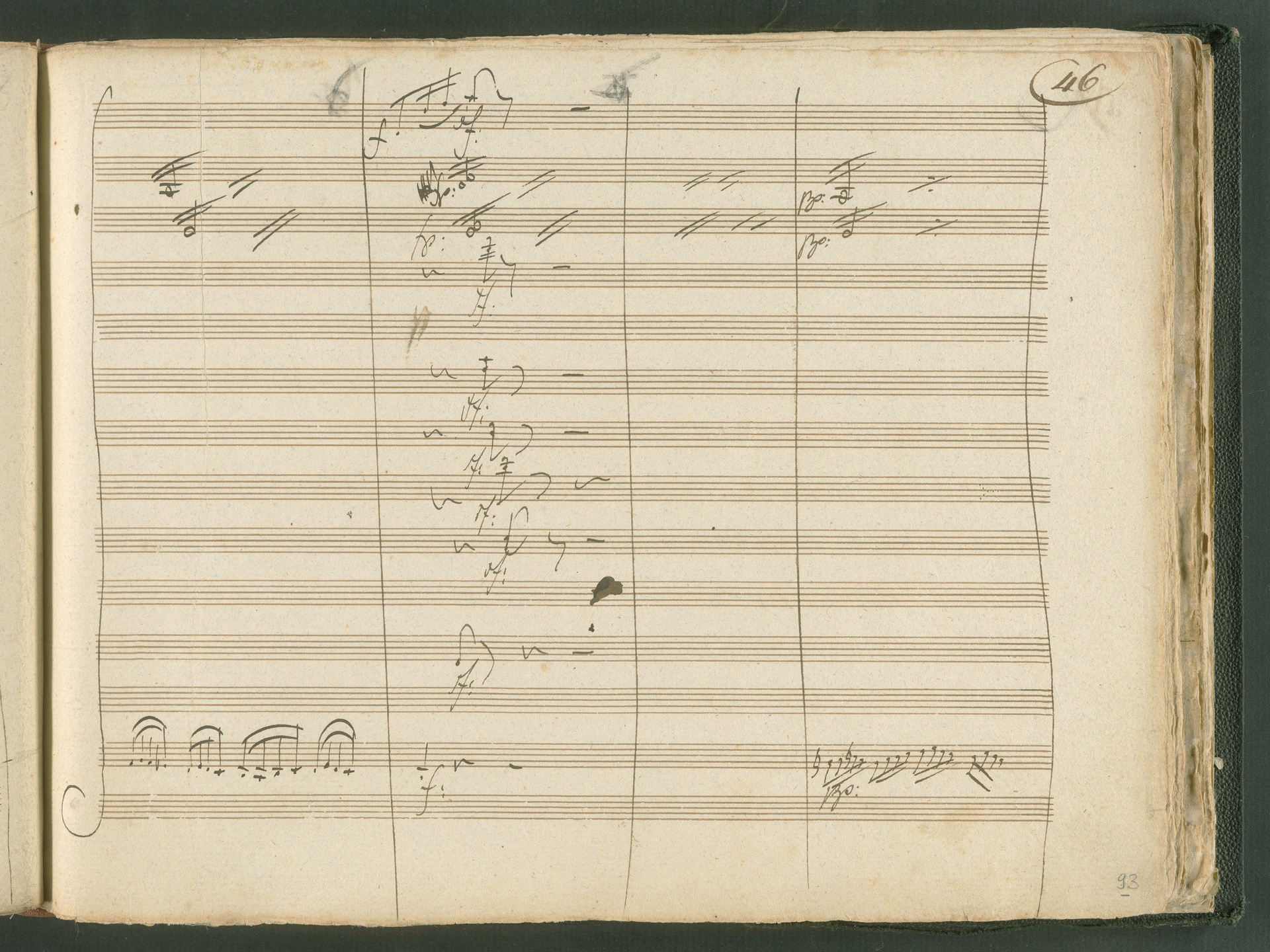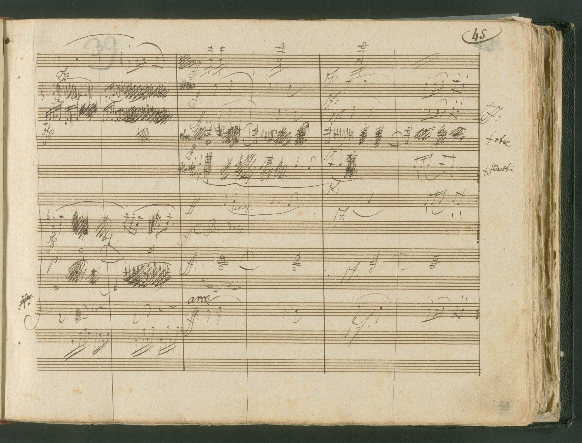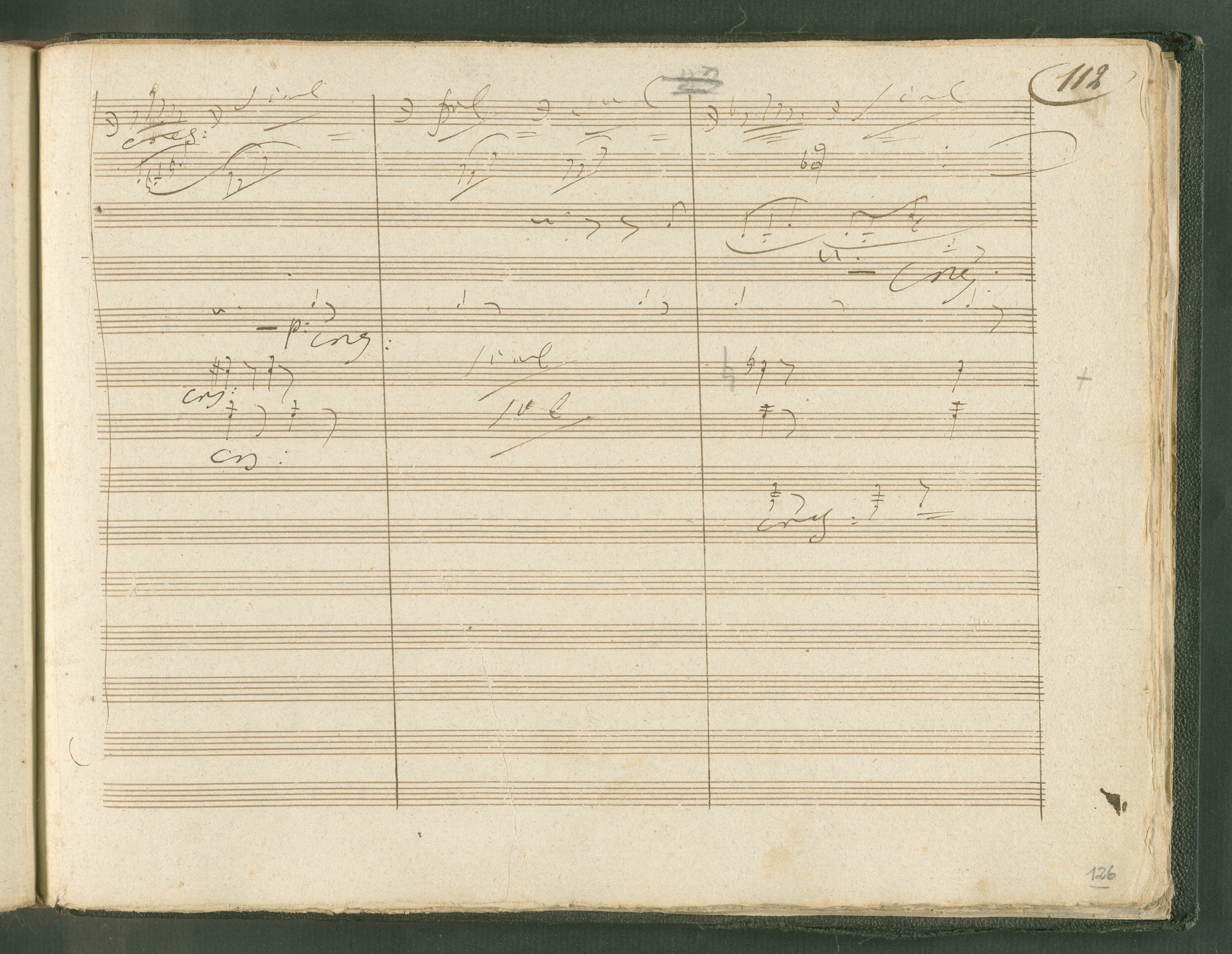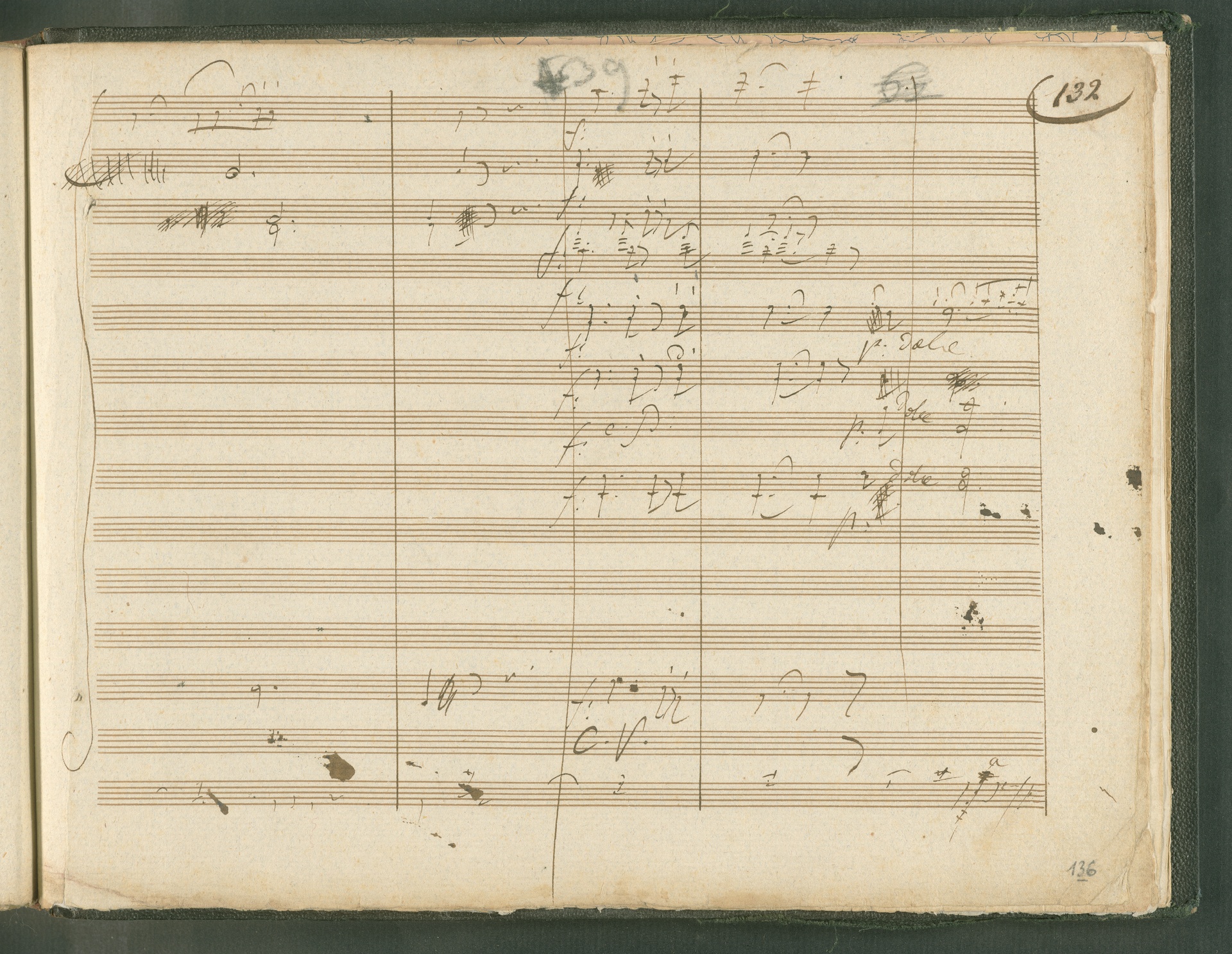 Wir sehen hier den unbestreitbar größten Schatz des Beethoven-Archivs: das vollständige Autograph der 6. Sinfonie op. 68, der "Pastorale". Es ist jedoch ein Irrtum zu glauben, dieses Autograph wäre der saubere Abschluß einer Entwicklung, an deren Ende ein fertiges, "ordentliches" Manuskript steht. Vielmehr lässt sich an diesem Autograph der Kompositionsprozeß verfolgen: unter dem abgeschlossenen Text sind mehrere Schichten sichtbar.