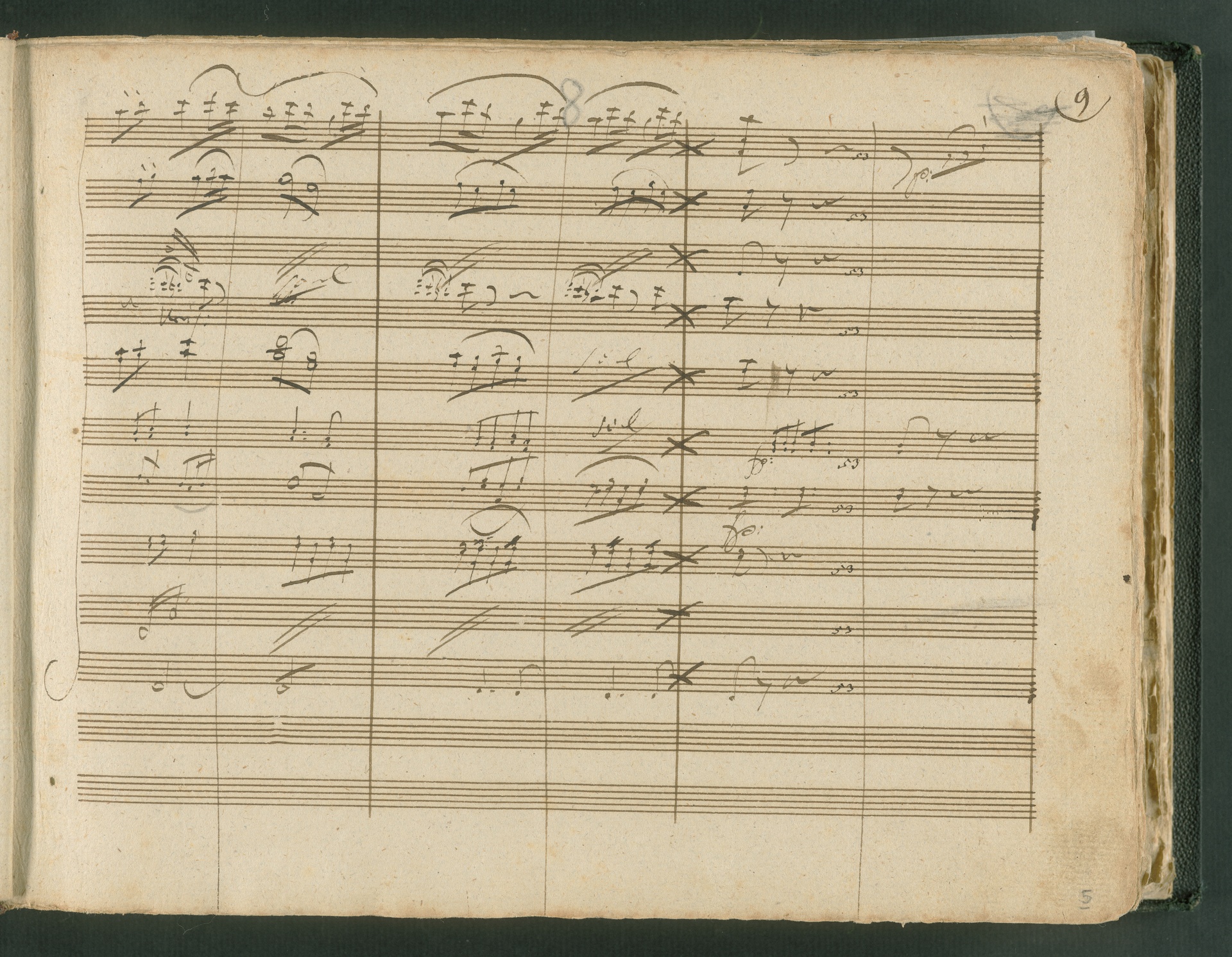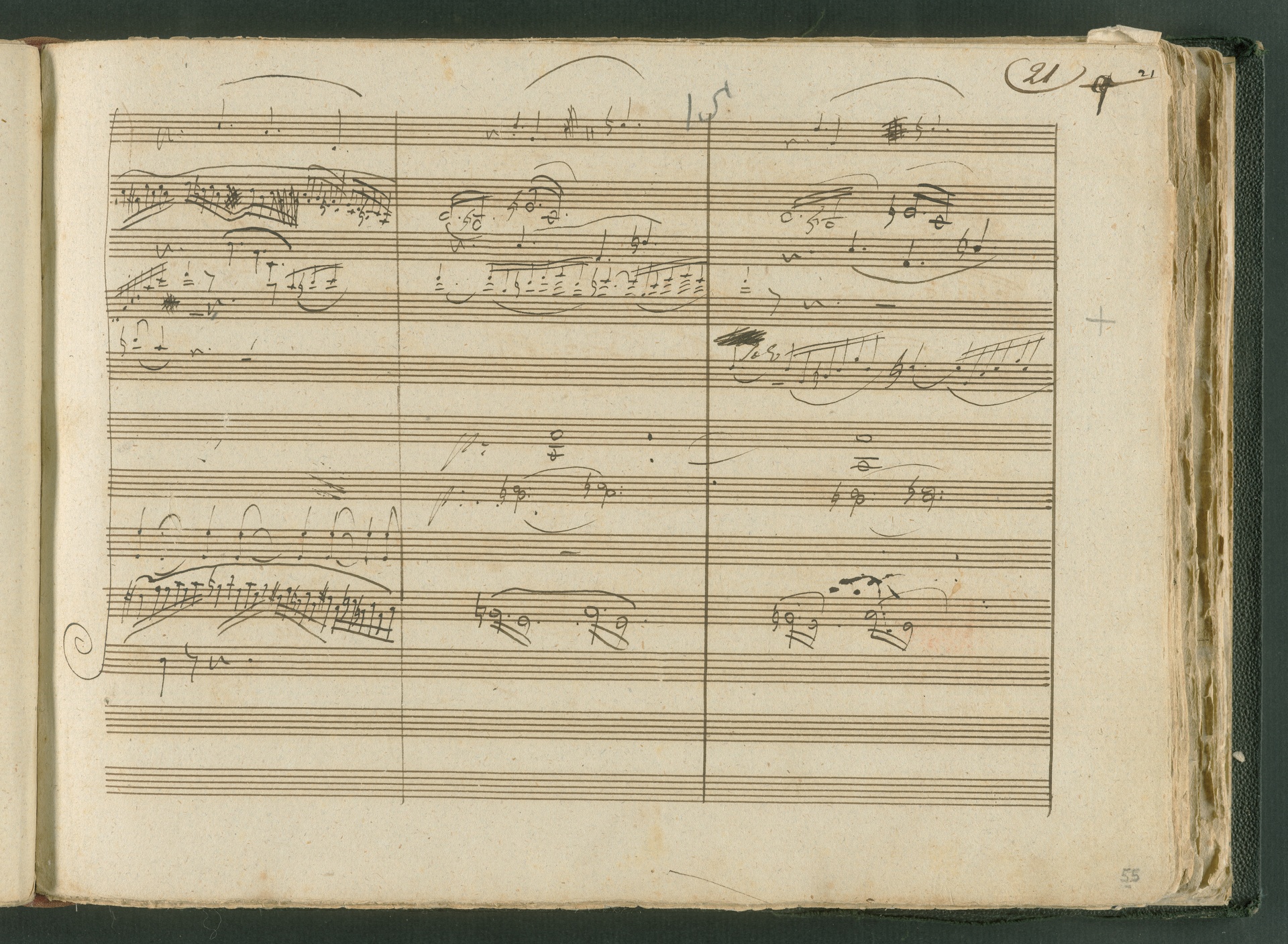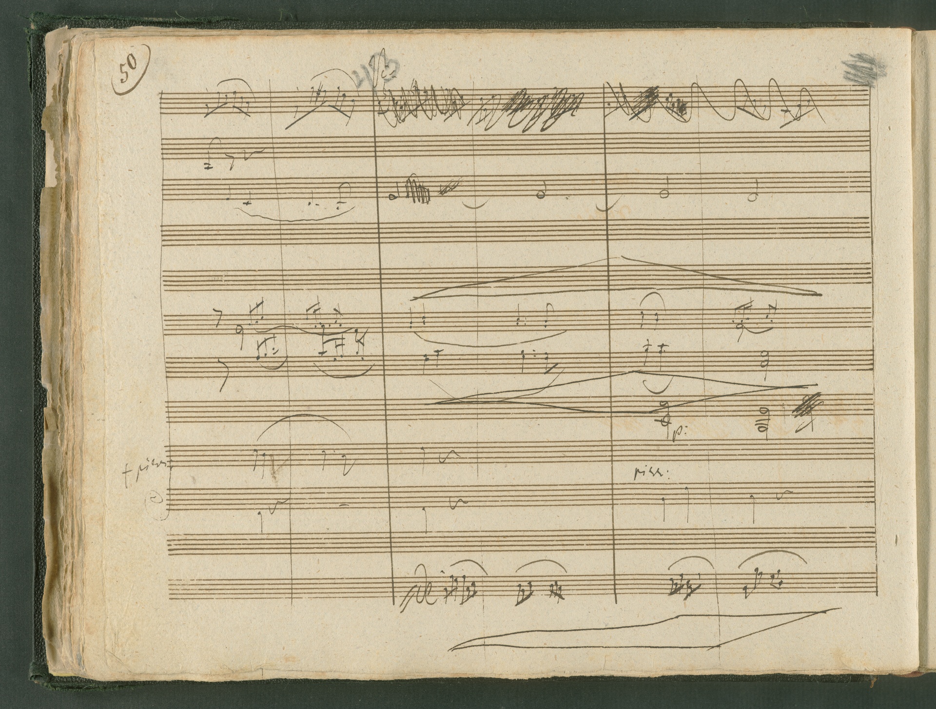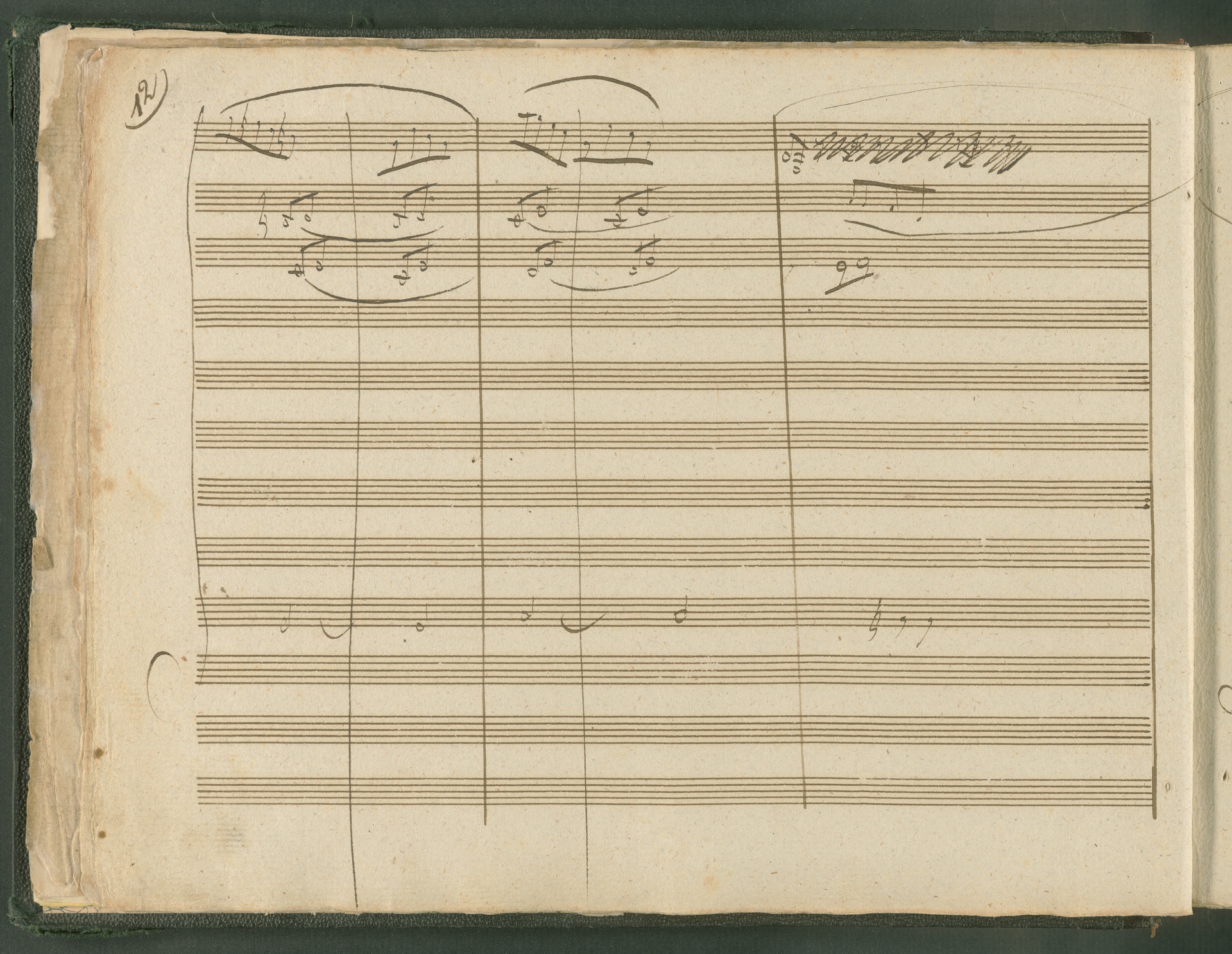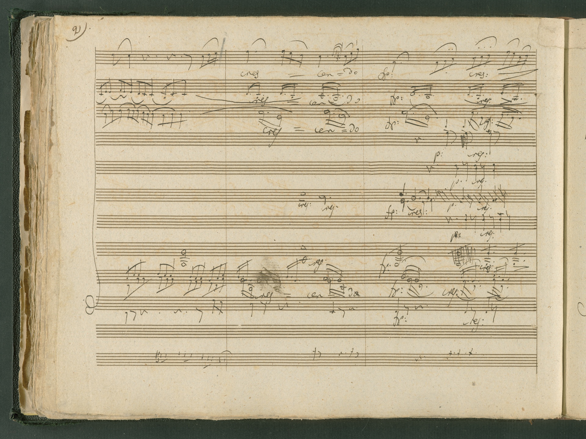 Wir sehen hier den unbestreitbar größten Schatz des Beethoven-Archivs: das vollständige Autograph der 6. Sinfonie op. 68, der "Pastorale". Es ist jedoch ein Irrtum zu glauben, dieses Autograph wäre der saubere Abschluß einer Entwicklung, an deren Ende ein fertiges, "ordentliches" Manuskript steht. Vielmehr lässt sich an diesem Autograph der Kompositionsprozeß verfolgen: unter dem abgeschlossenen Text sind mehrere Schichten sichtbar.