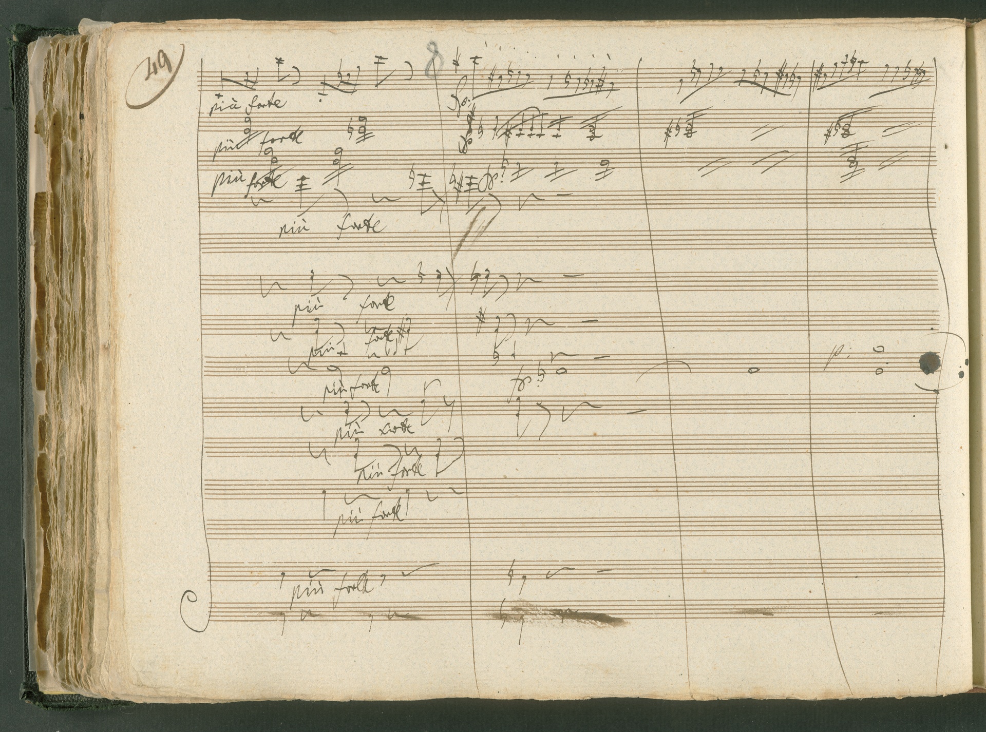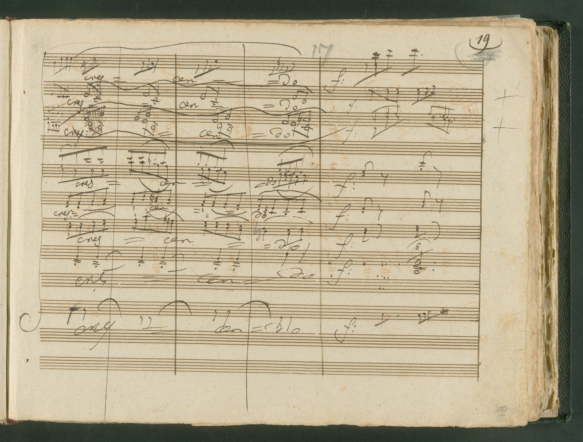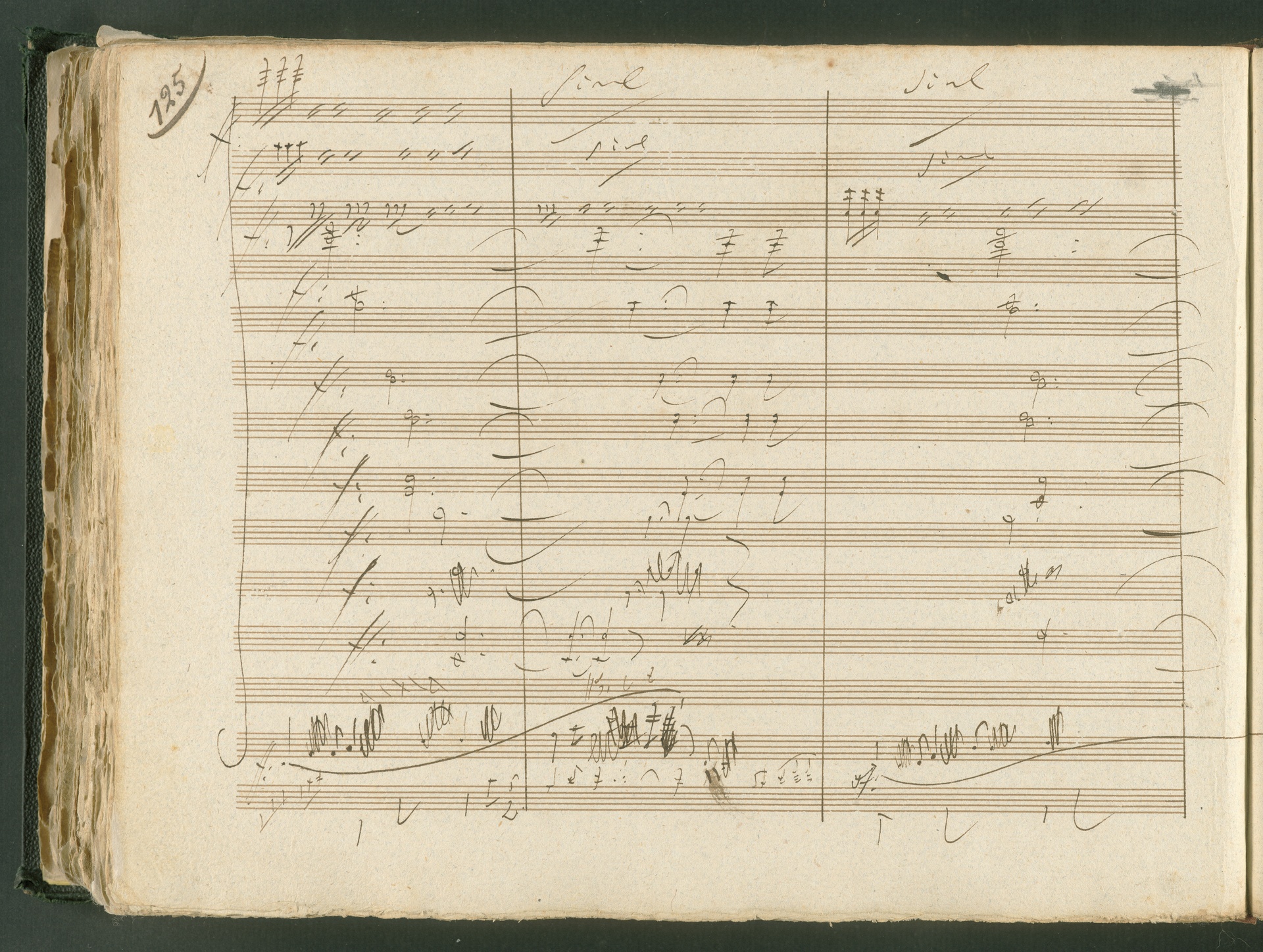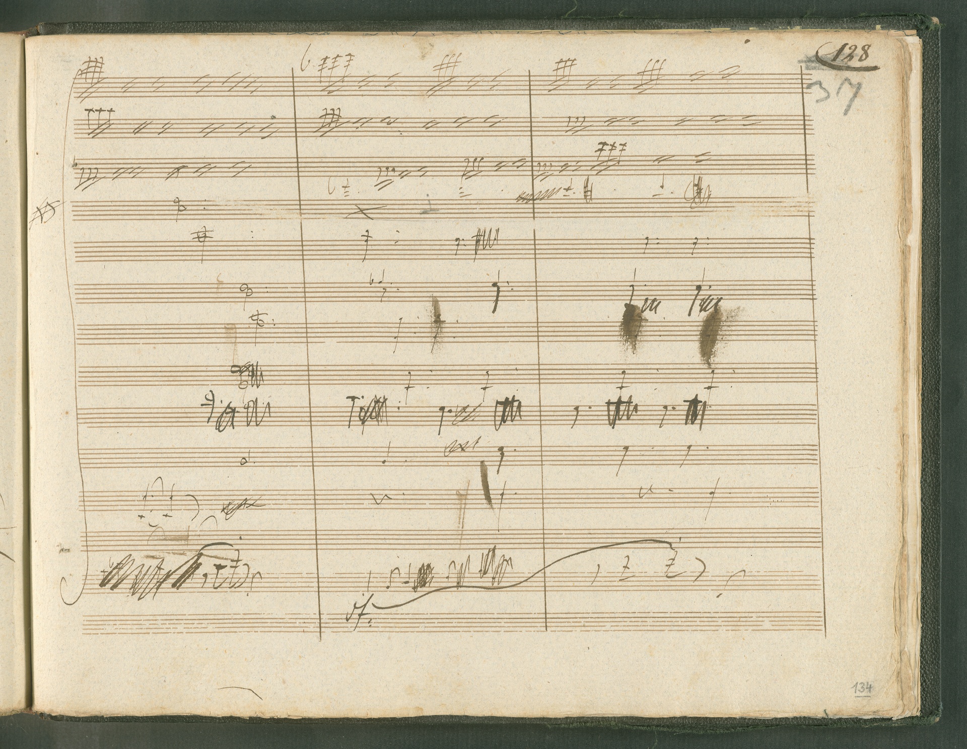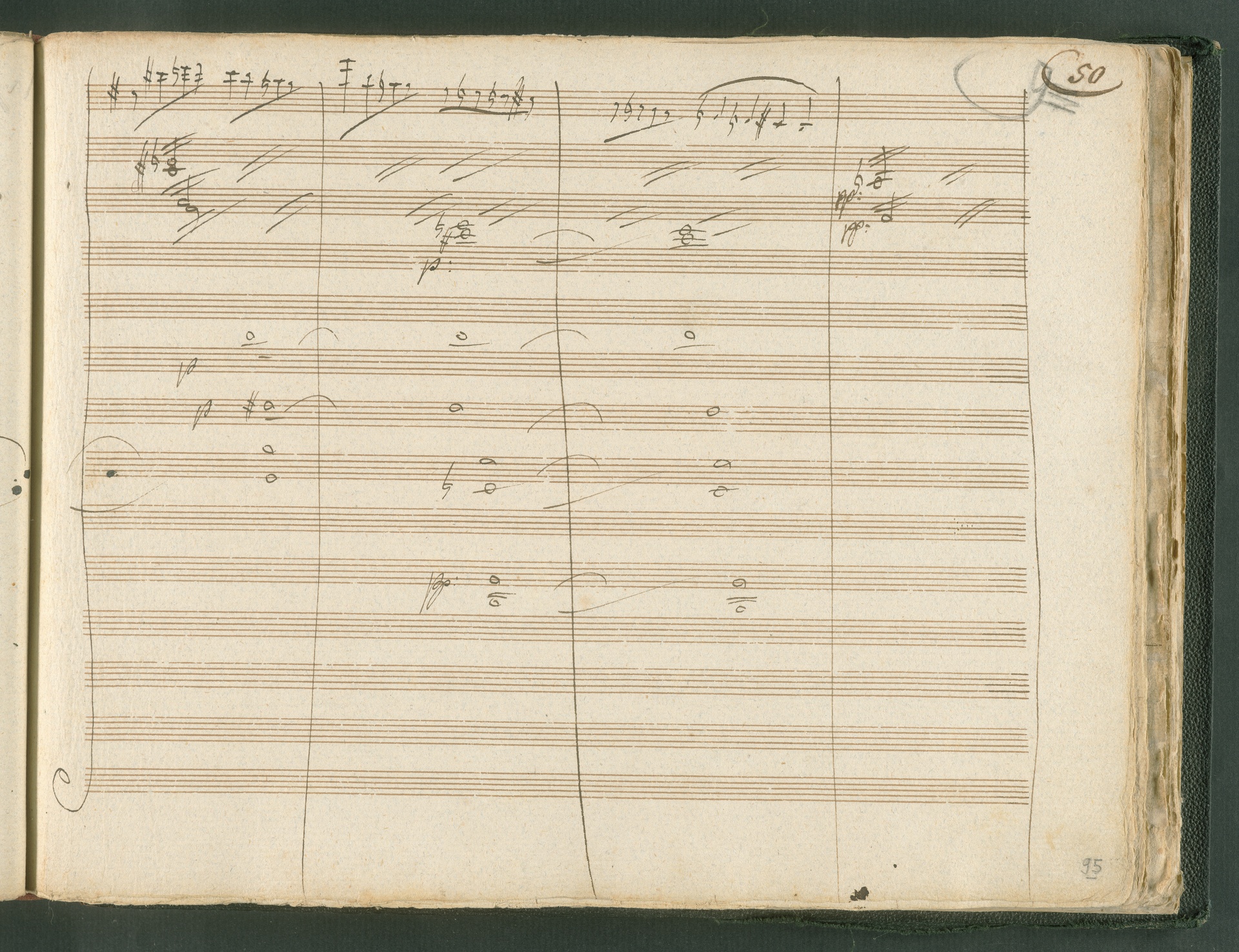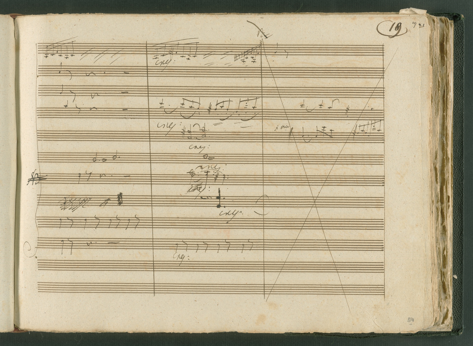 Wir sehen hier den unbestreitbar größten Schatz des Beethoven-Archivs: das vollständige Autograph der 6. Sinfonie op. 68, der "Pastorale". Es ist jedoch ein Irrtum zu glauben, dieses Autograph wäre der saubere Abschluß einer Entwicklung, an deren Ende ein fertiges, "ordentliches" Manuskript steht. Vielmehr lässt sich an diesem Autograph der Kompositionsprozeß verfolgen: unter dem abgeschlossenen Text sind mehrere Schichten sichtbar.